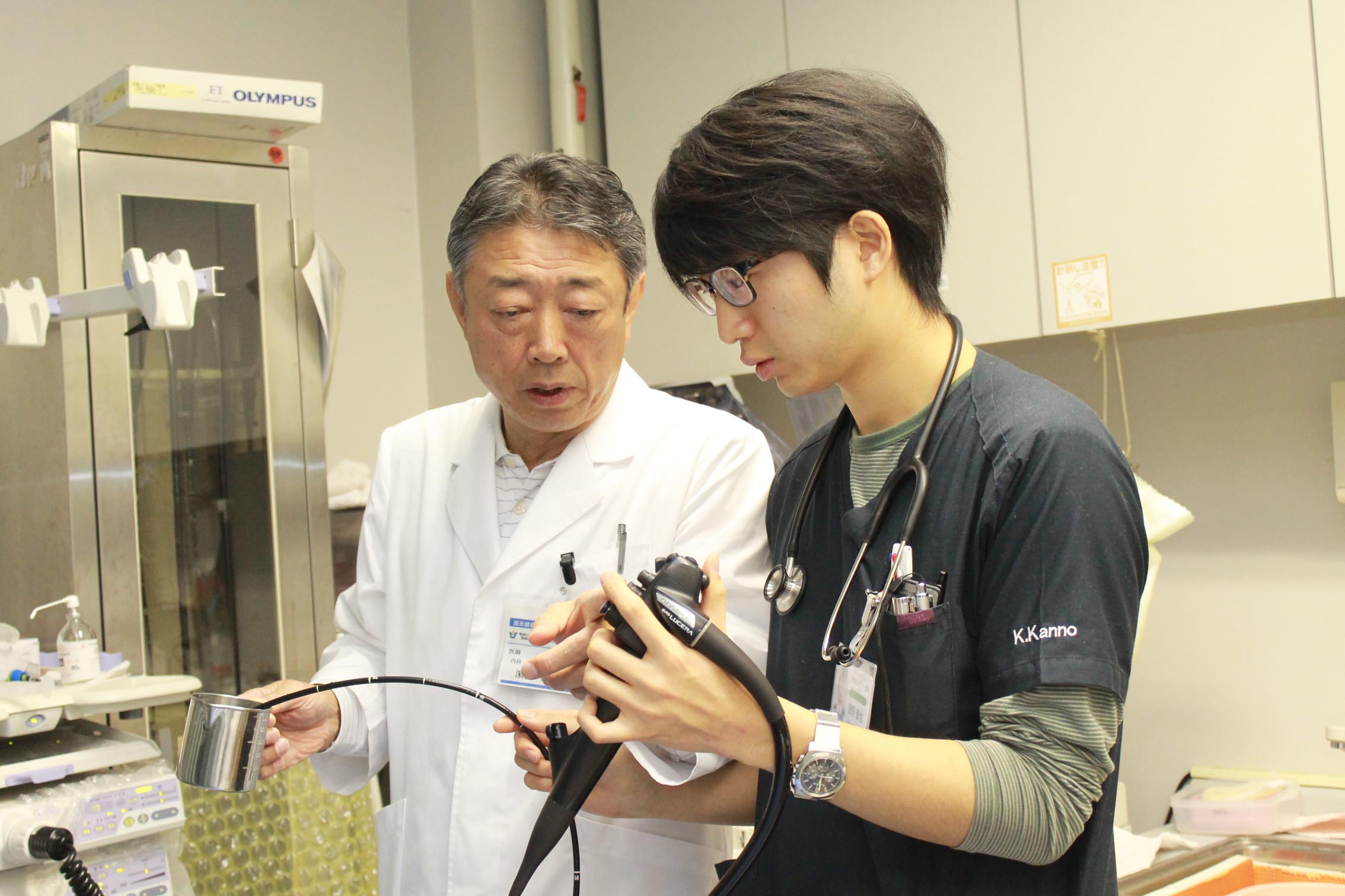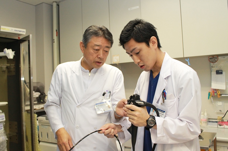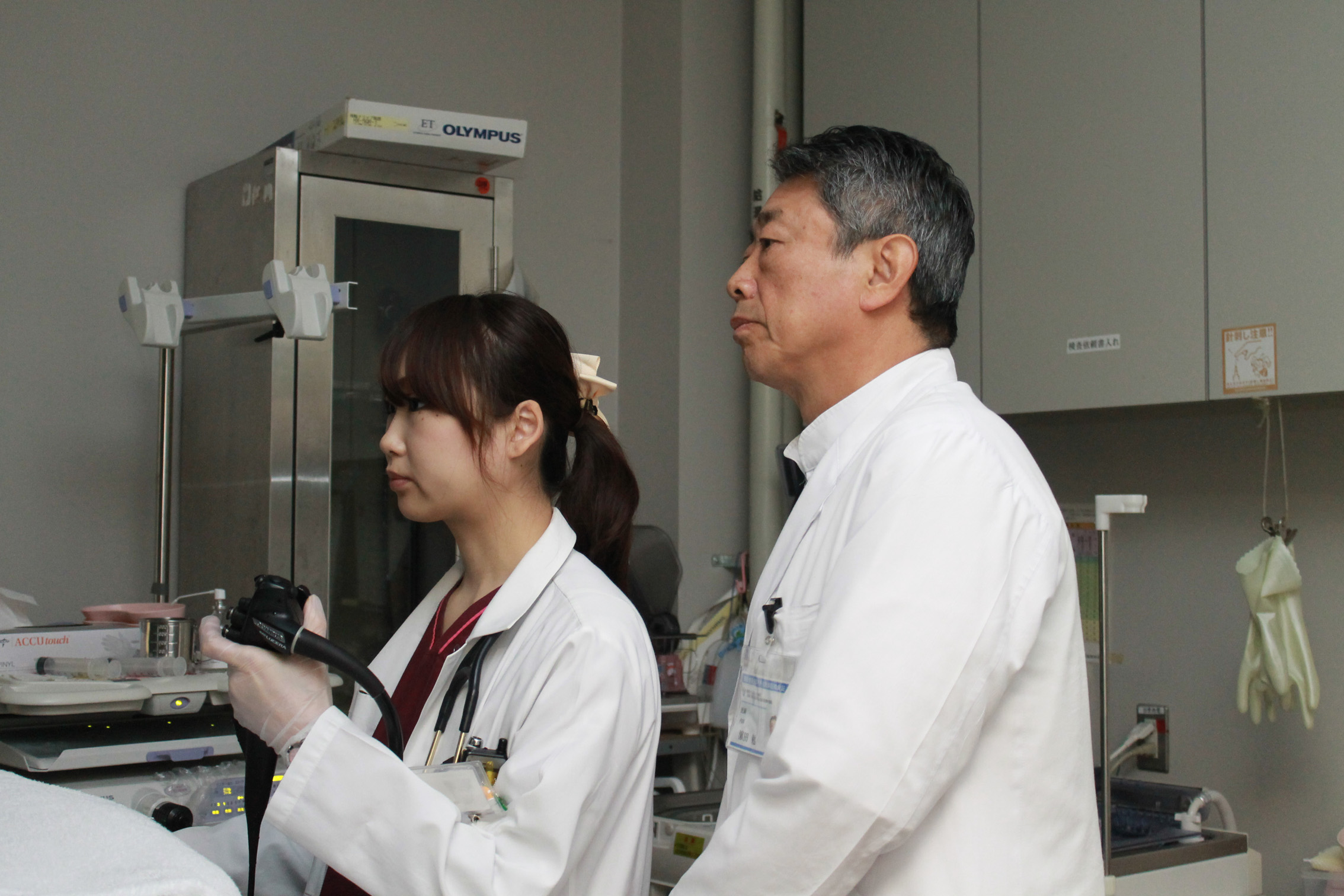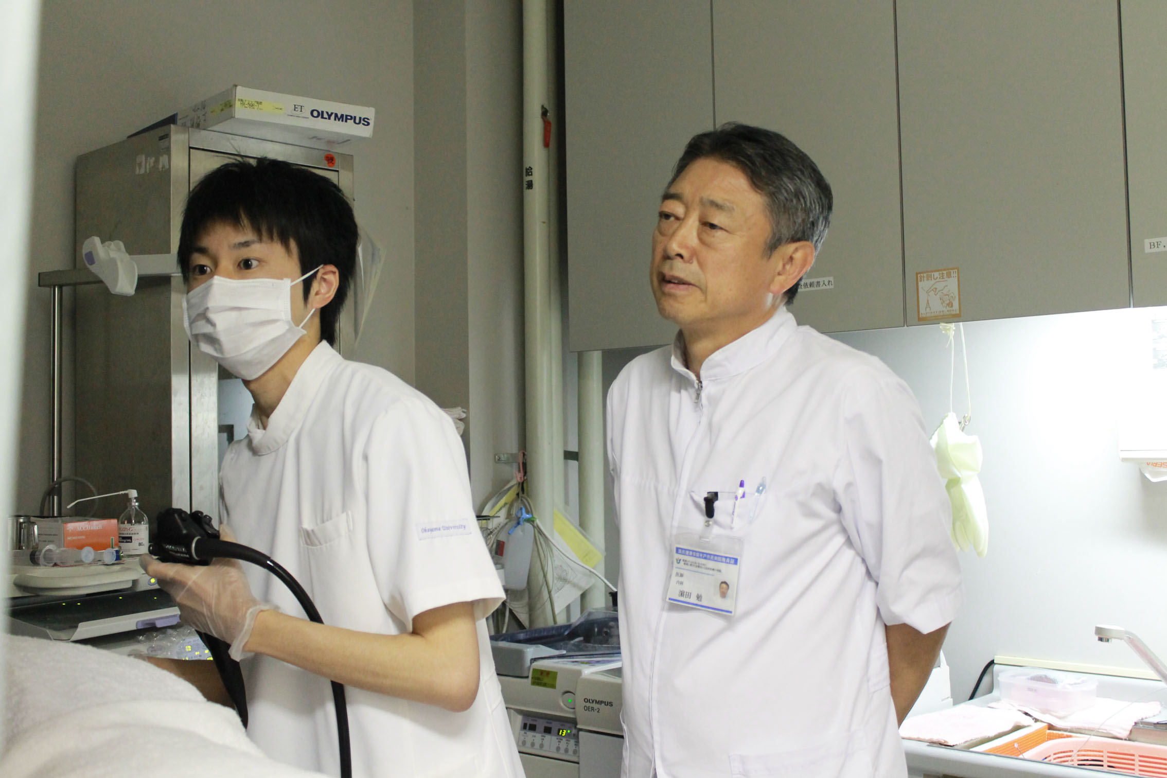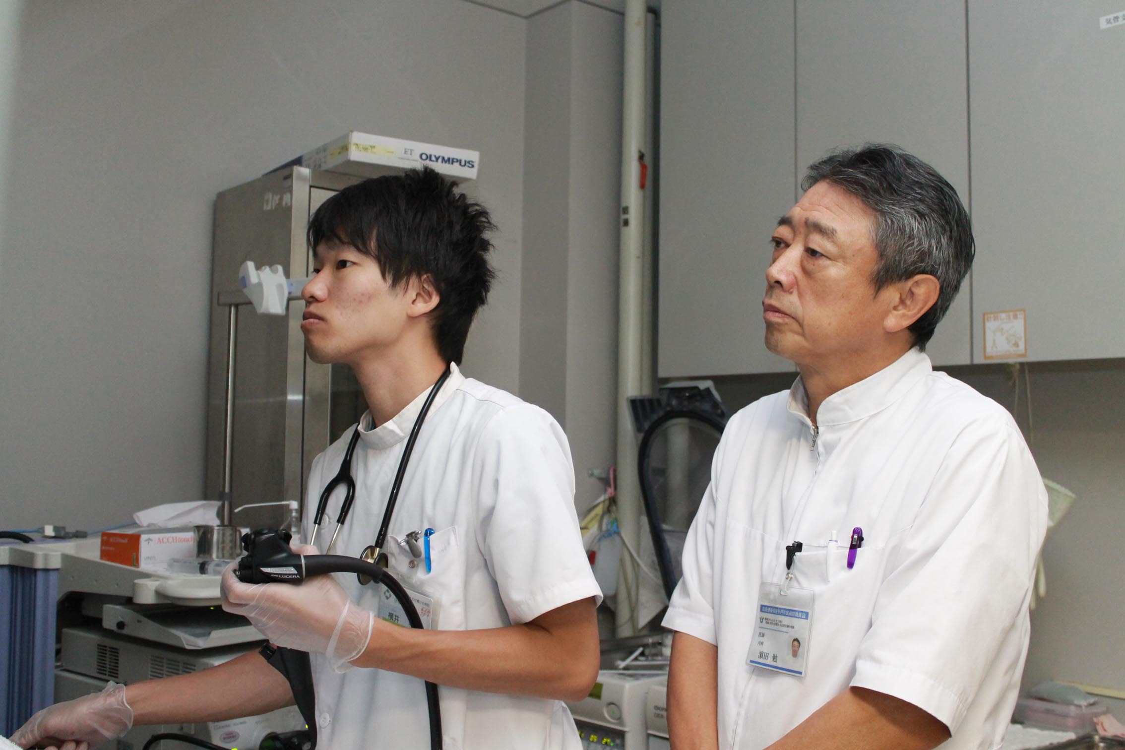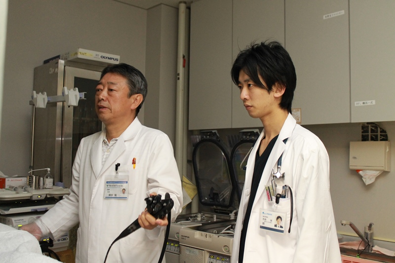 濱田先生指導による赤羽先生の内視鏡検査実習。