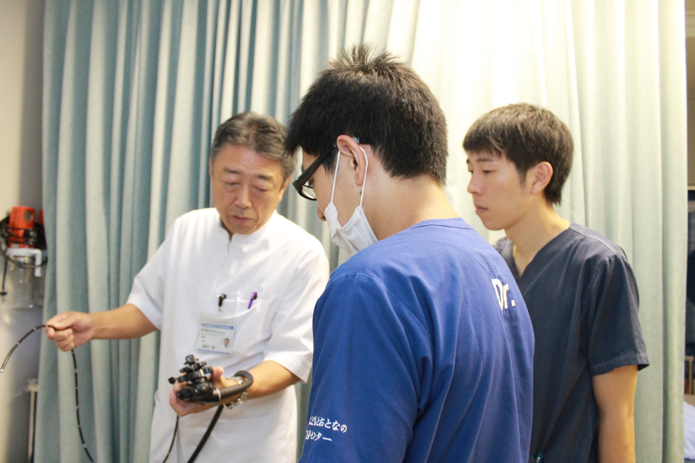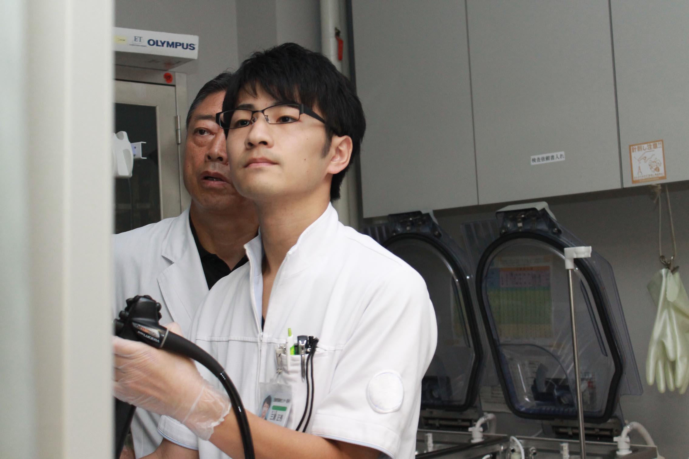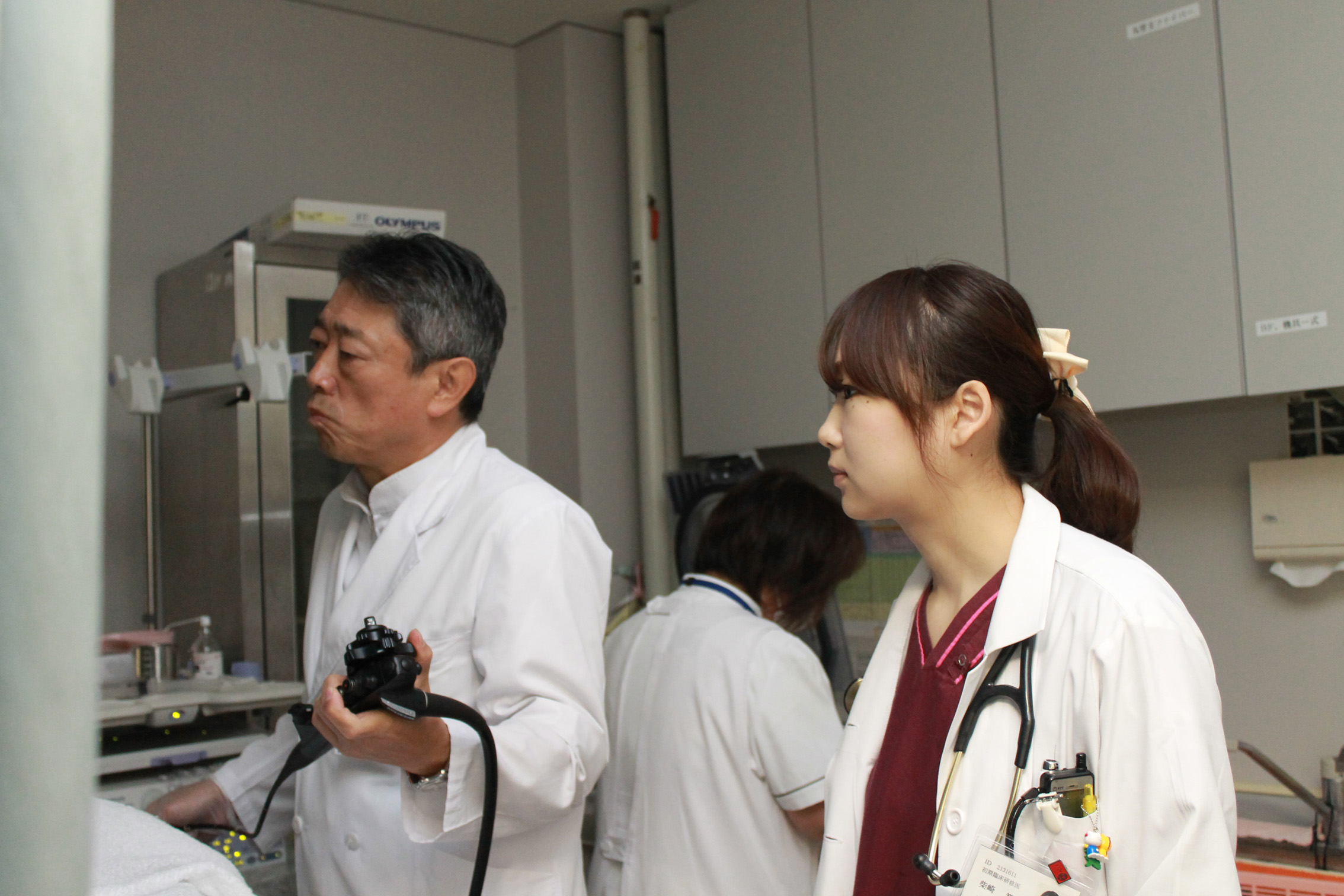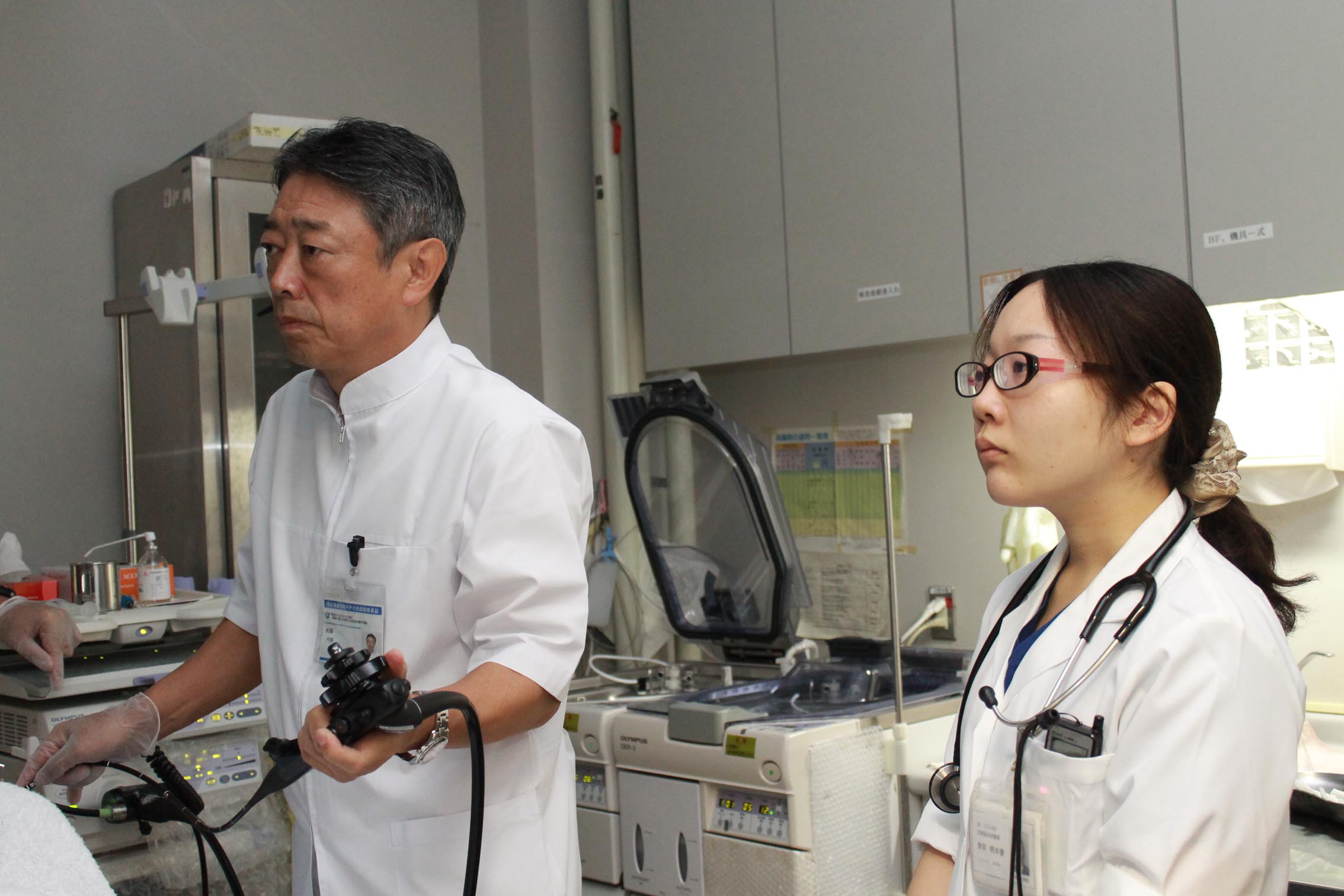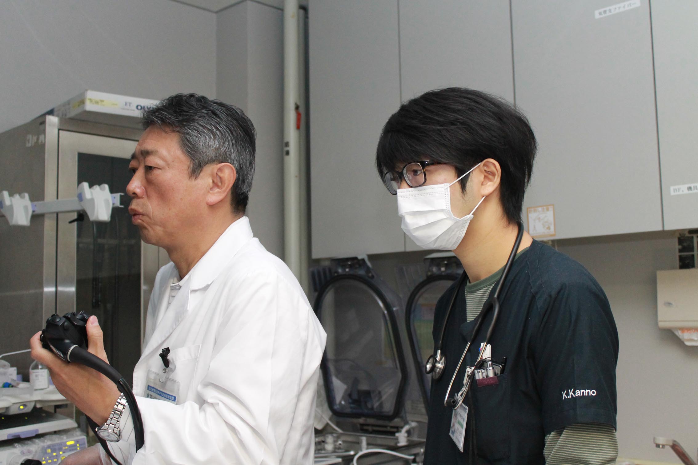 濱田先生指導による赤羽先生の内視鏡検査実習。