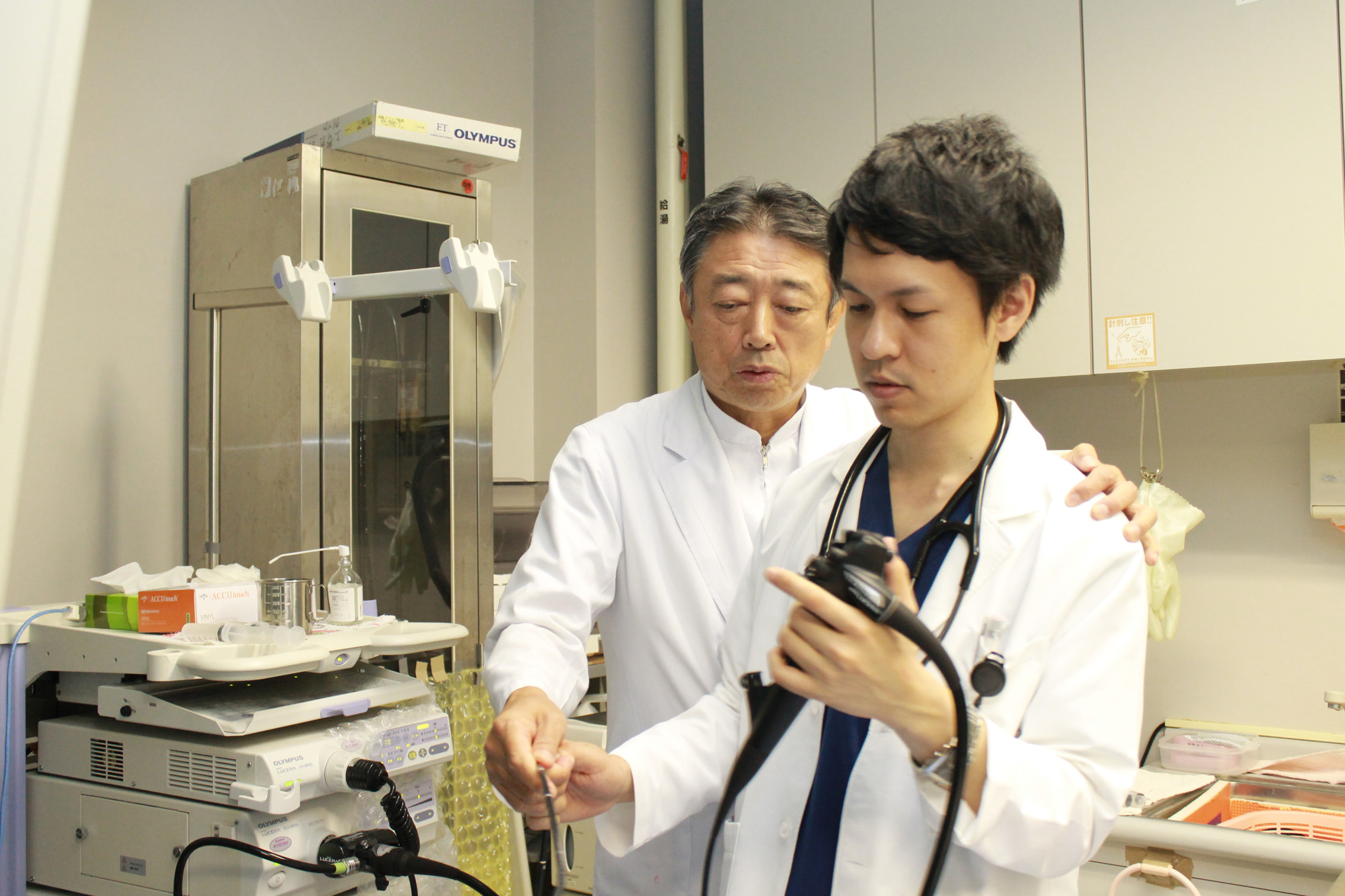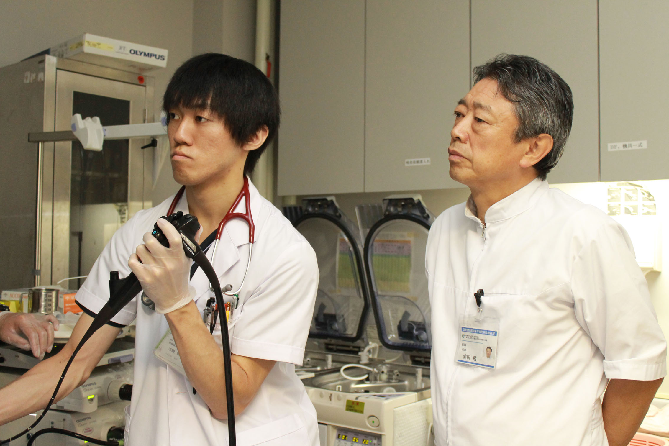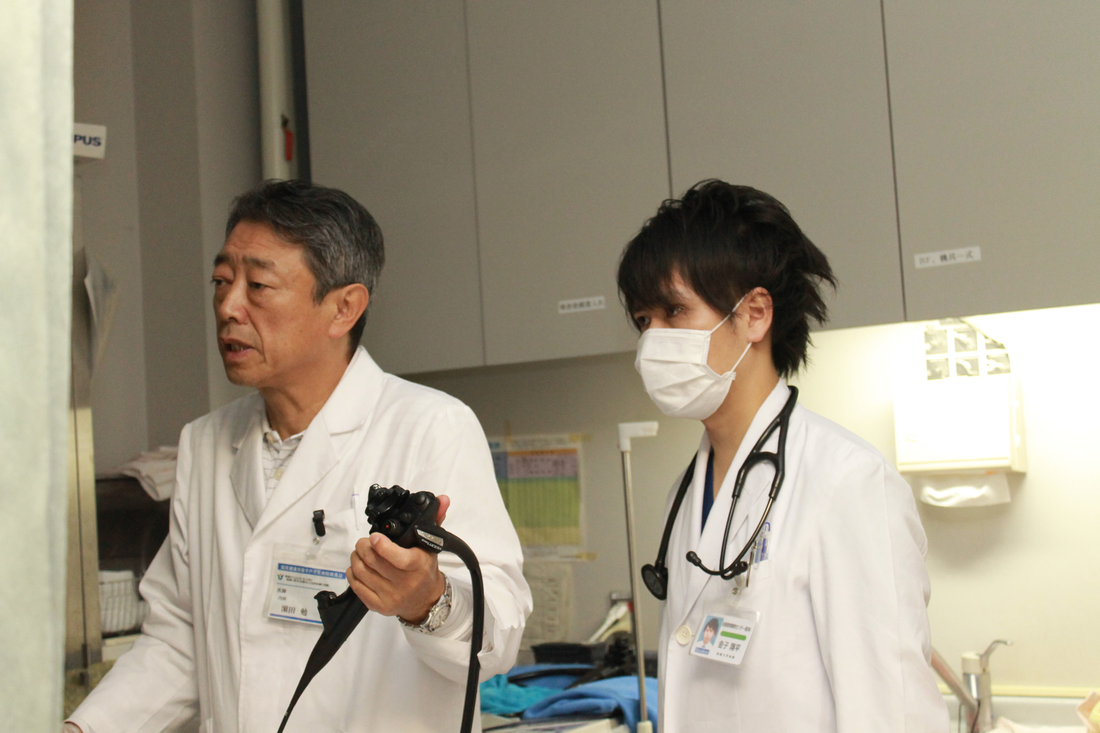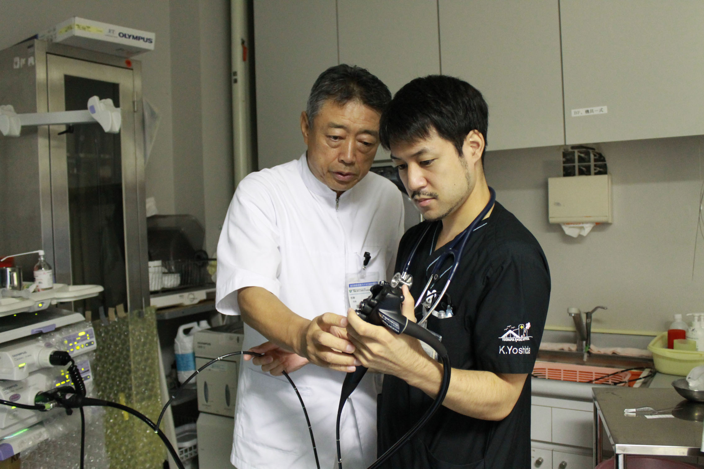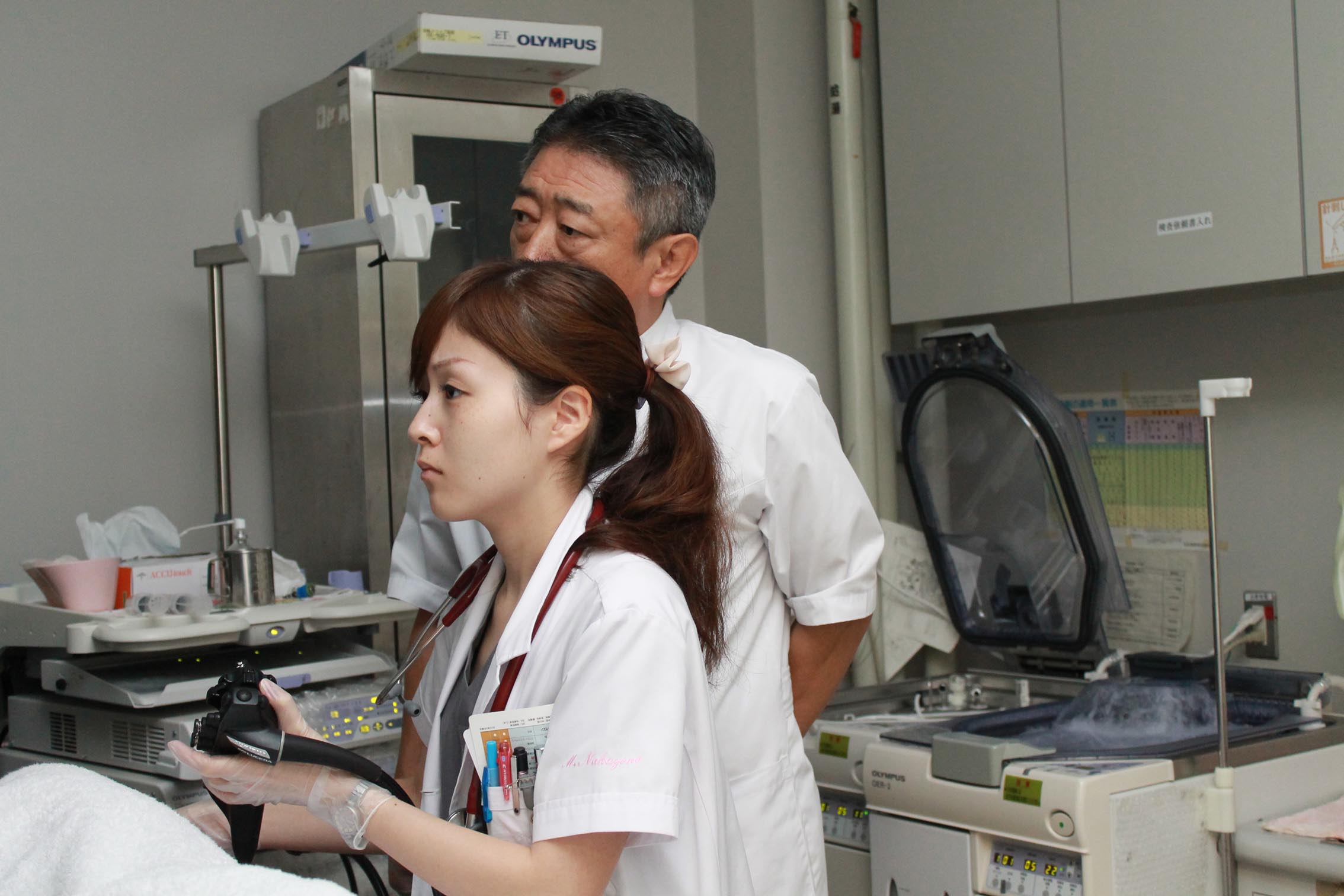 濱田先生指導による赤羽先生の内視鏡検査実習。