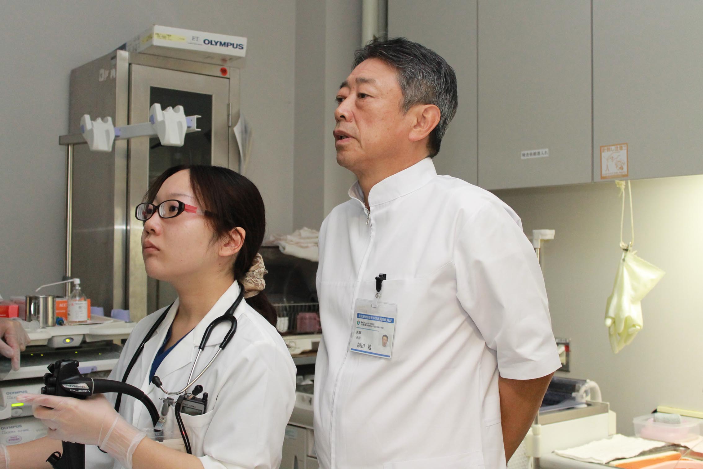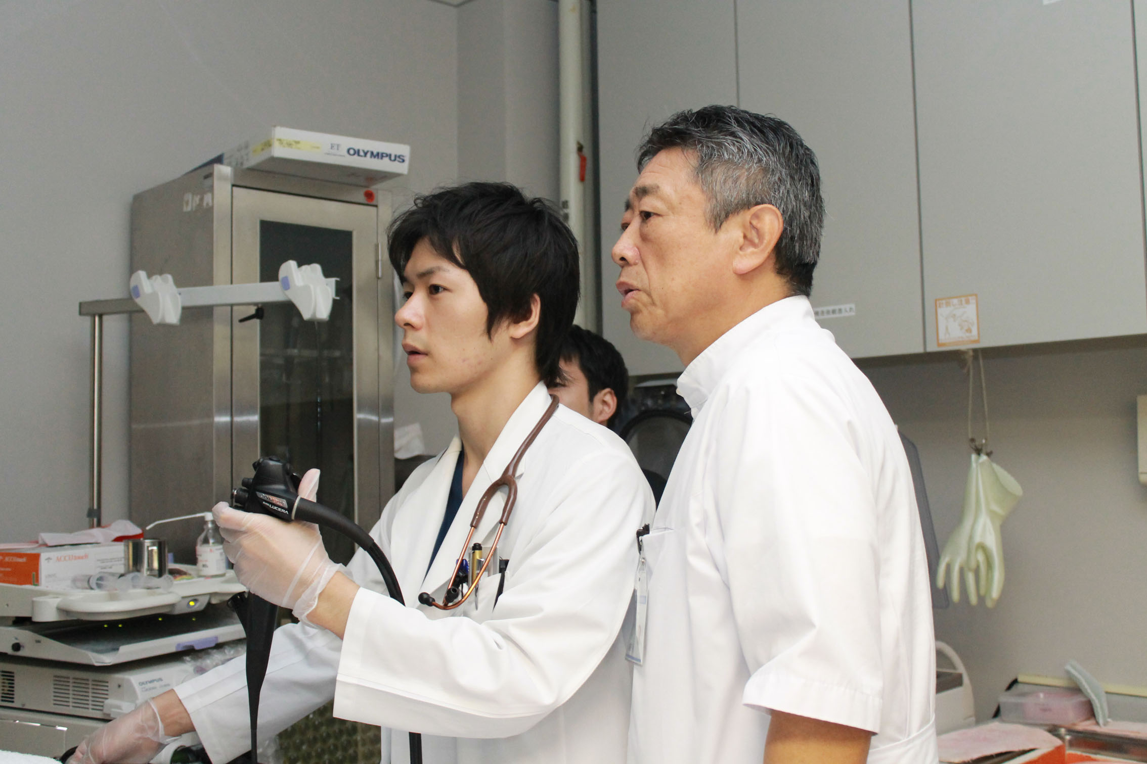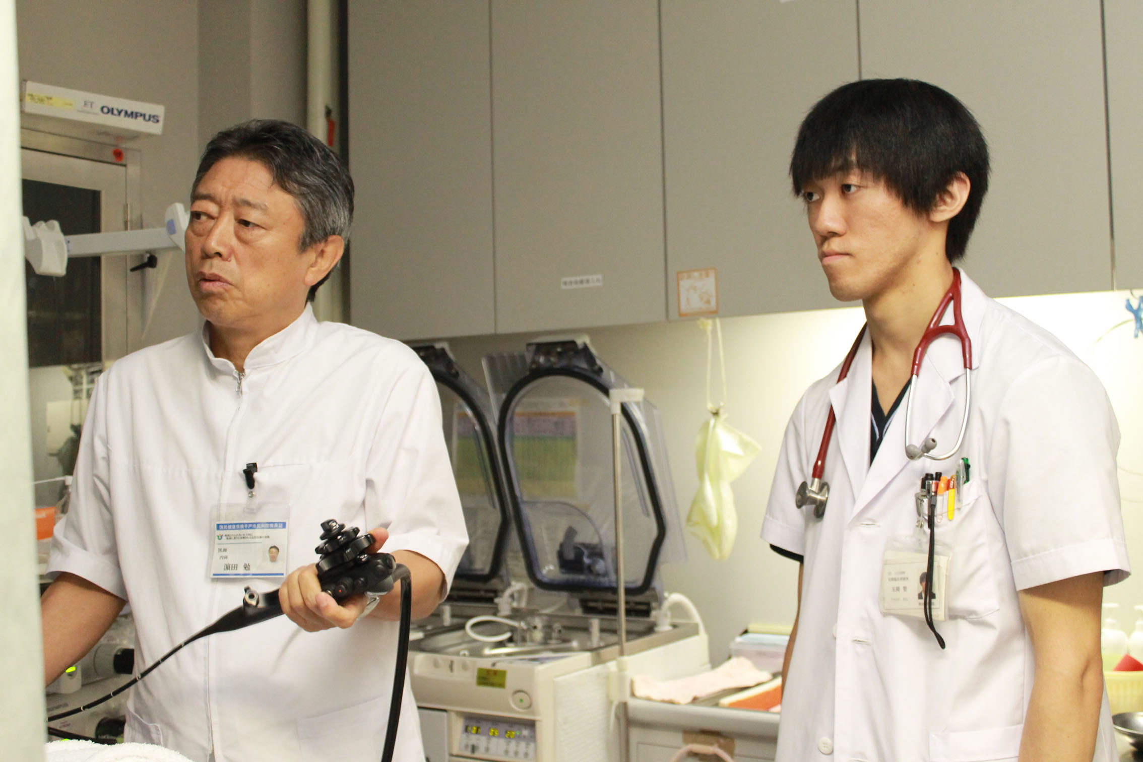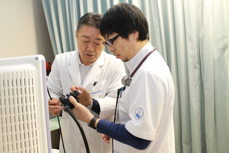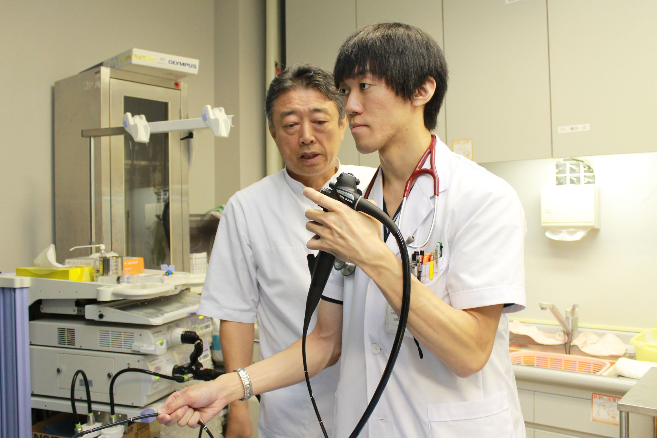 濱田先生指導による赤羽先生の内視鏡検査実習。