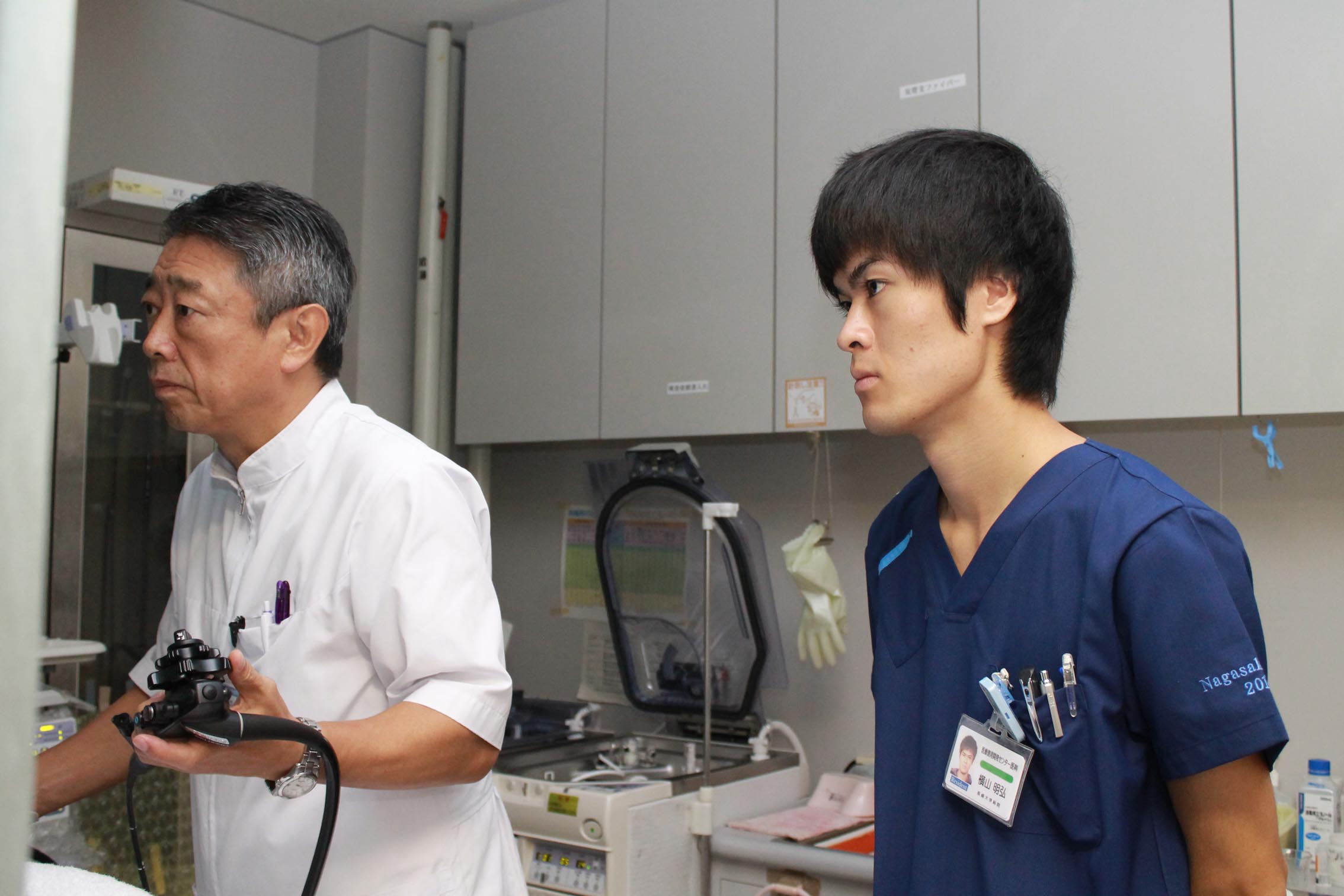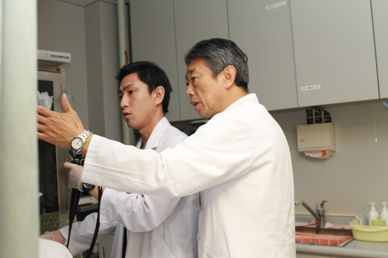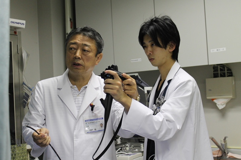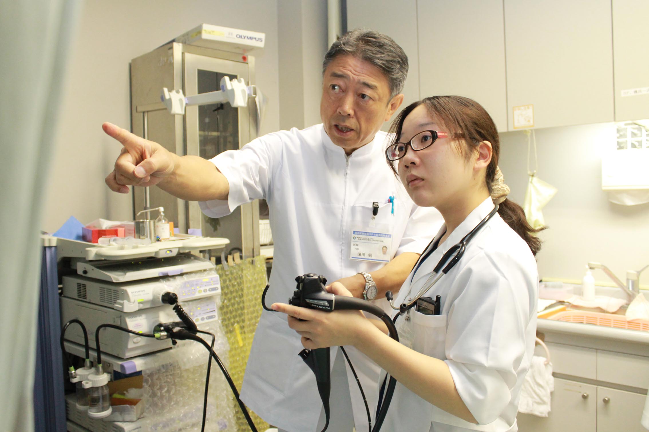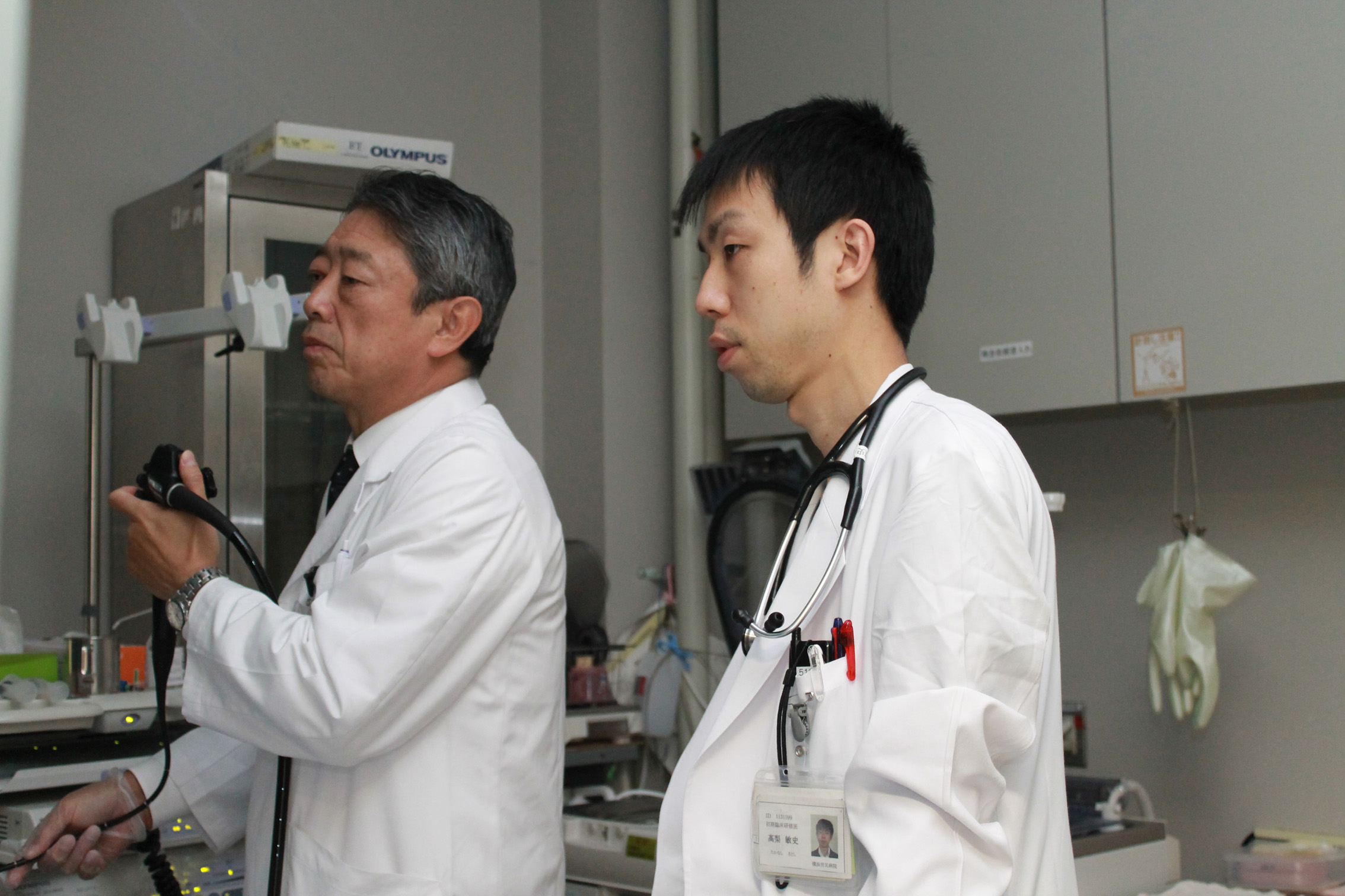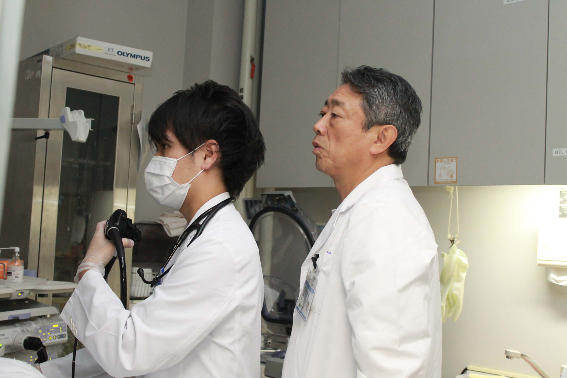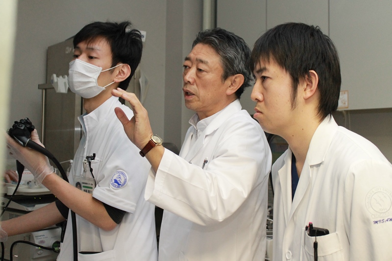 濱田先生指導による赤羽先生の内視鏡検査実習。