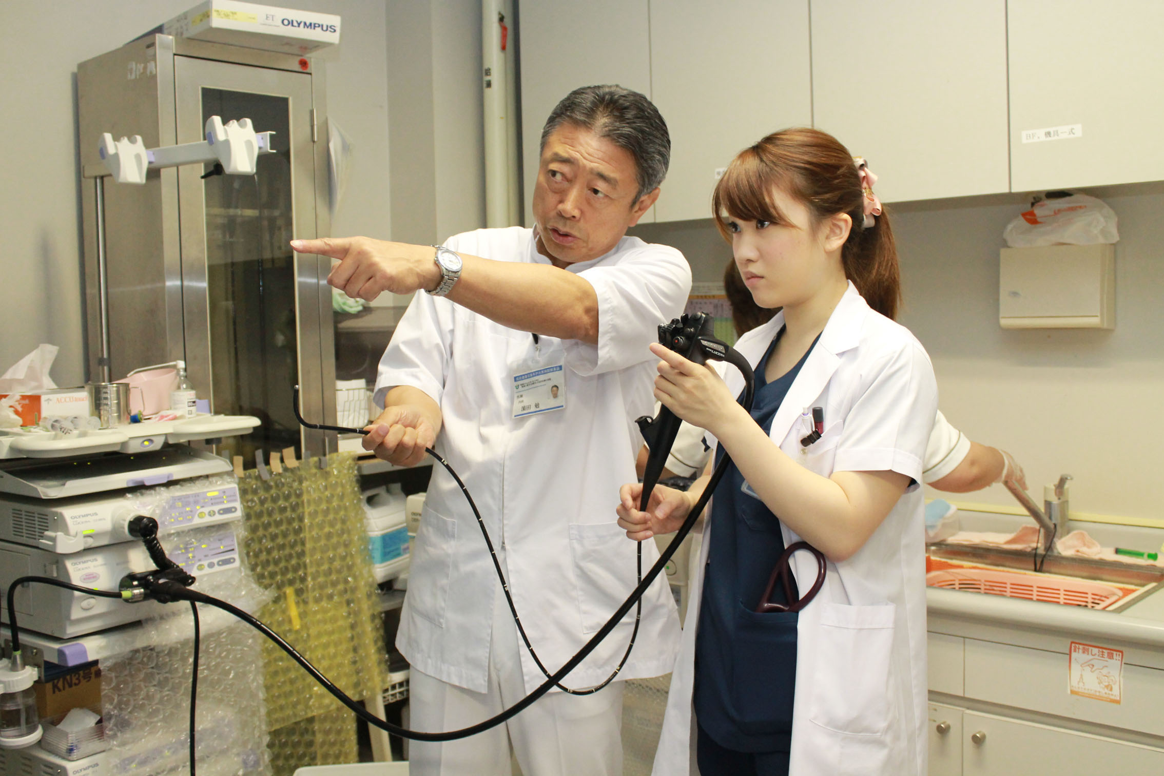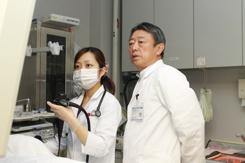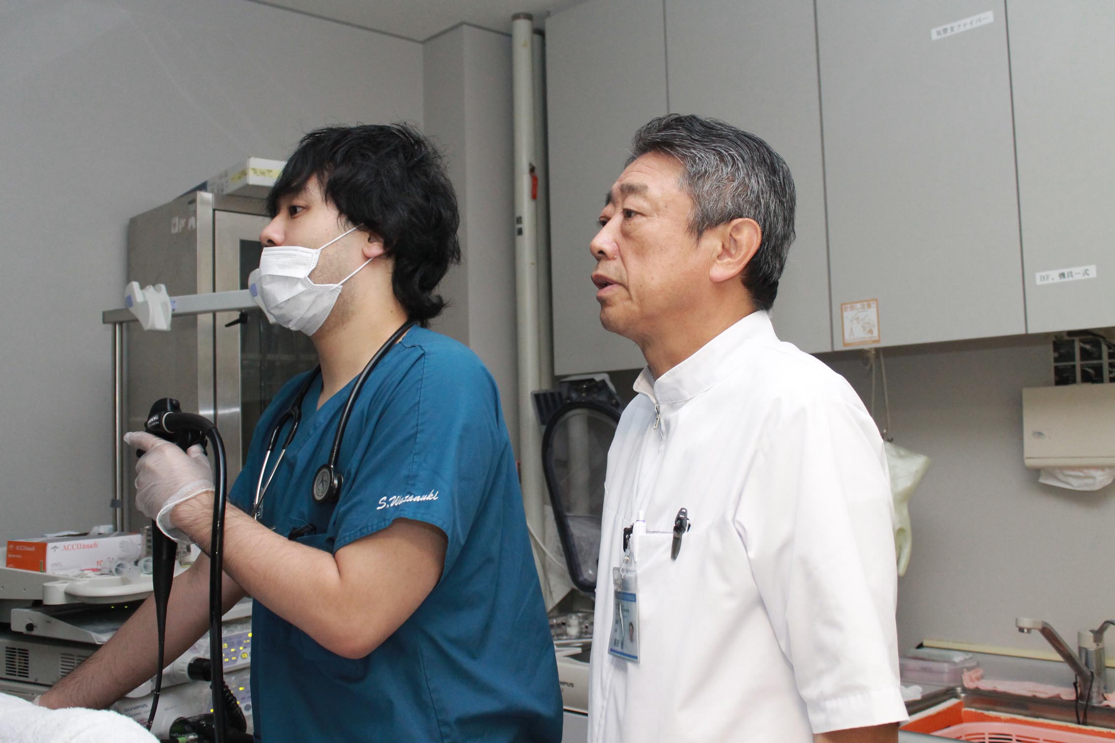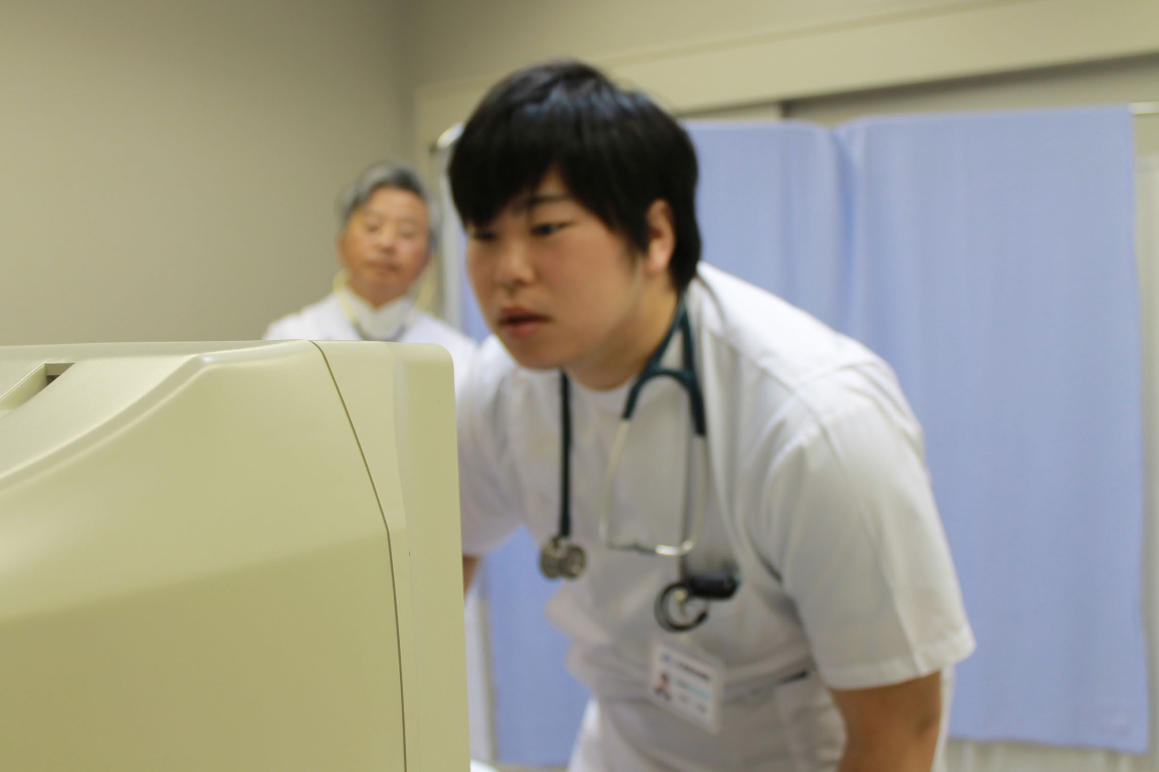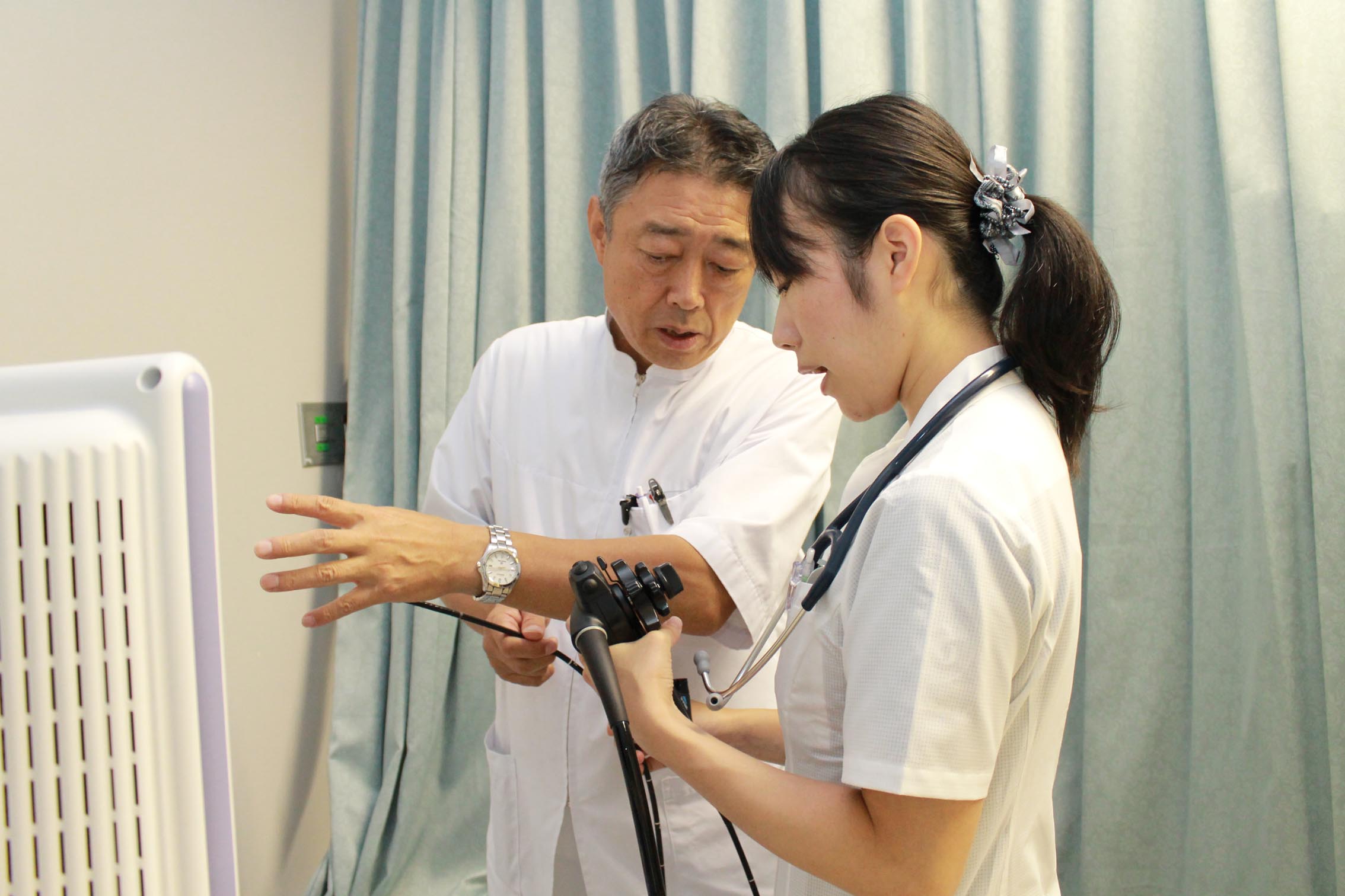 濱田先生指導による赤羽先生の内視鏡検査実習。