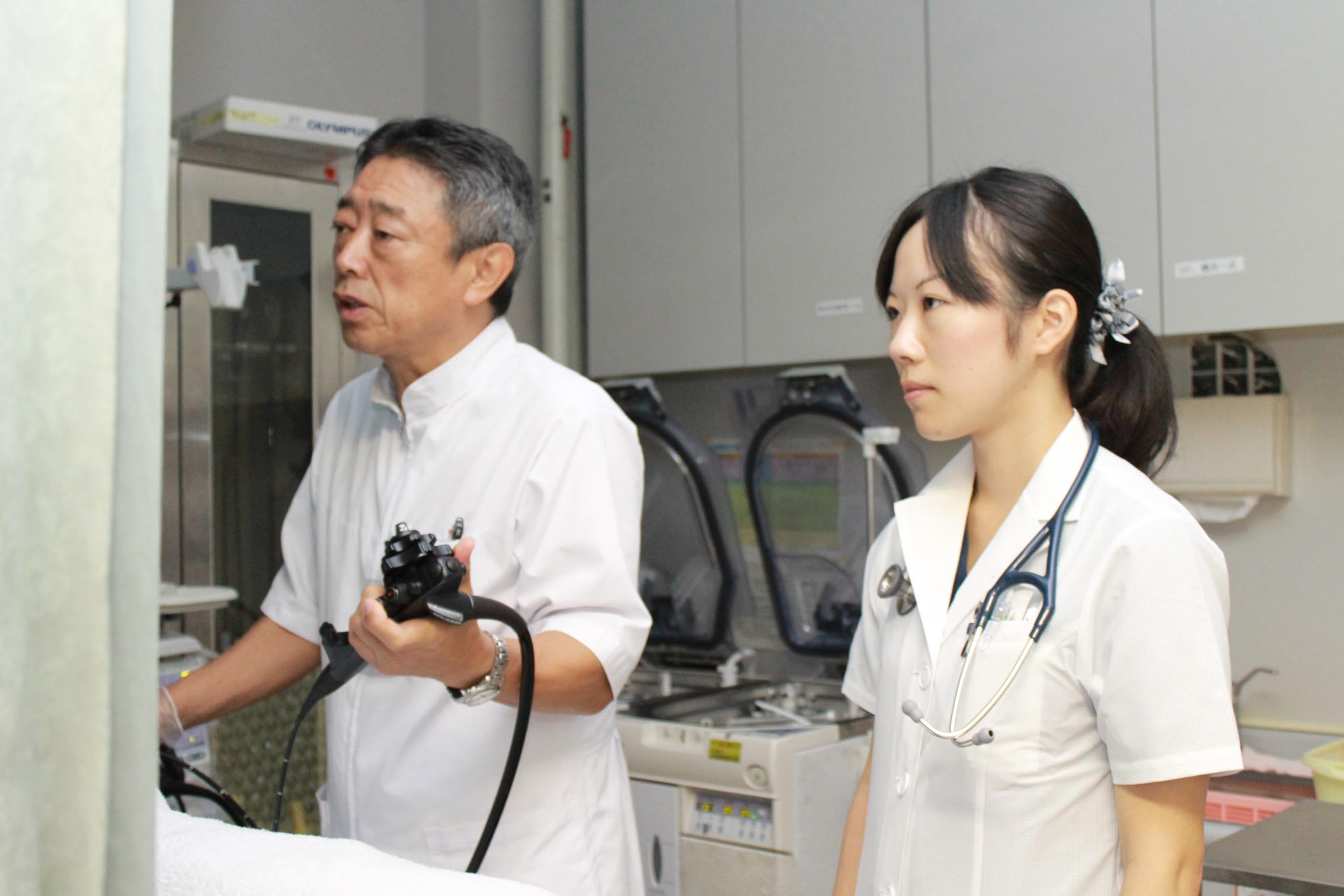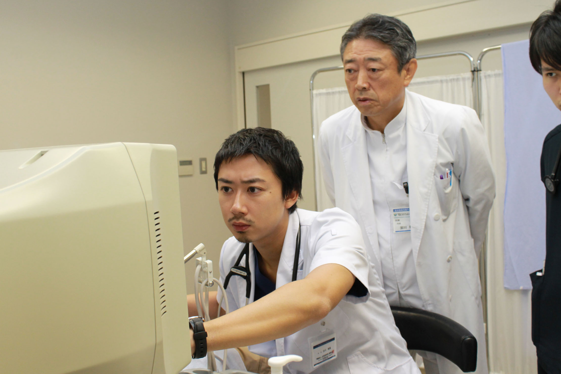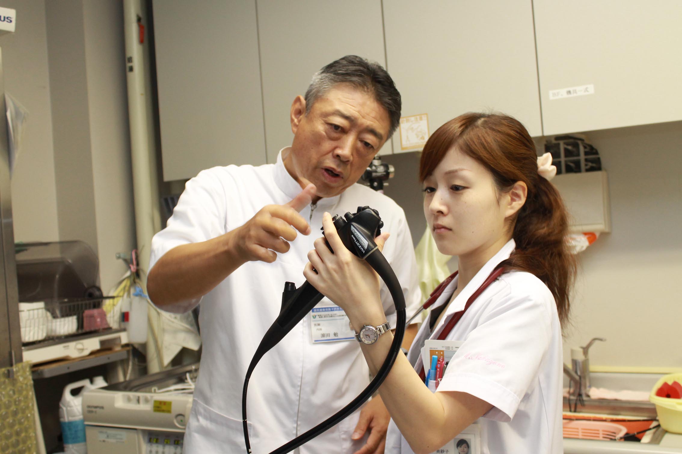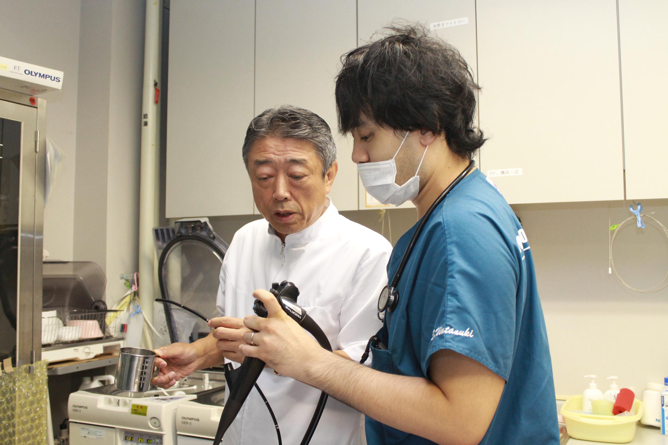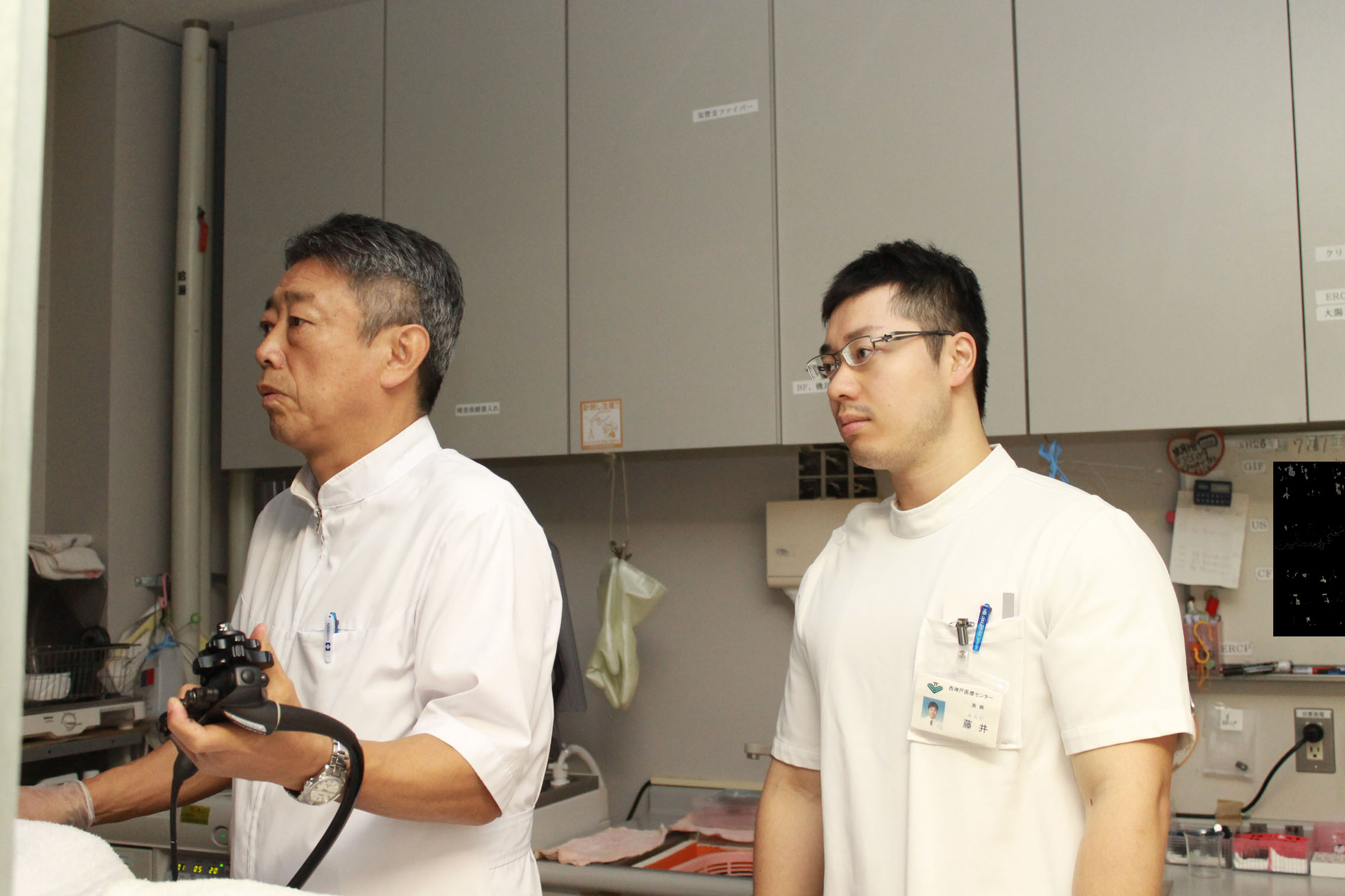 濱田先生指導による赤羽先生の内視鏡検査実習。