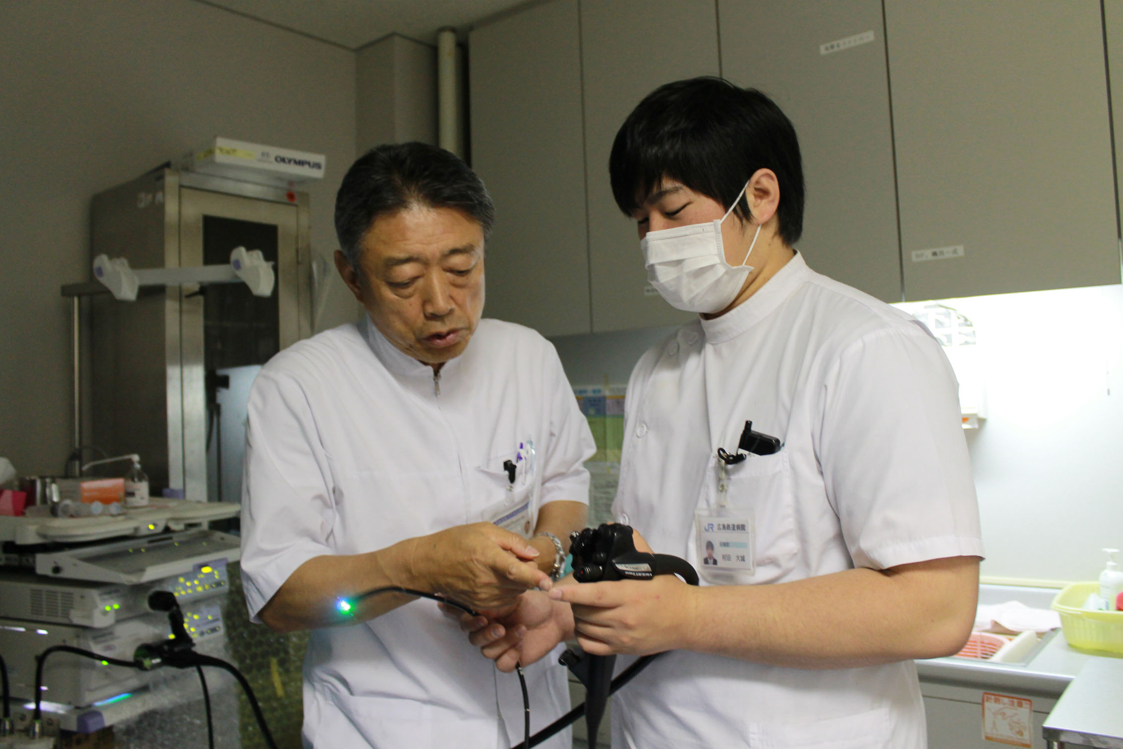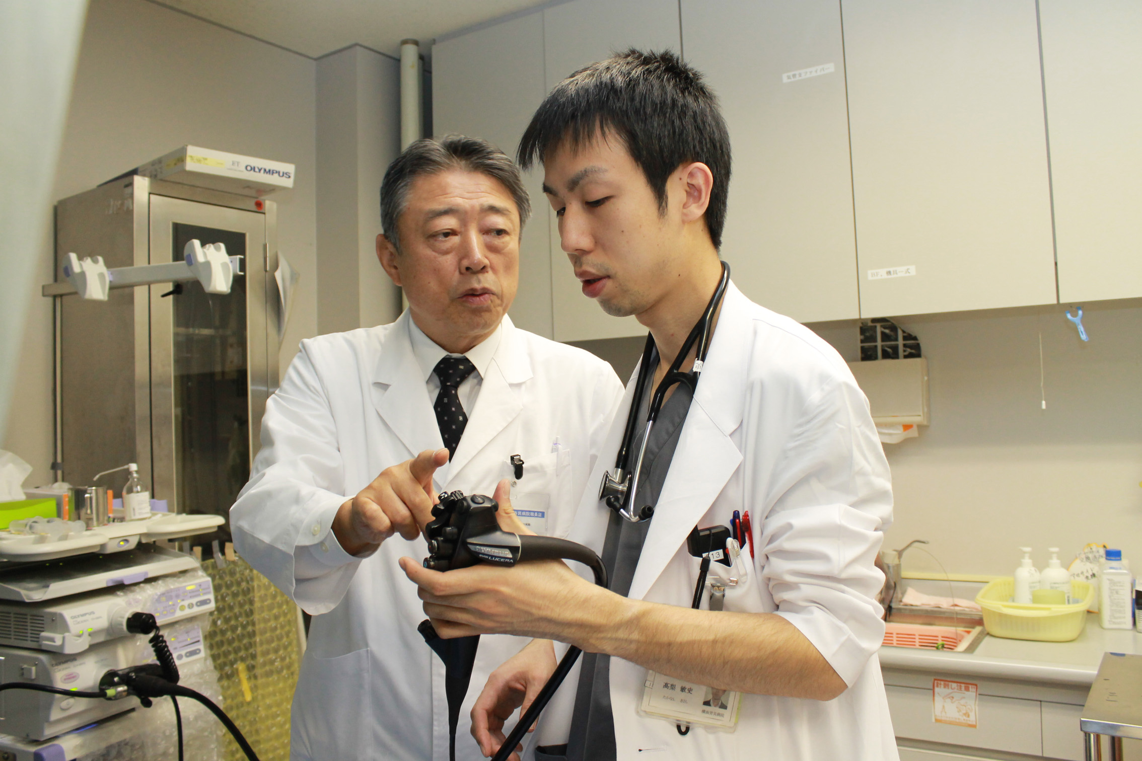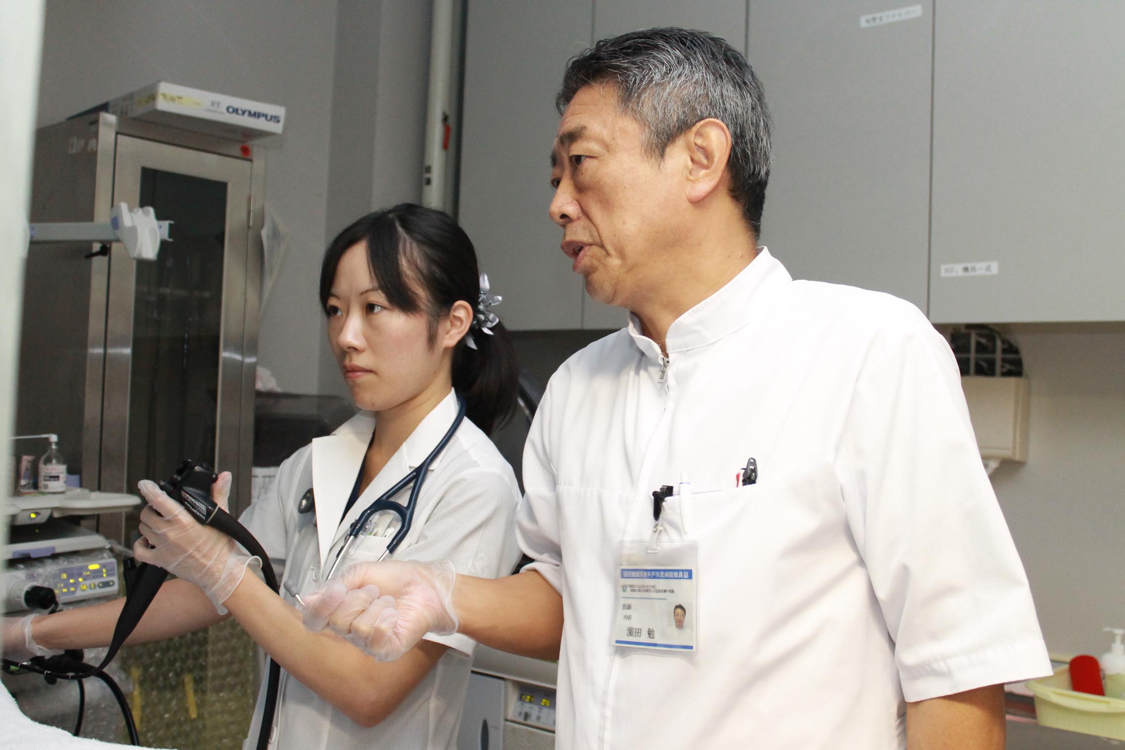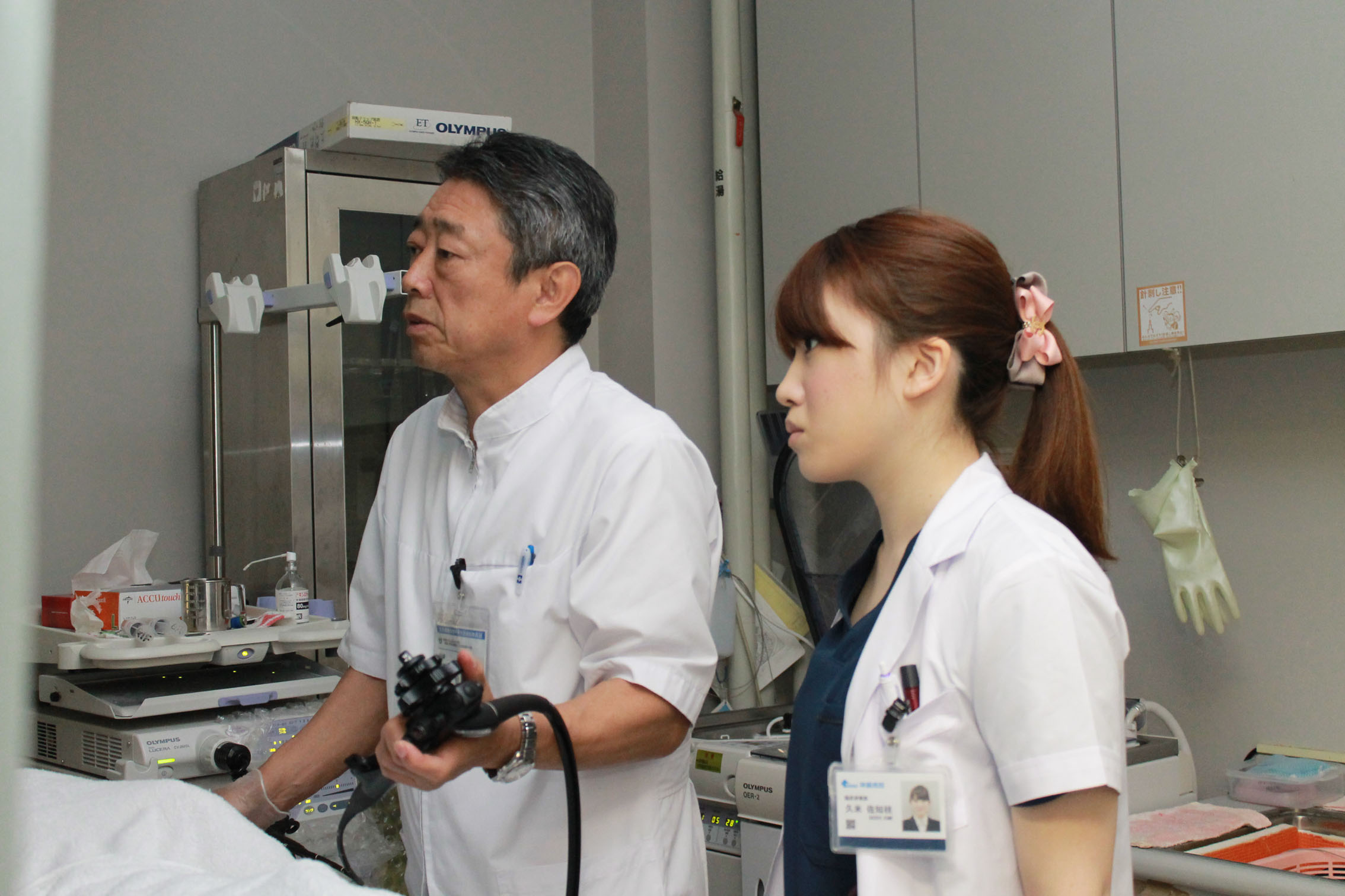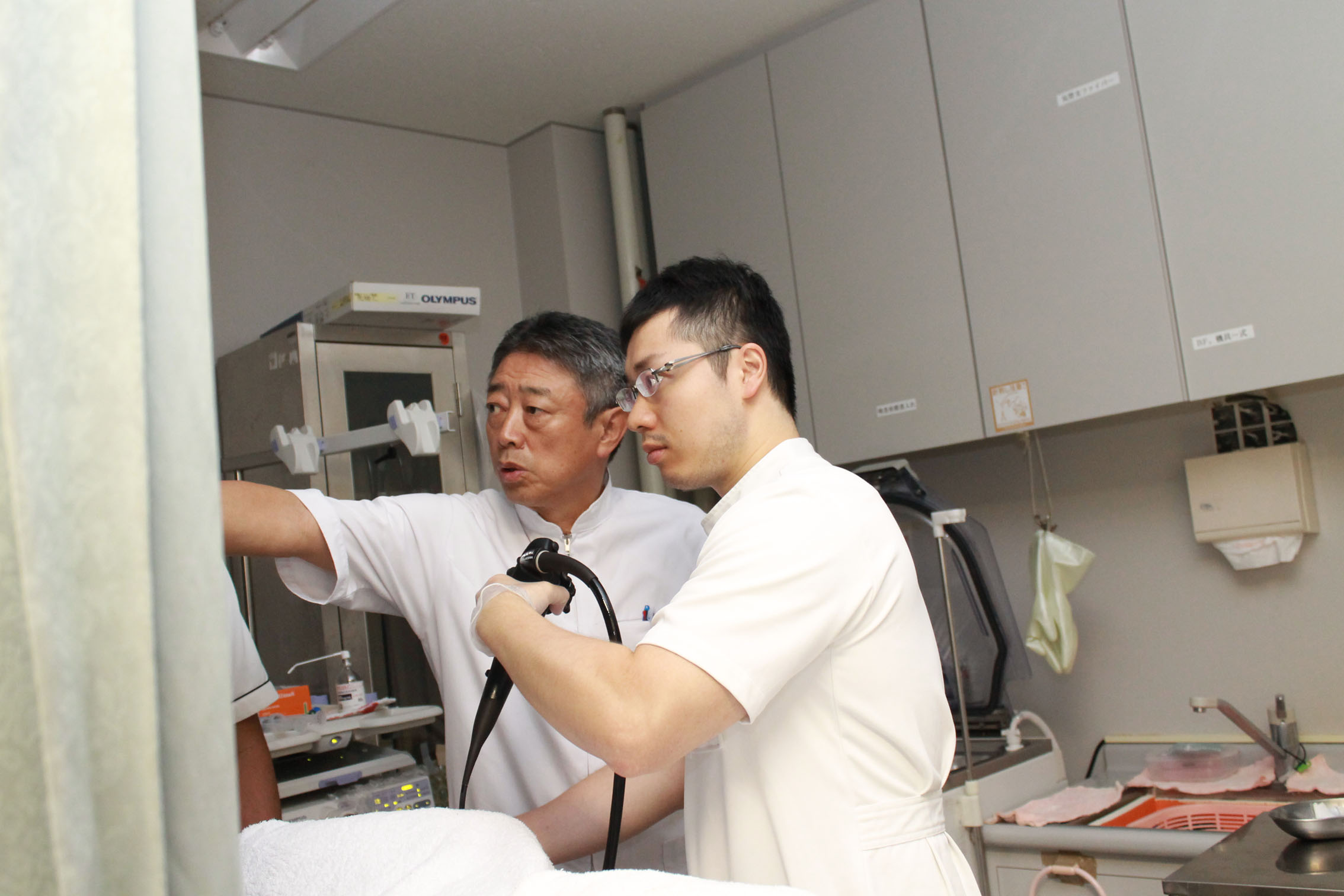 濱田先生指導による赤羽先生の内視鏡検査実習。
