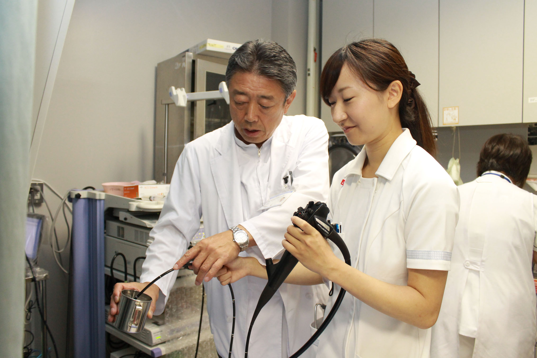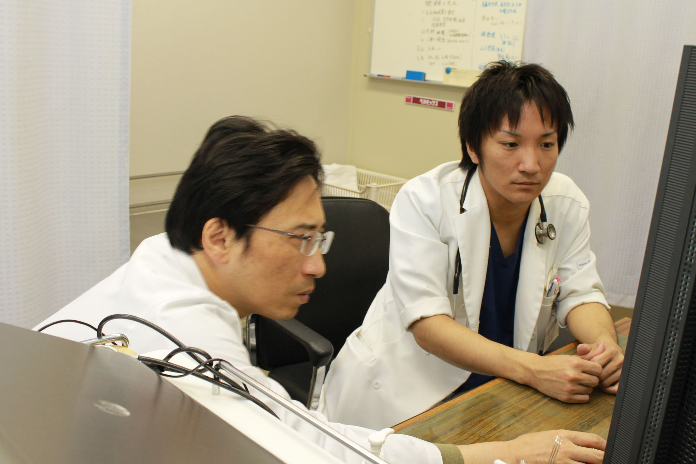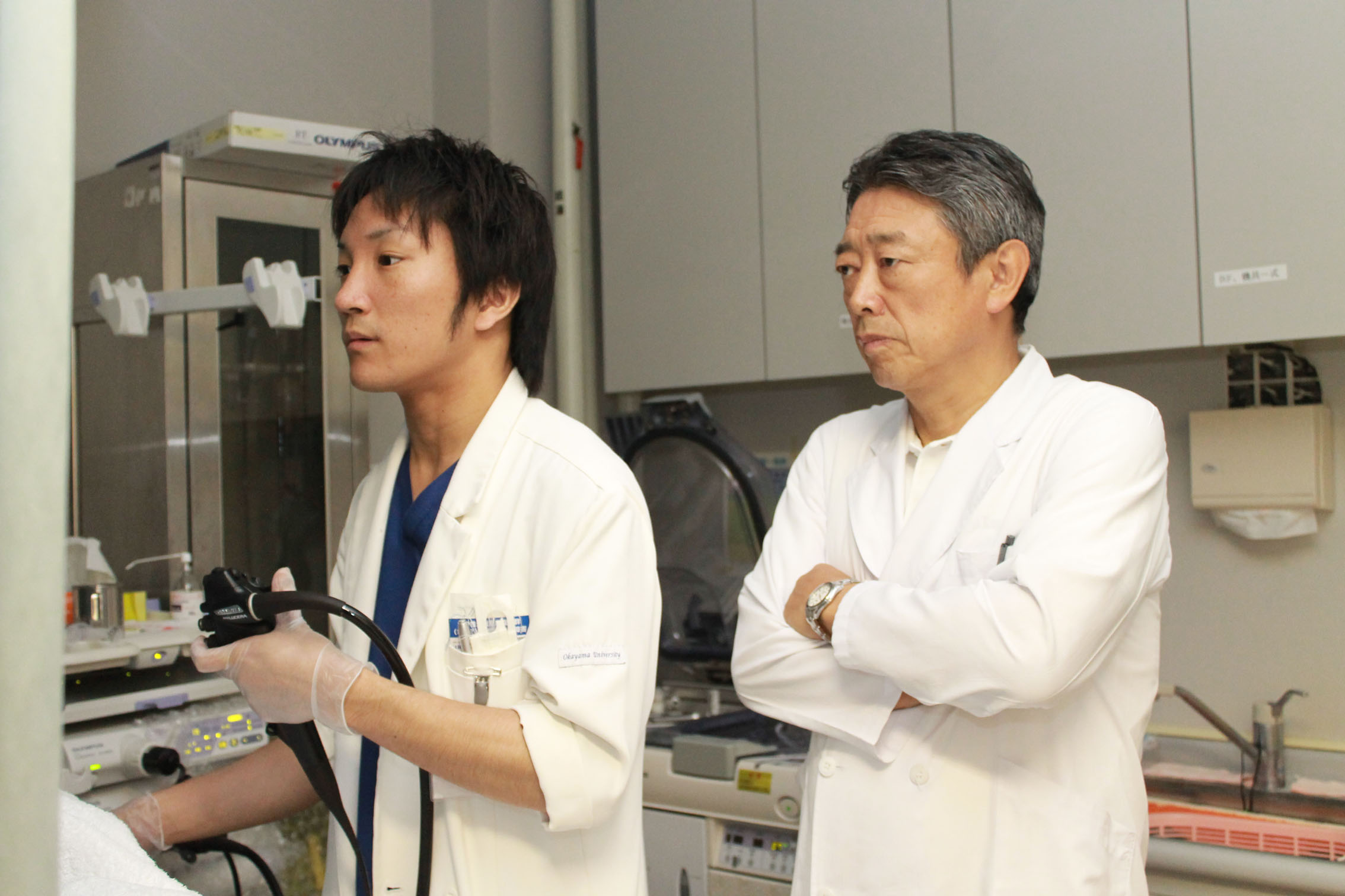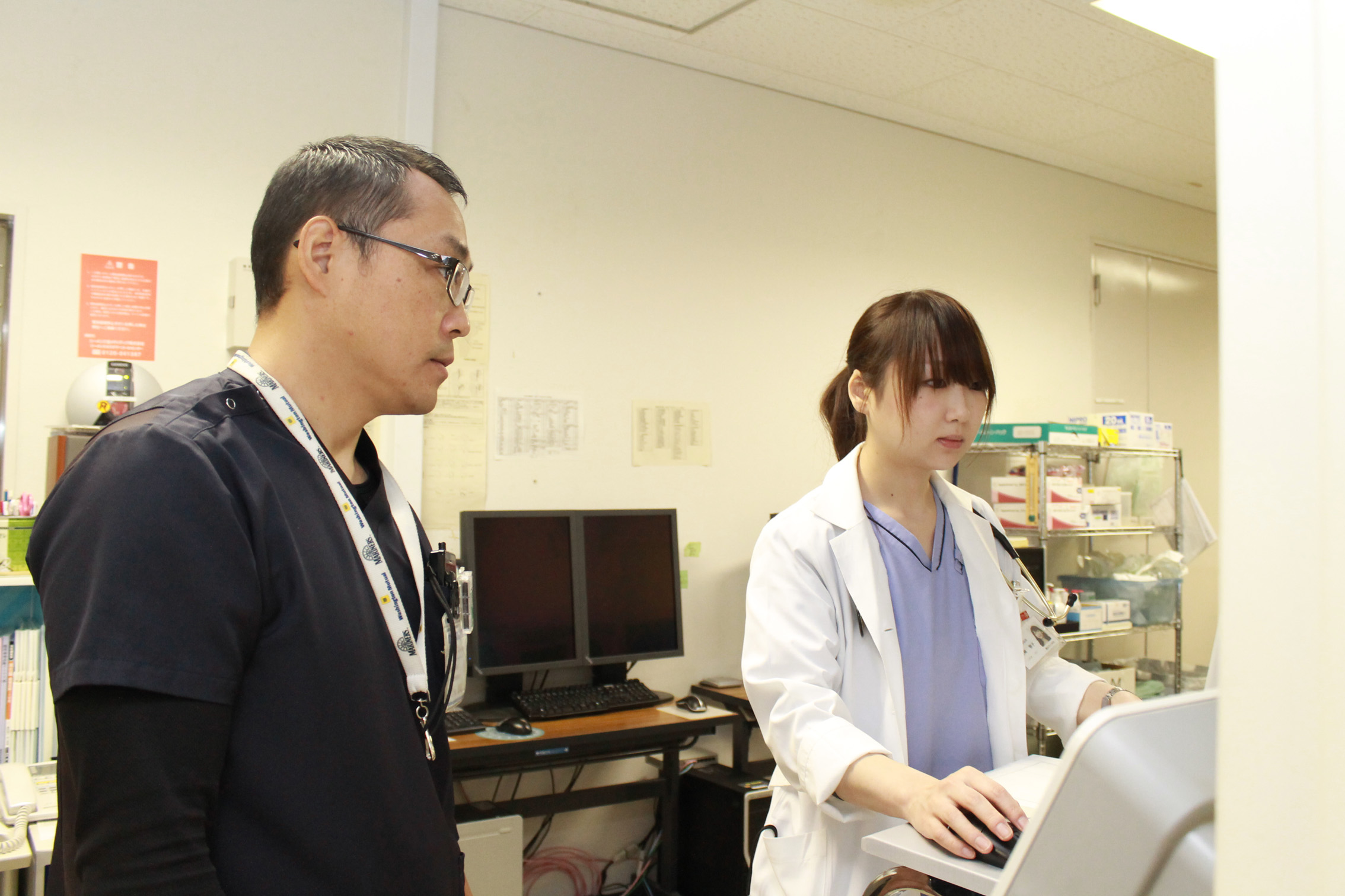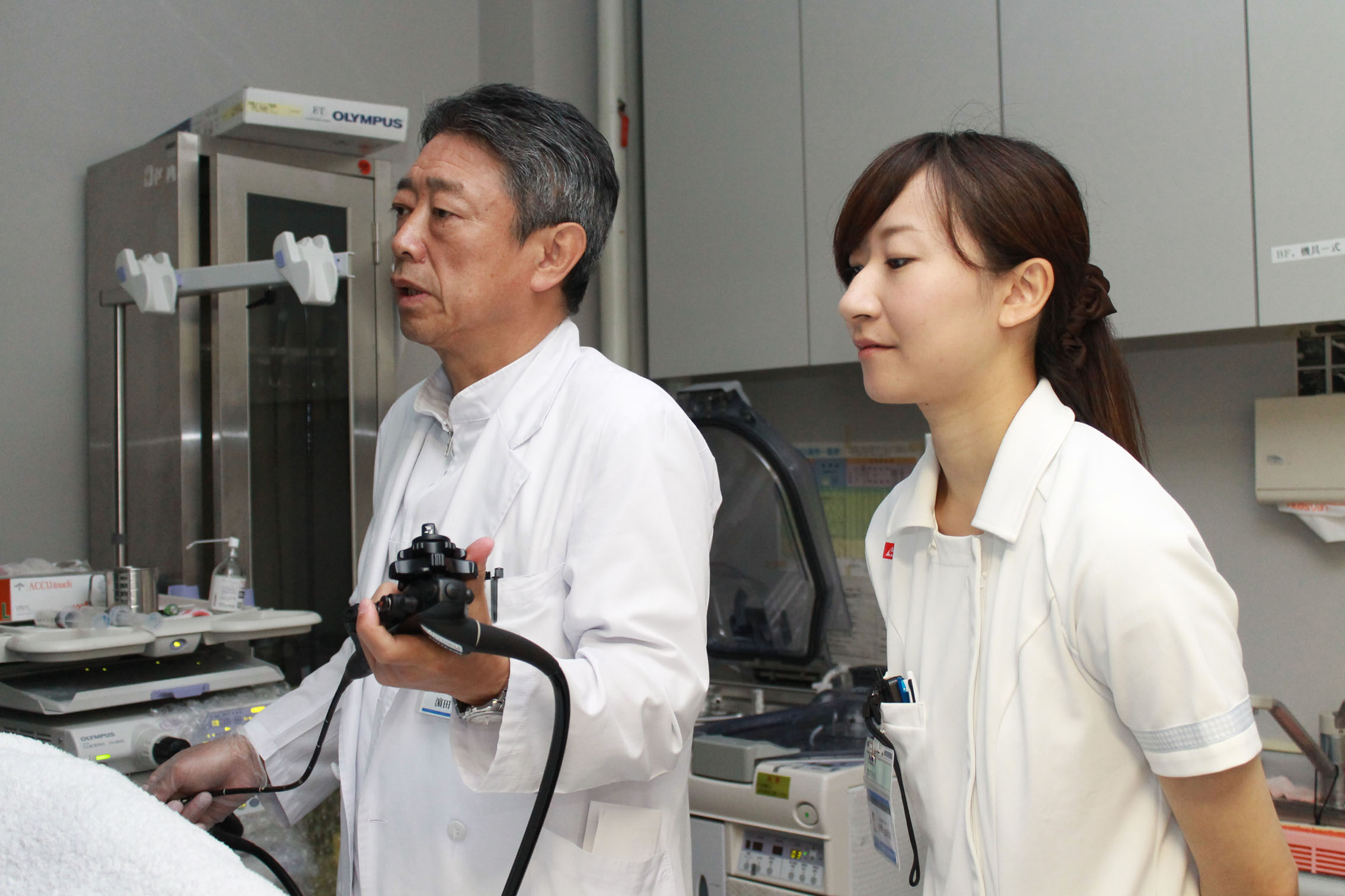 濱田先生指導による赤羽先生の内視鏡検査実習。