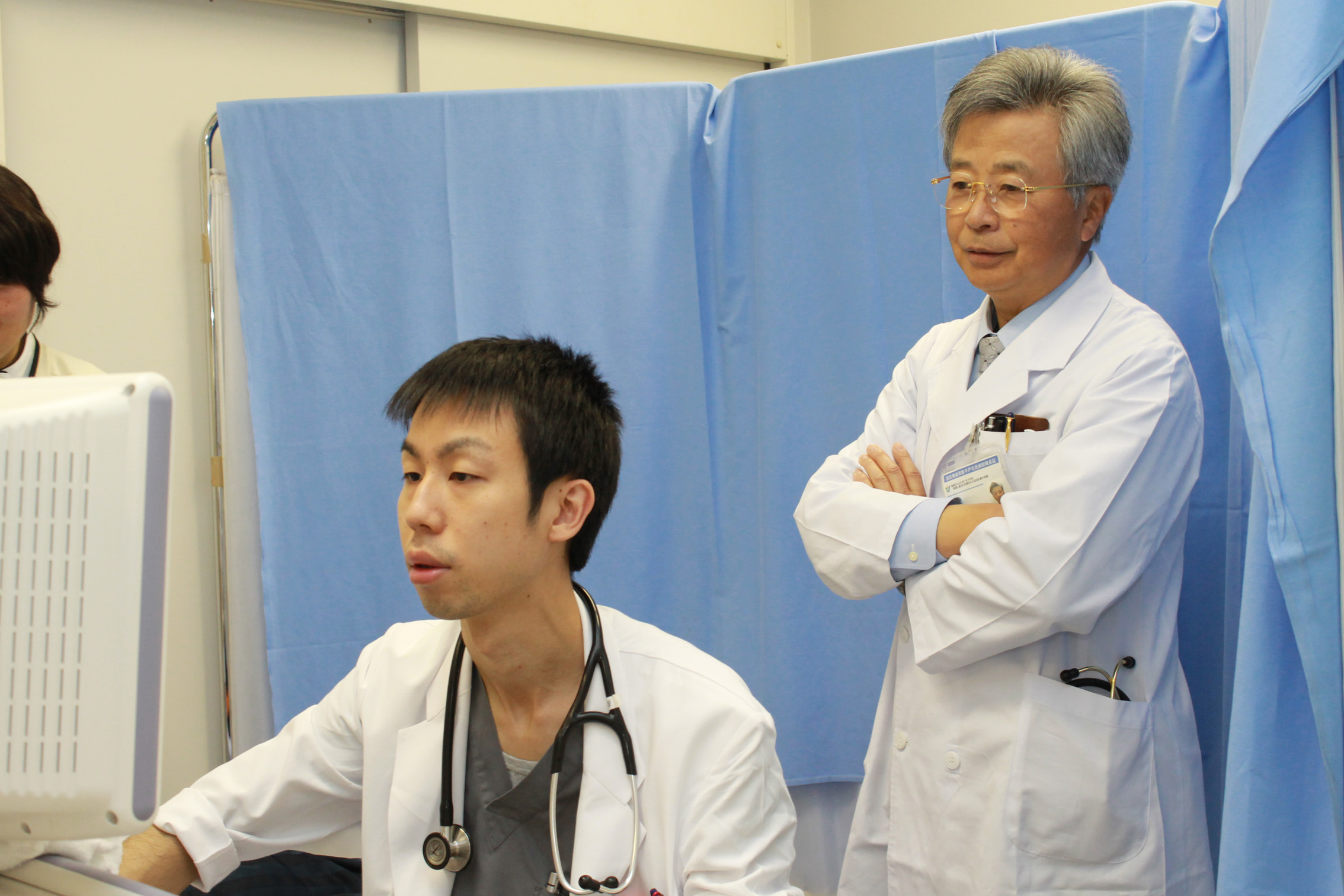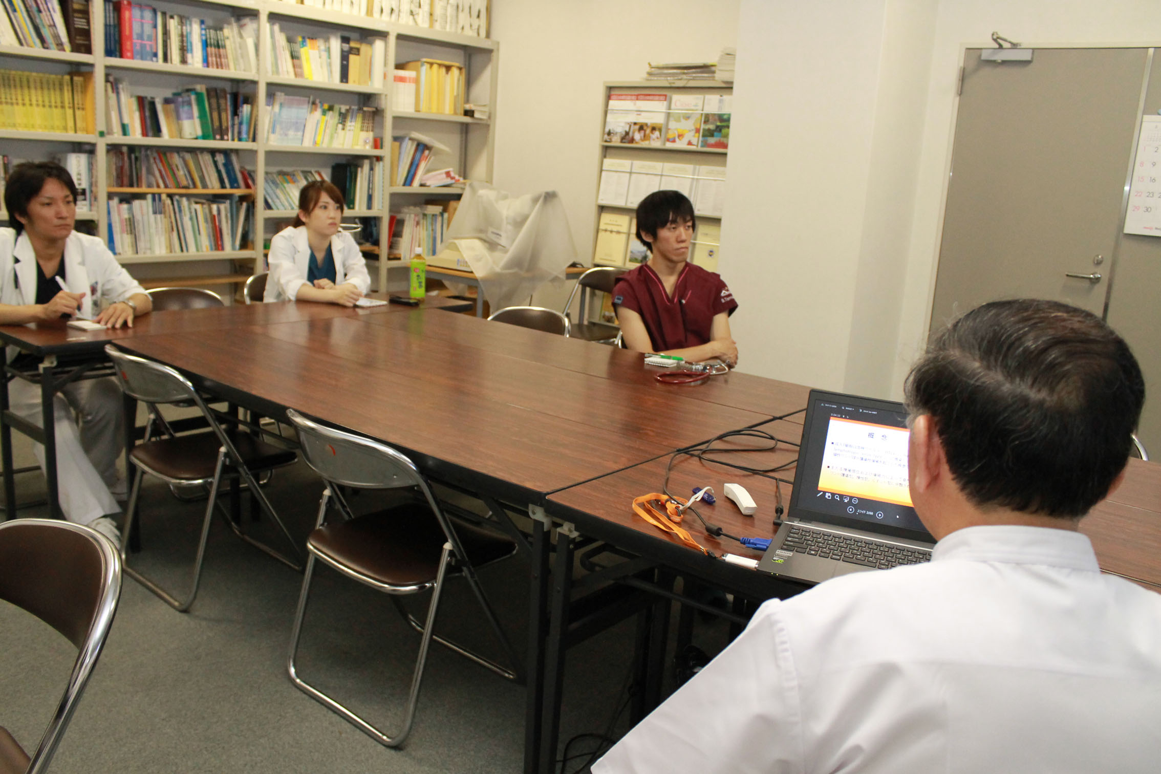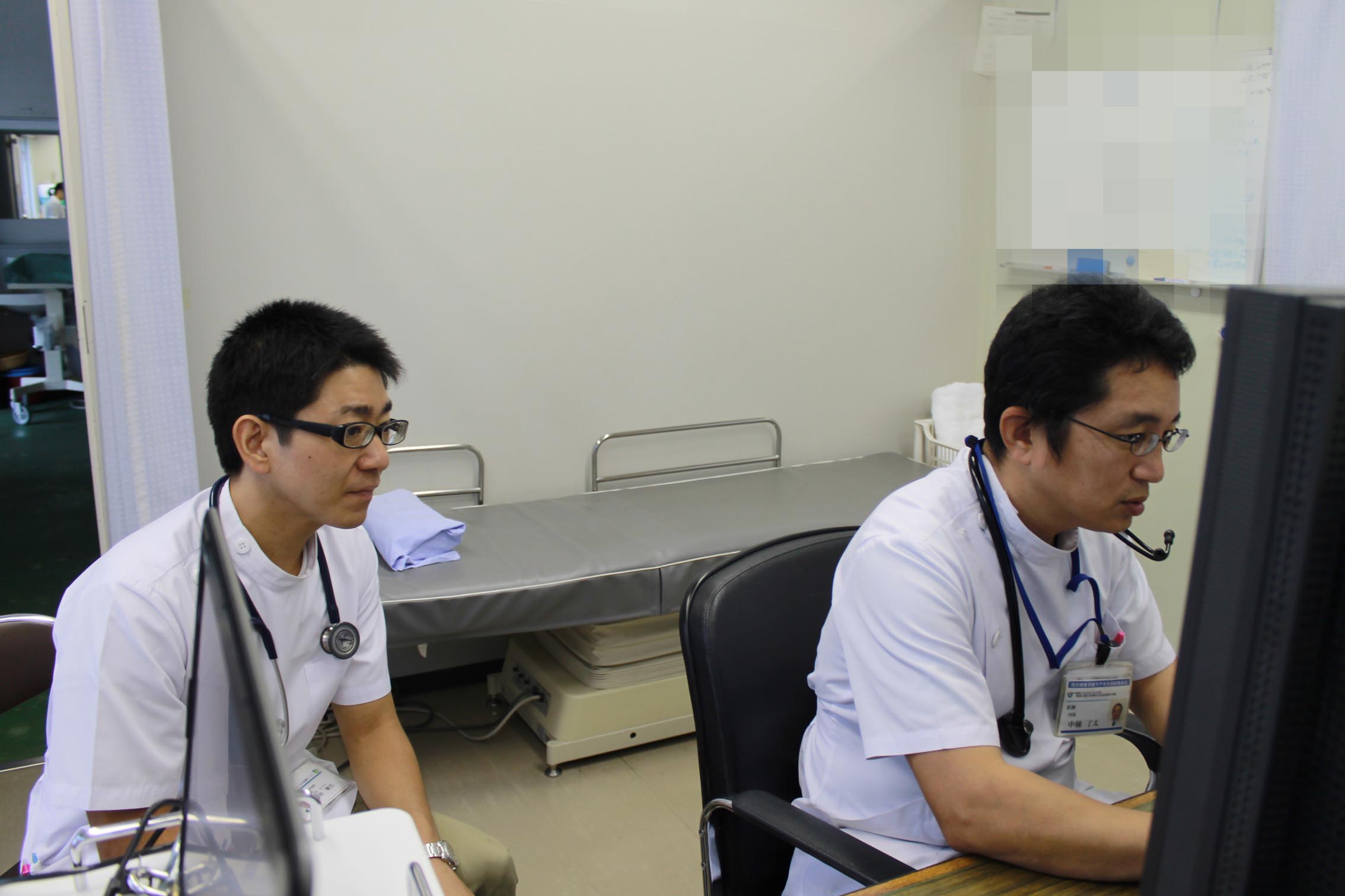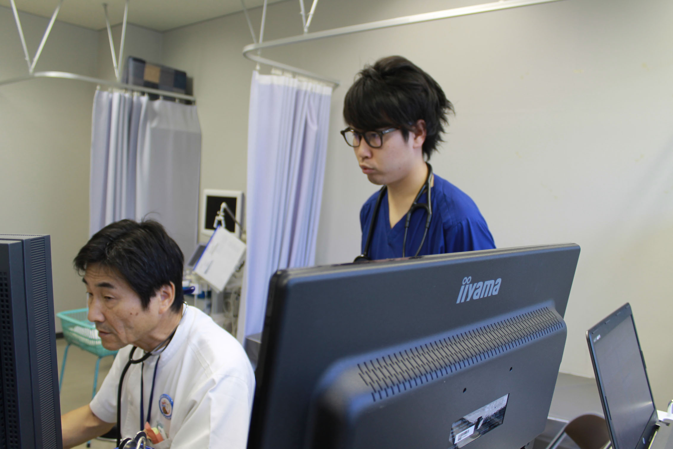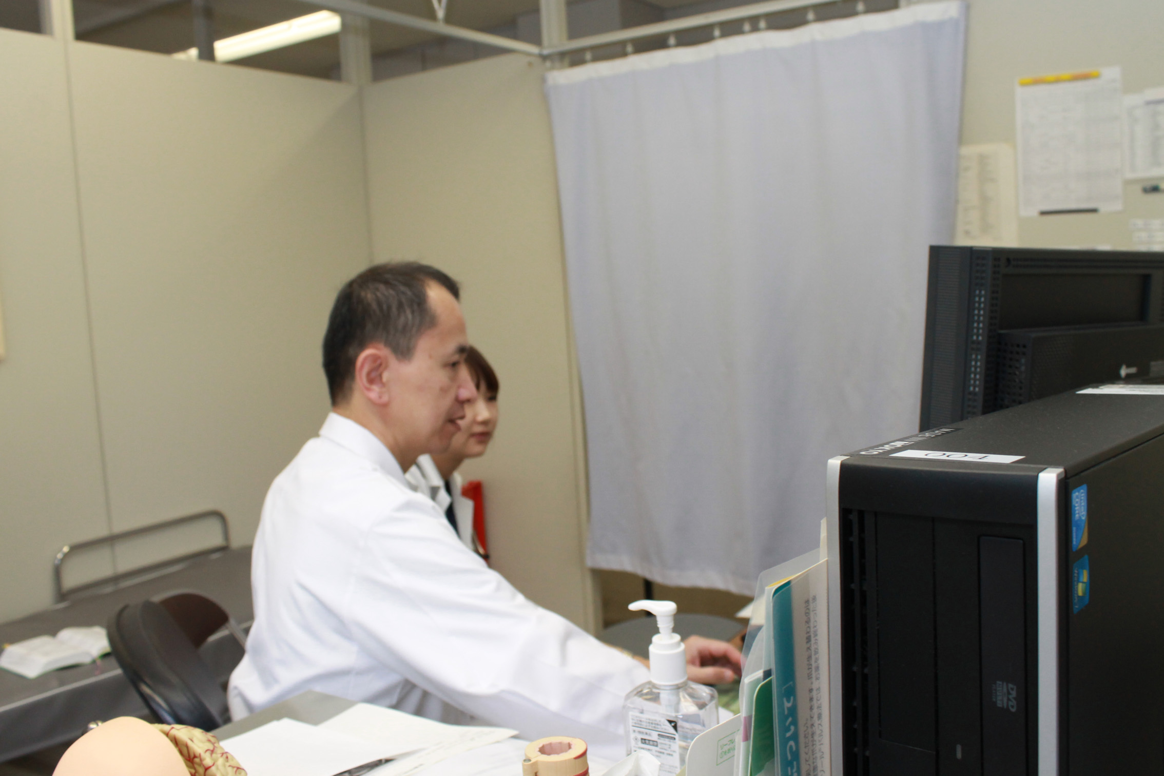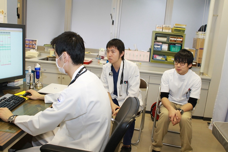中山先生と西森先生が実習中、入院となり手続き中に調先生がレクチャーしている様子です。