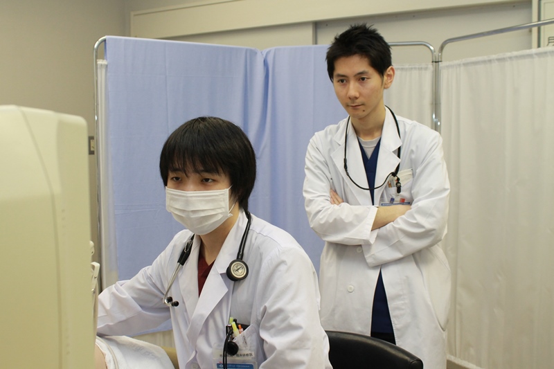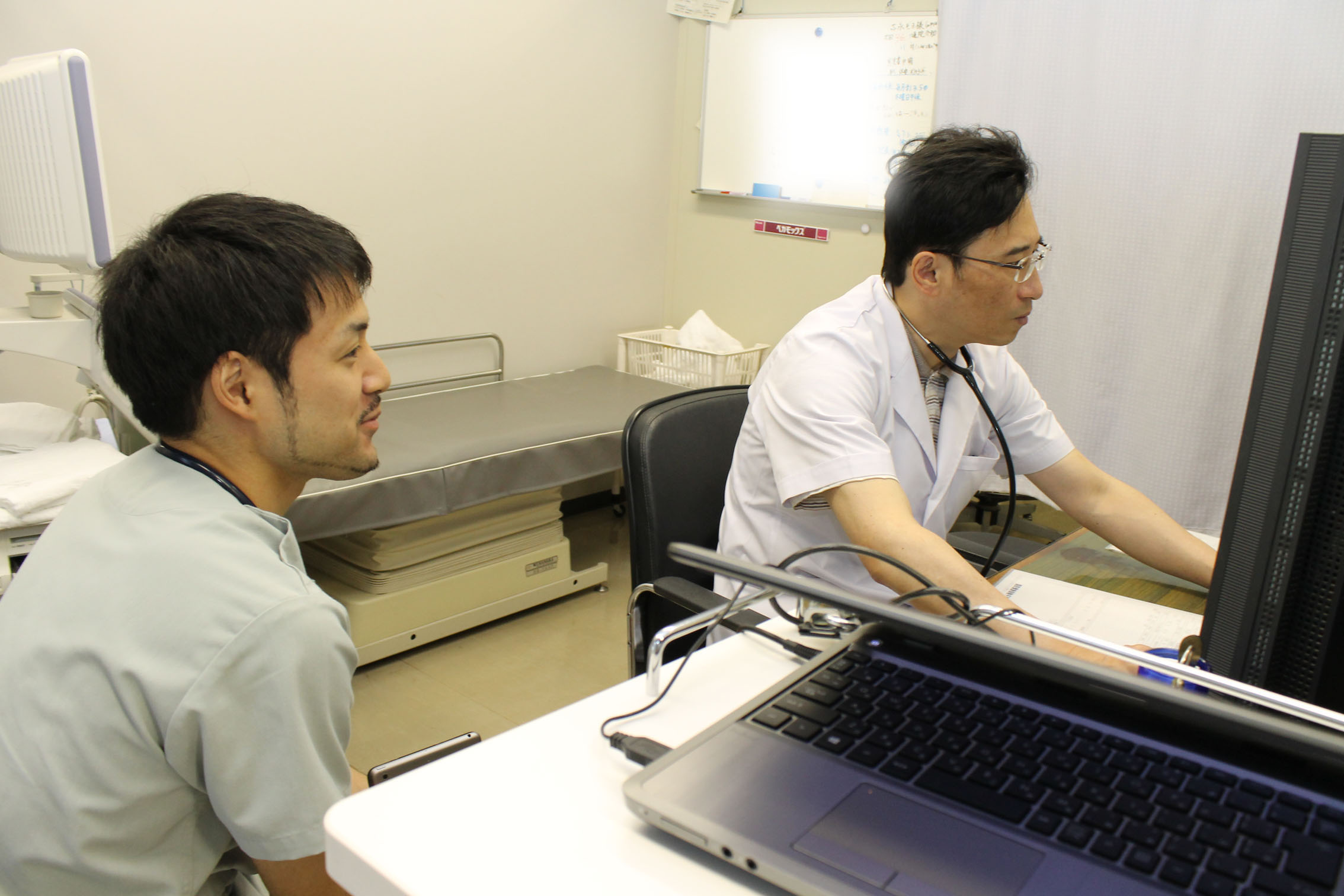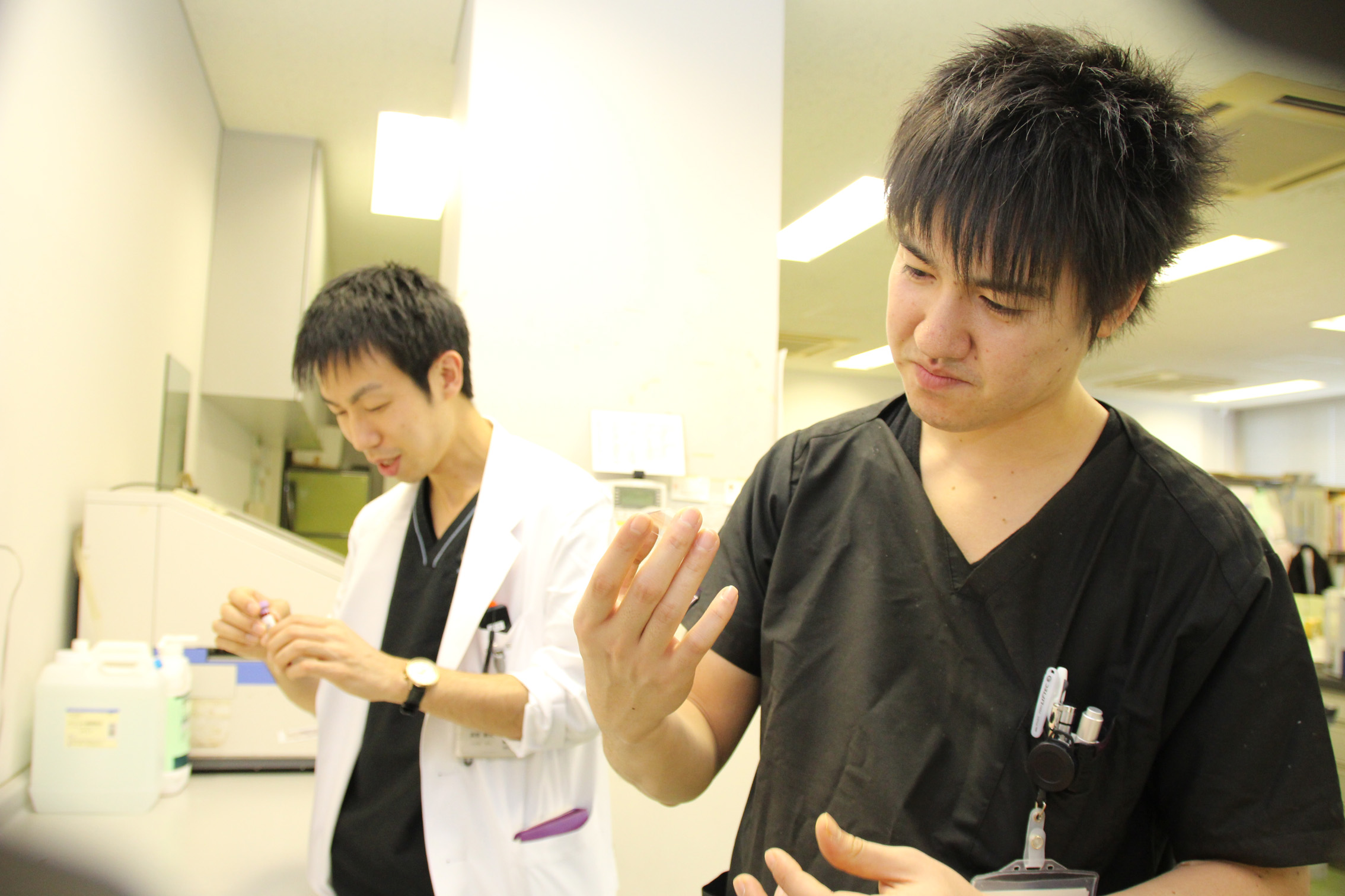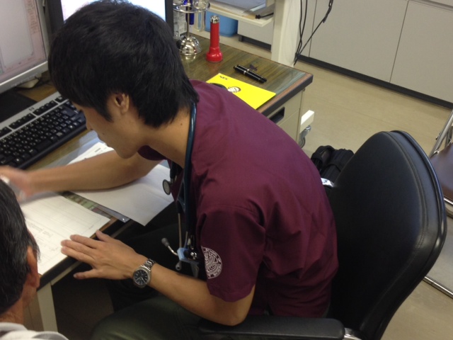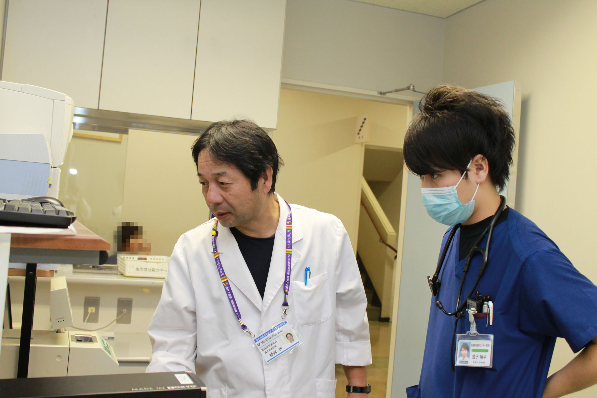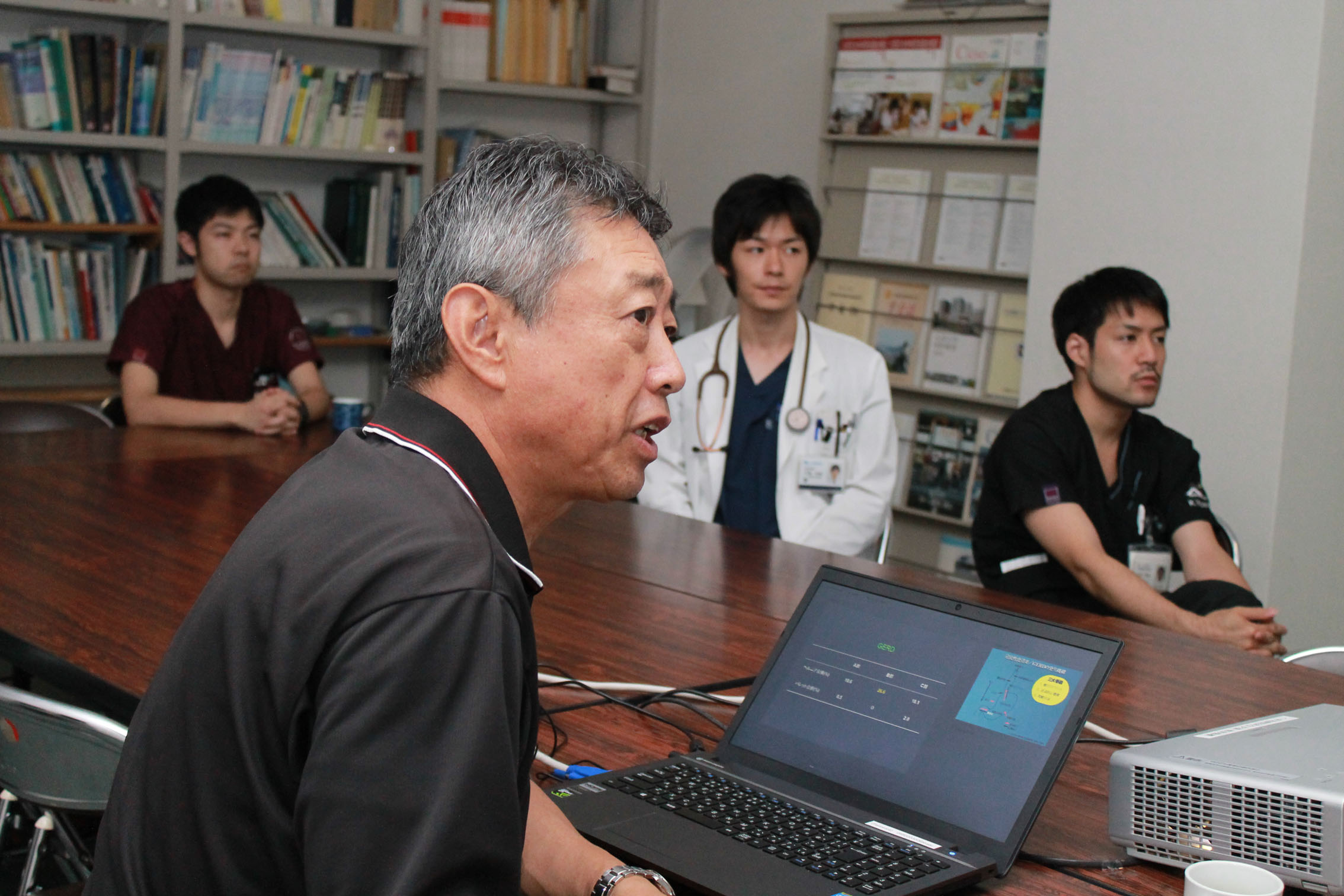 中山先生と西森先生が実習中、入院となり手続き中に調先生がレクチャーしている様子です。