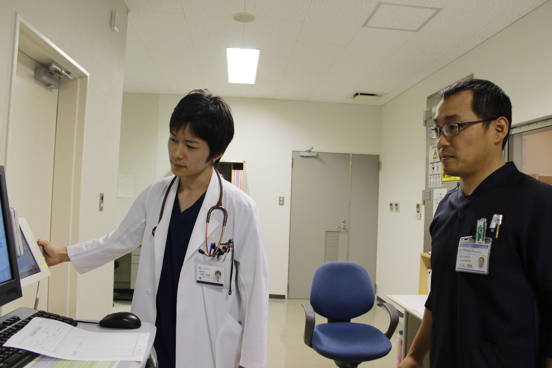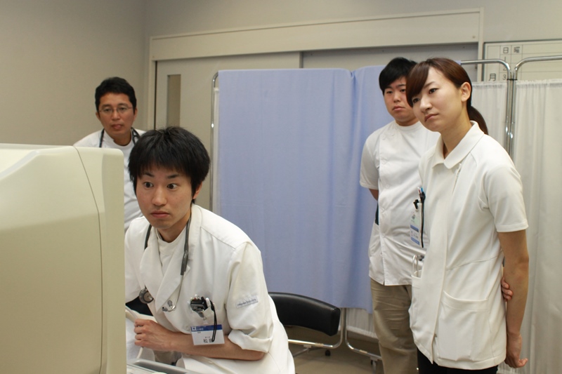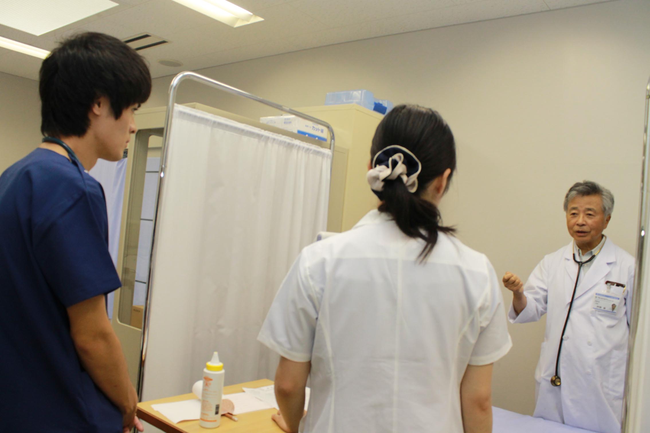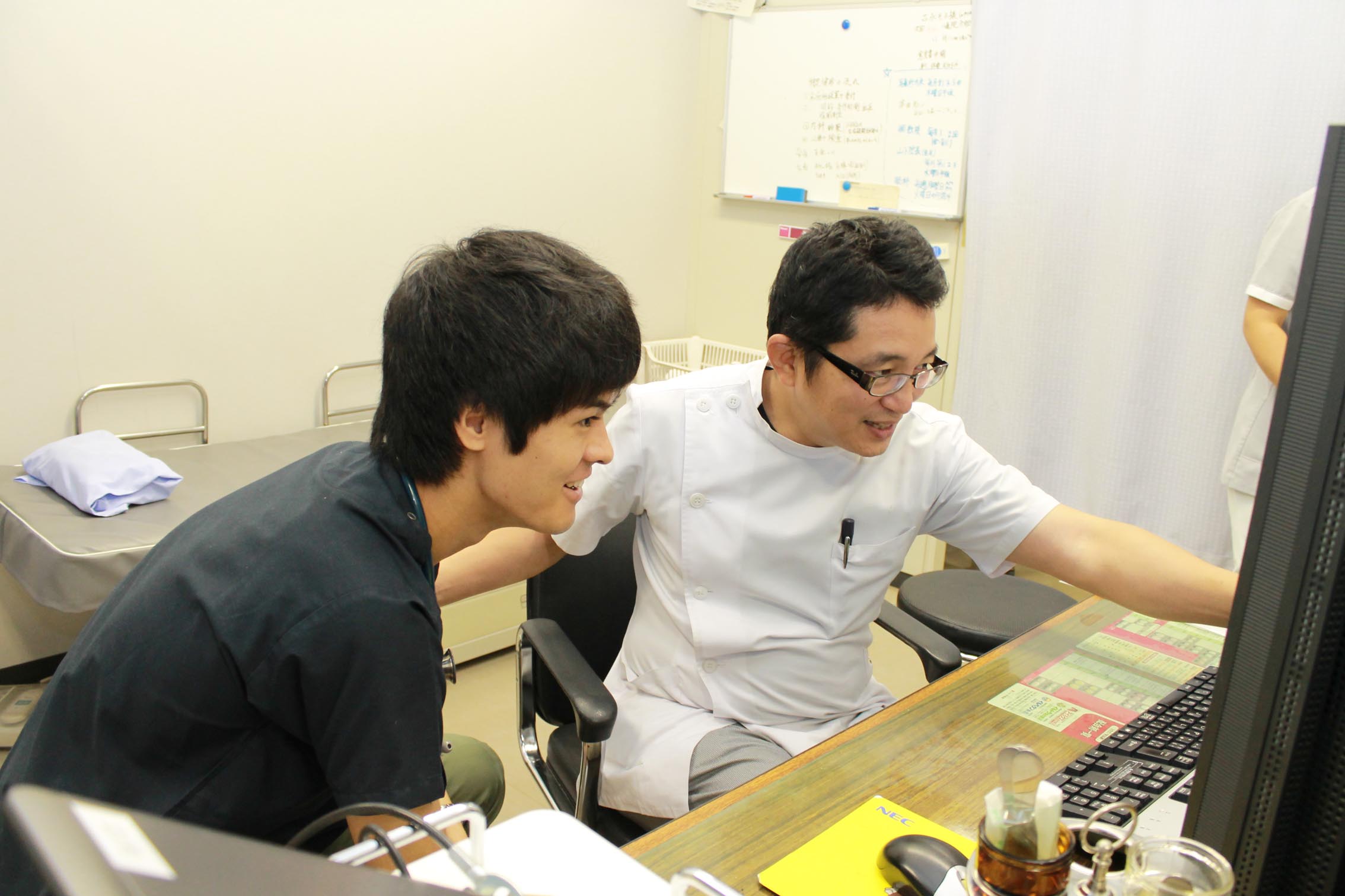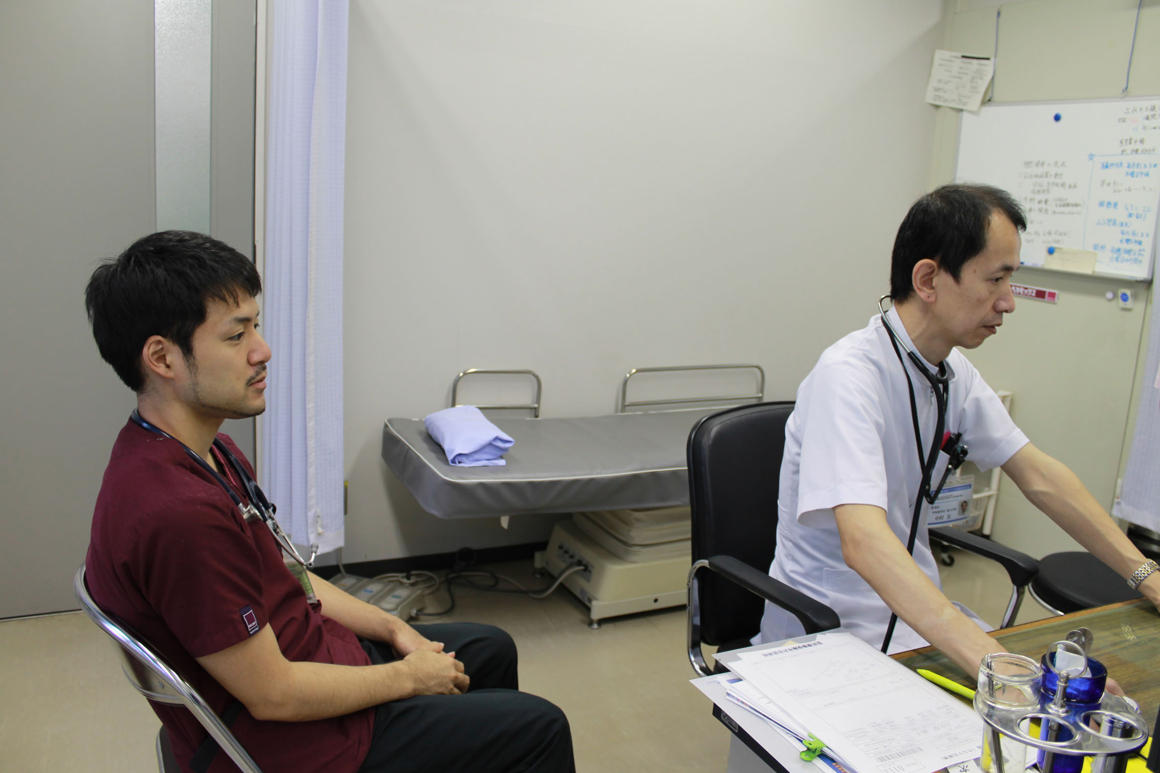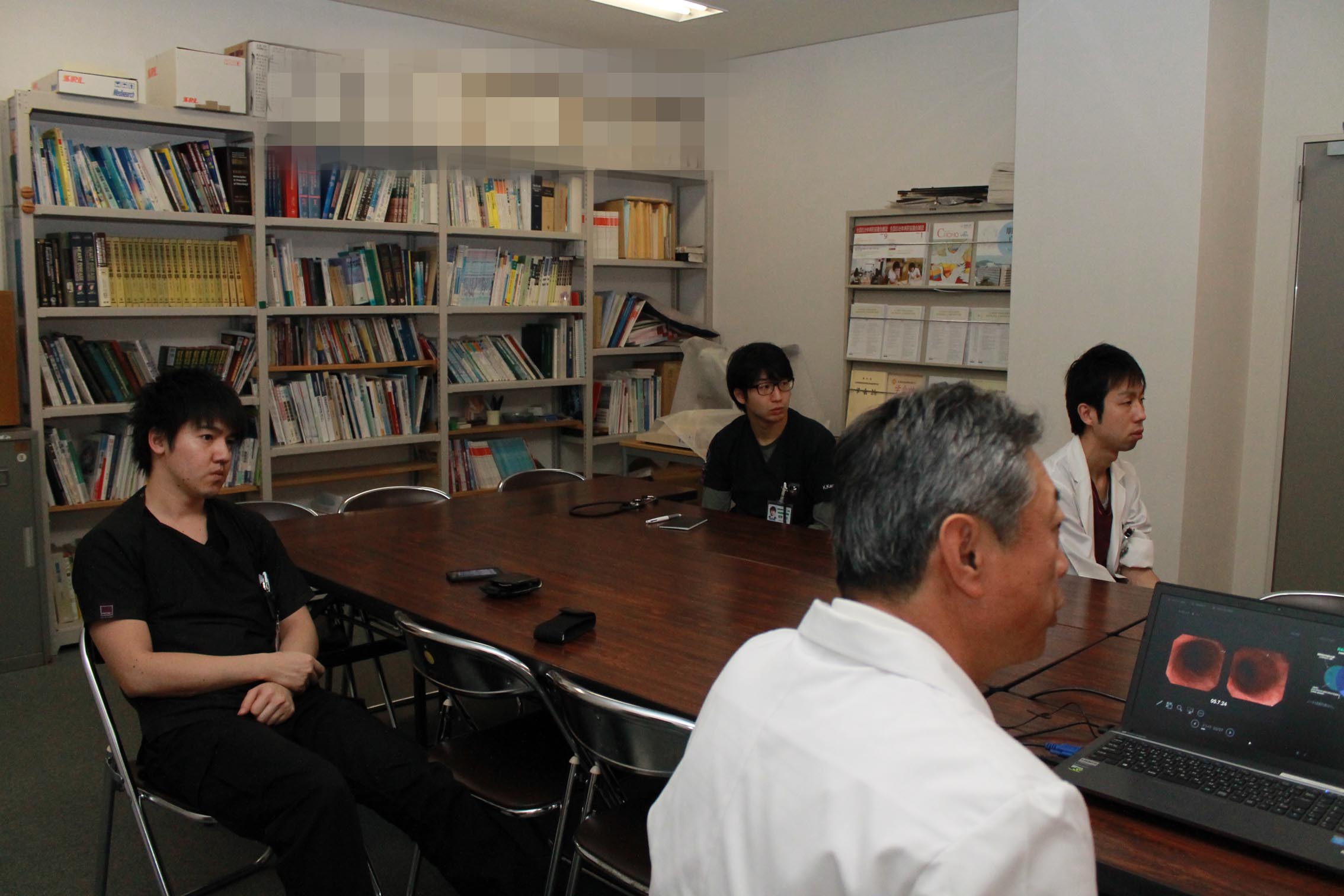 中山先生と西森先生が実習中、入院となり手続き中に調先生がレクチャーしている様子です。