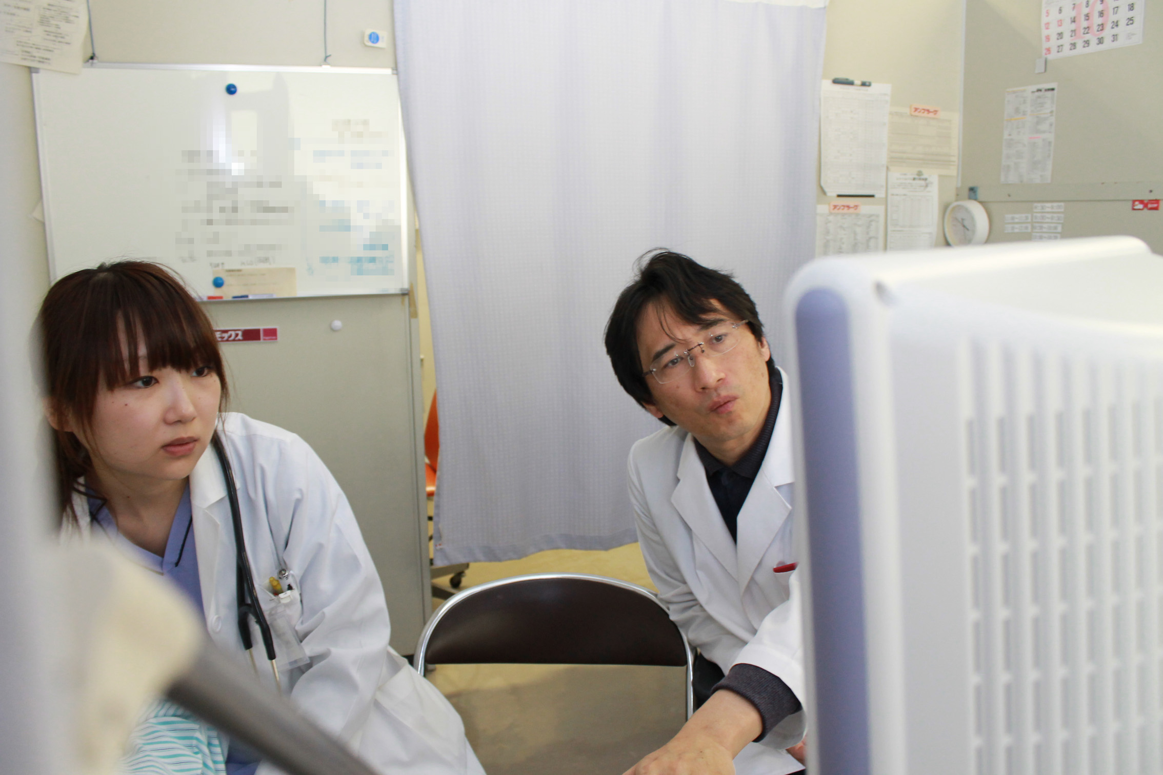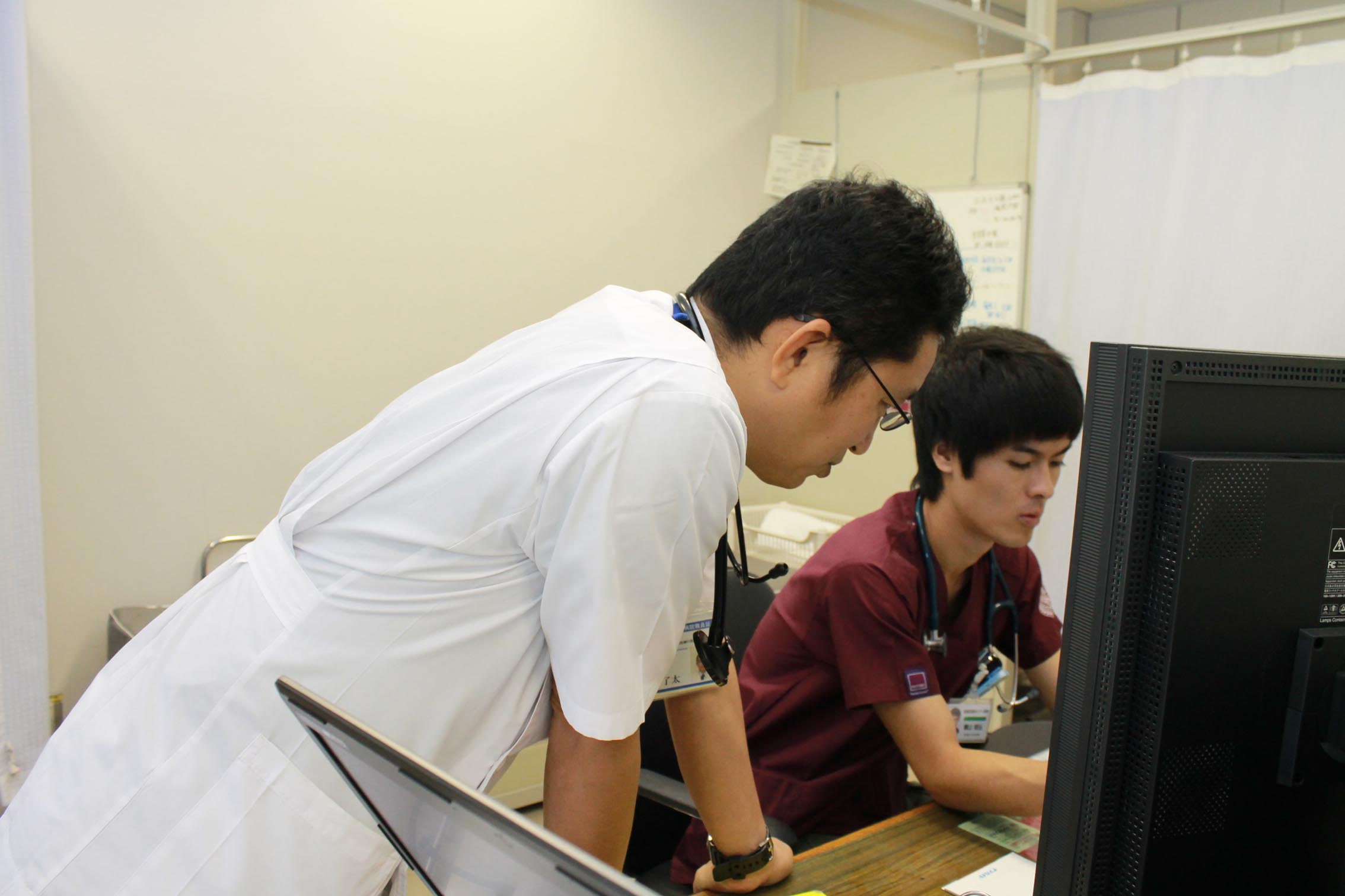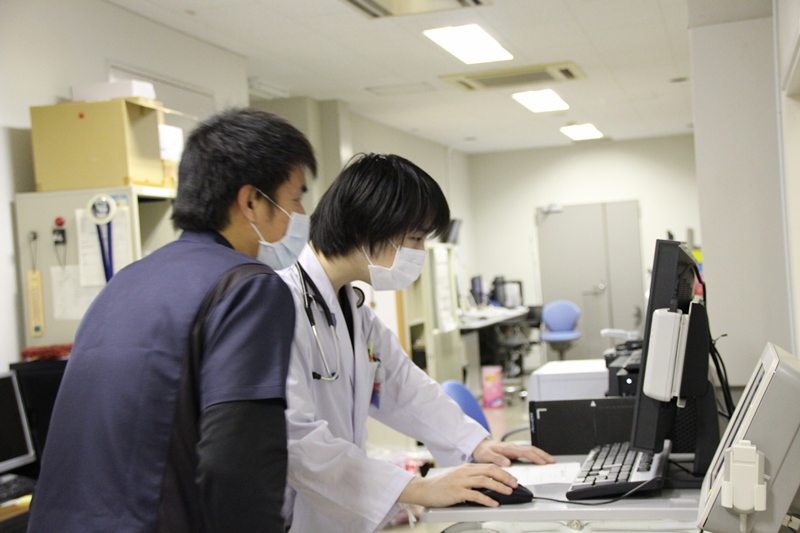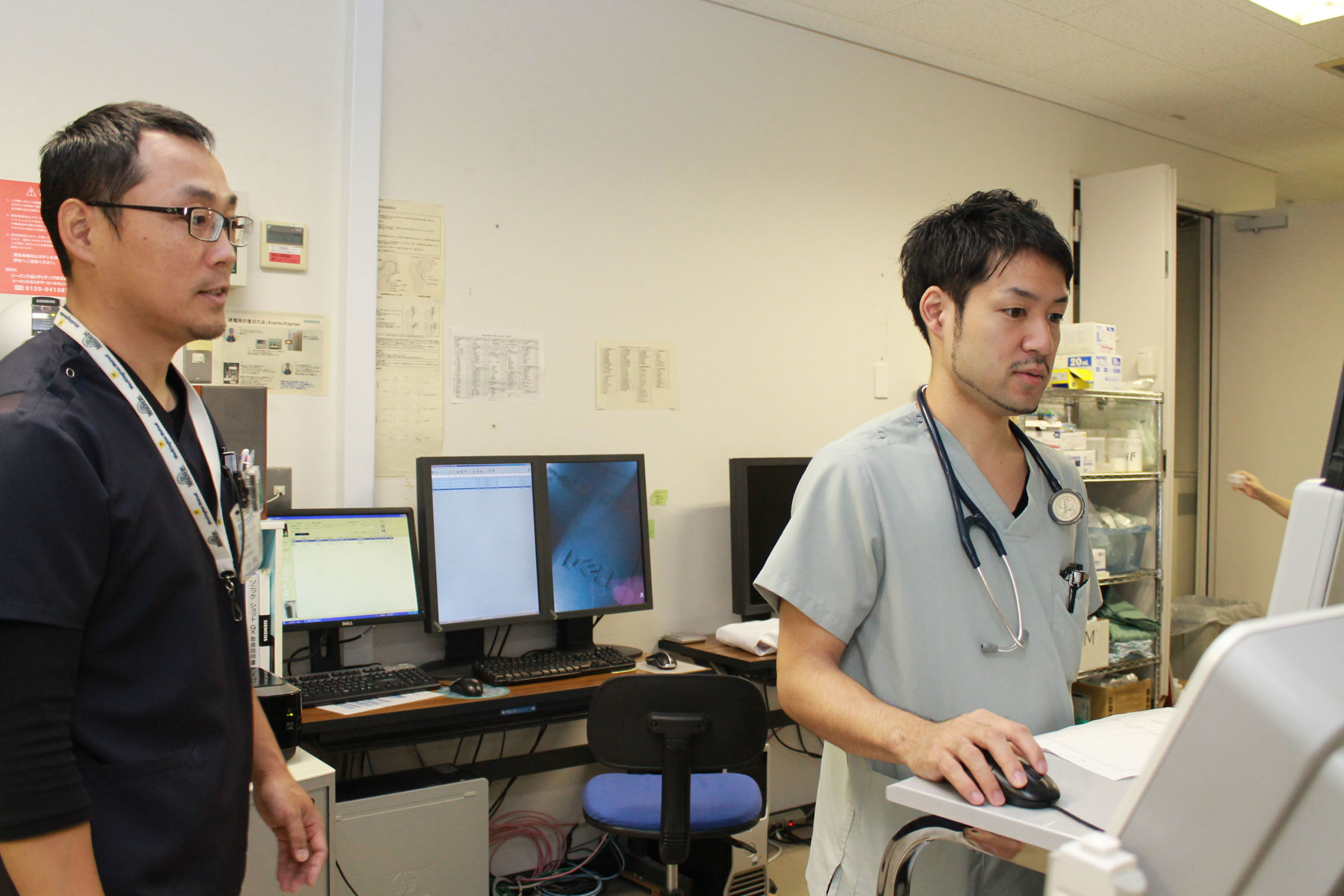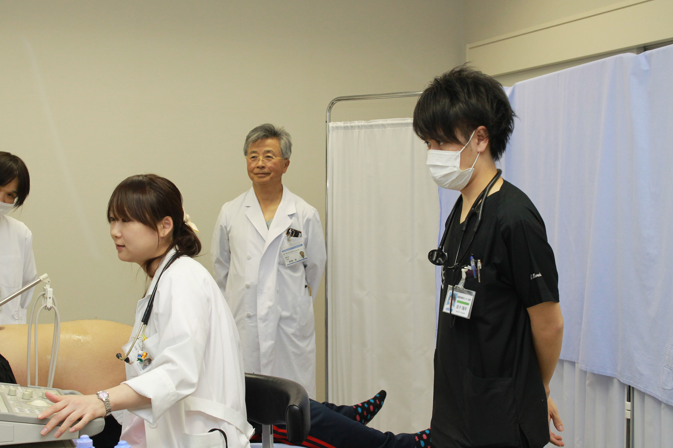 中山先生と西森先生が実習中、入院となり手続き中に調先生がレクチャーしている様子です。