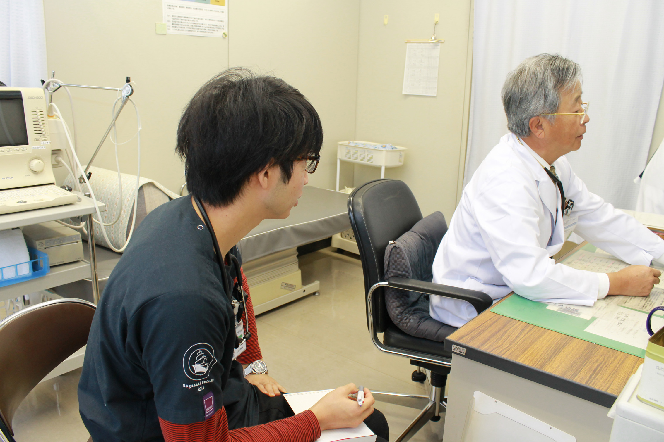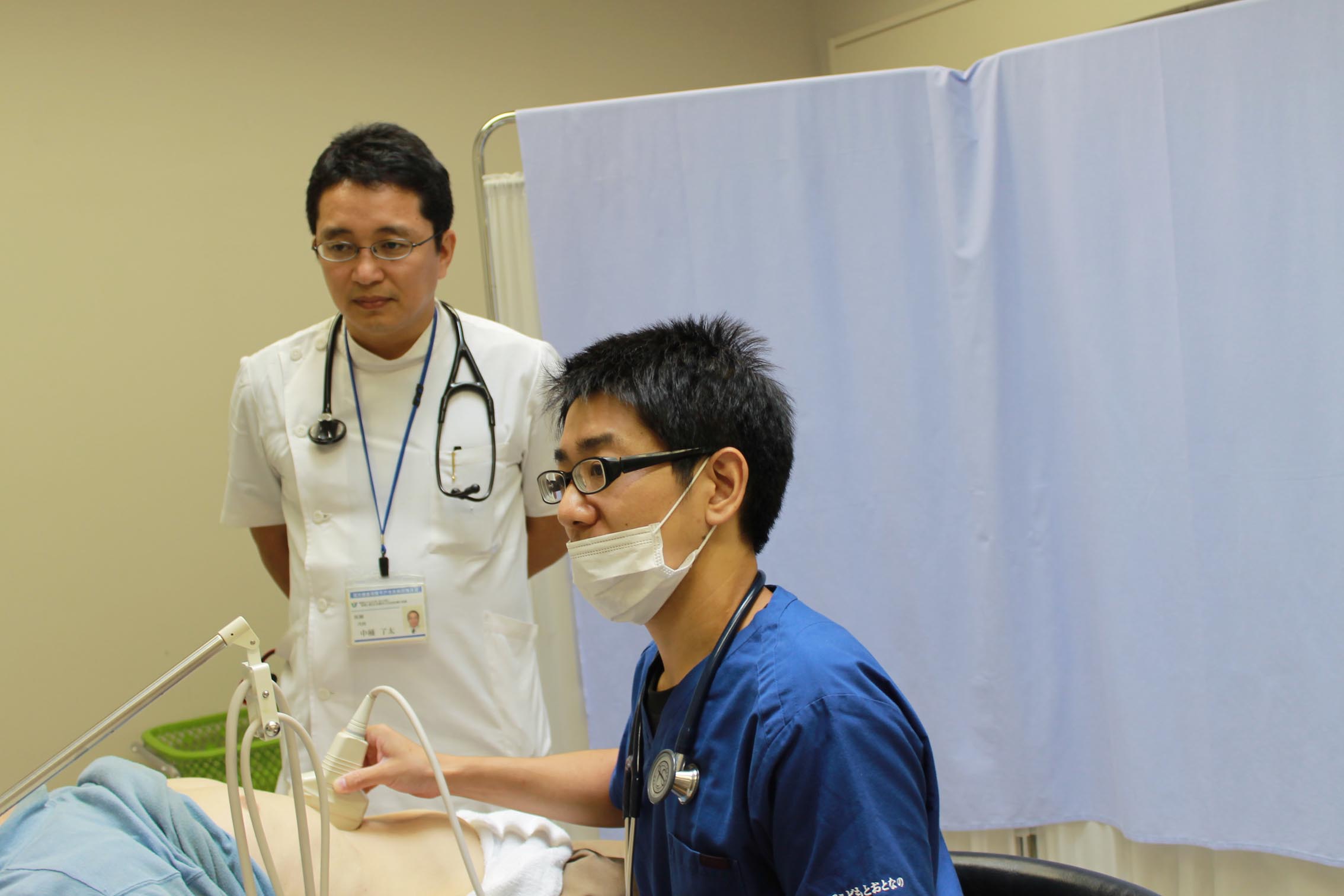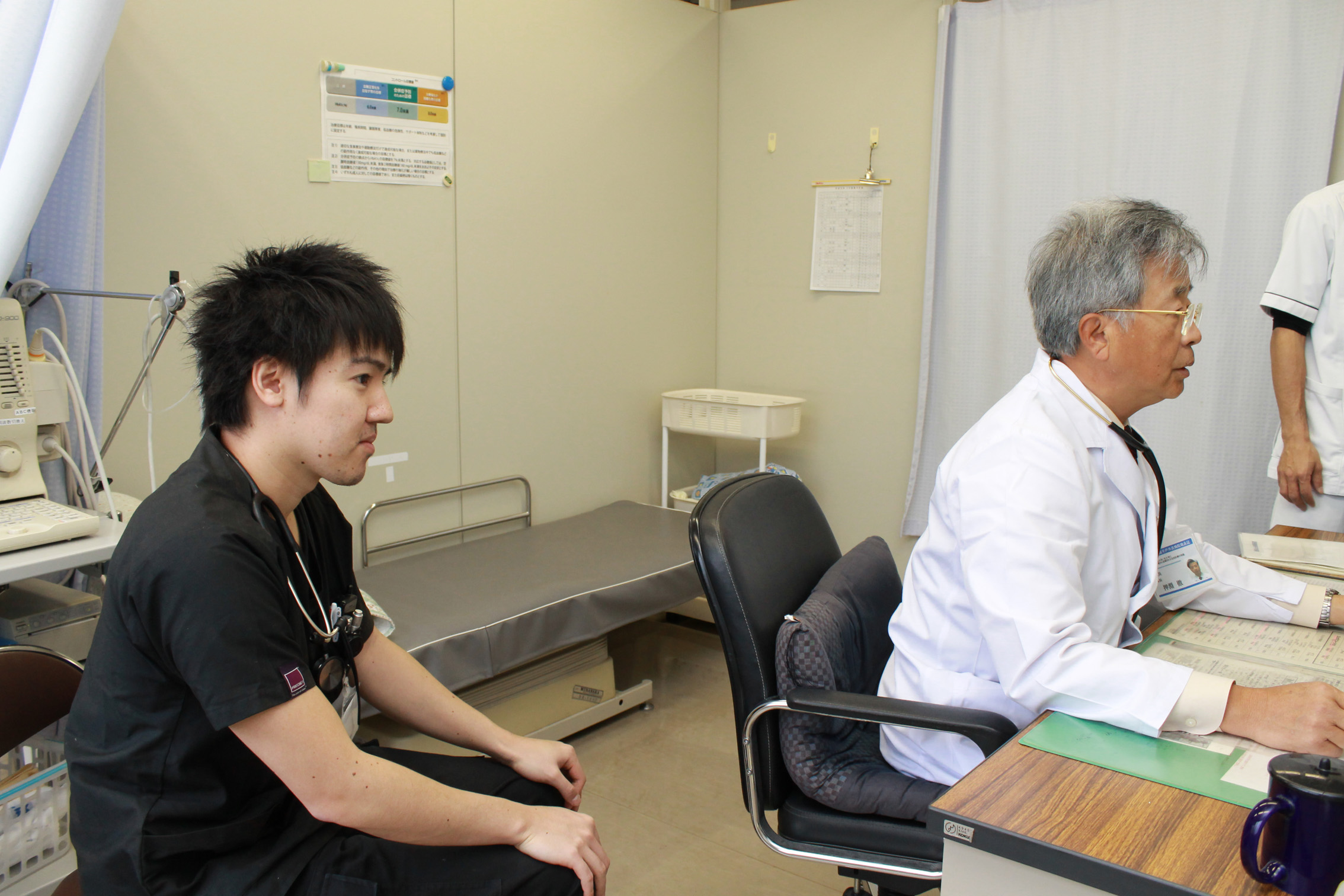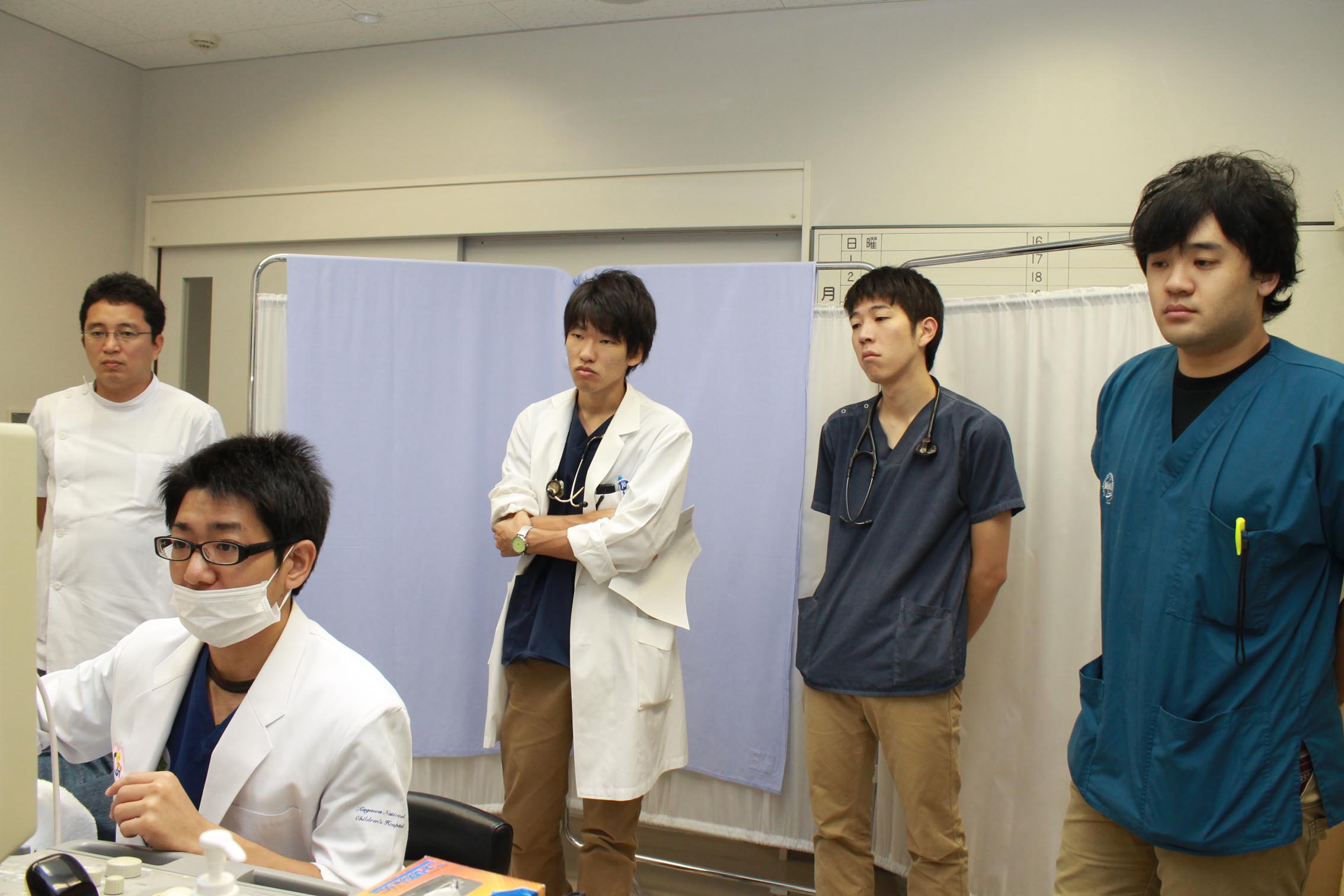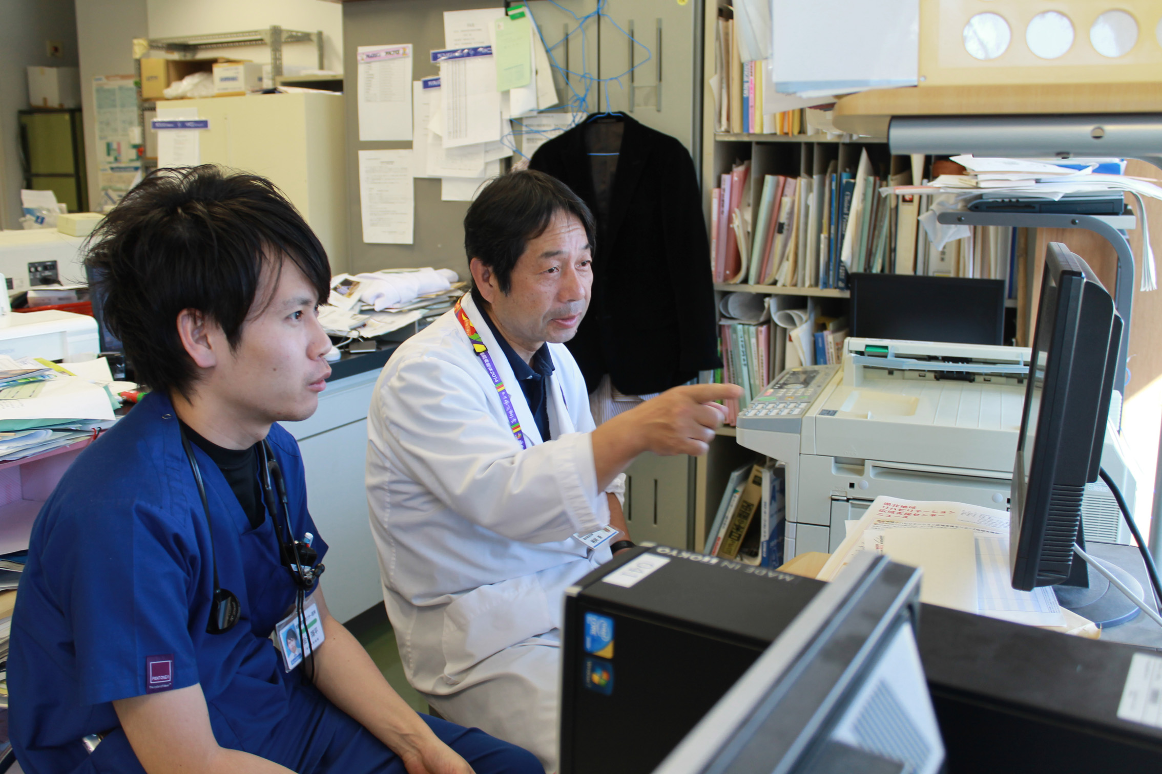 中山先生と西森先生が実習中、入院となり手続き中に調先生がレクチャーしている様子です。