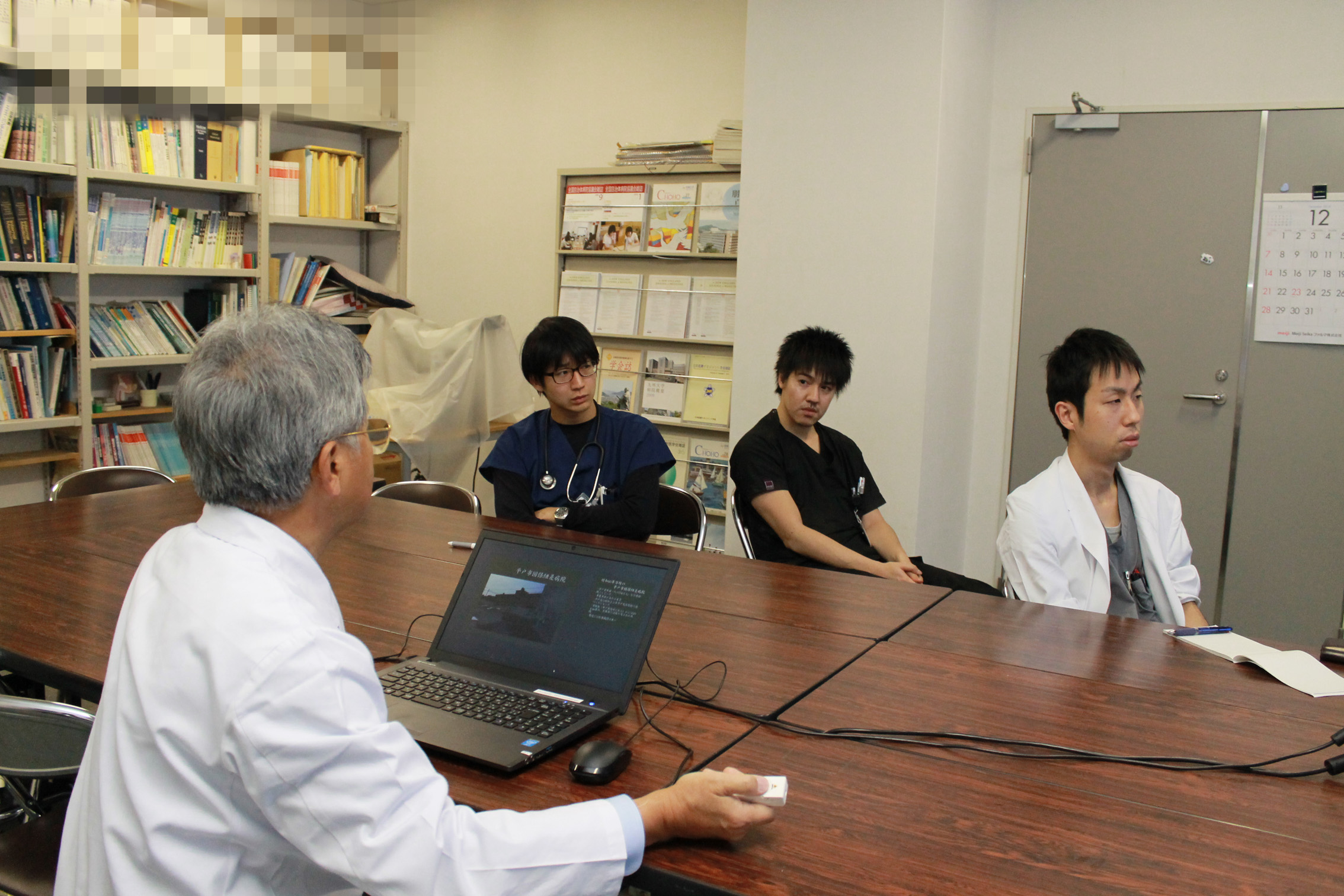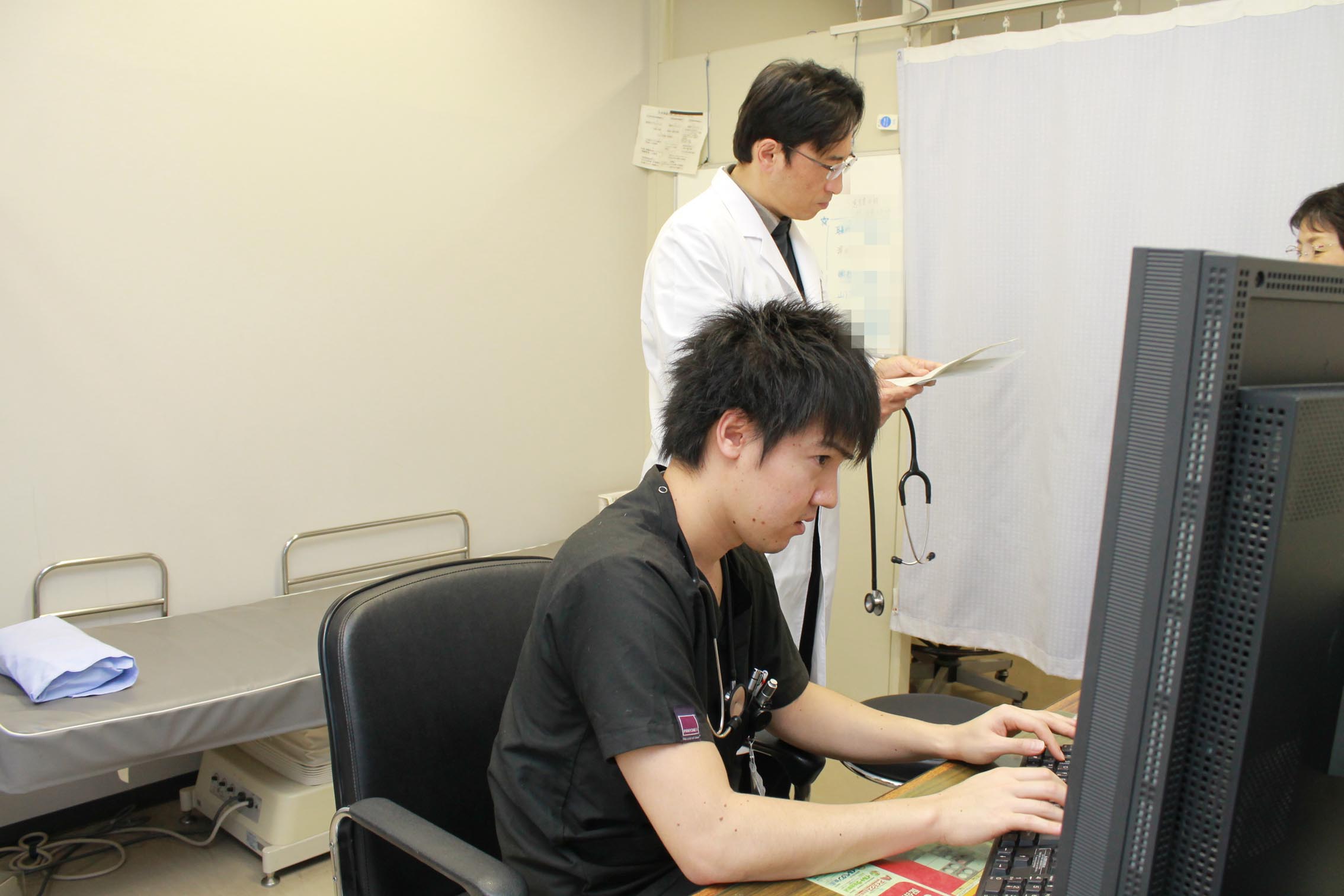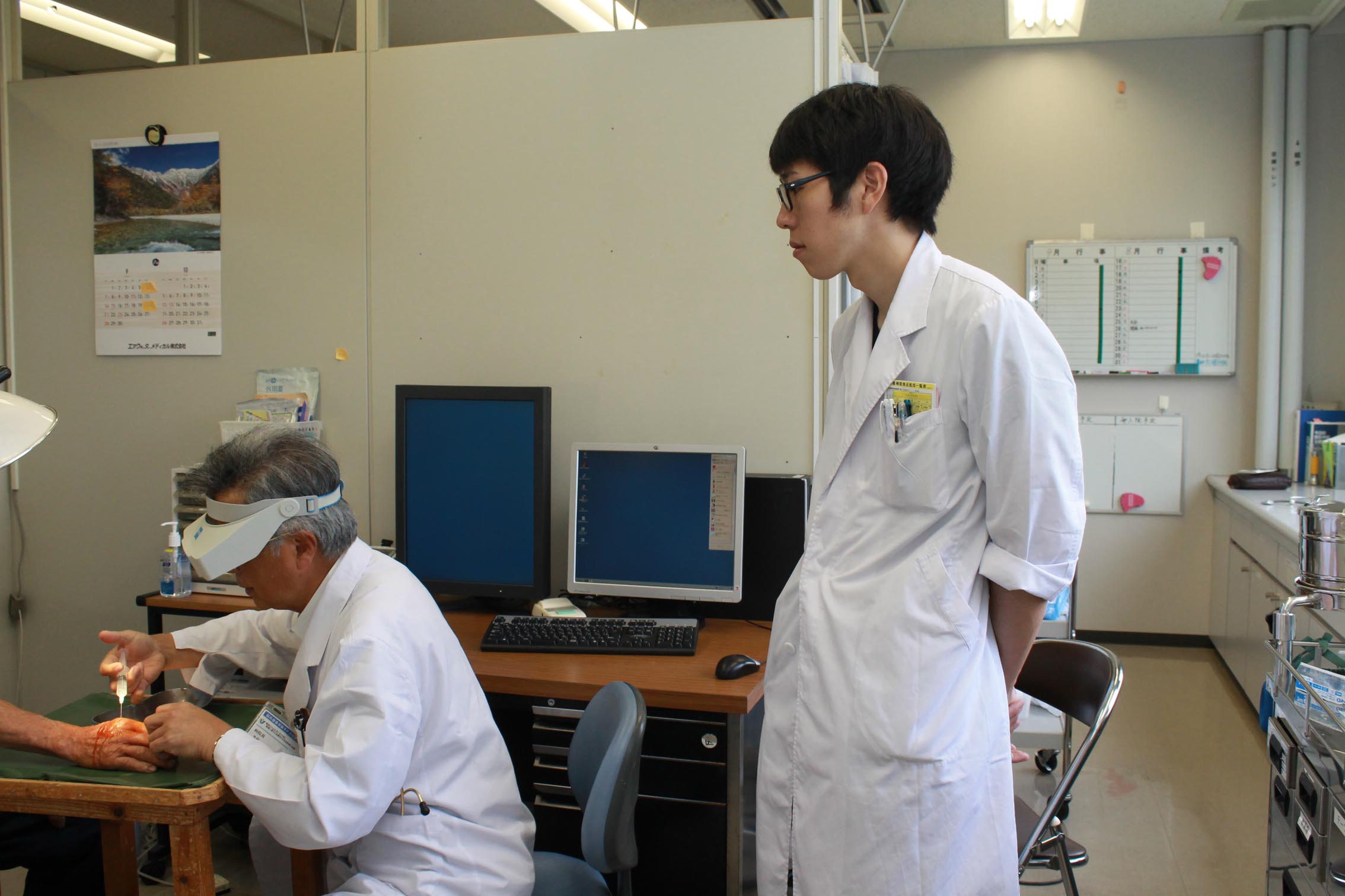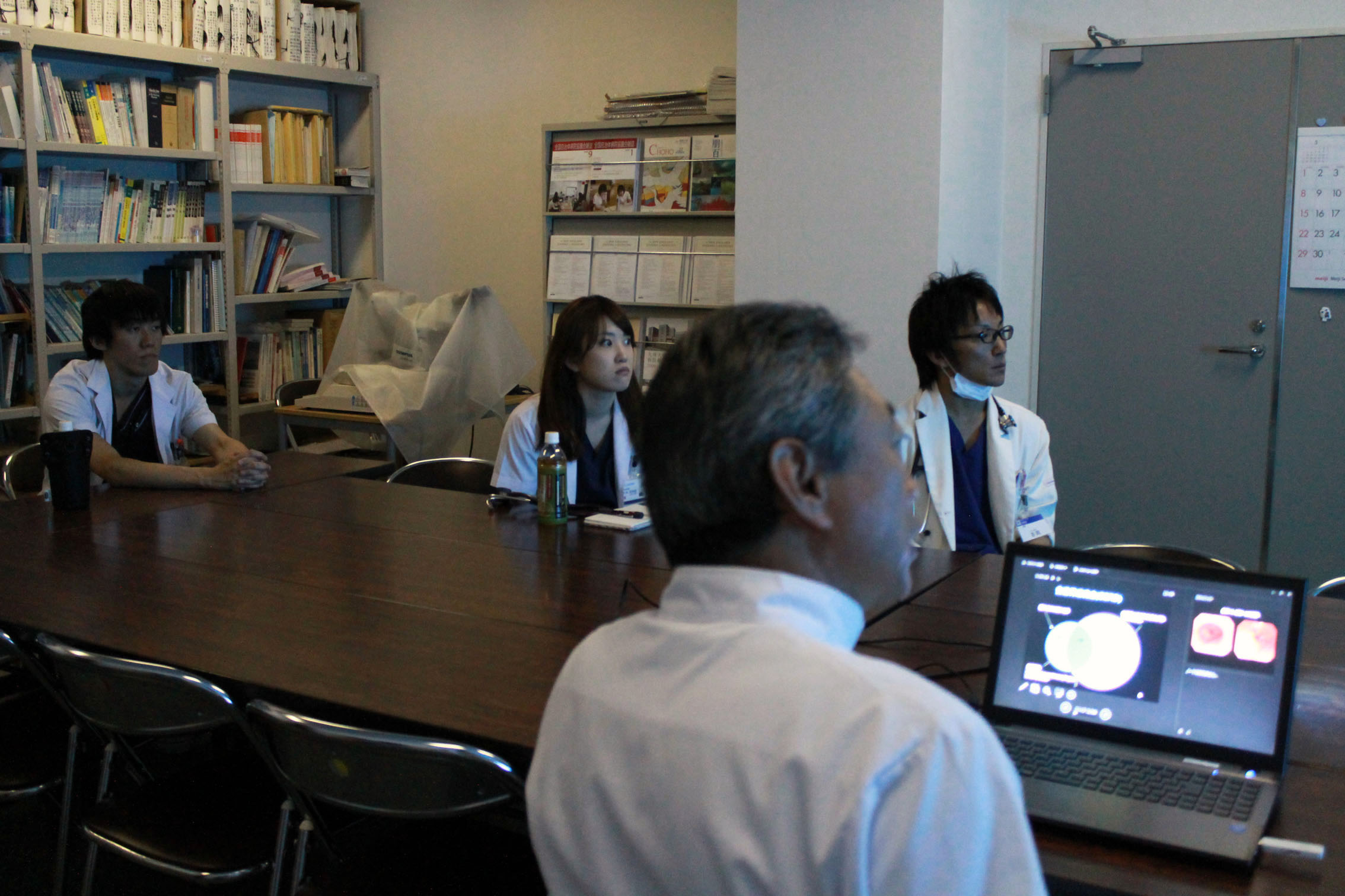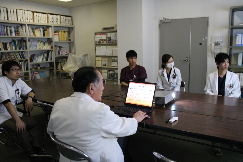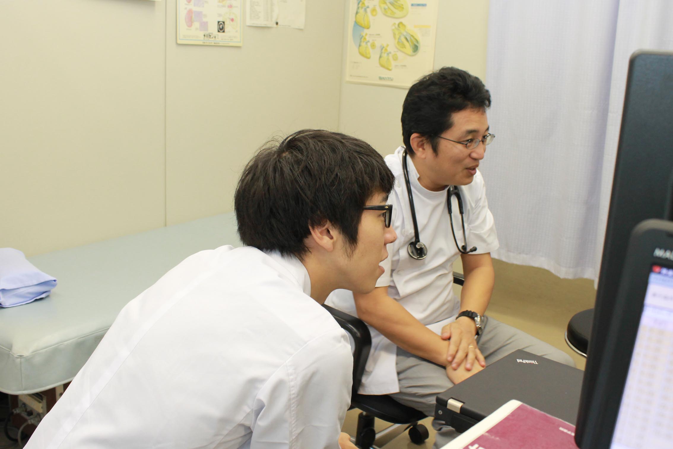 中山先生と西森先生が実習中、入院となり手続き中に調先生がレクチャーしている様子です。