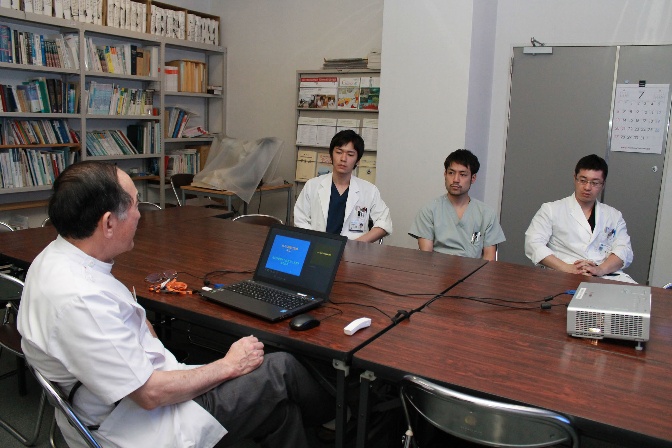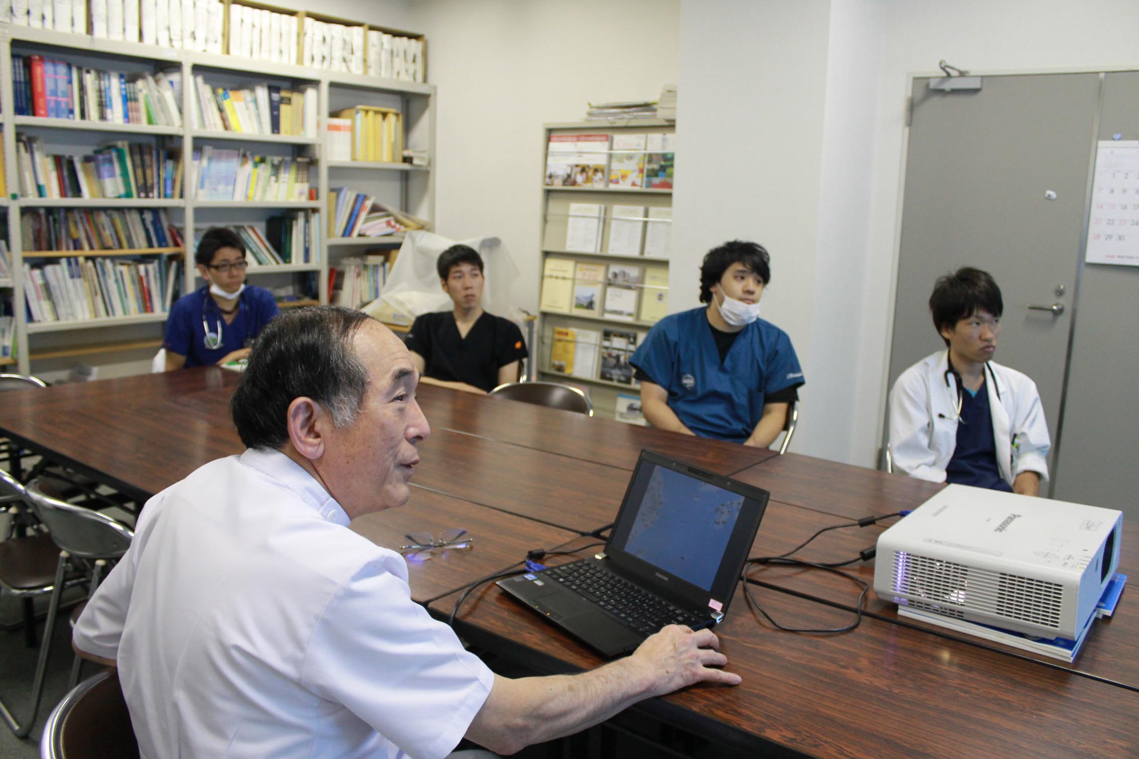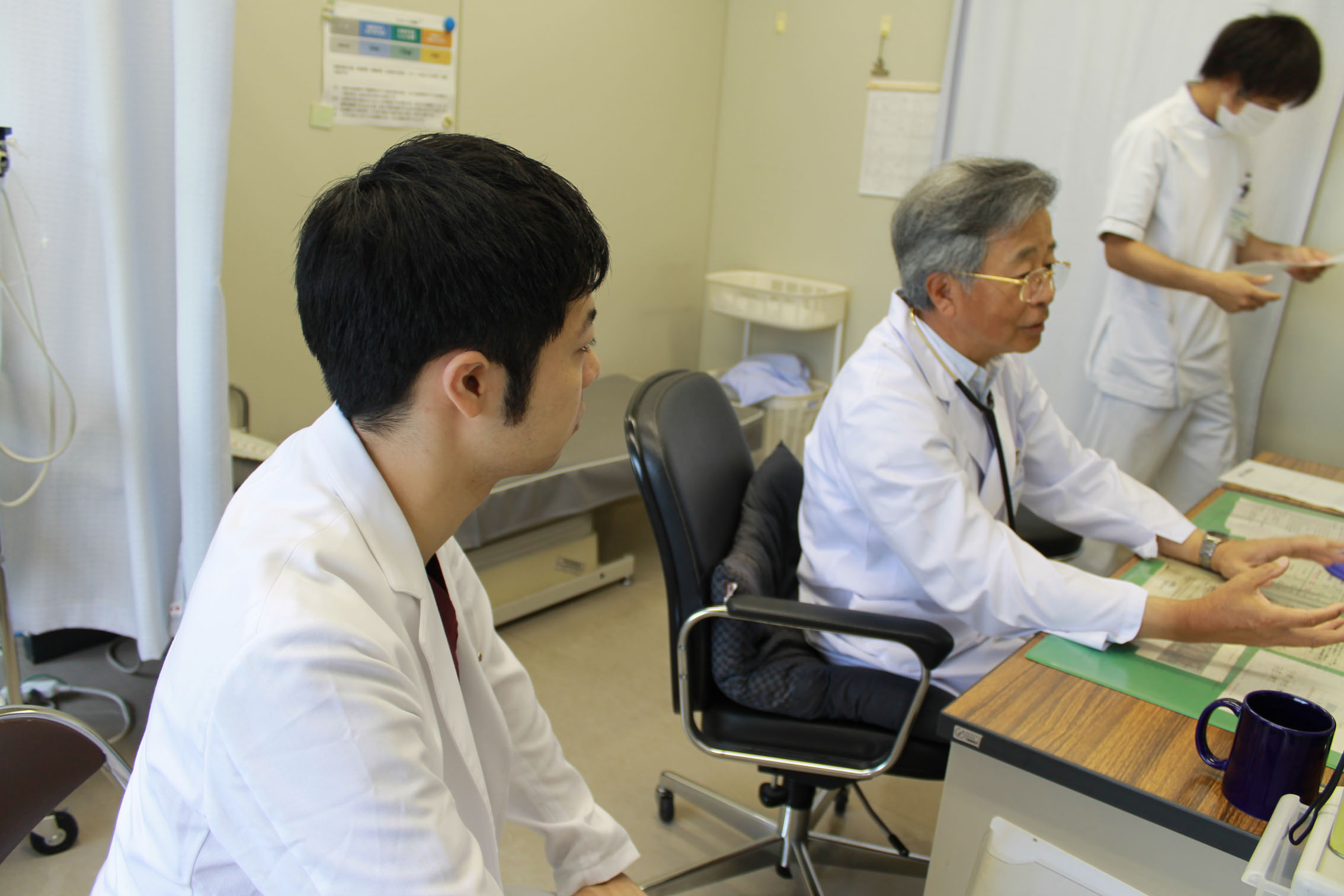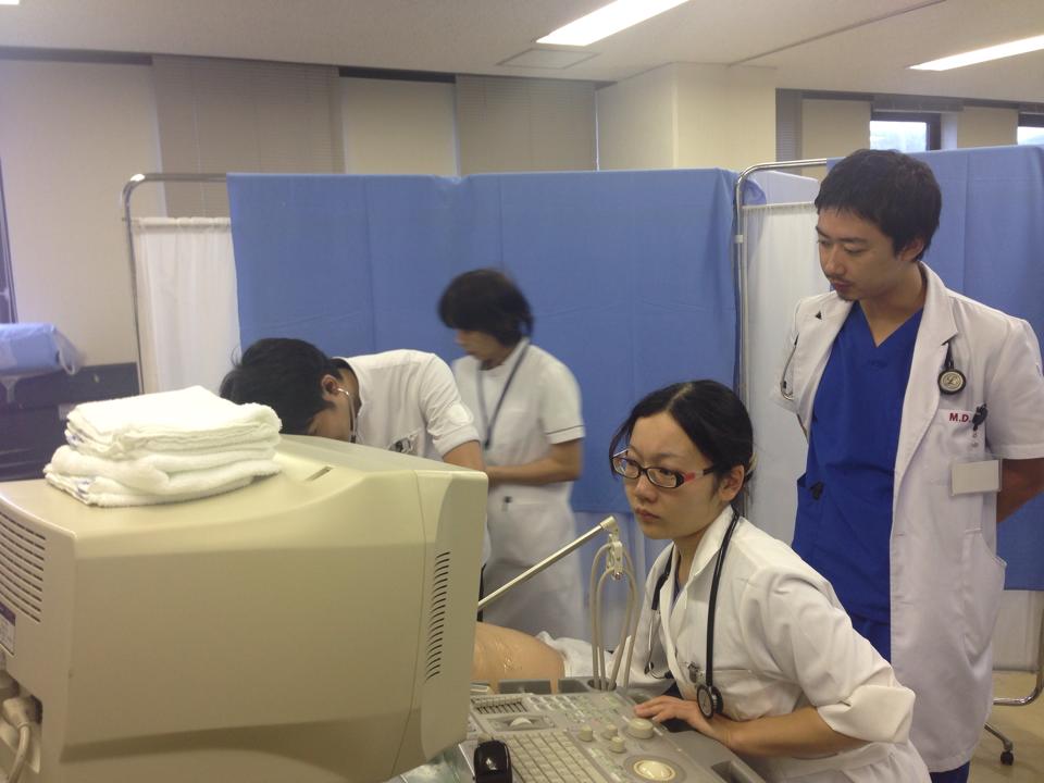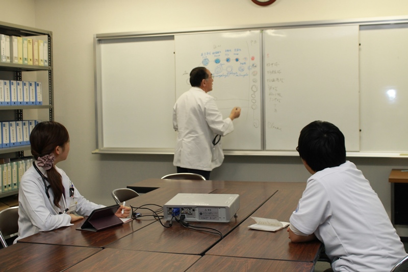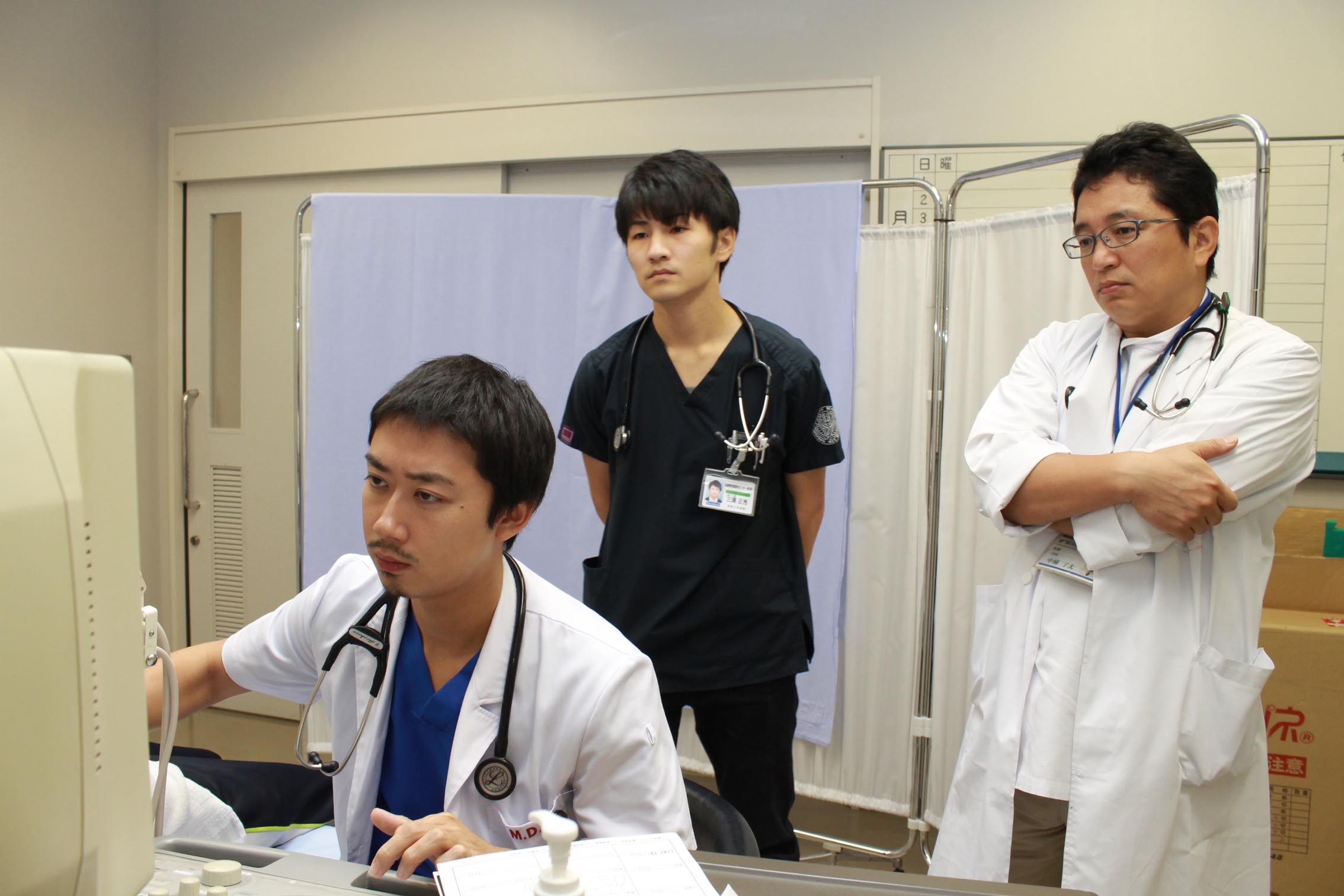 中山先生と西森先生が実習中、入院となり手続き中に調先生がレクチャーしている様子です。