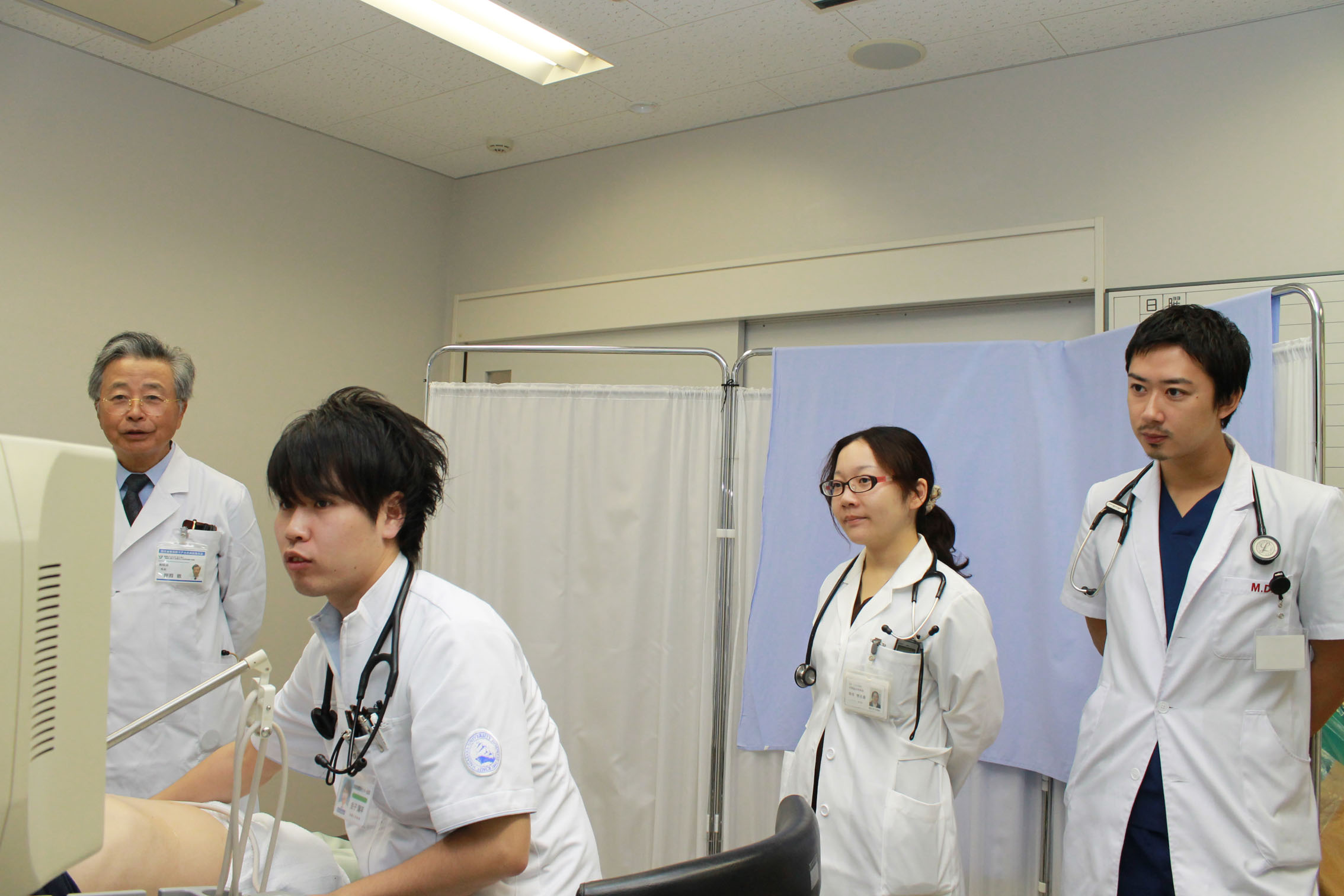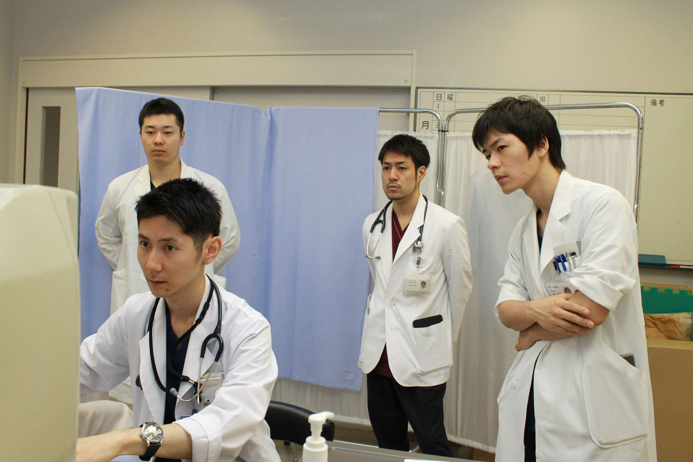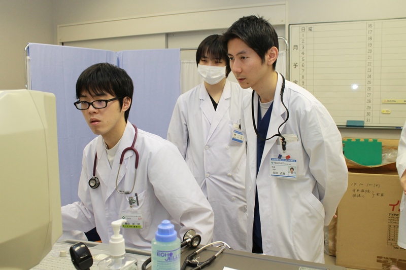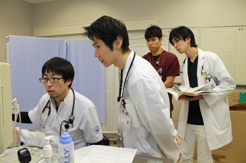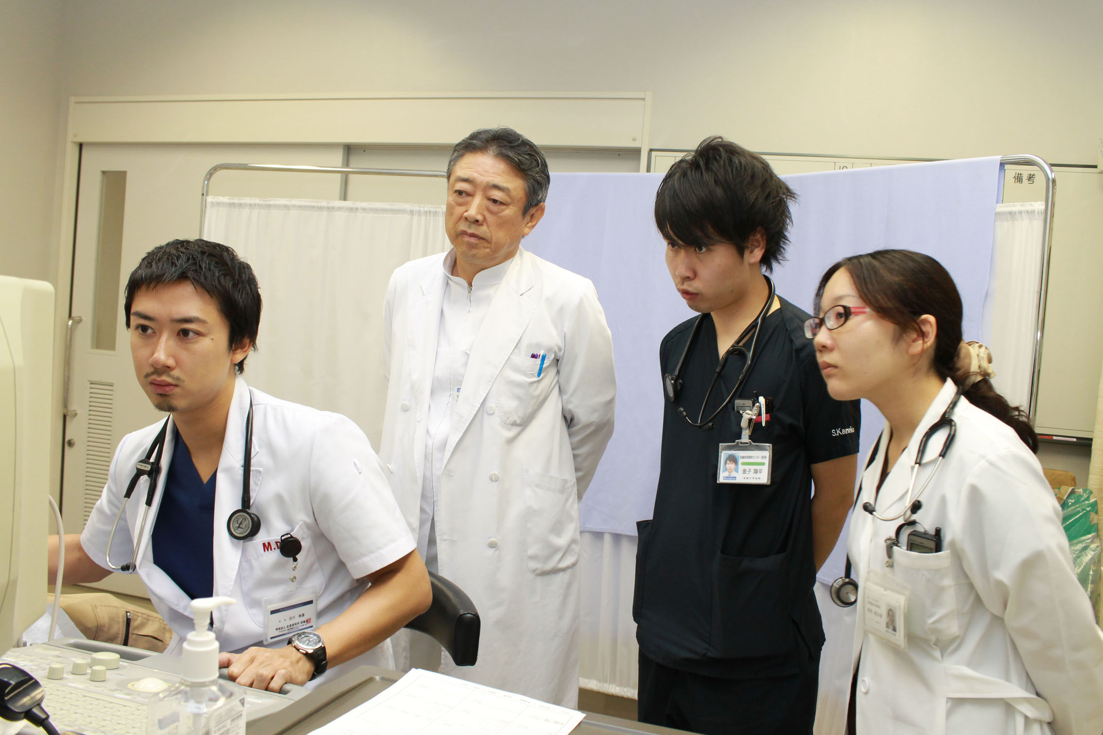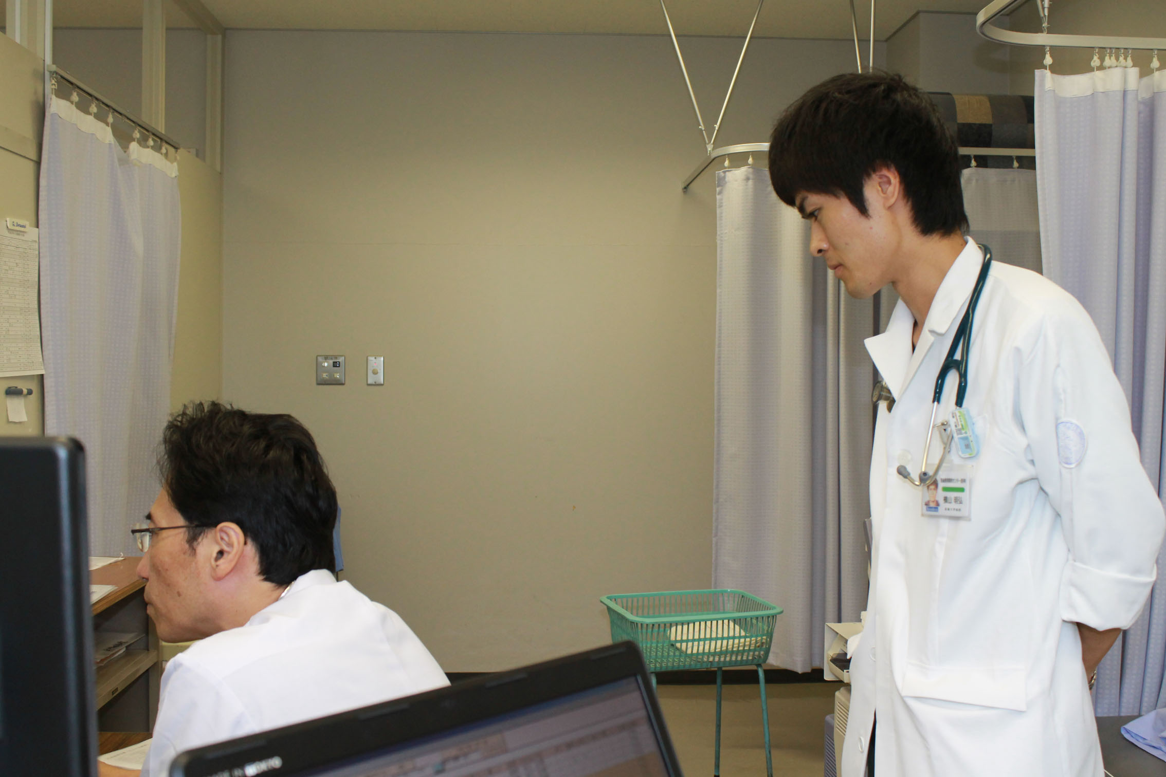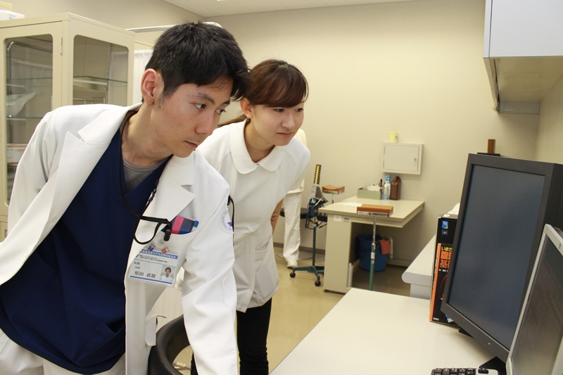 中山先生と西森先生が実習中、入院となり手続き中に調先生がレクチャーしている様子です。