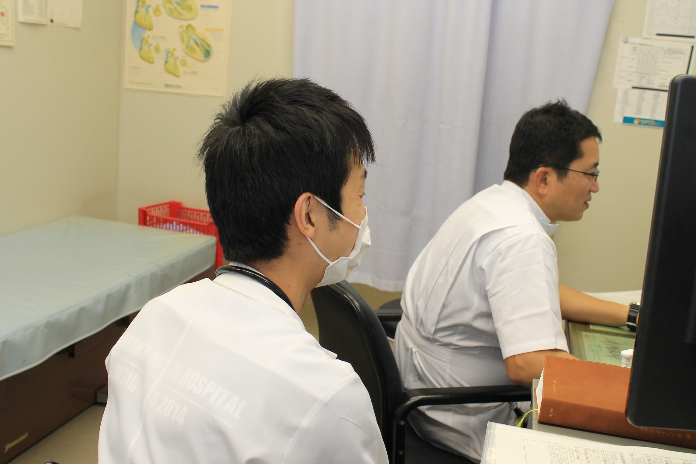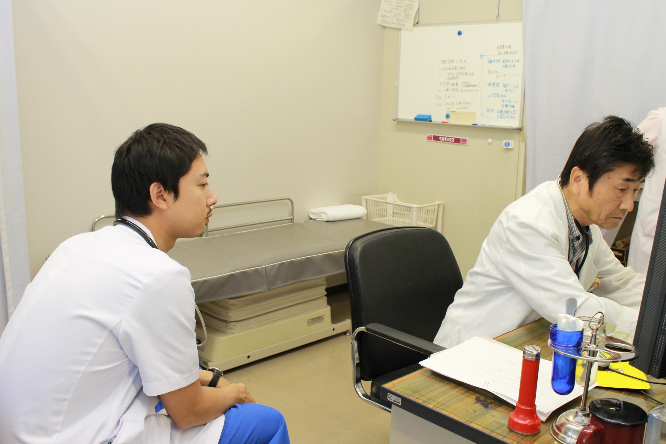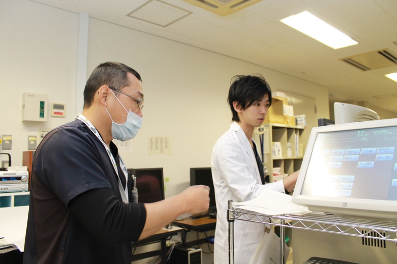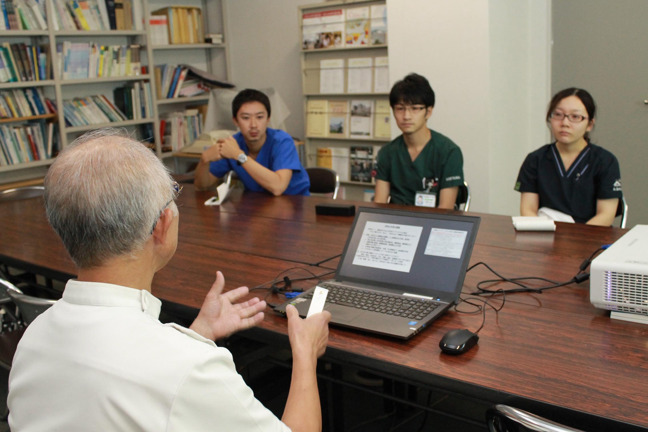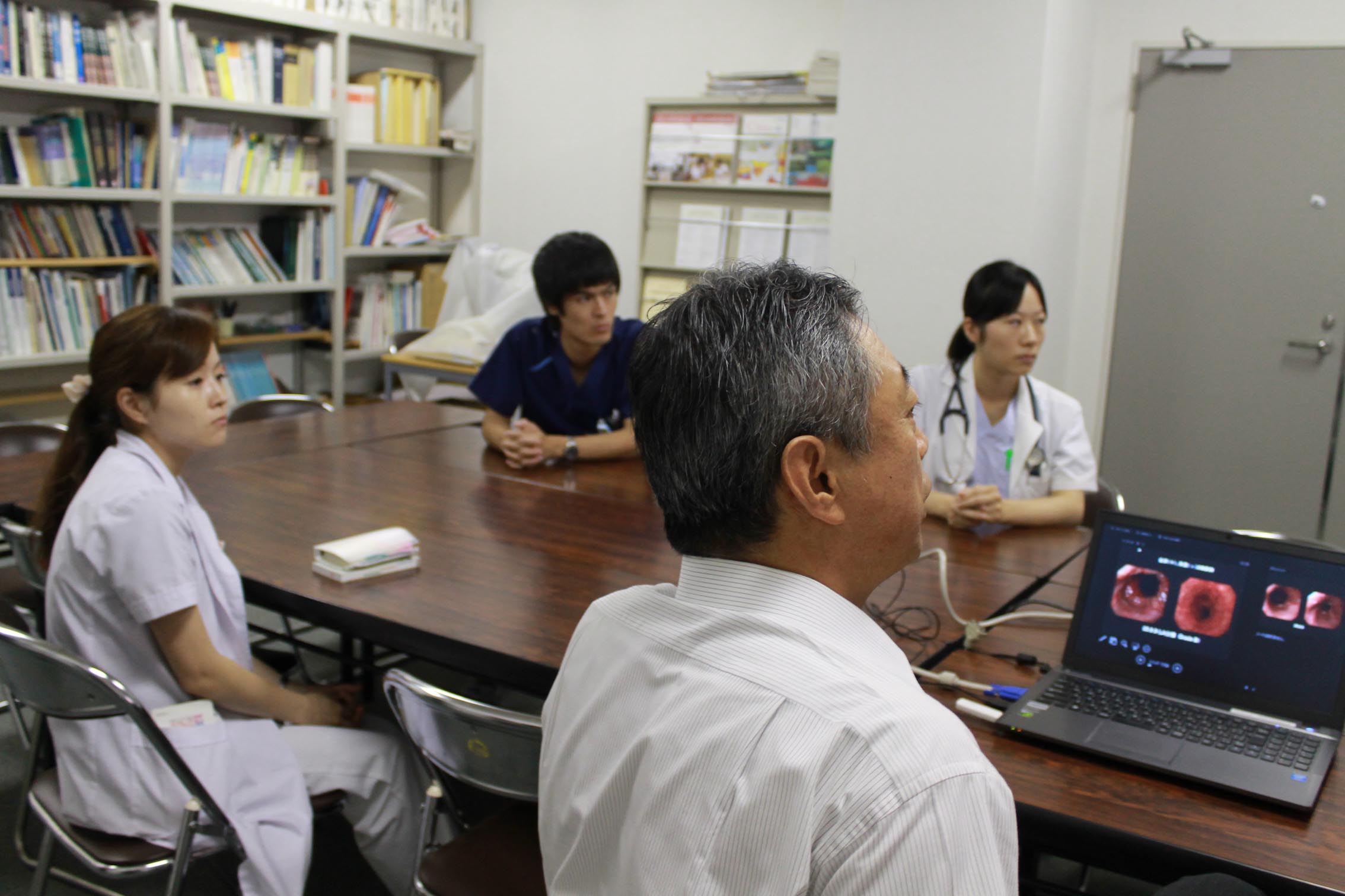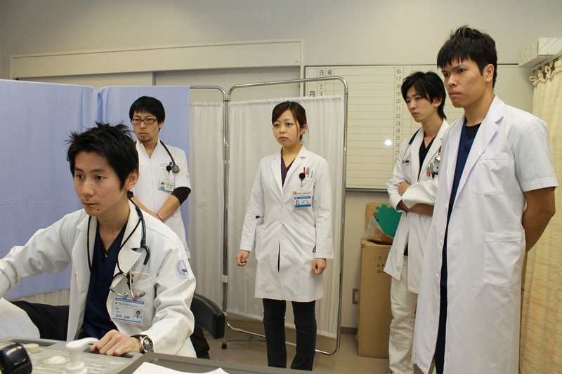 中山先生と西森先生が実習中、入院となり手続き中に調先生がレクチャーしている様子です。