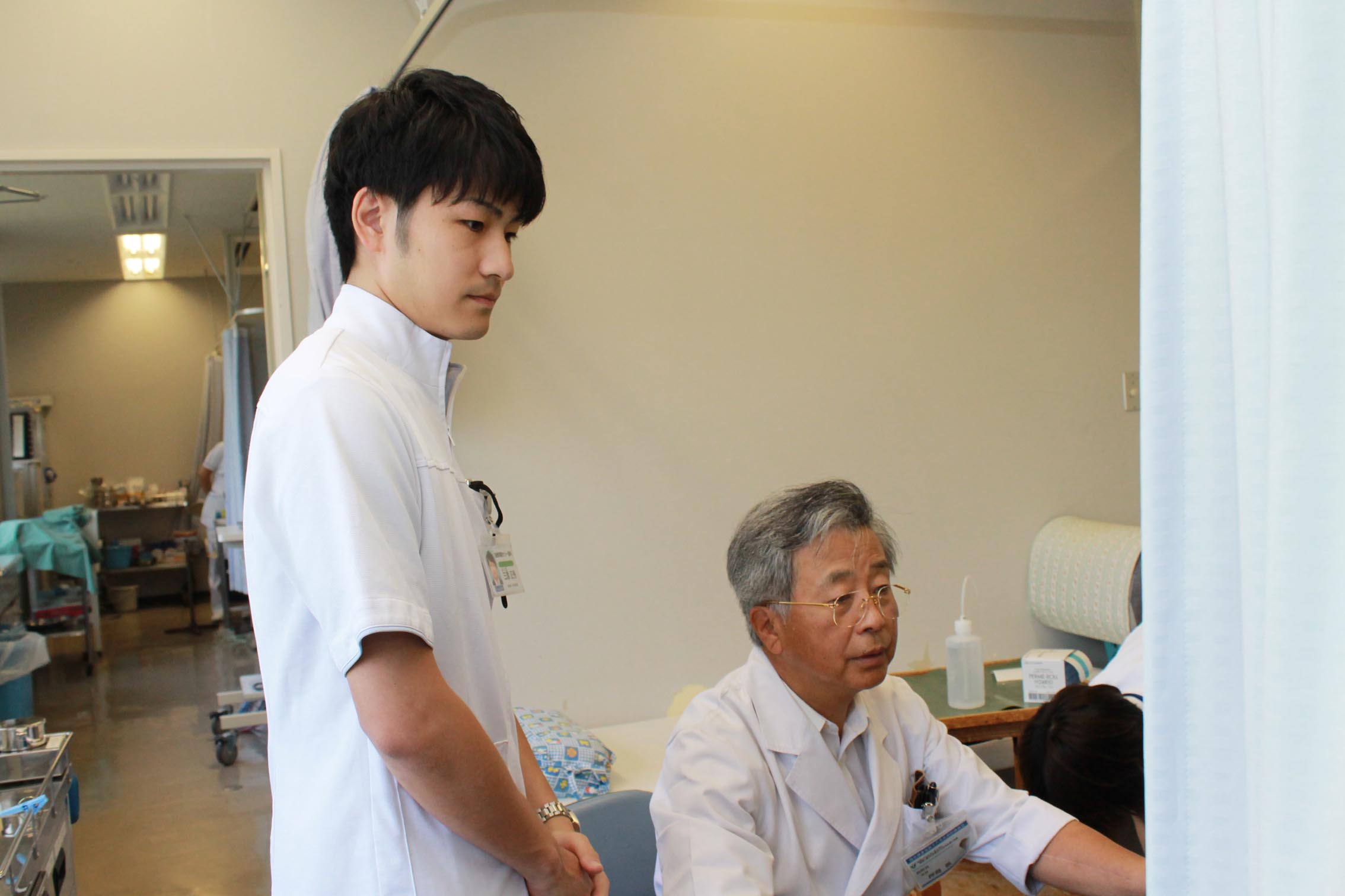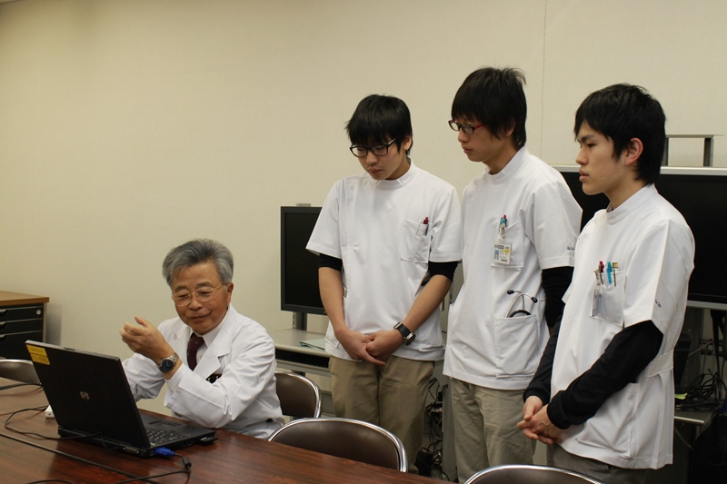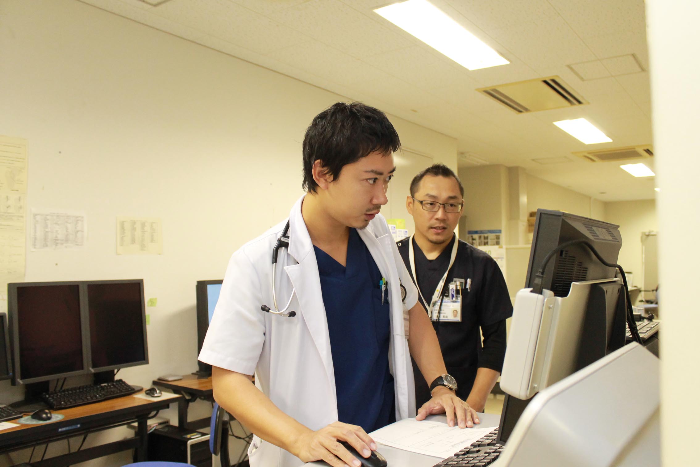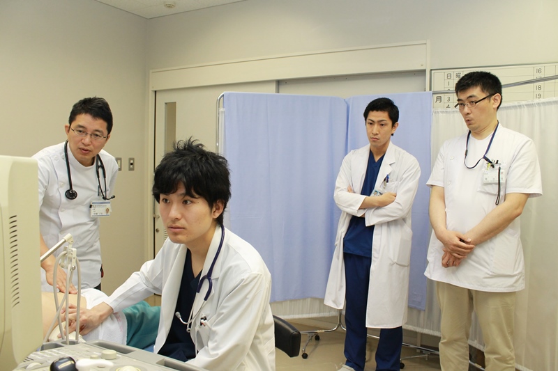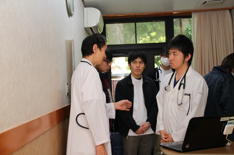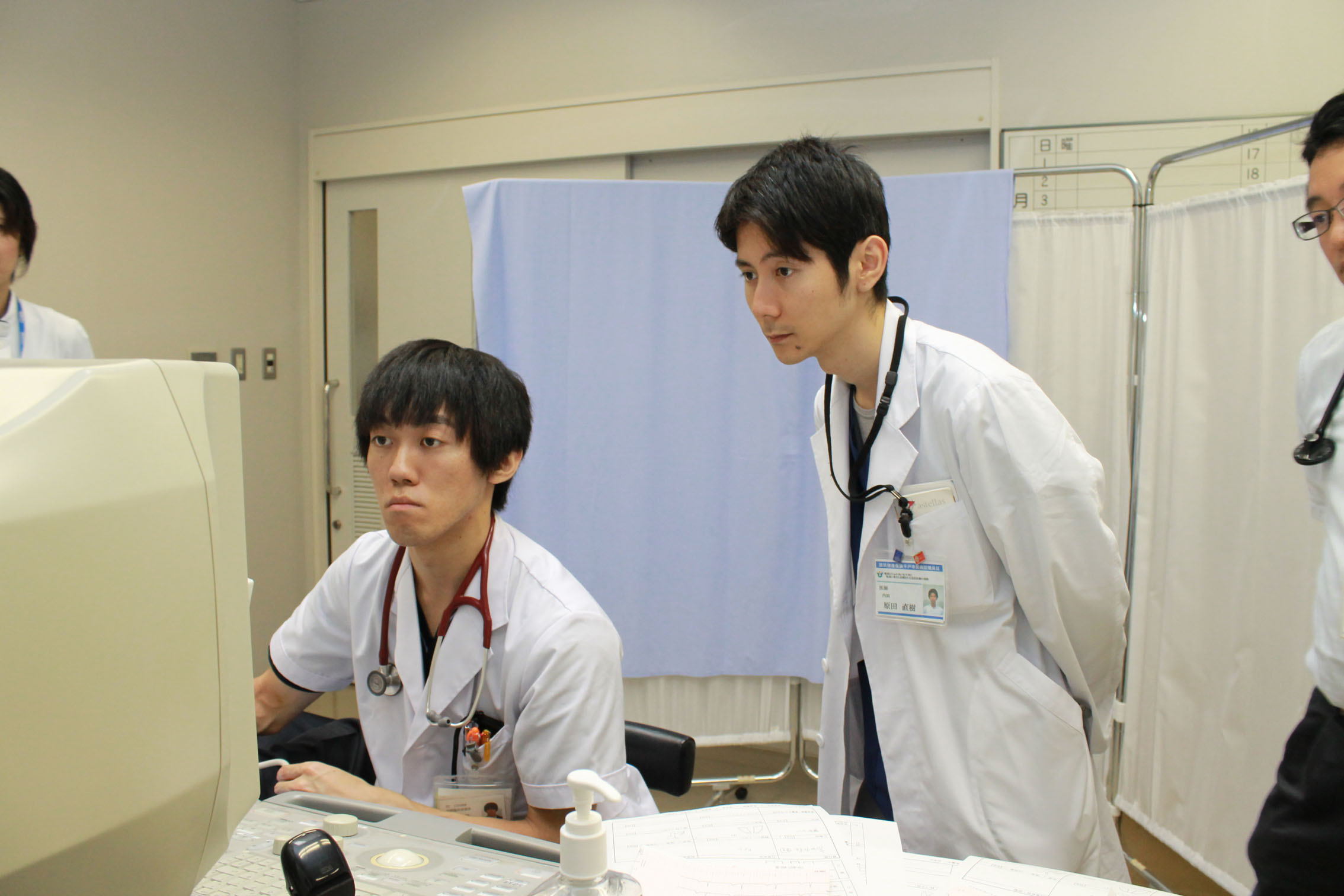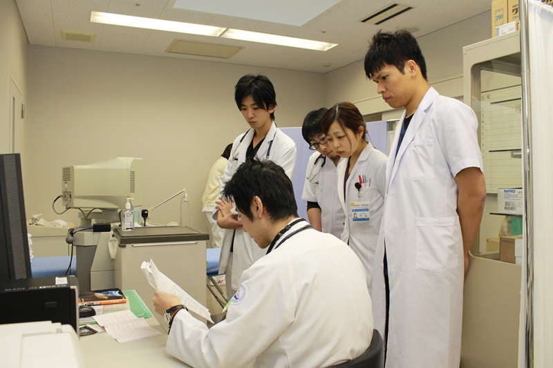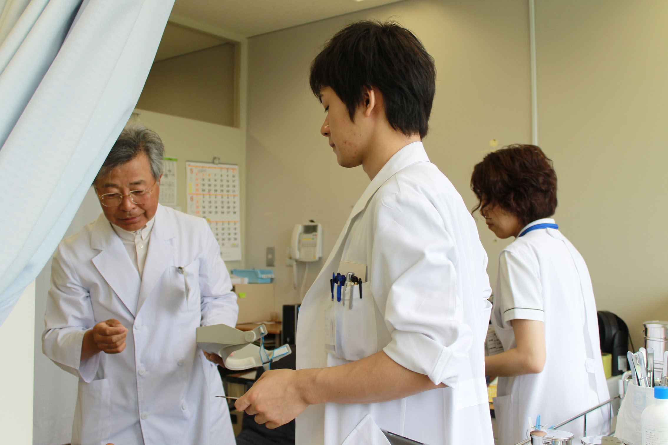 中山先生と西森先生が実習中、入院となり手続き中に調先生がレクチャーしている様子です。
