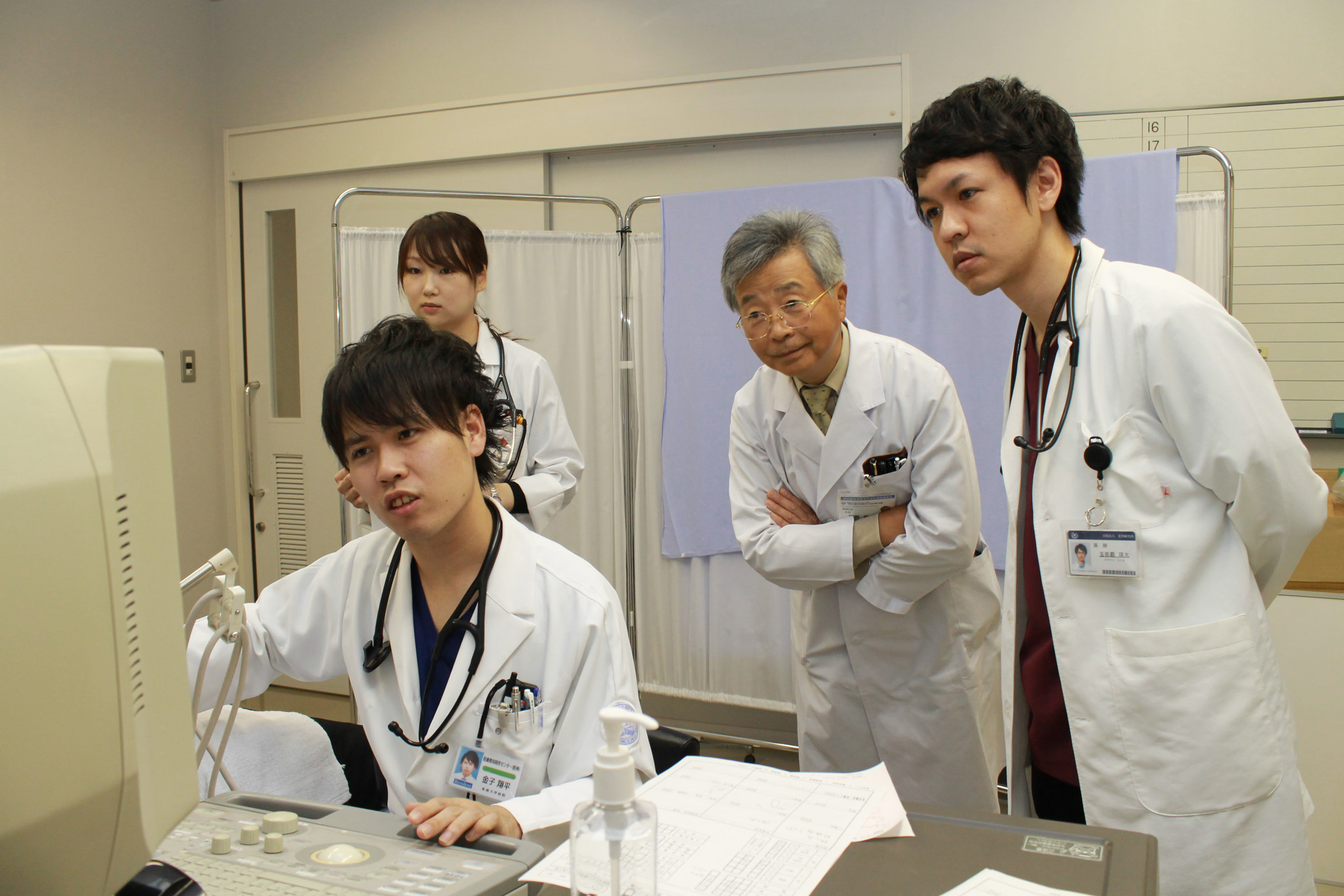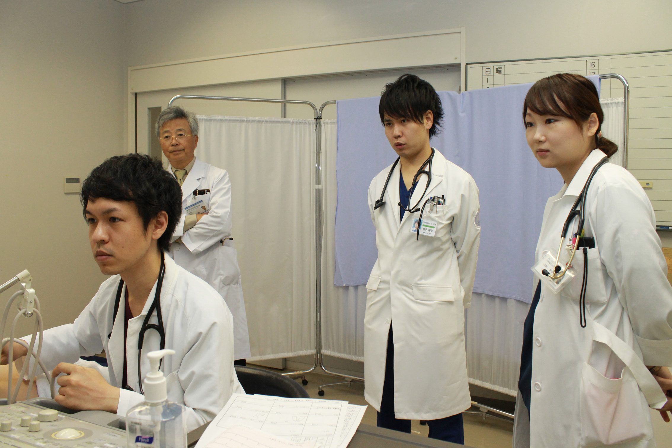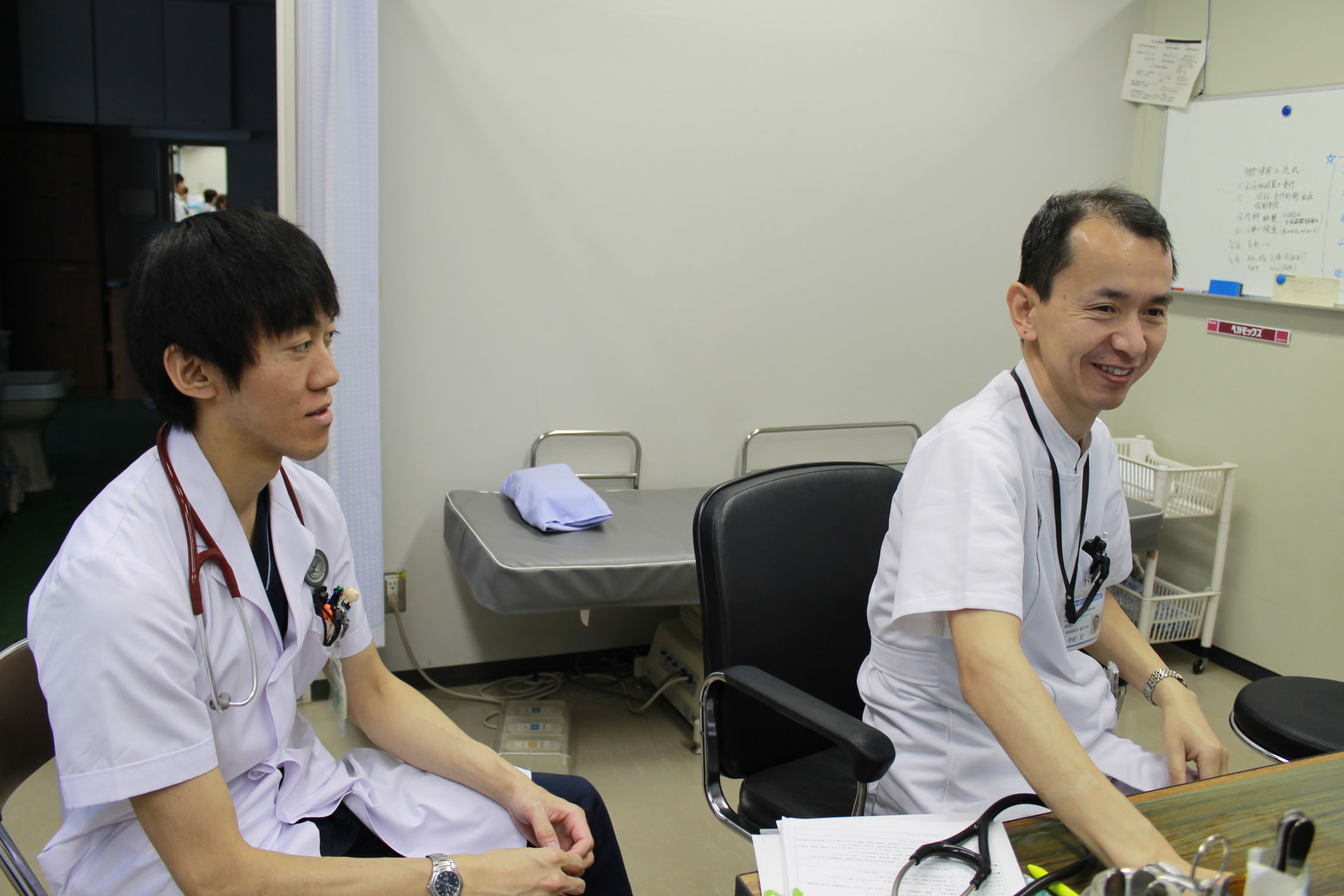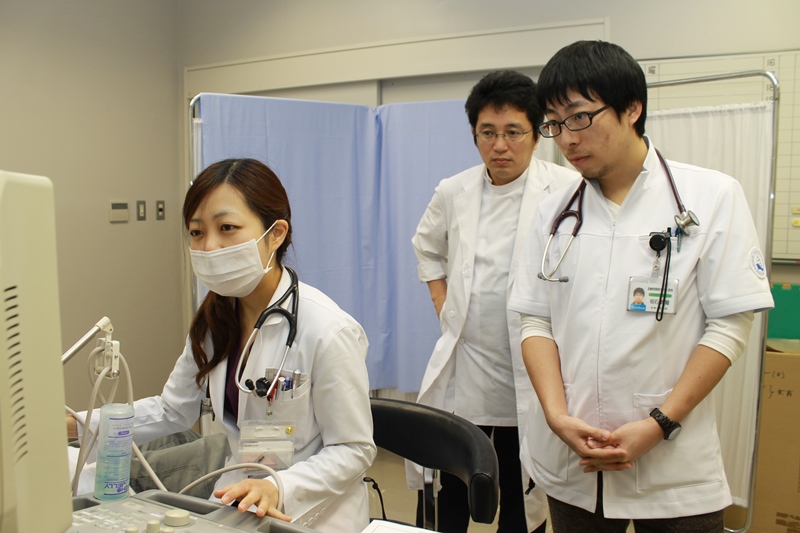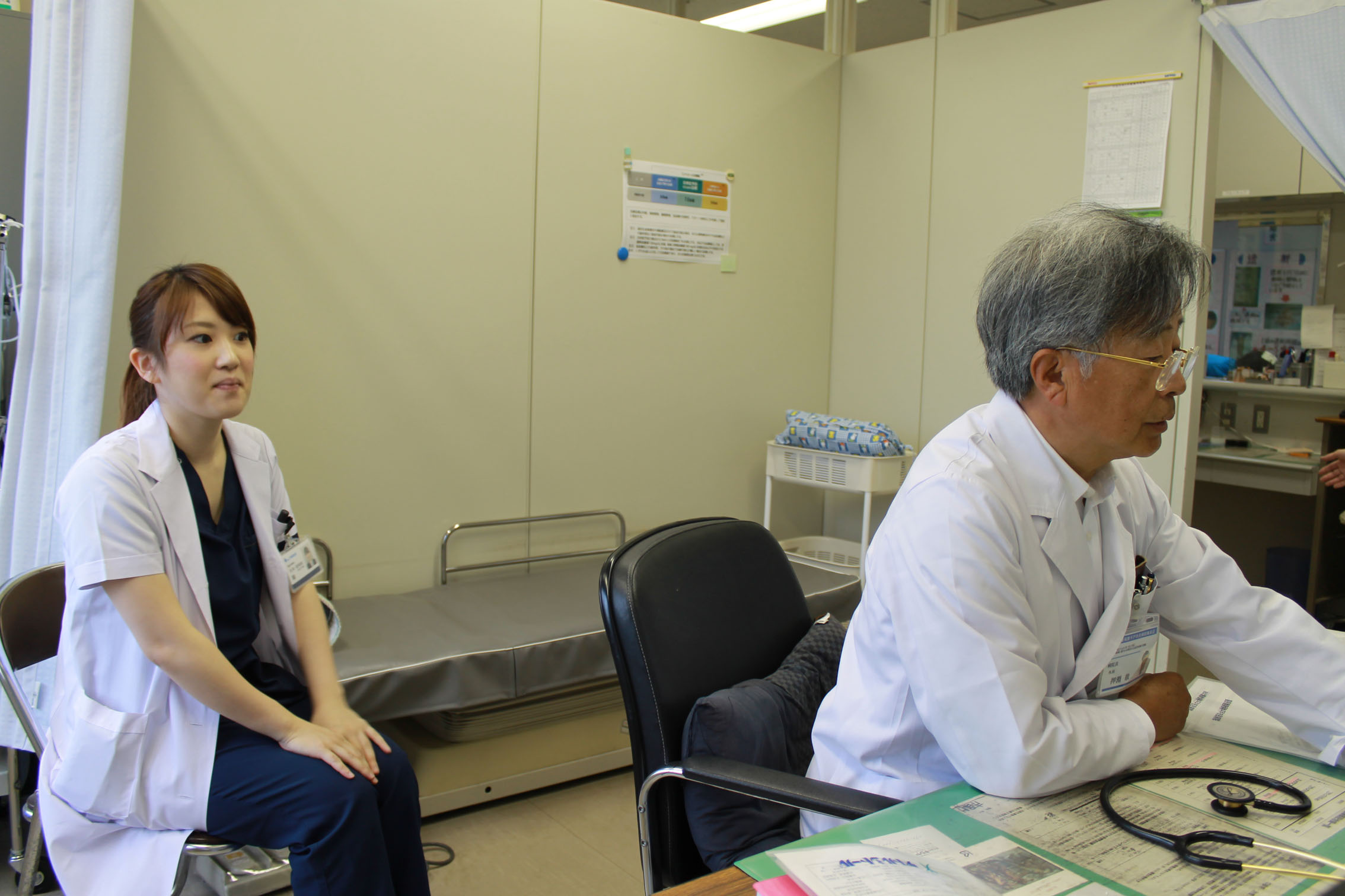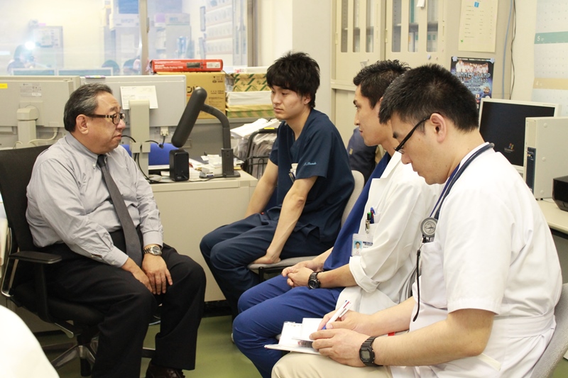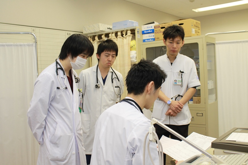 中山先生と西森先生が実習中、入院となり手続き中に調先生がレクチャーしている様子です。