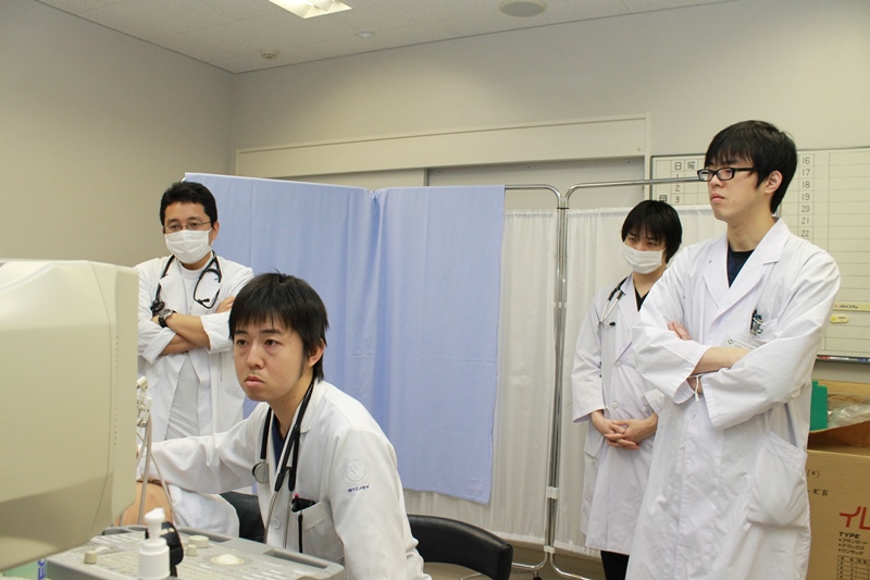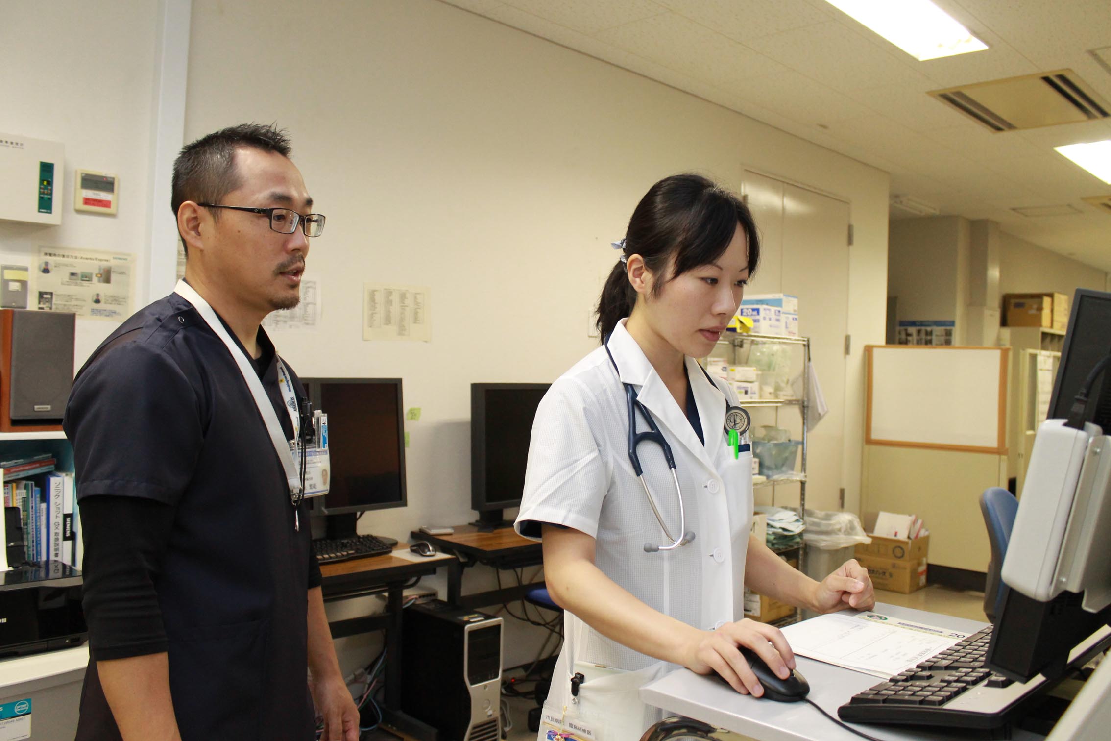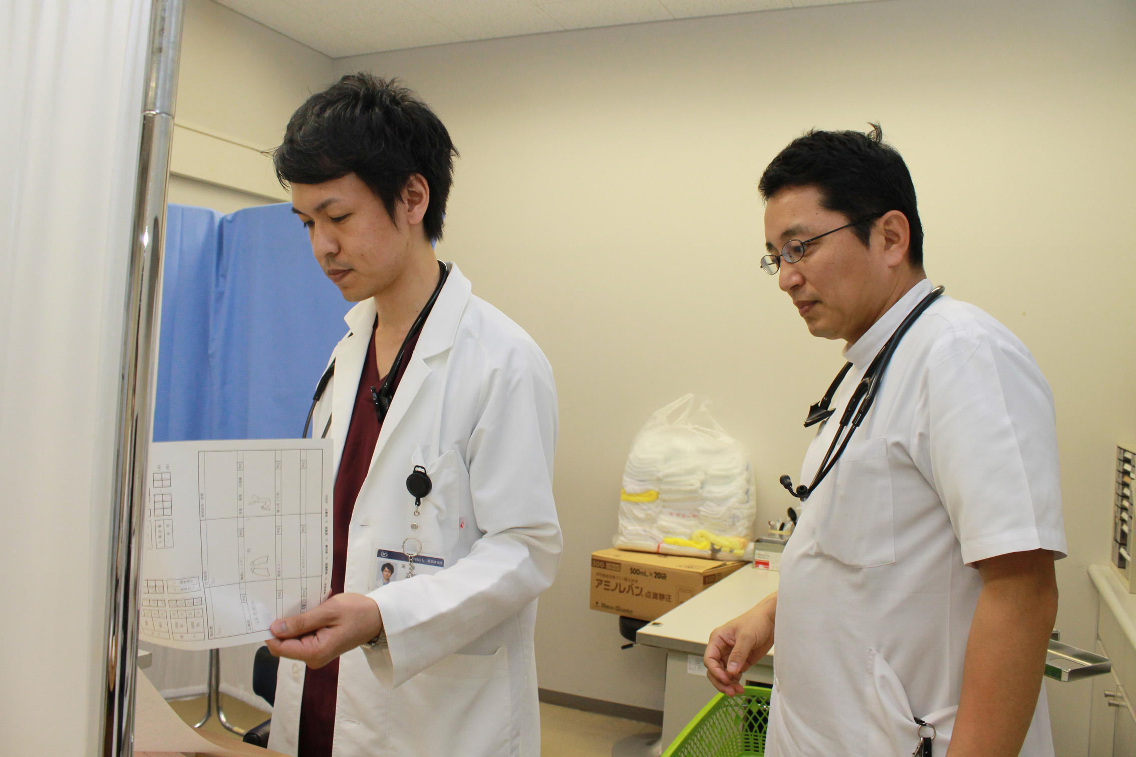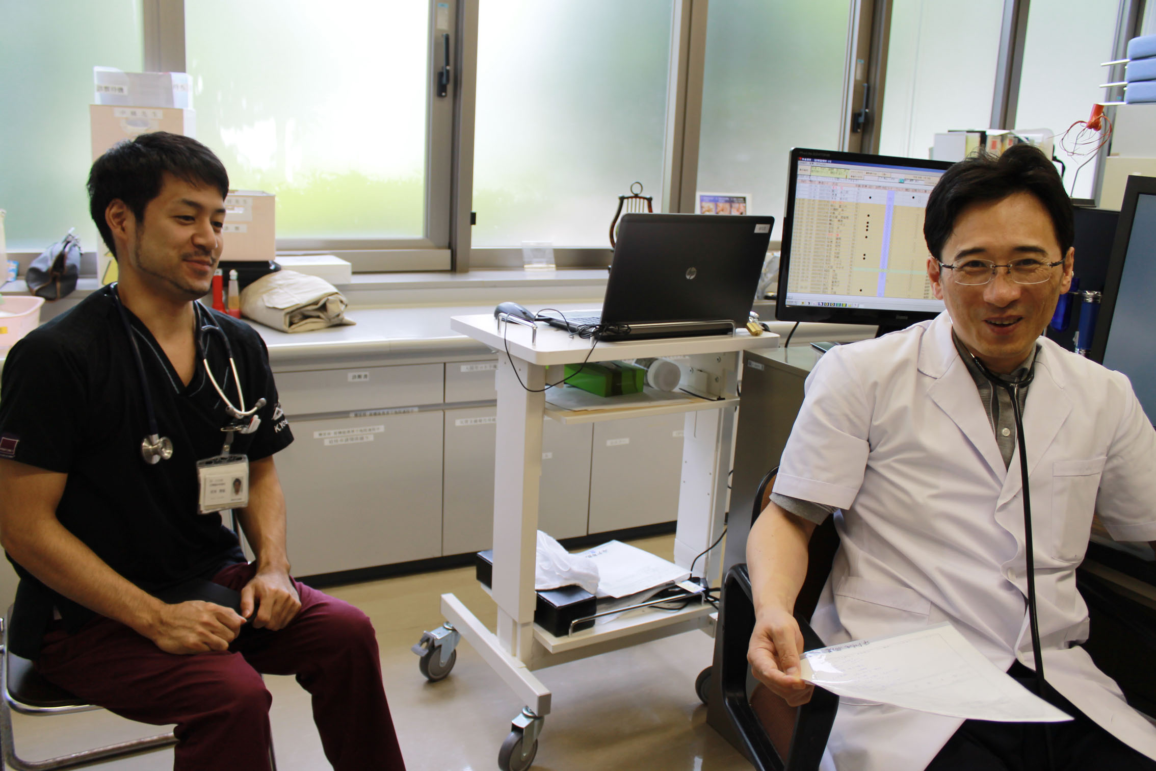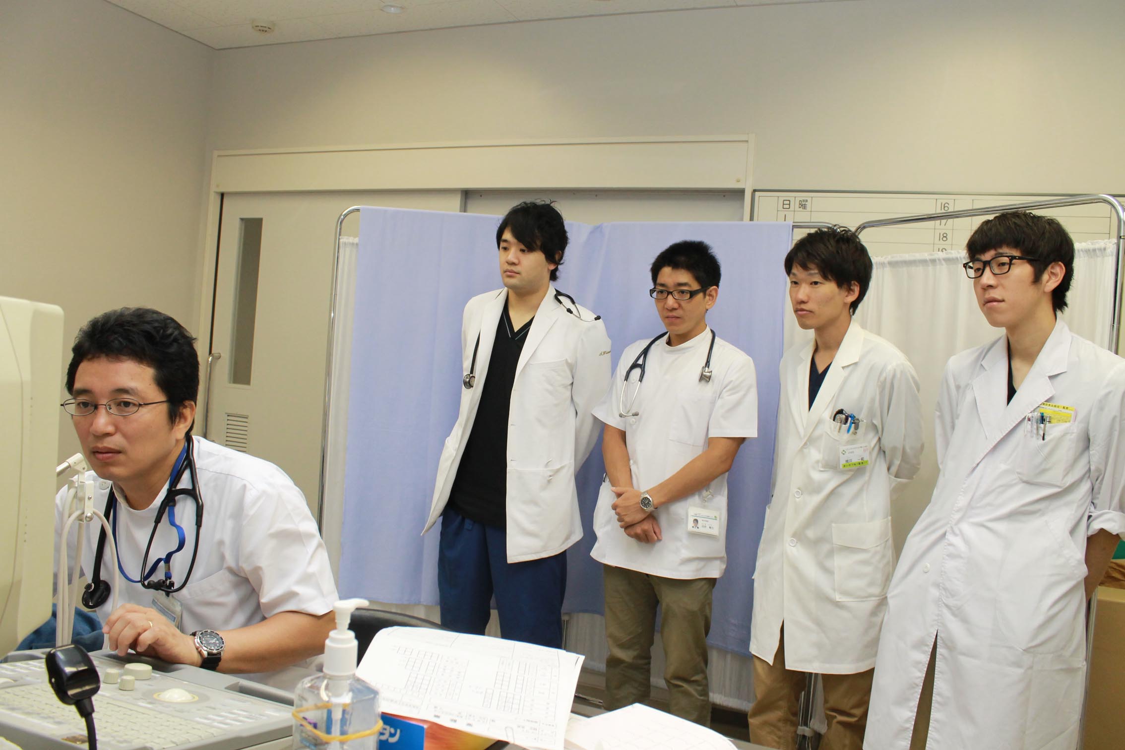 中山先生と西森先生が実習中、入院となり手続き中に調先生がレクチャーしている様子です。