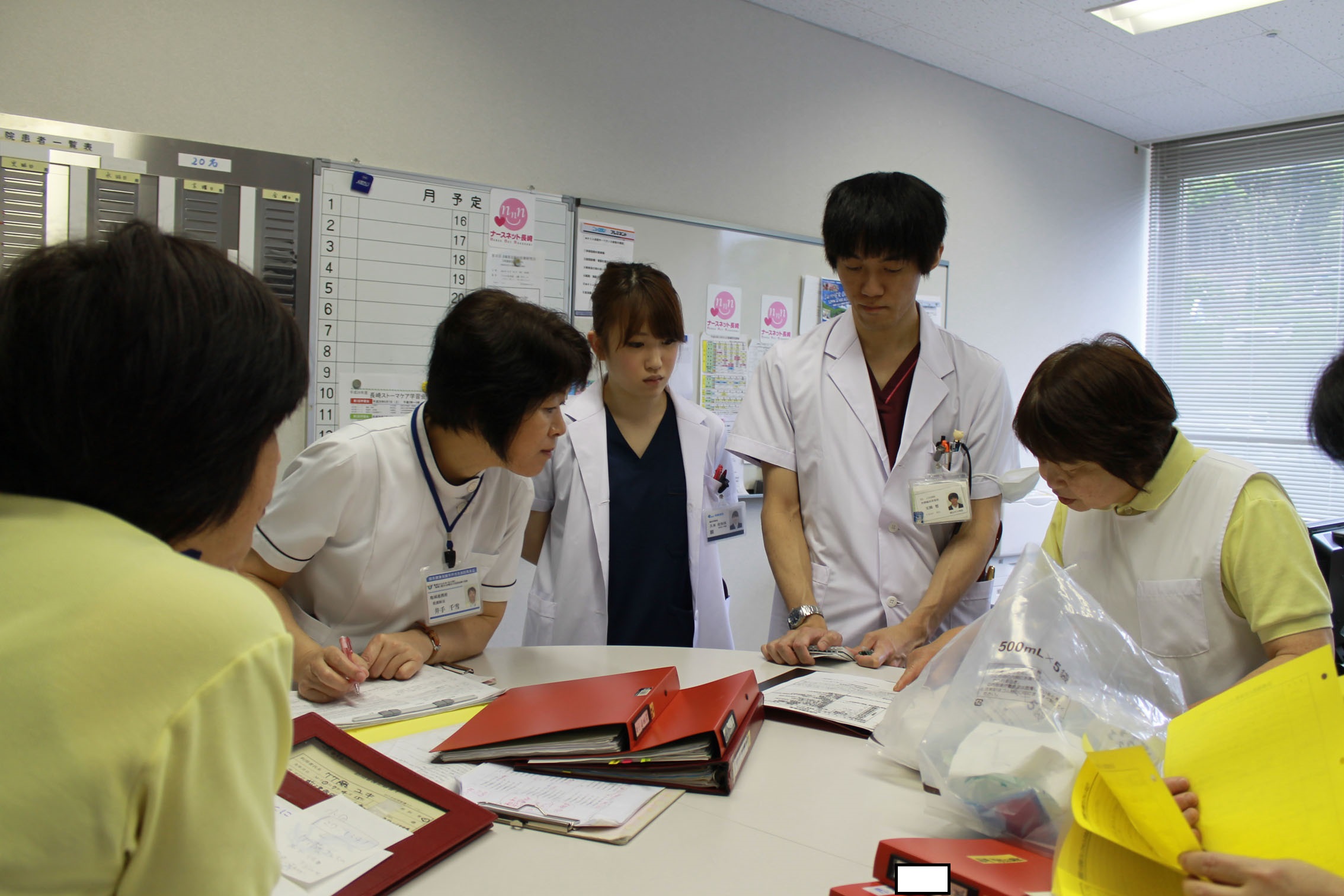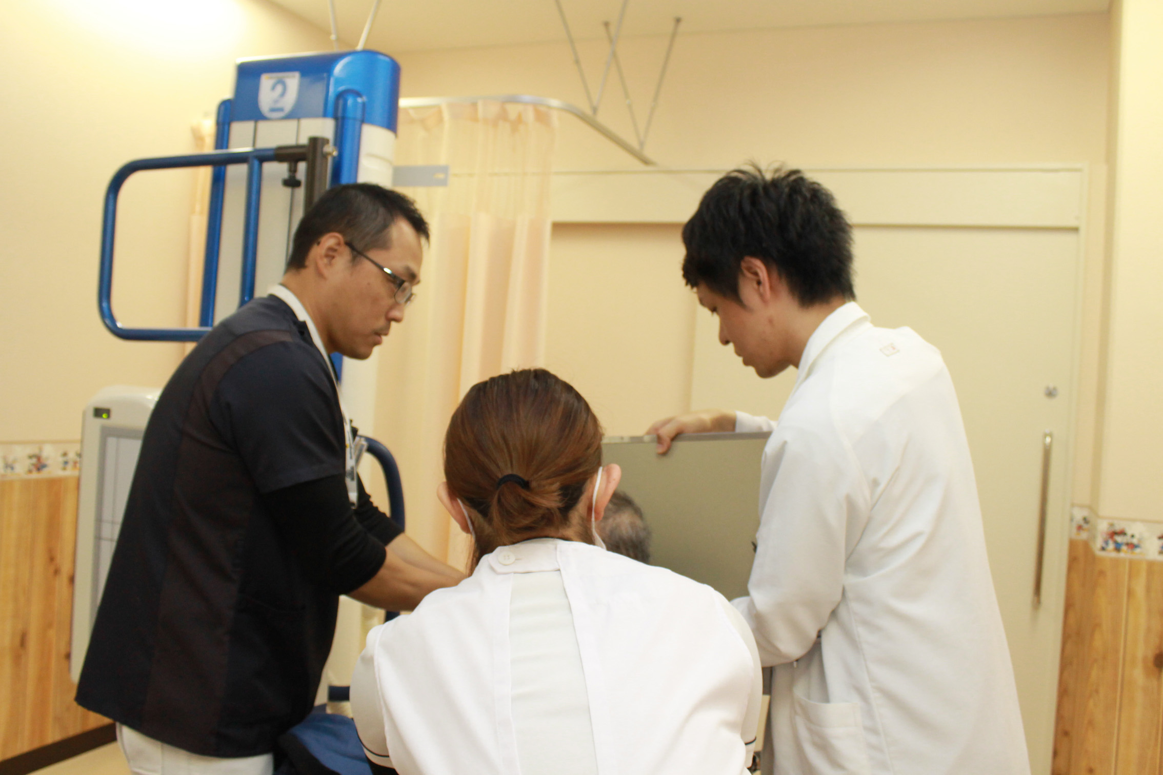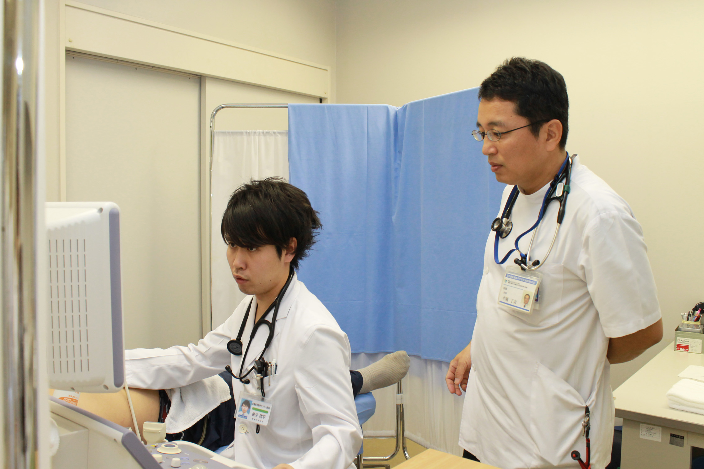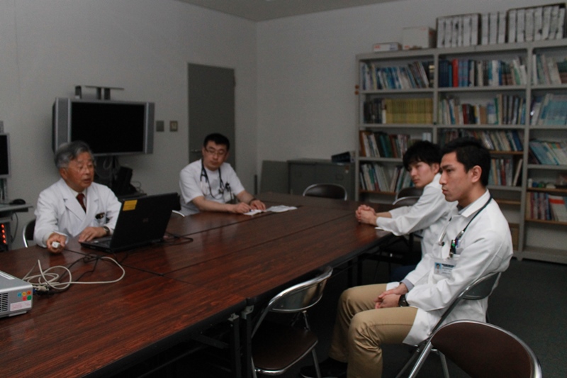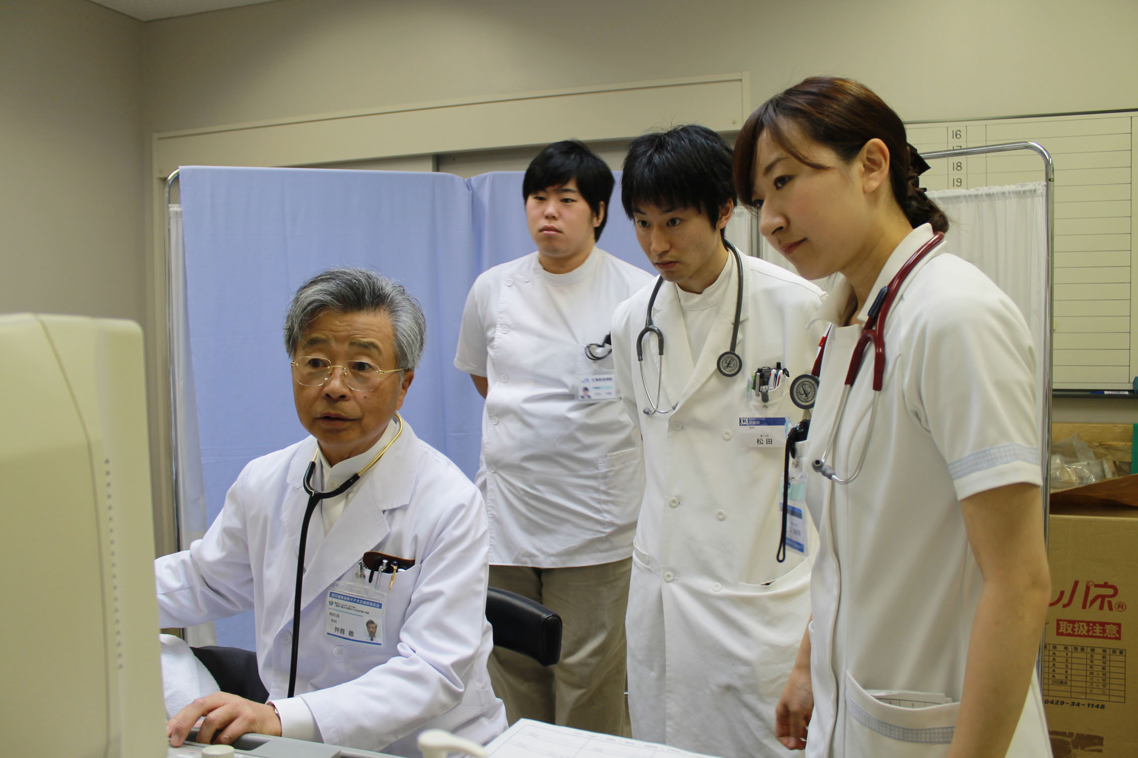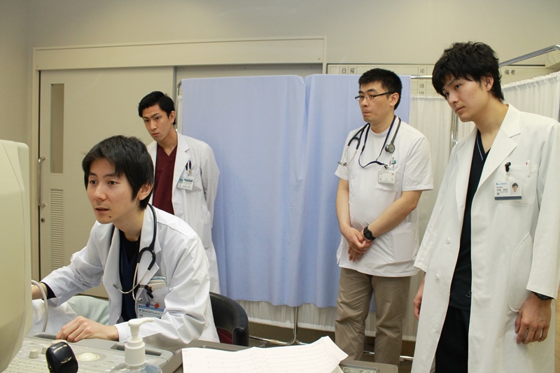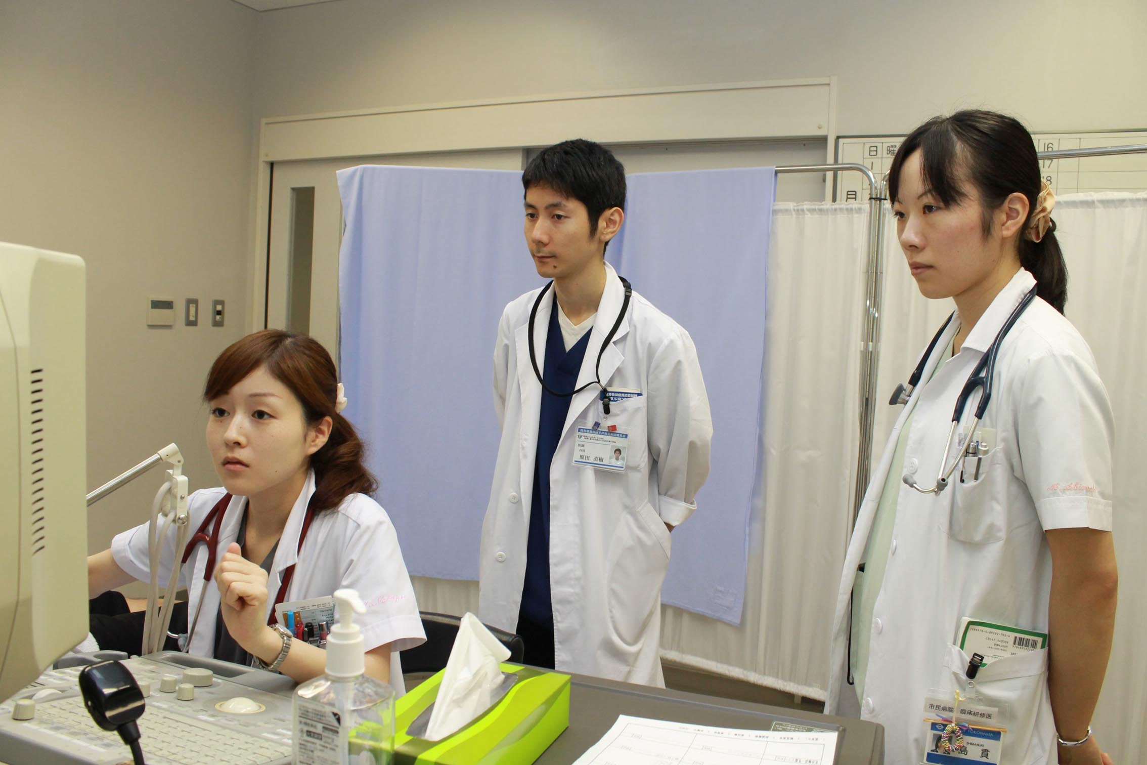 中山先生と西森先生が実習中、入院となり手続き中に調先生がレクチャーしている様子です。