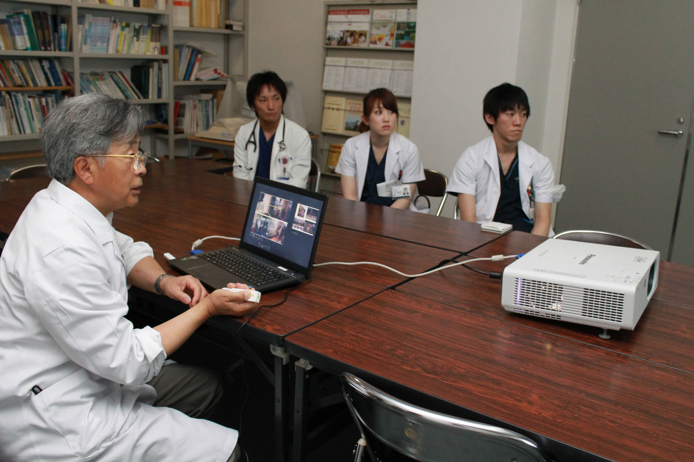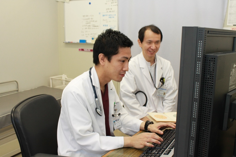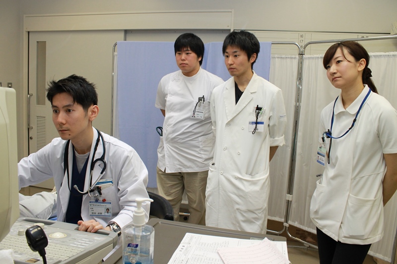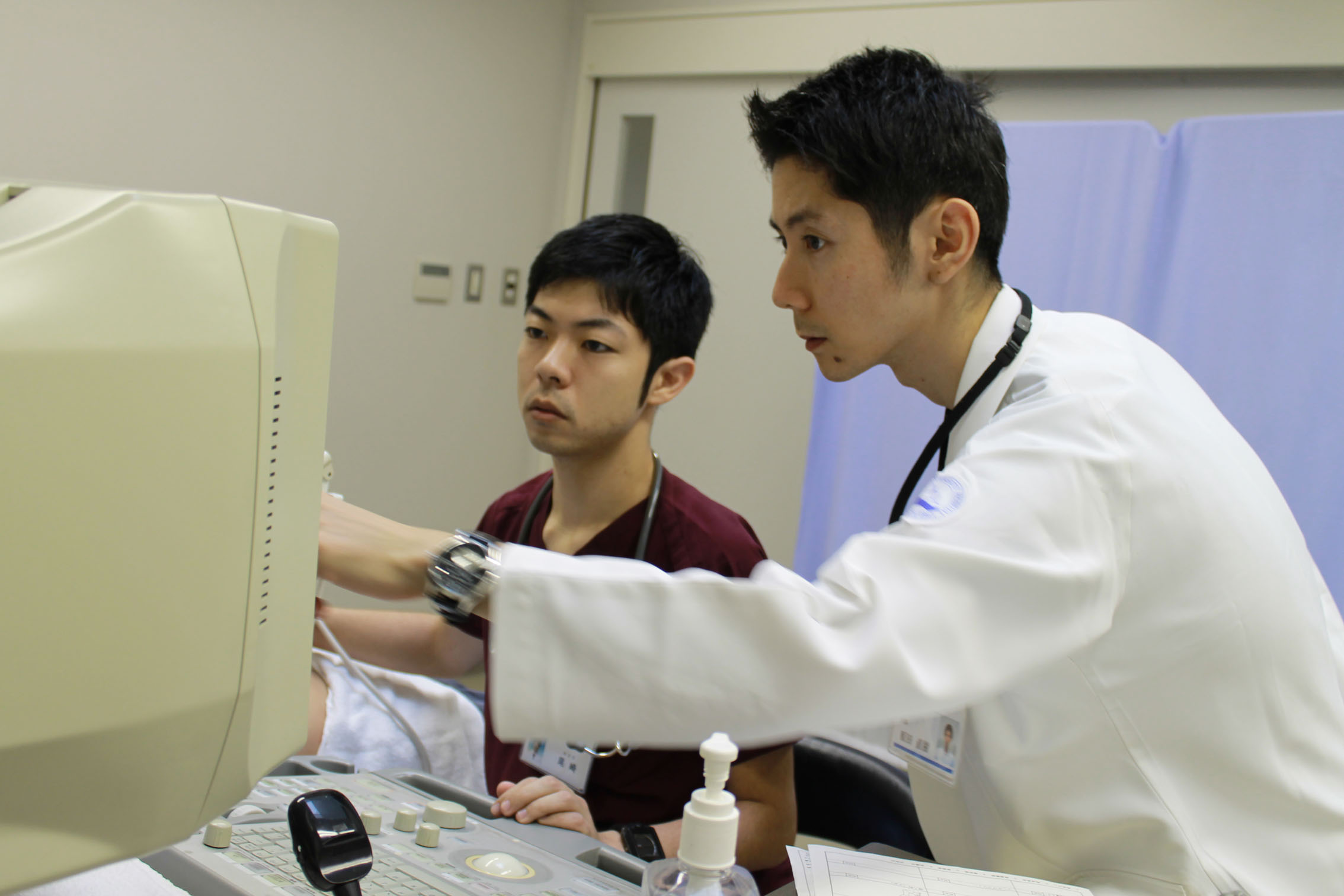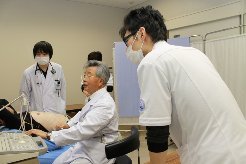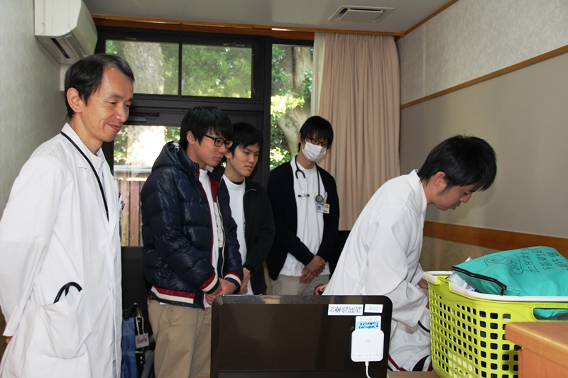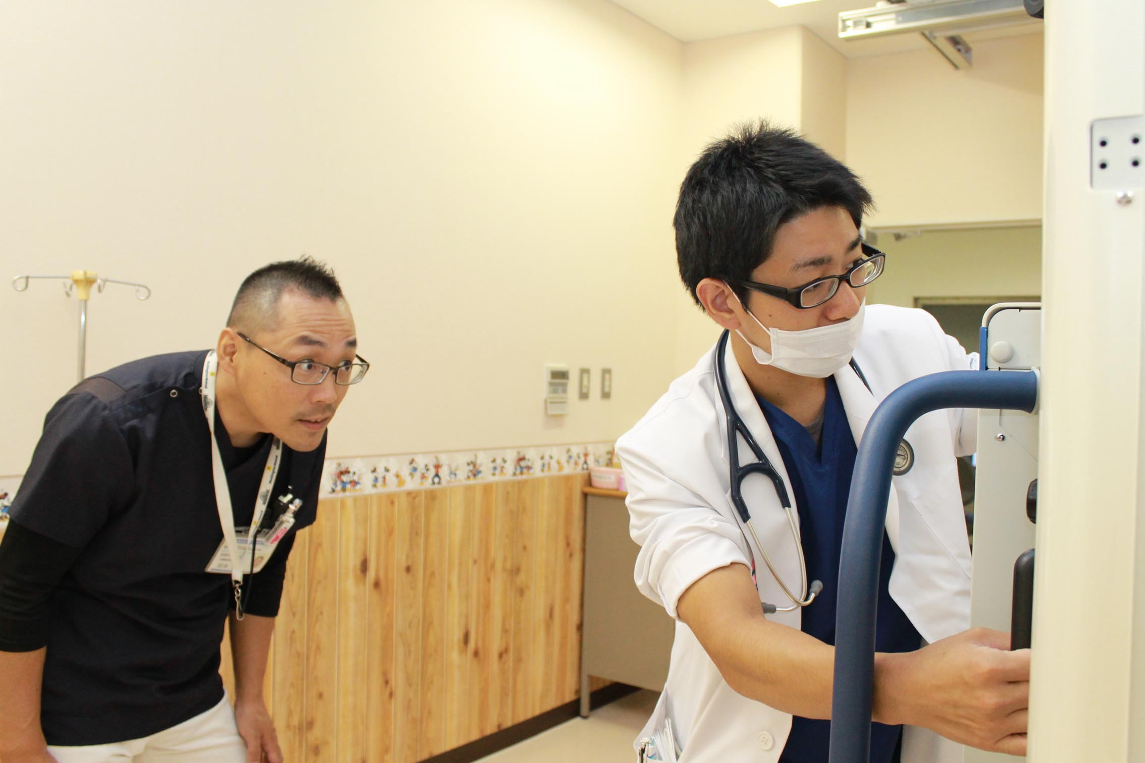 中山先生と西森先生が実習中、入院となり手続き中に調先生がレクチャーしている様子です。