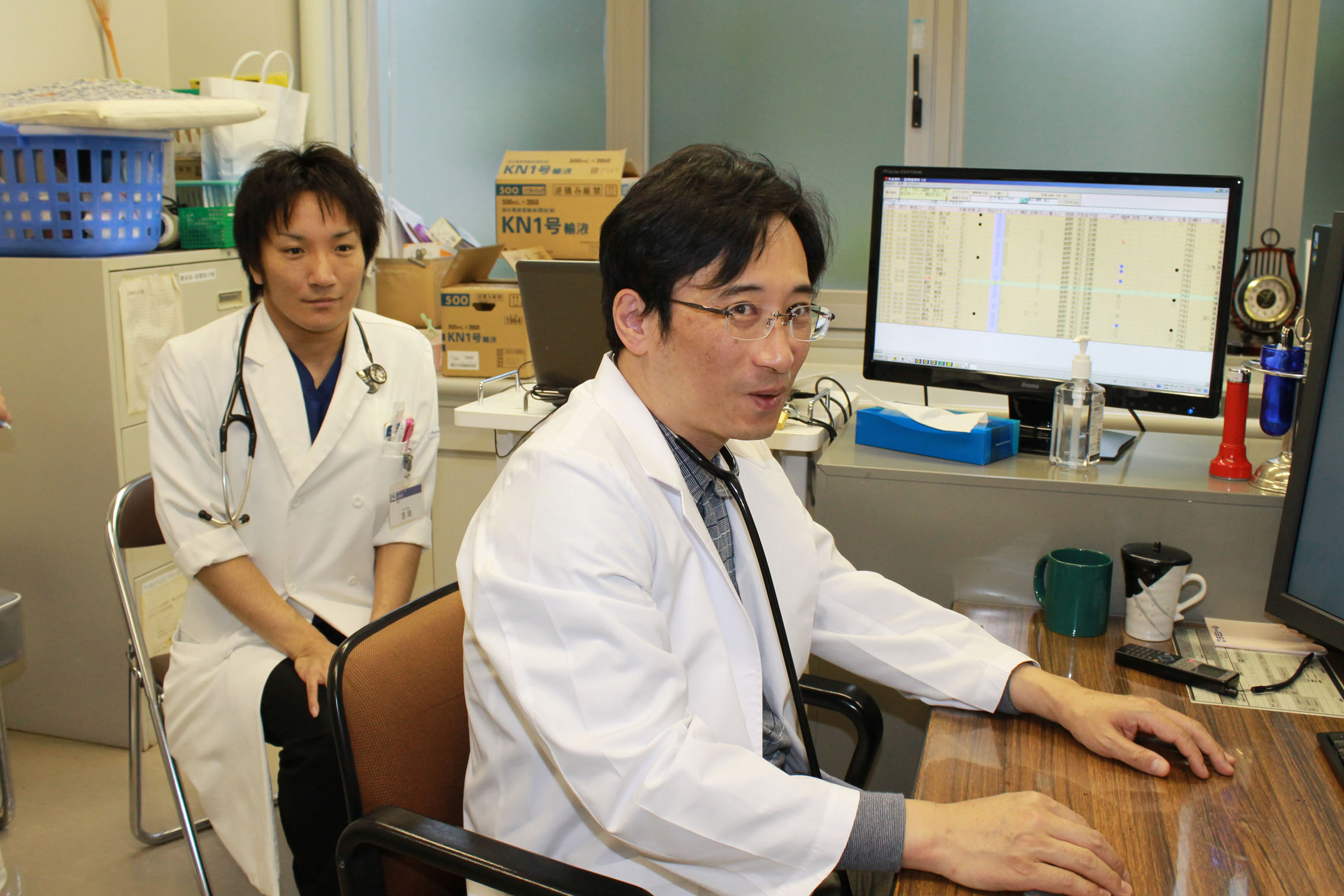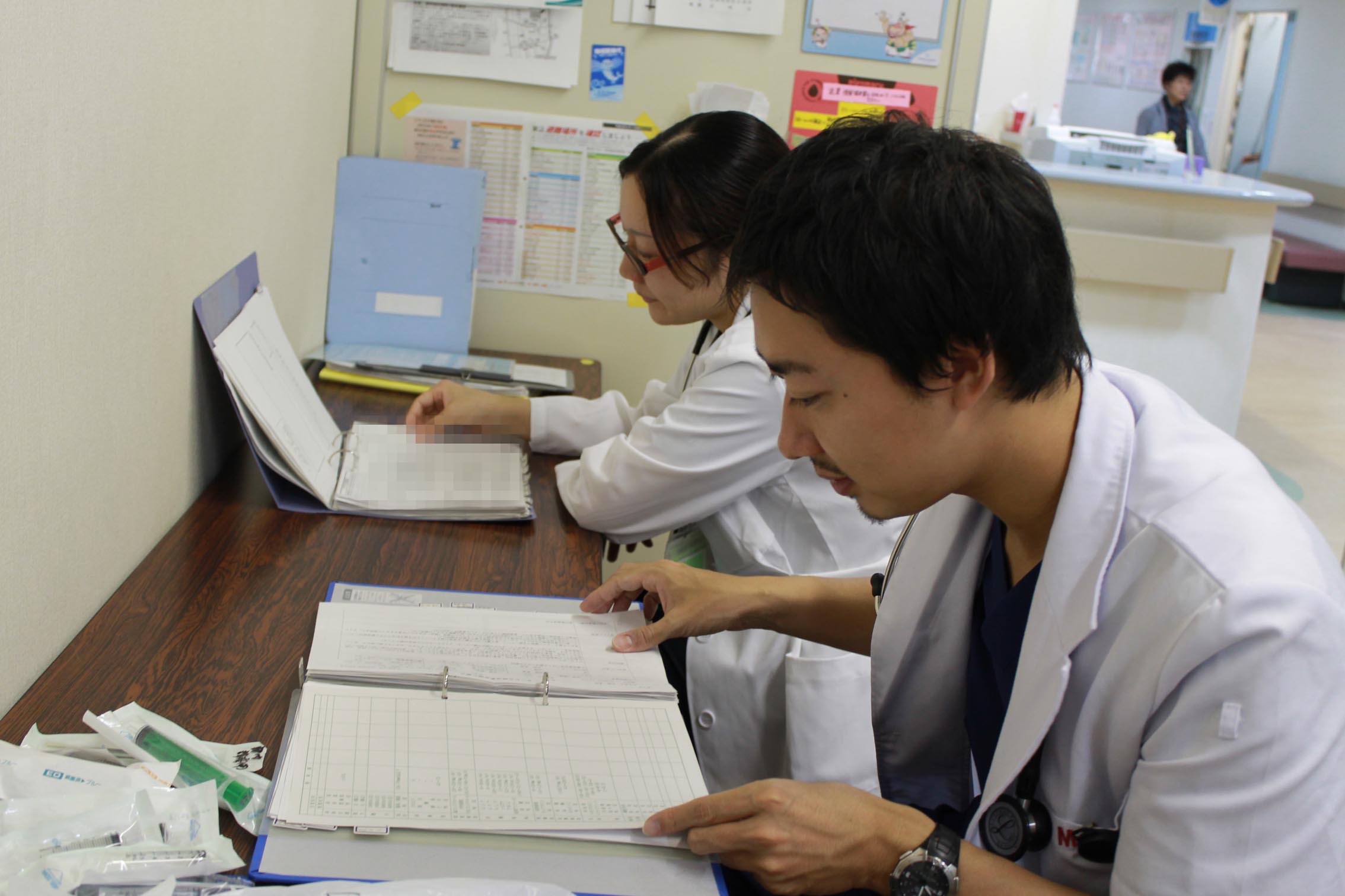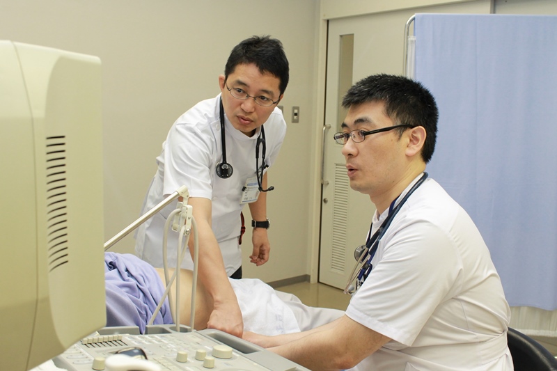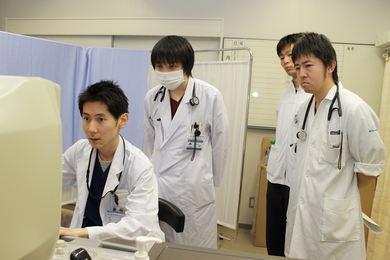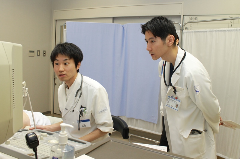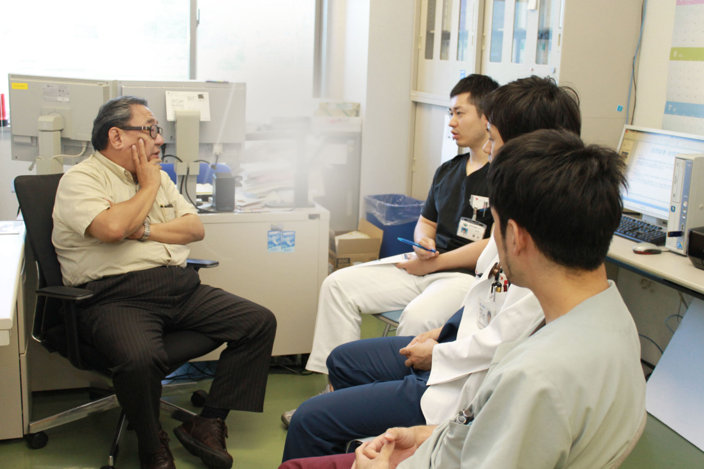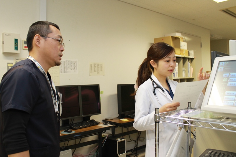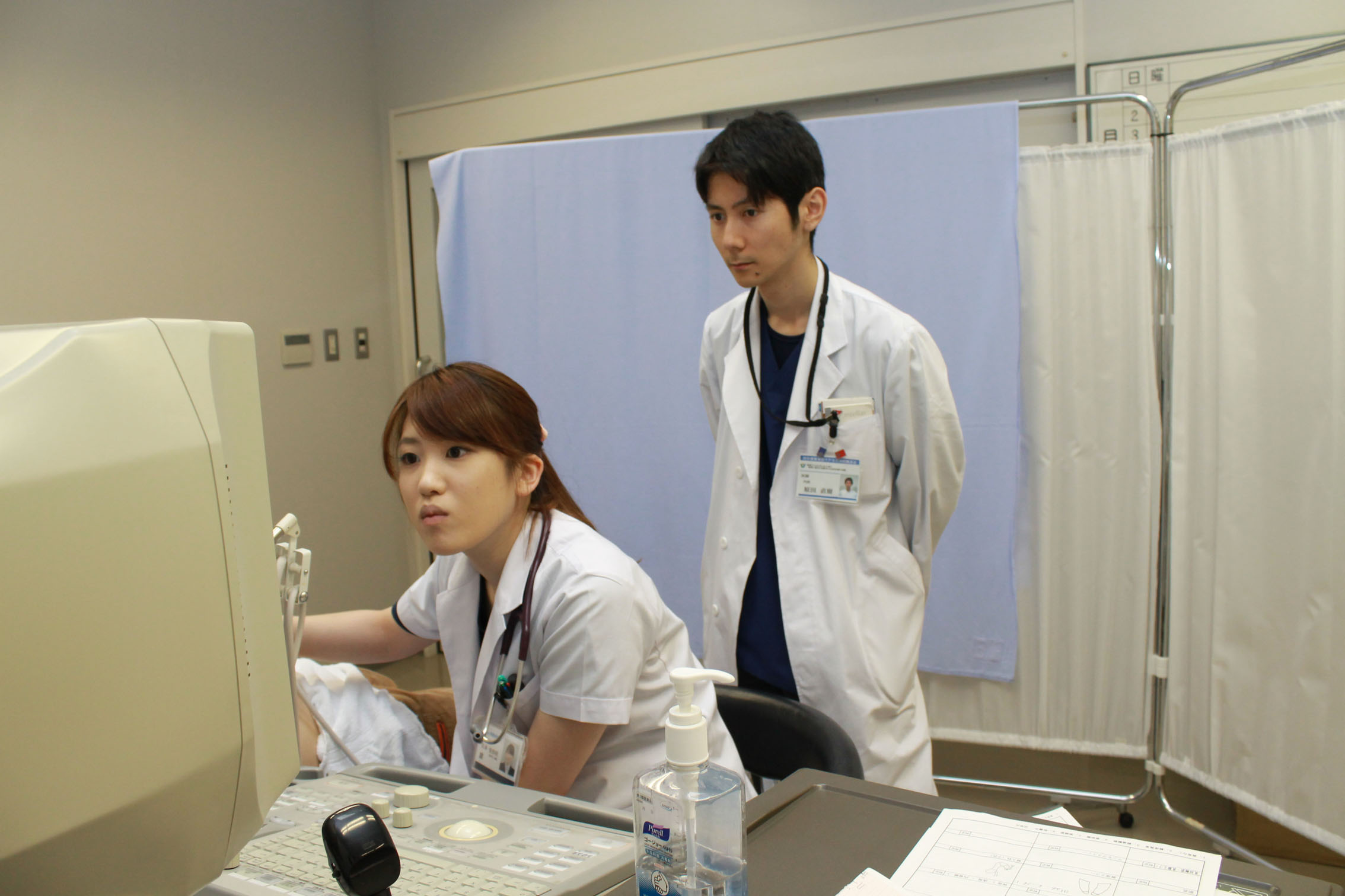 中山先生と西森先生が実習中、入院となり手続き中に調先生がレクチャーしている様子です。
