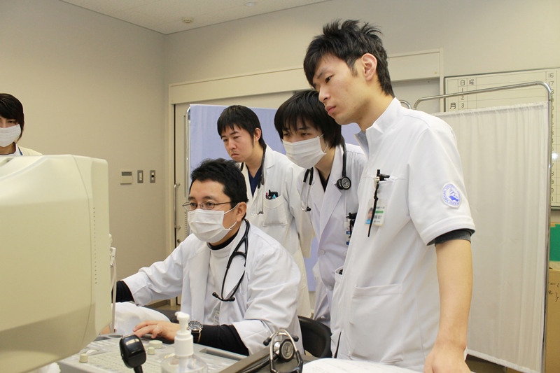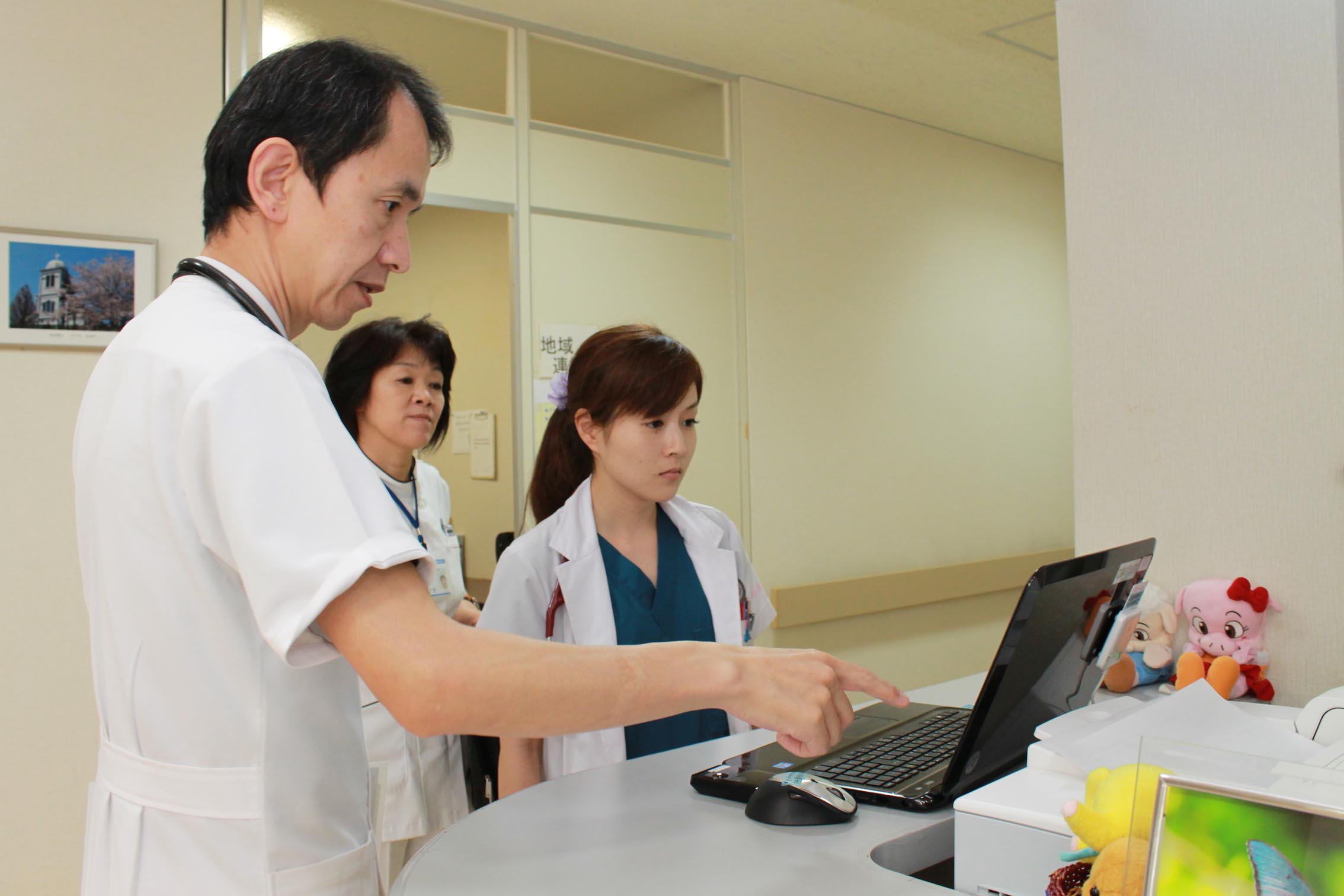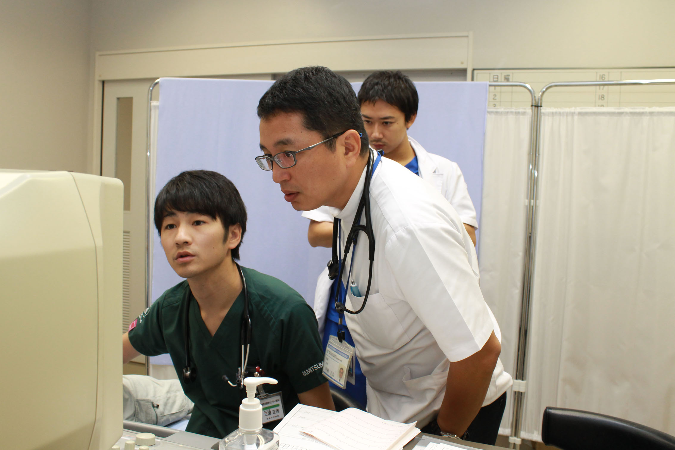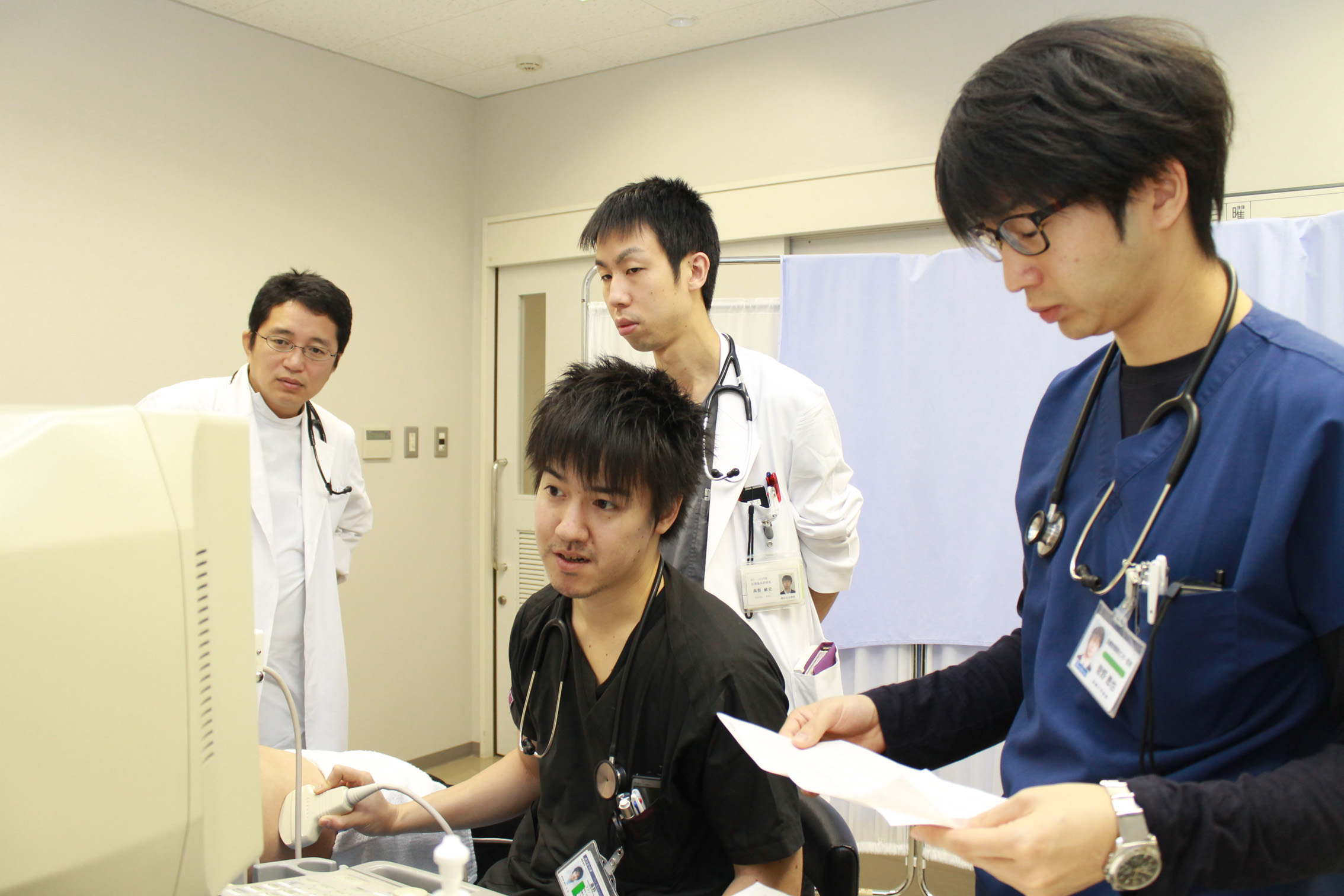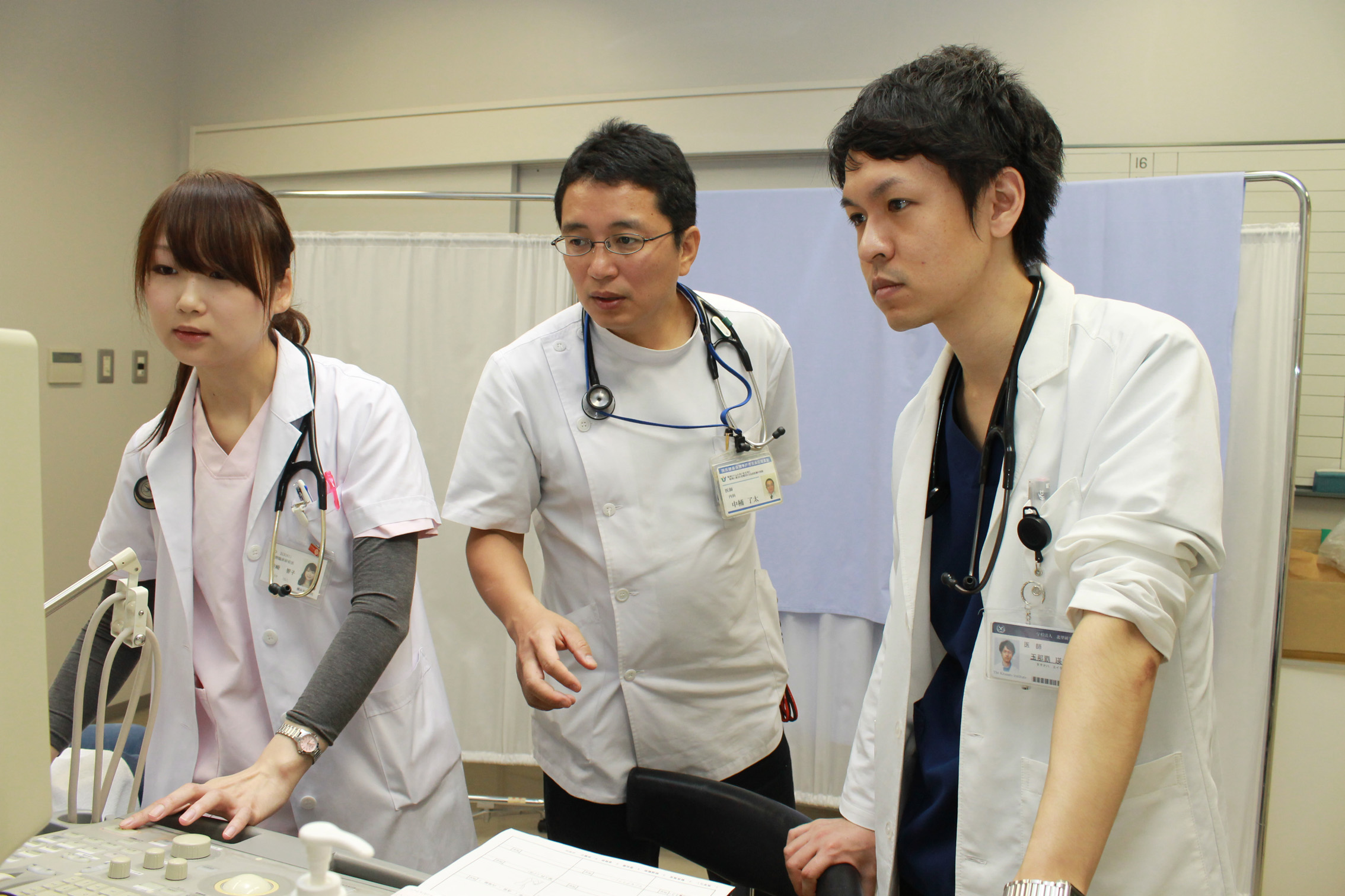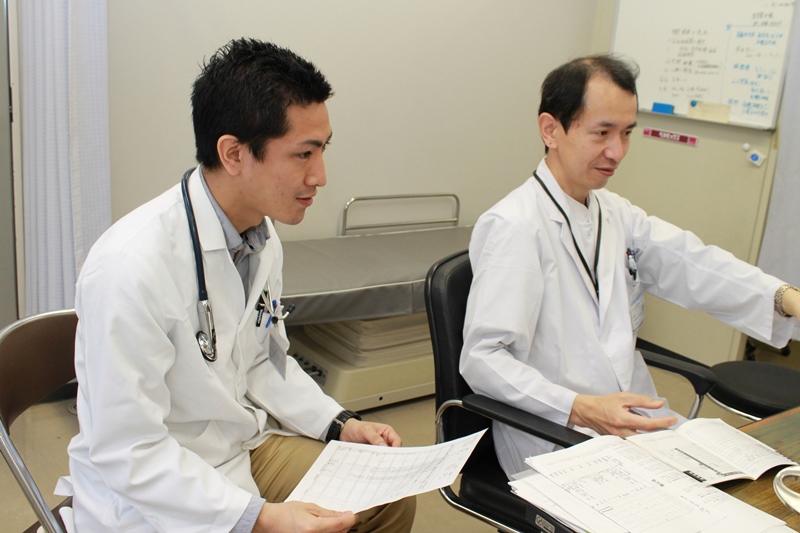 中山先生と西森先生が実習中、入院となり手続き中に調先生がレクチャーしている様子です。