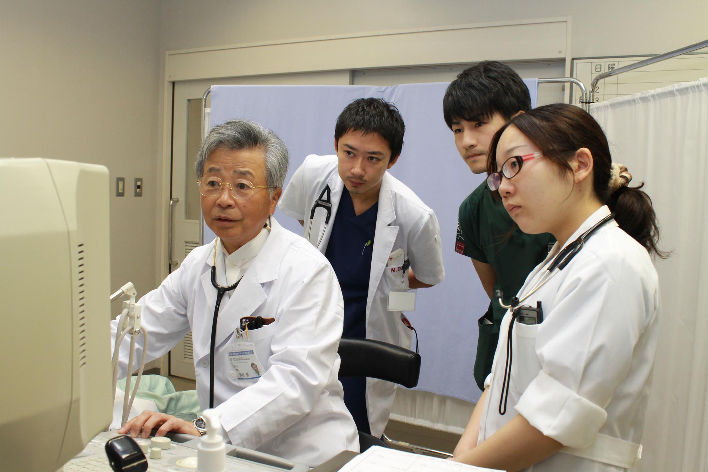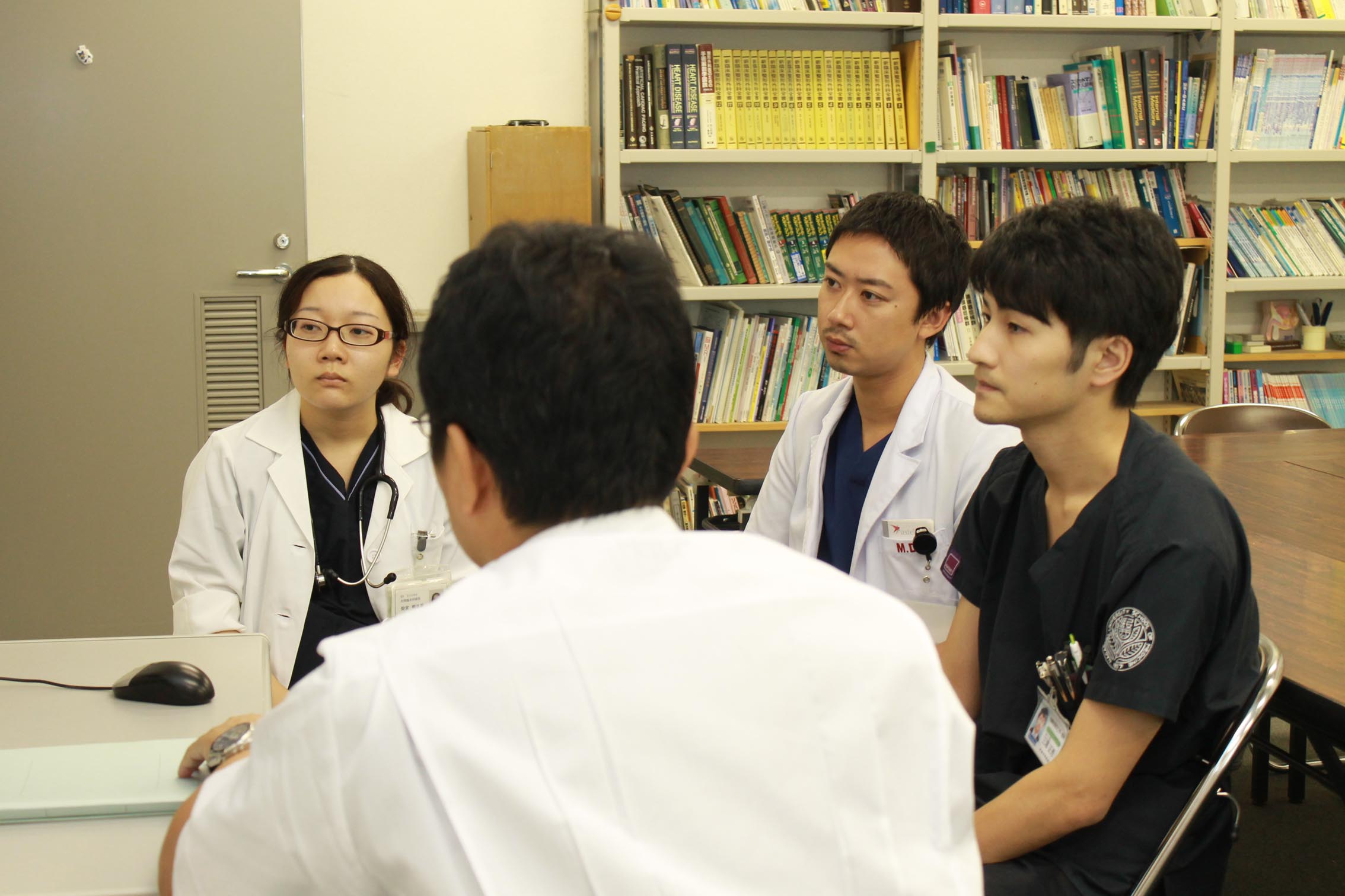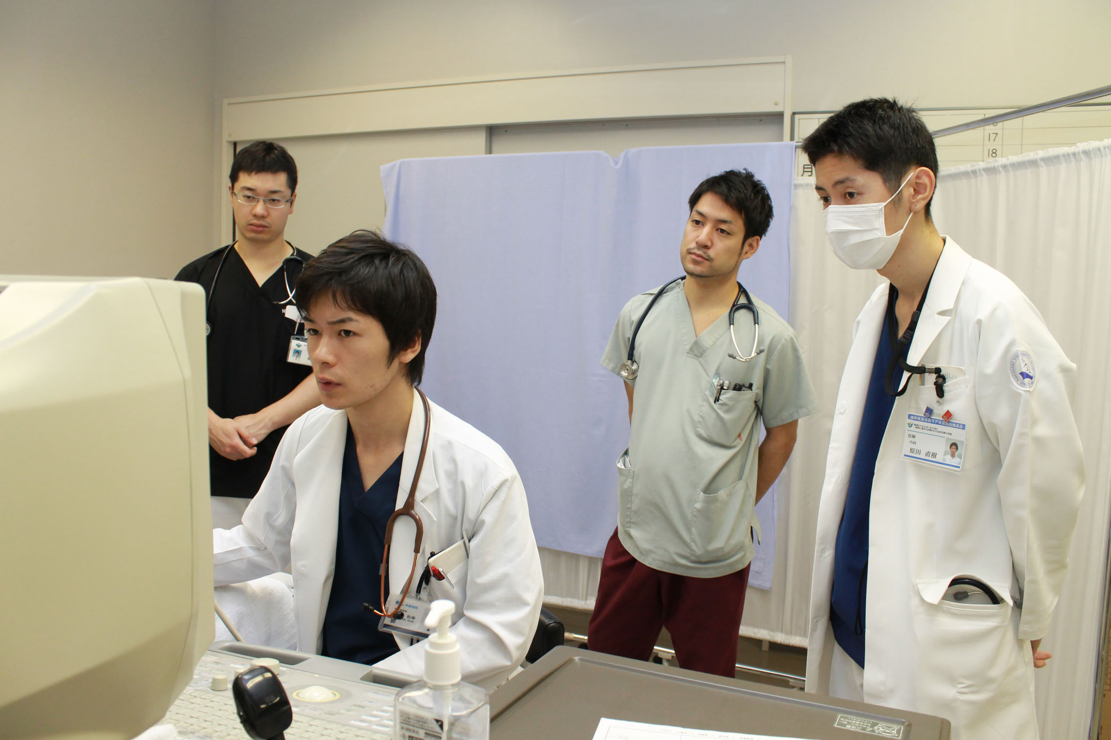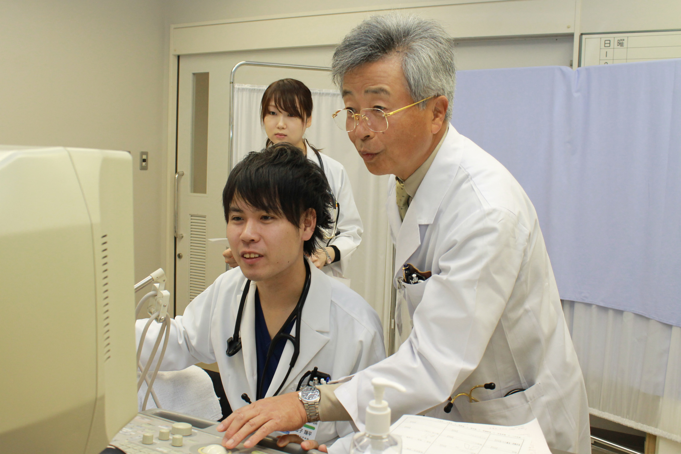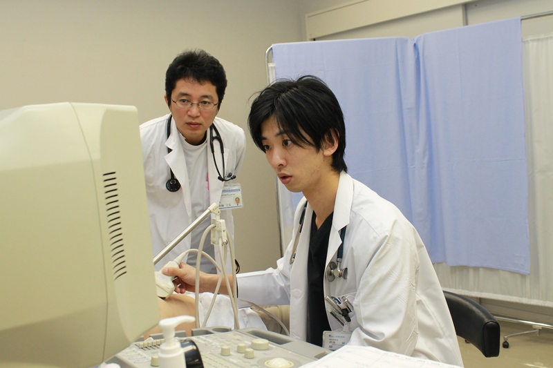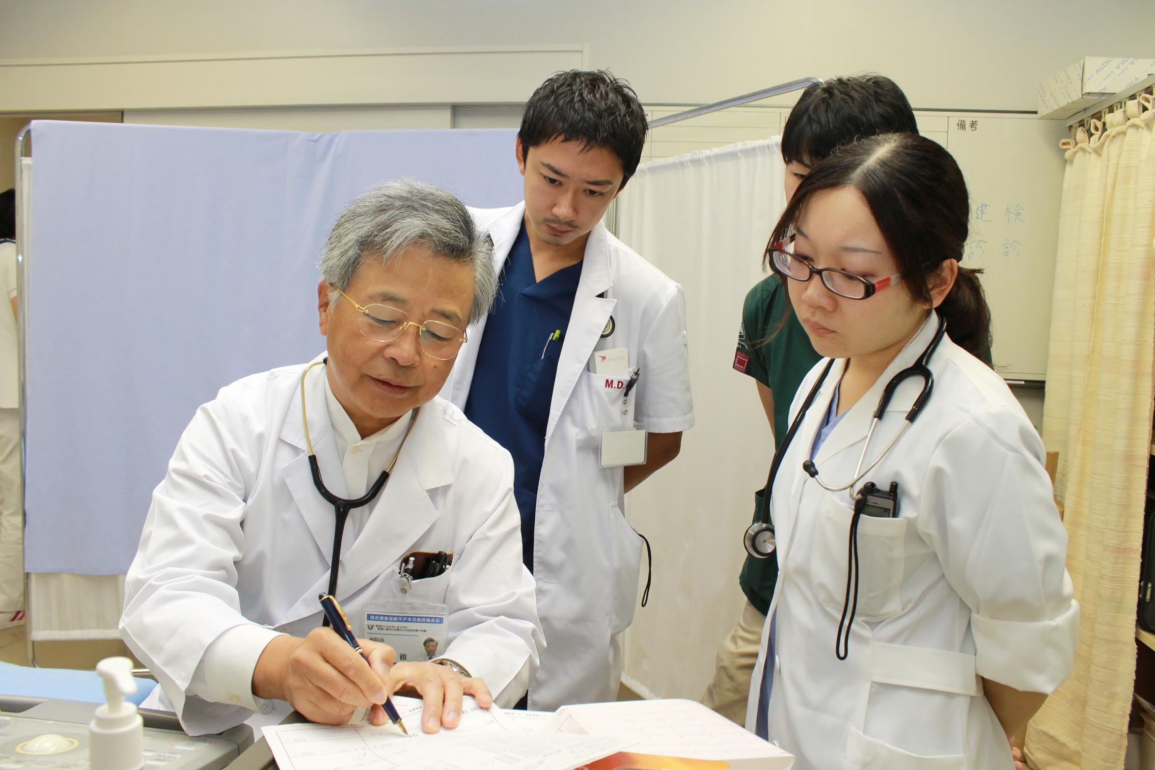 中山先生と西森先生が実習中、入院となり手続き中に調先生がレクチャーしている様子です。