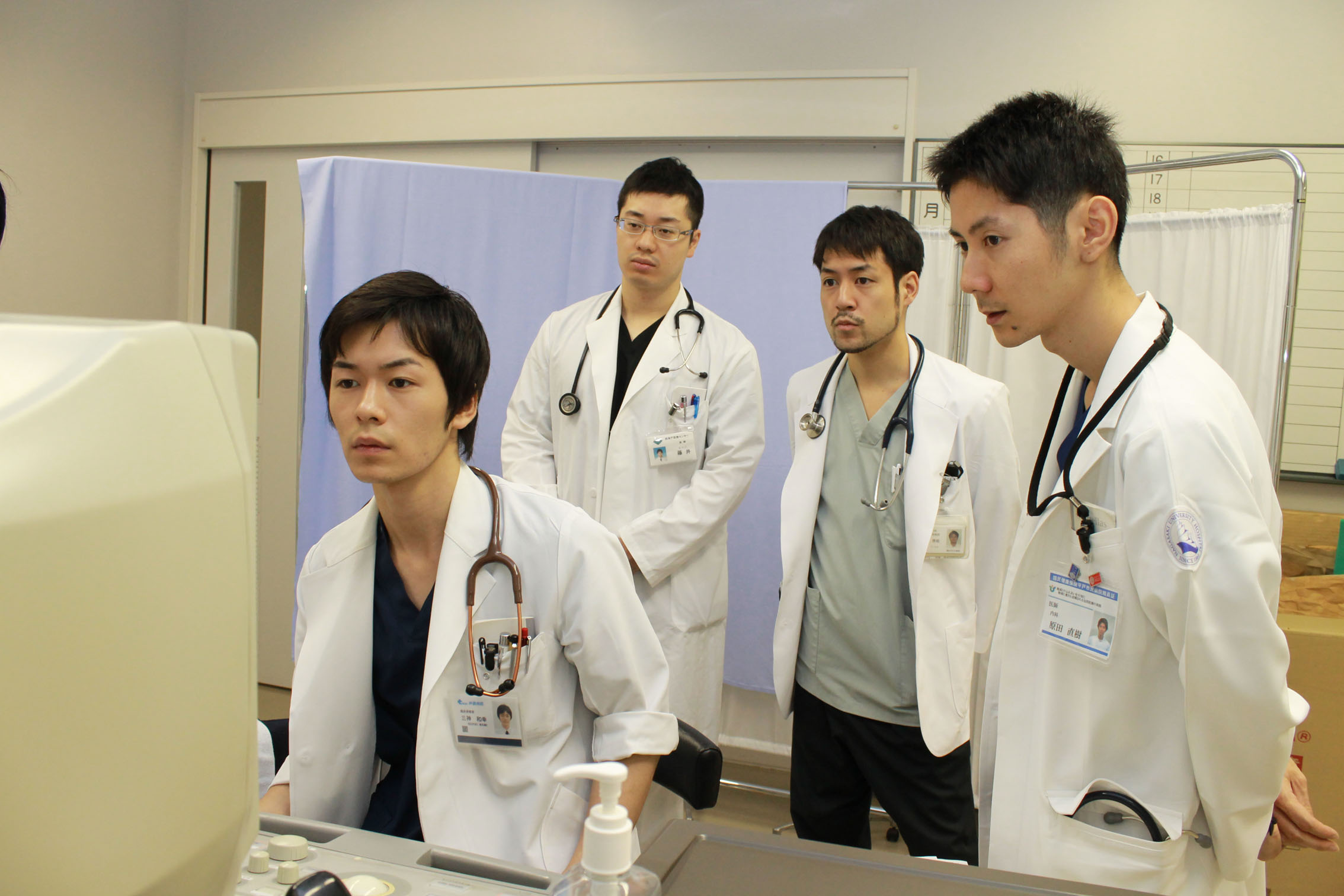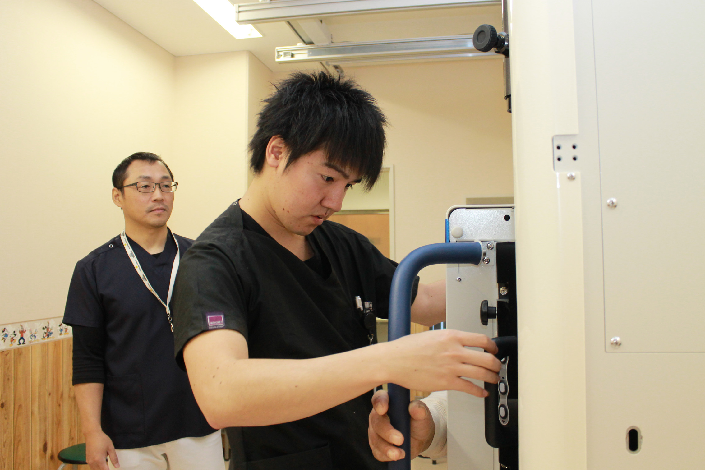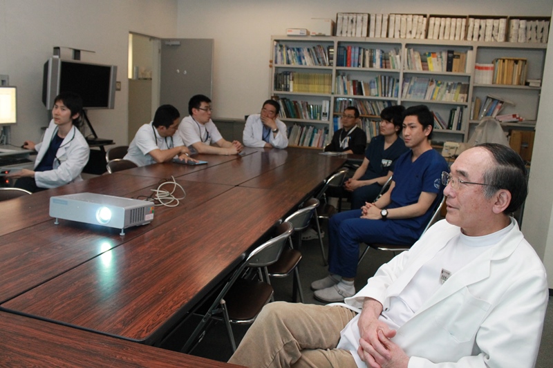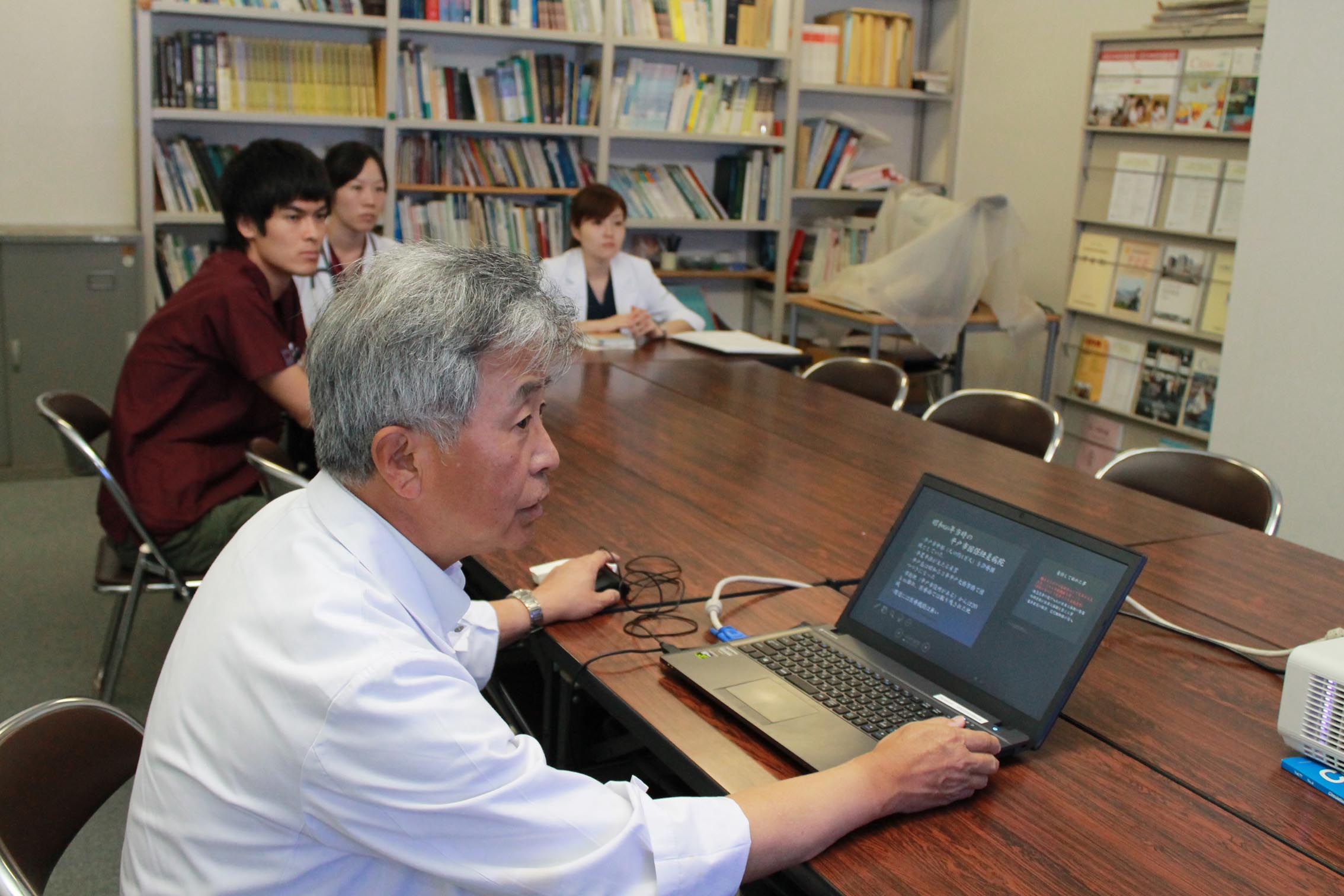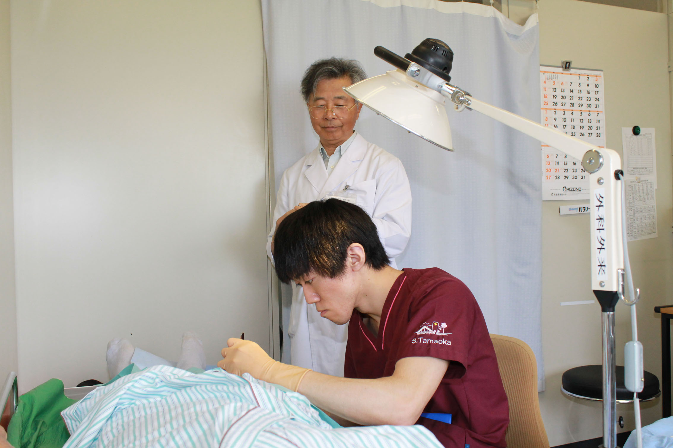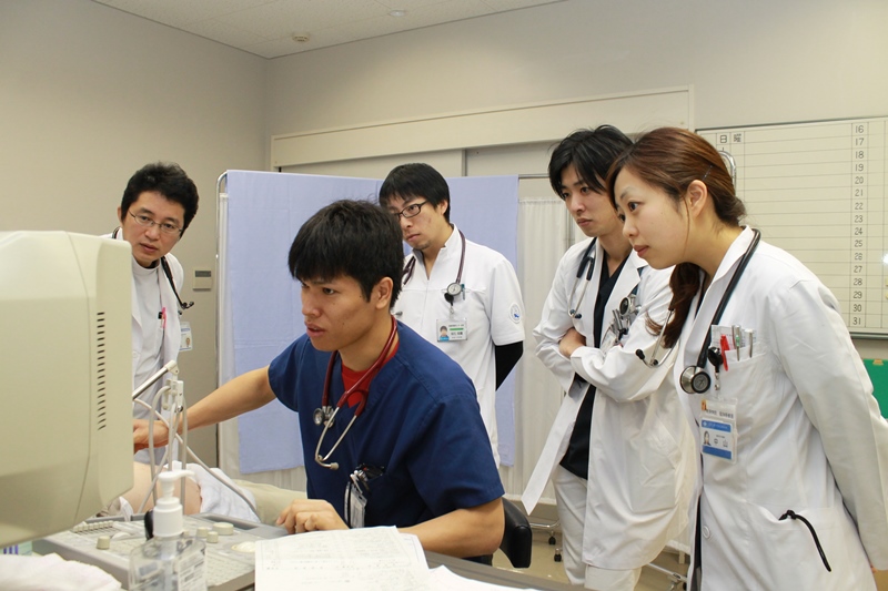 中山先生と西森先生が実習中、入院となり手続き中に調先生がレクチャーしている様子です。