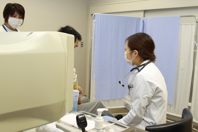 午後から、平戸市院病院近隣にある縫製工場「アリエス」の事業所健診が行われ、研修医の先生方も押淵院長、中桶先生と診察とエコー検査に取り組まれました。