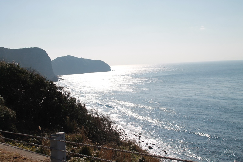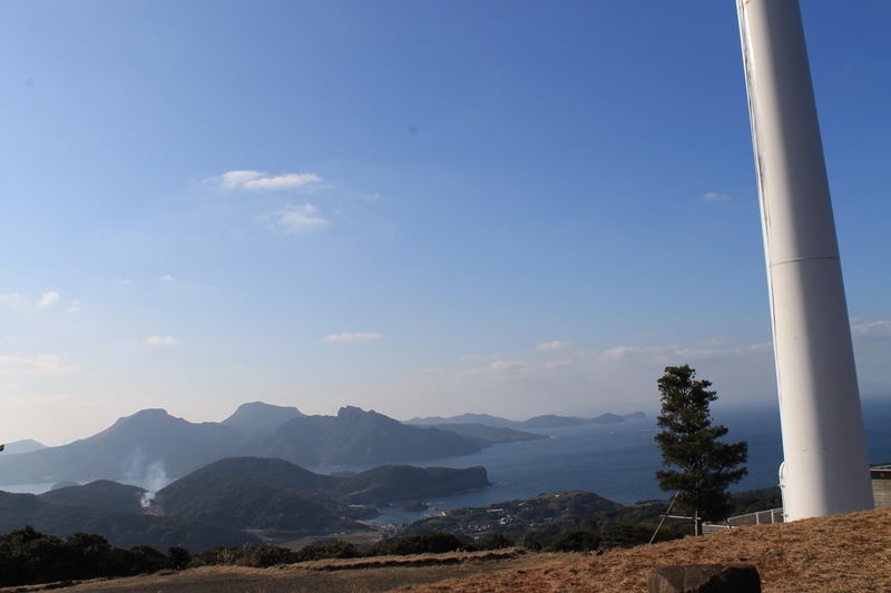 写真は、順に堤町の風力発電所から見下ろした風景、根獅子の海、生月島の海です。