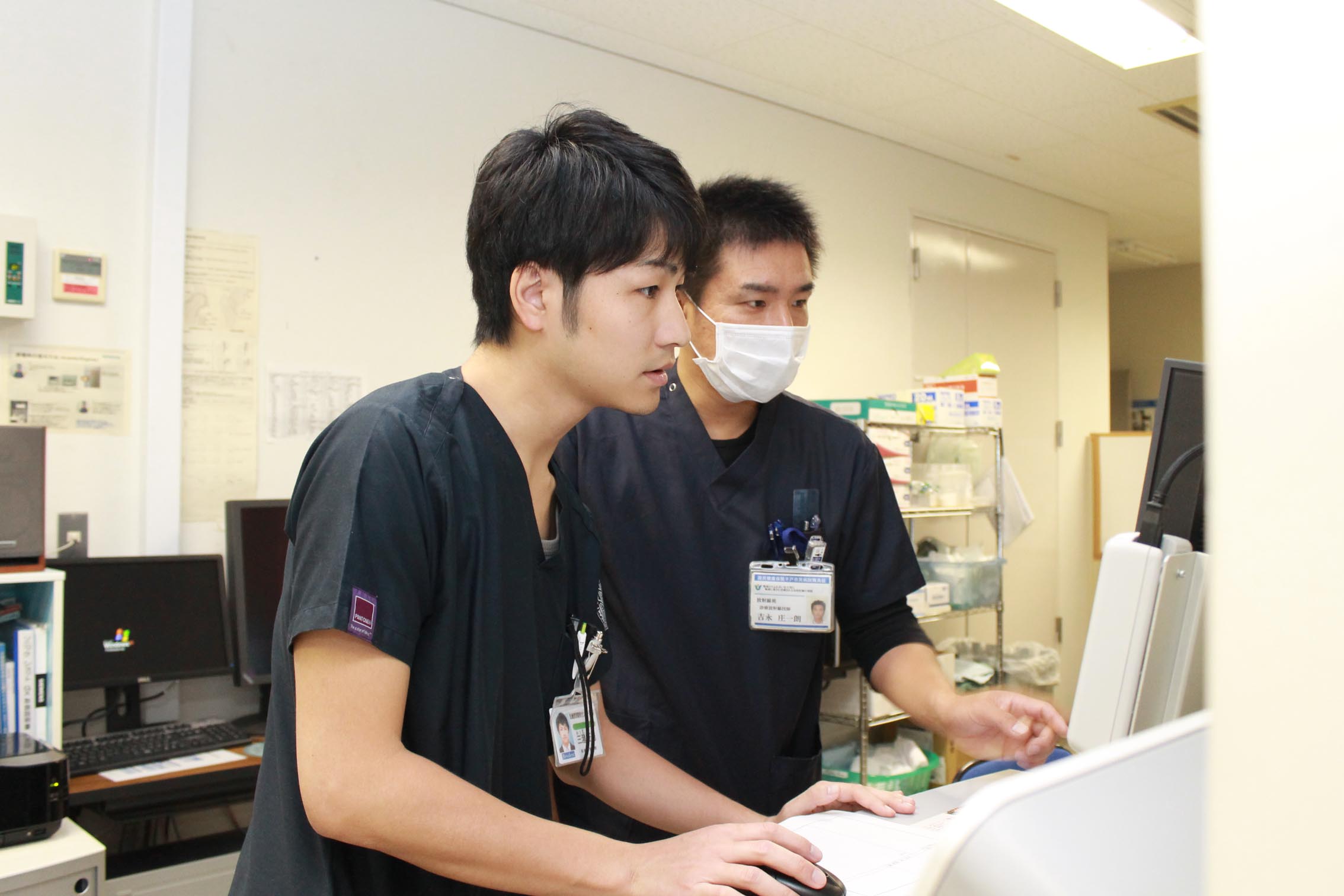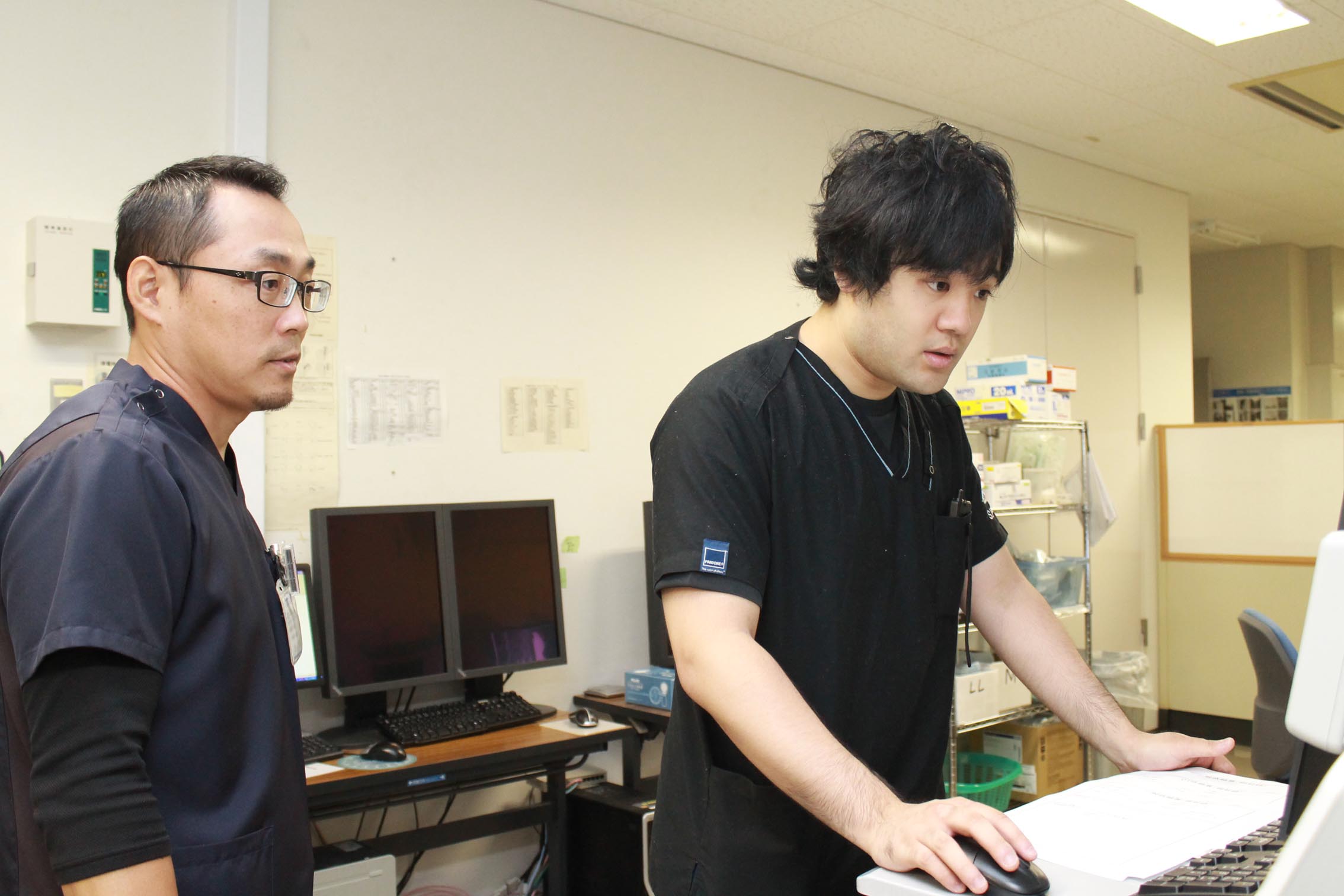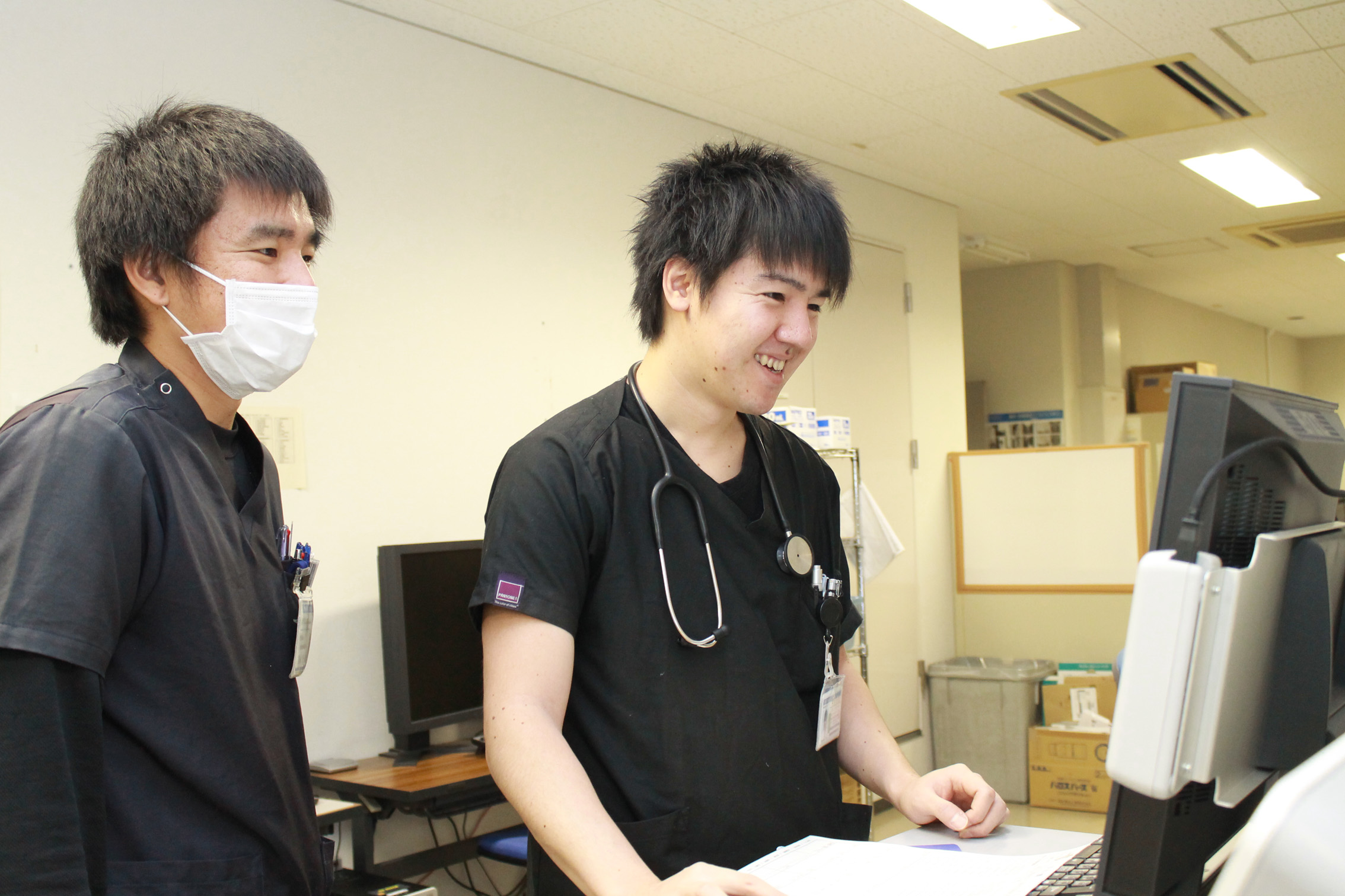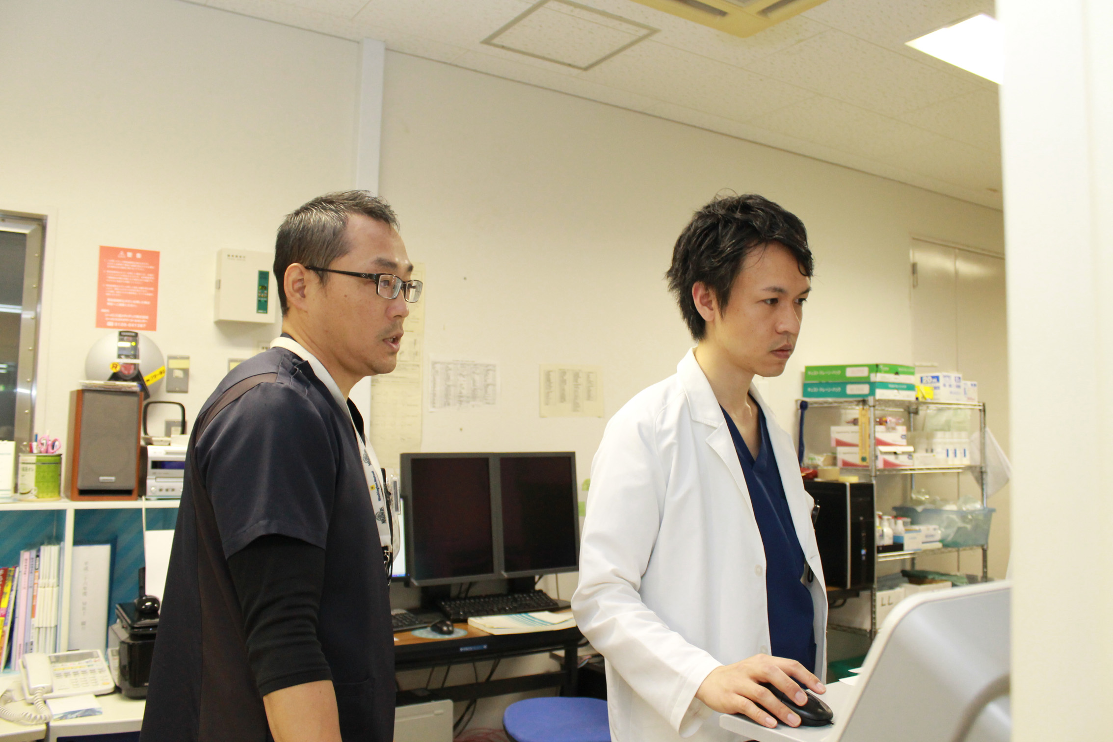 明石先生は、押淵院長との外科外来、赤羽先生は放射線科実習の様子です。