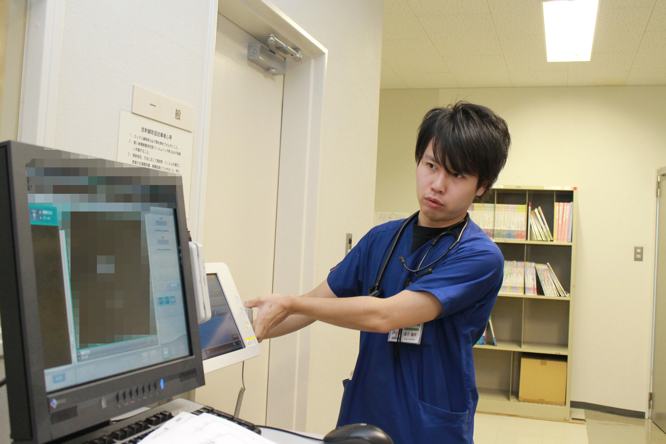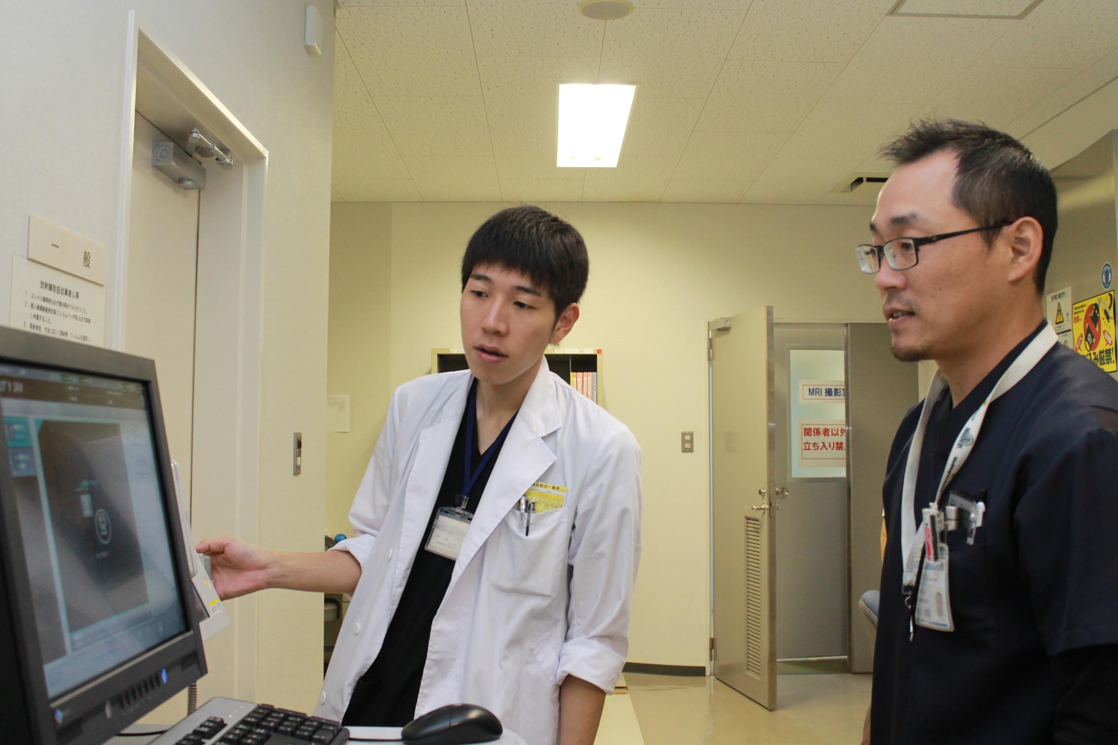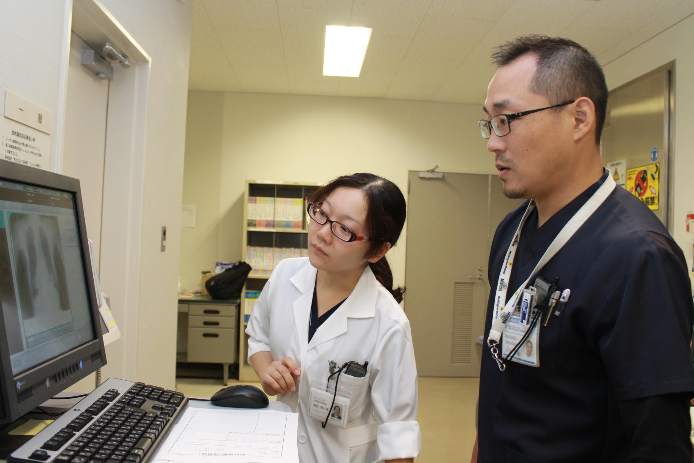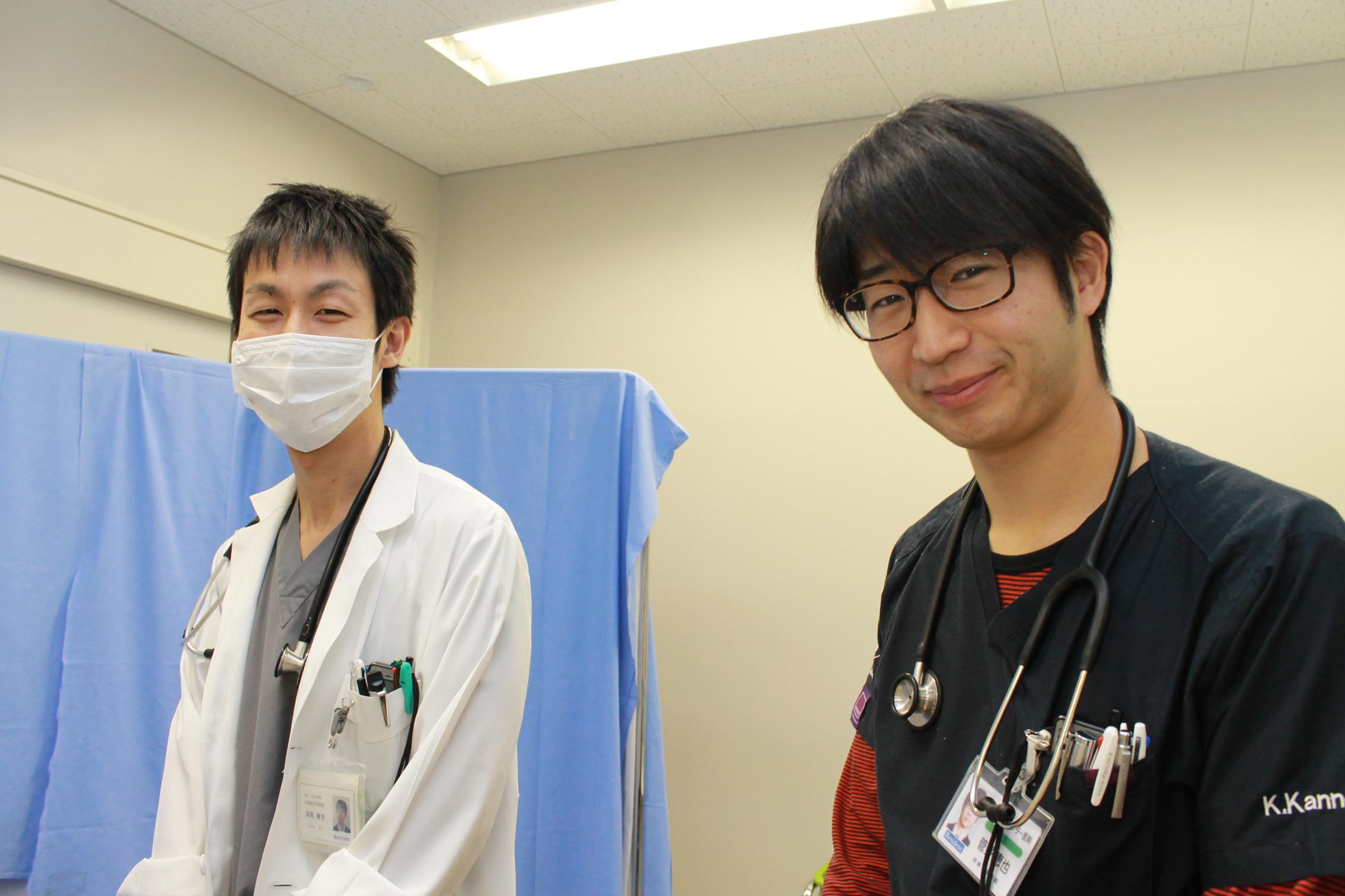 明石先生は、押淵院長との外科外来、赤羽先生は放射線科実習の様子です。