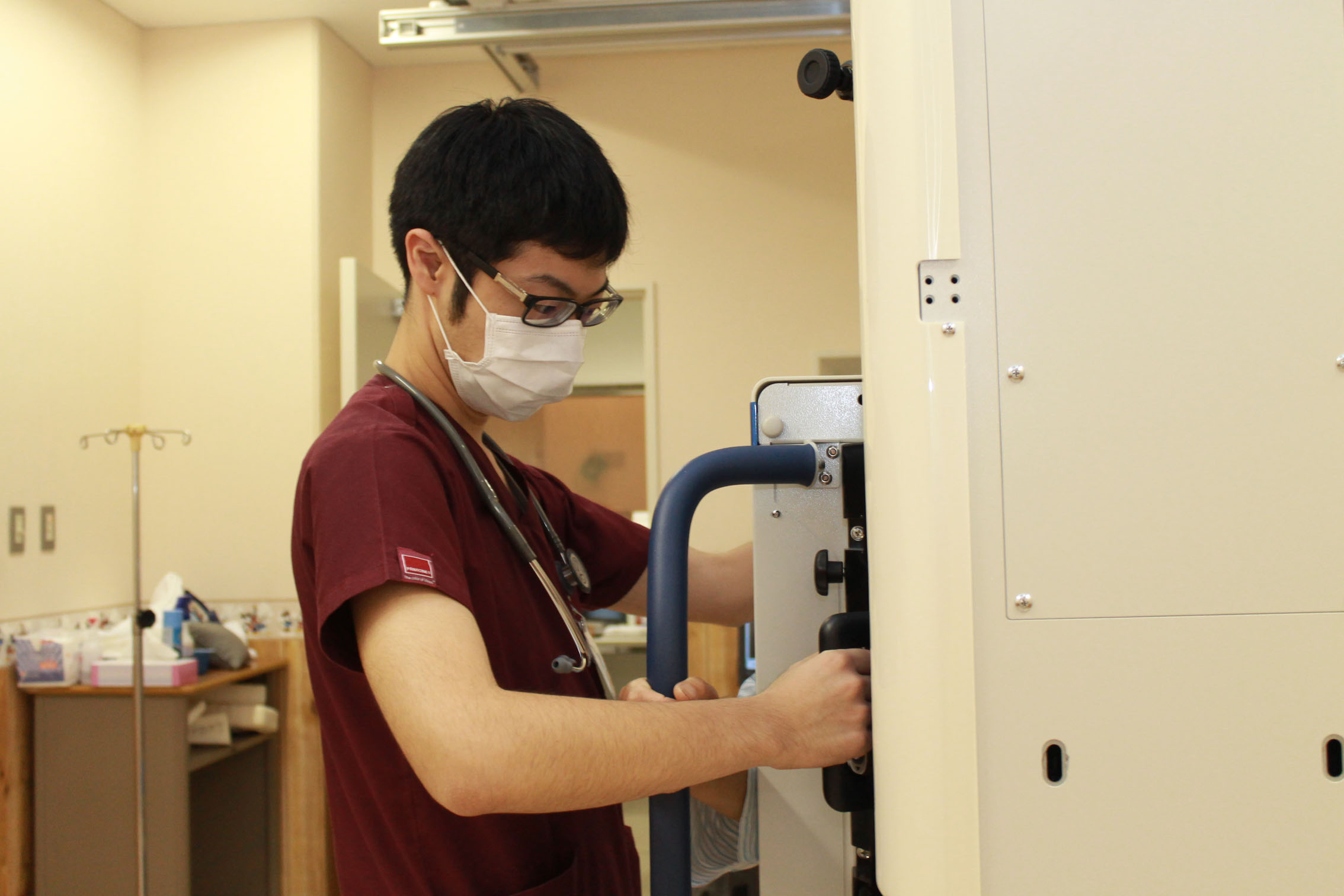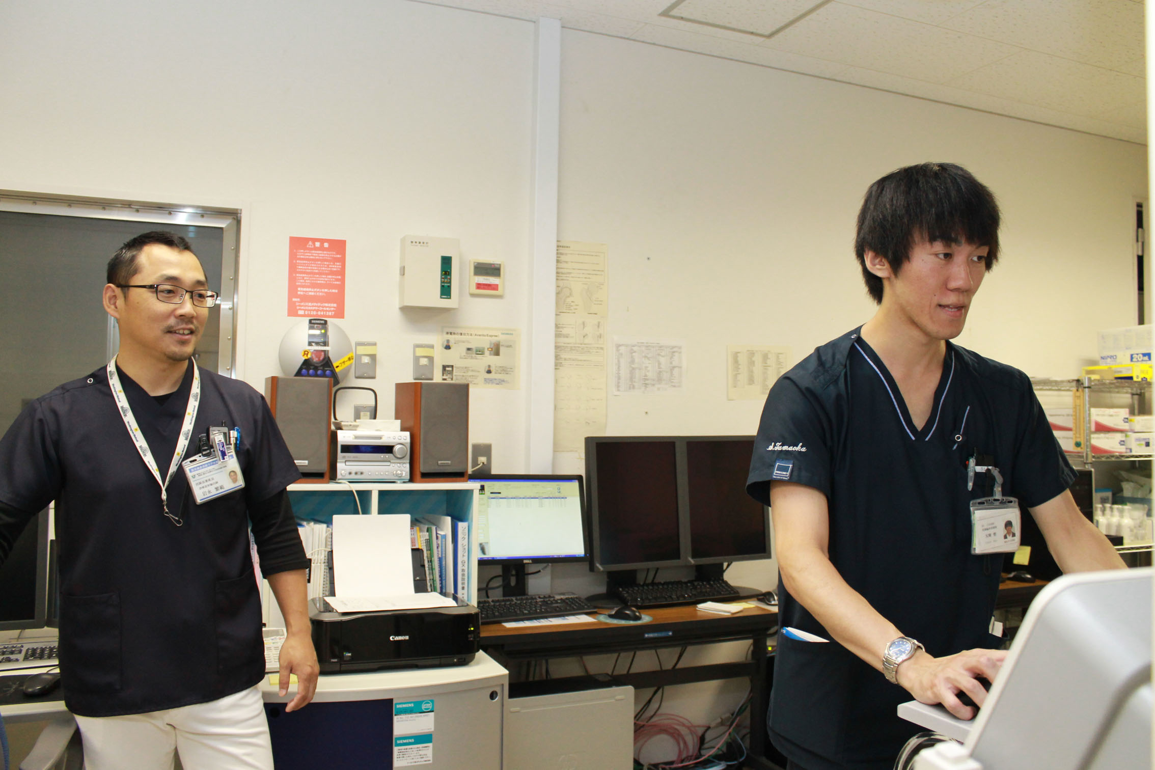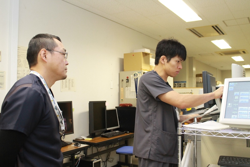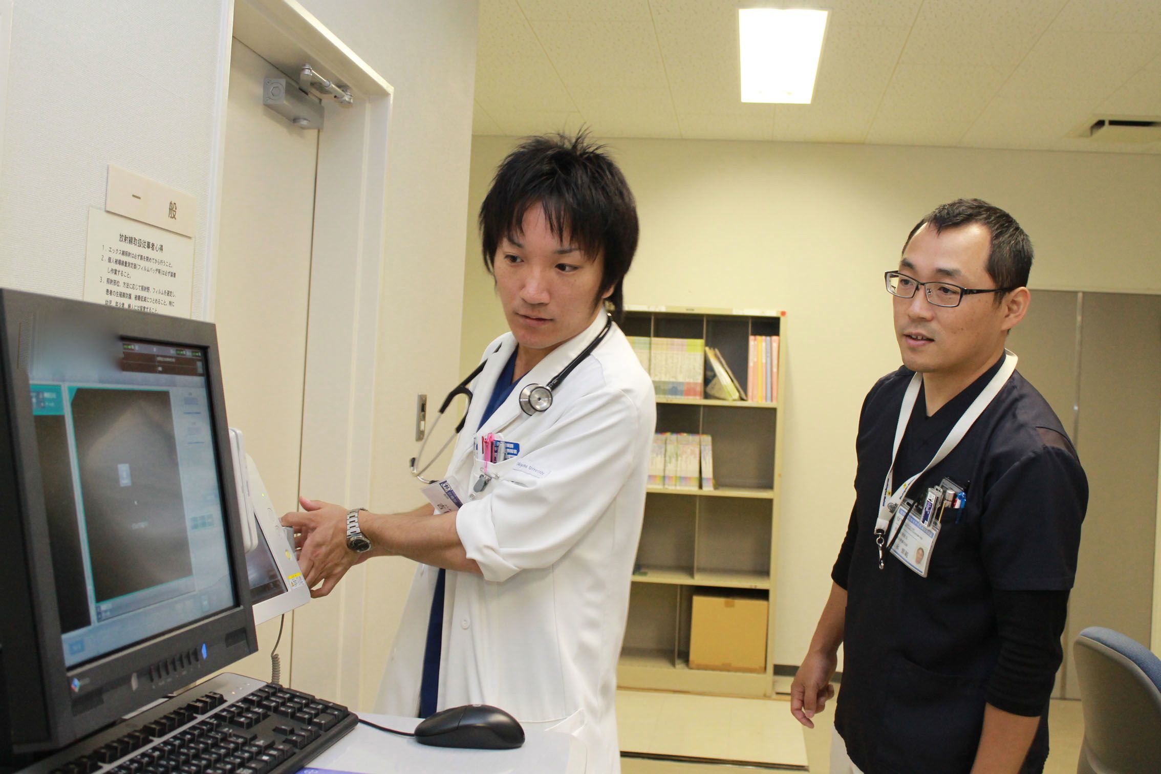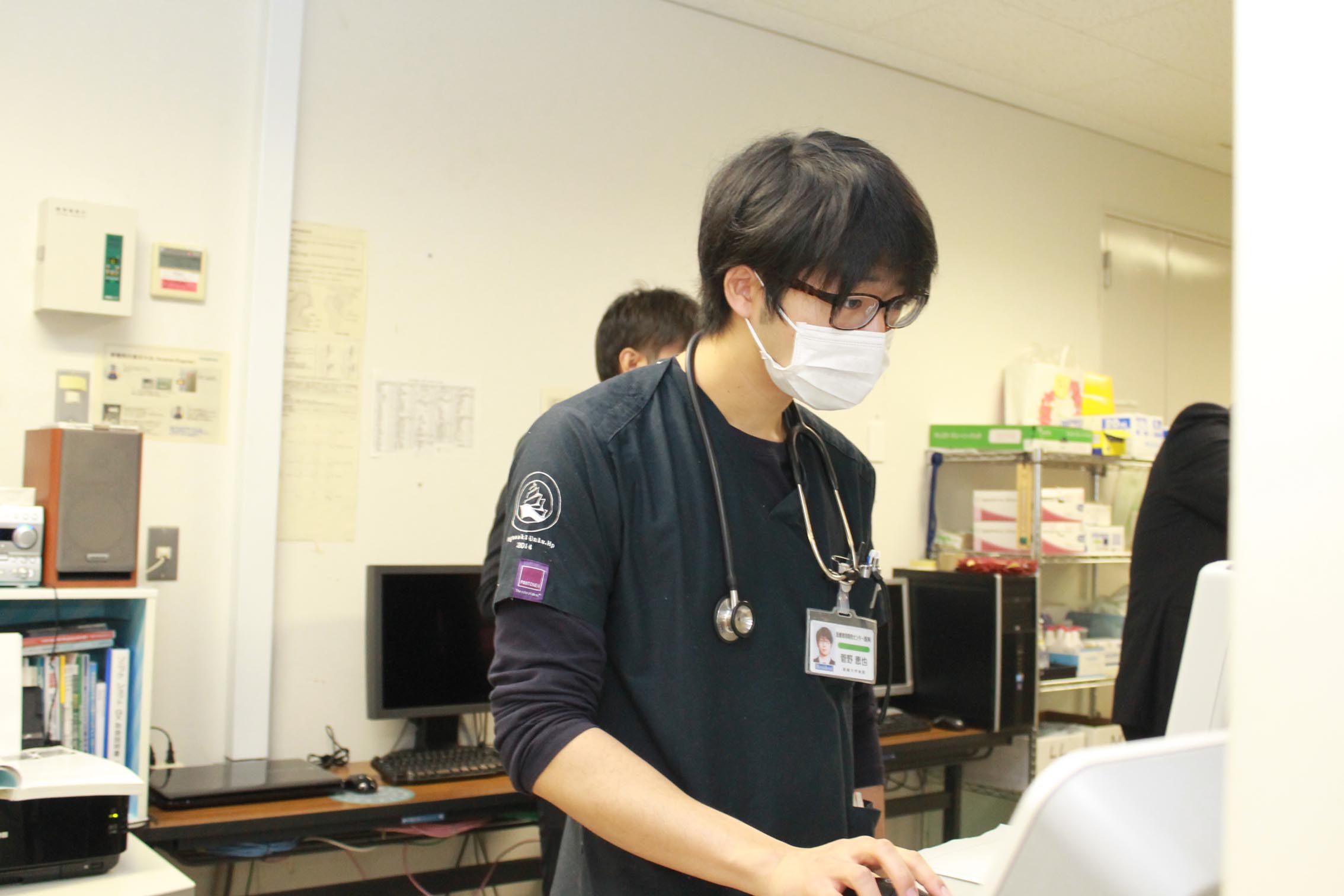 明石先生は、押淵院長との外科外来、赤羽先生は放射線科実習の様子です。