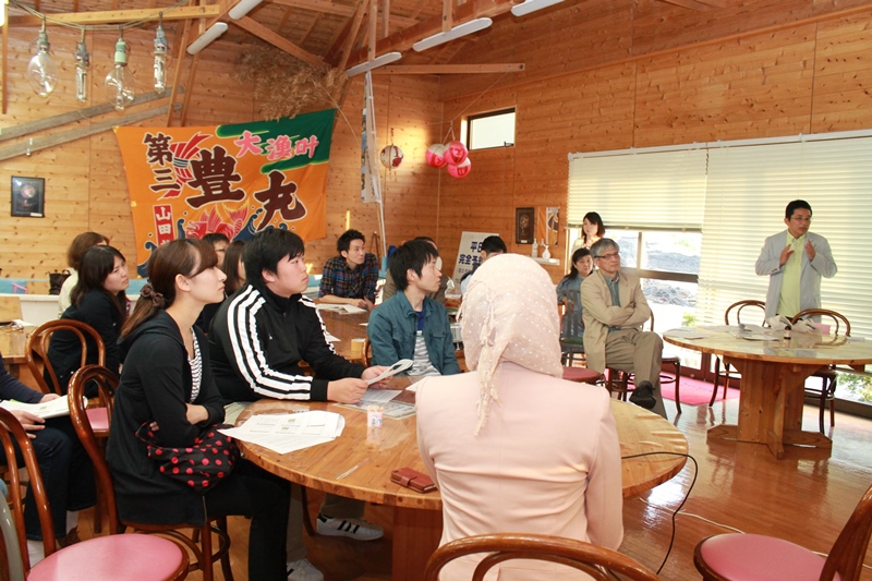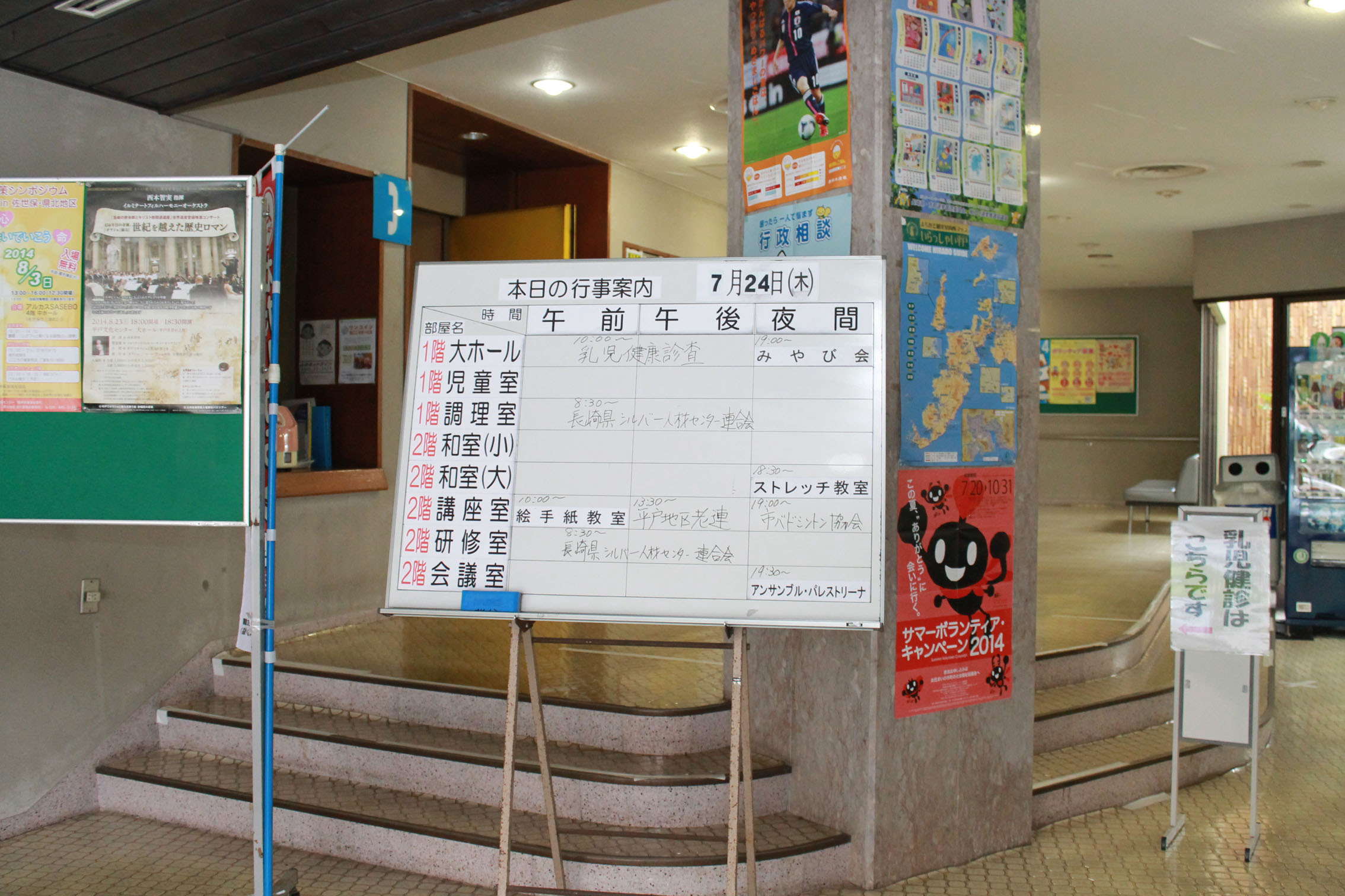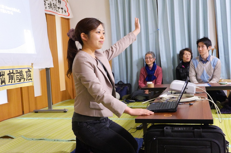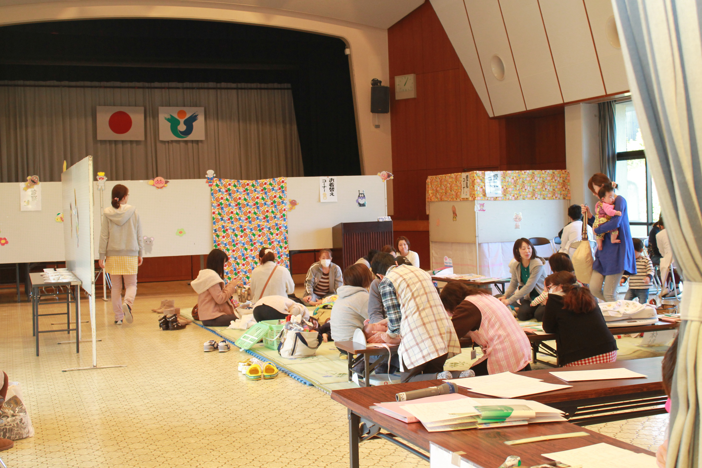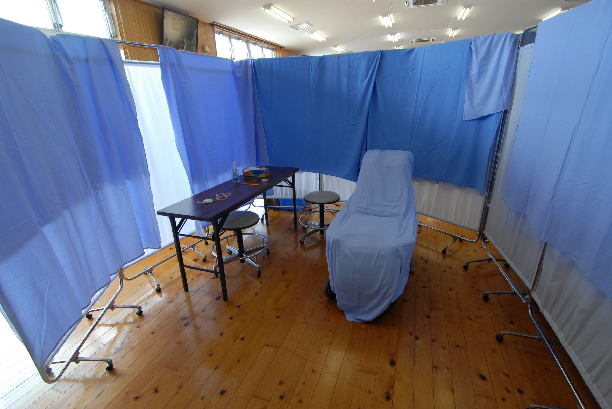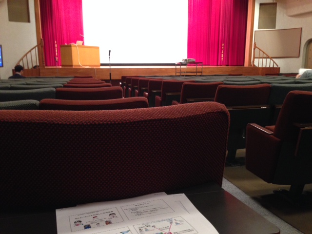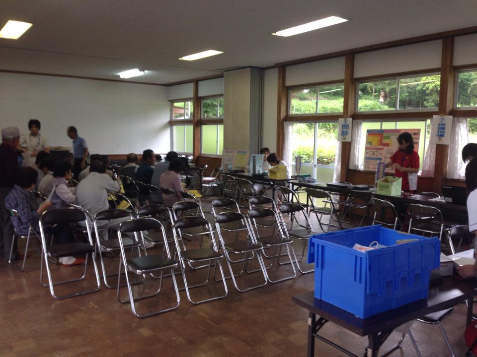 地区の公会堂で、会場設営はスタッフ皆さんでします。スクリーンはシーツです。手作り感がいいですね☆