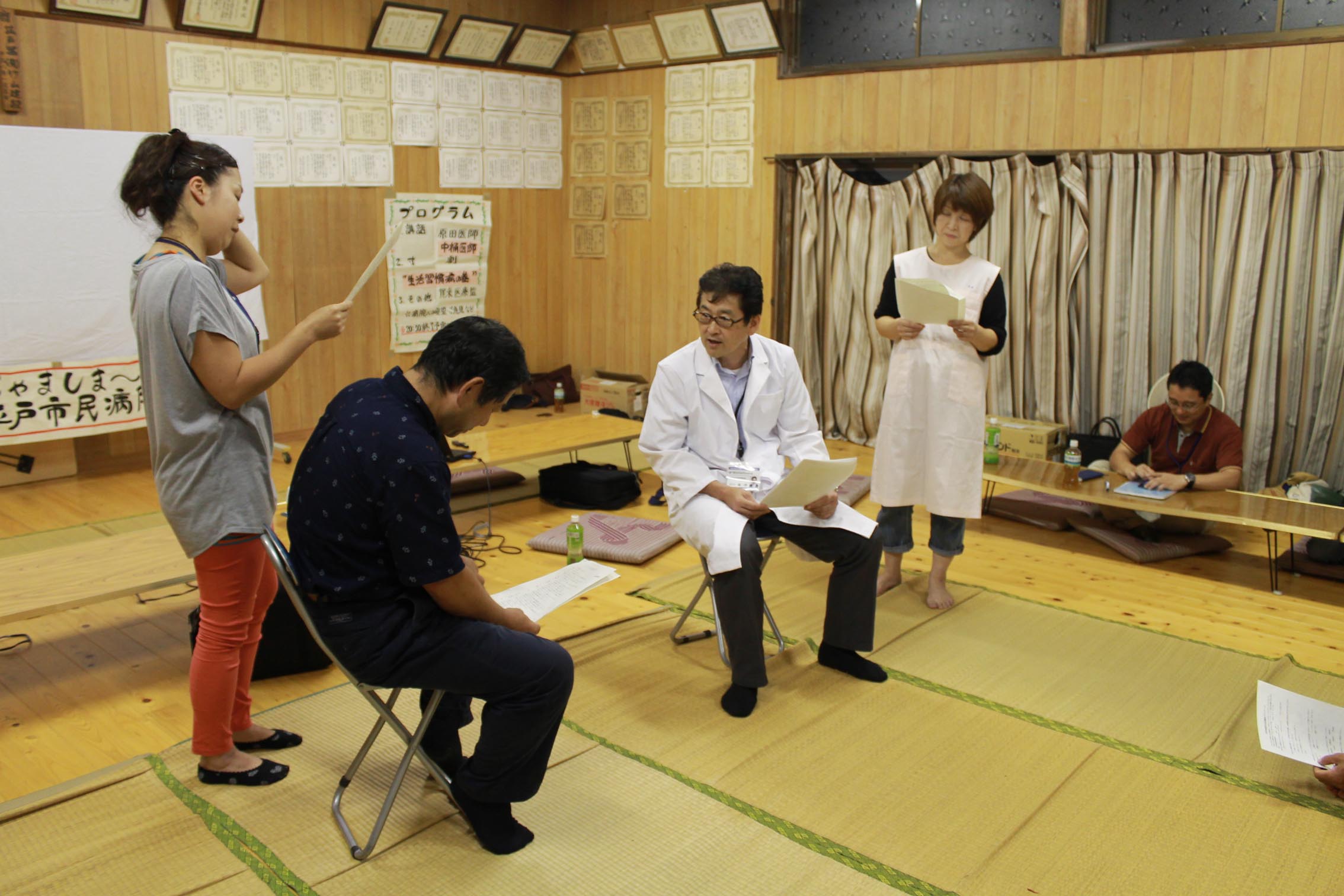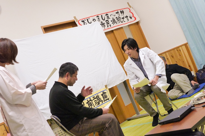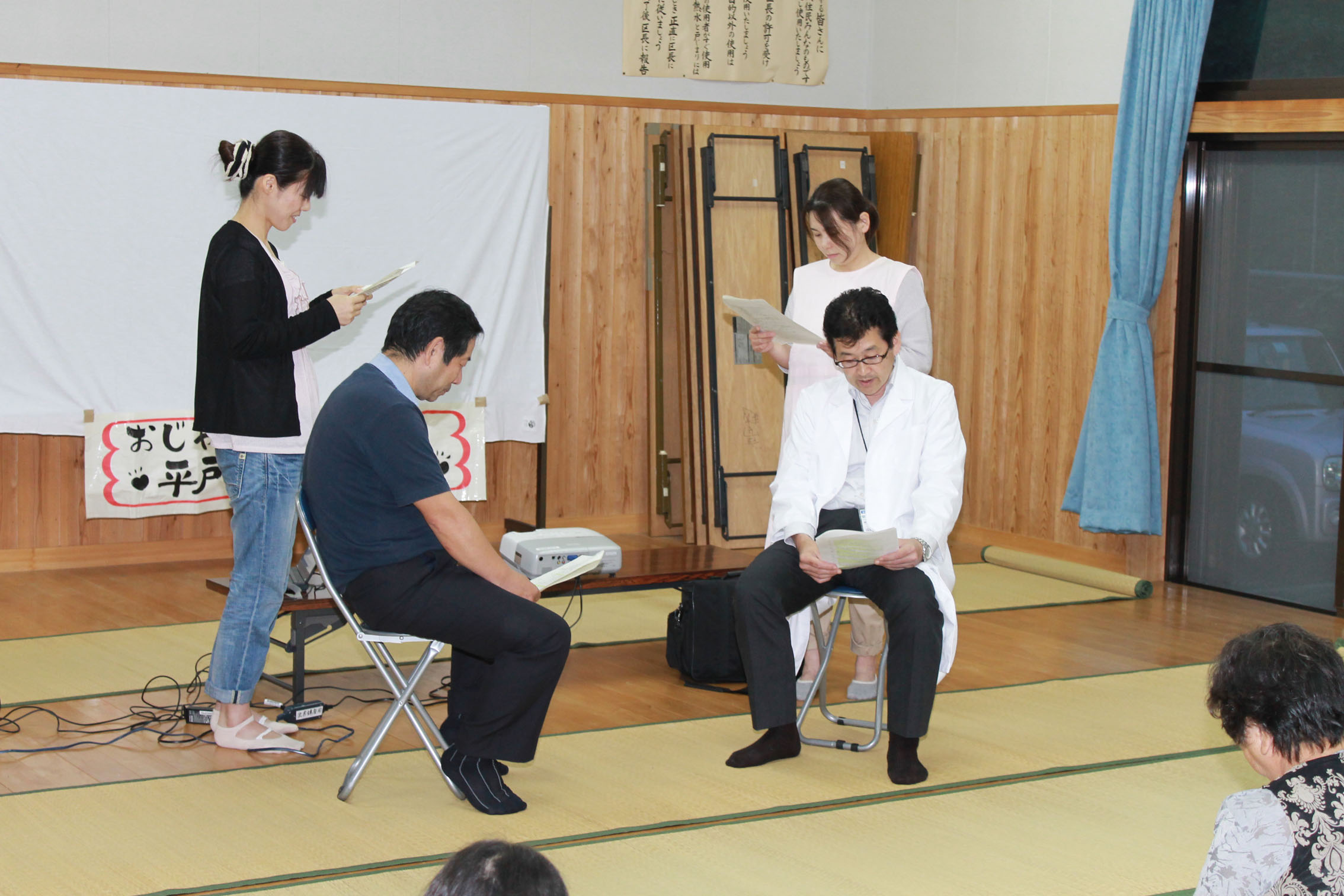 賀來医療監脚本の劇には、地域の人たちにわかりやすく、そしてダジャレを取り入れておもしろく、伝えるストーリーです。地域の人たちも、おもわず笑顔がこぼれていますね。