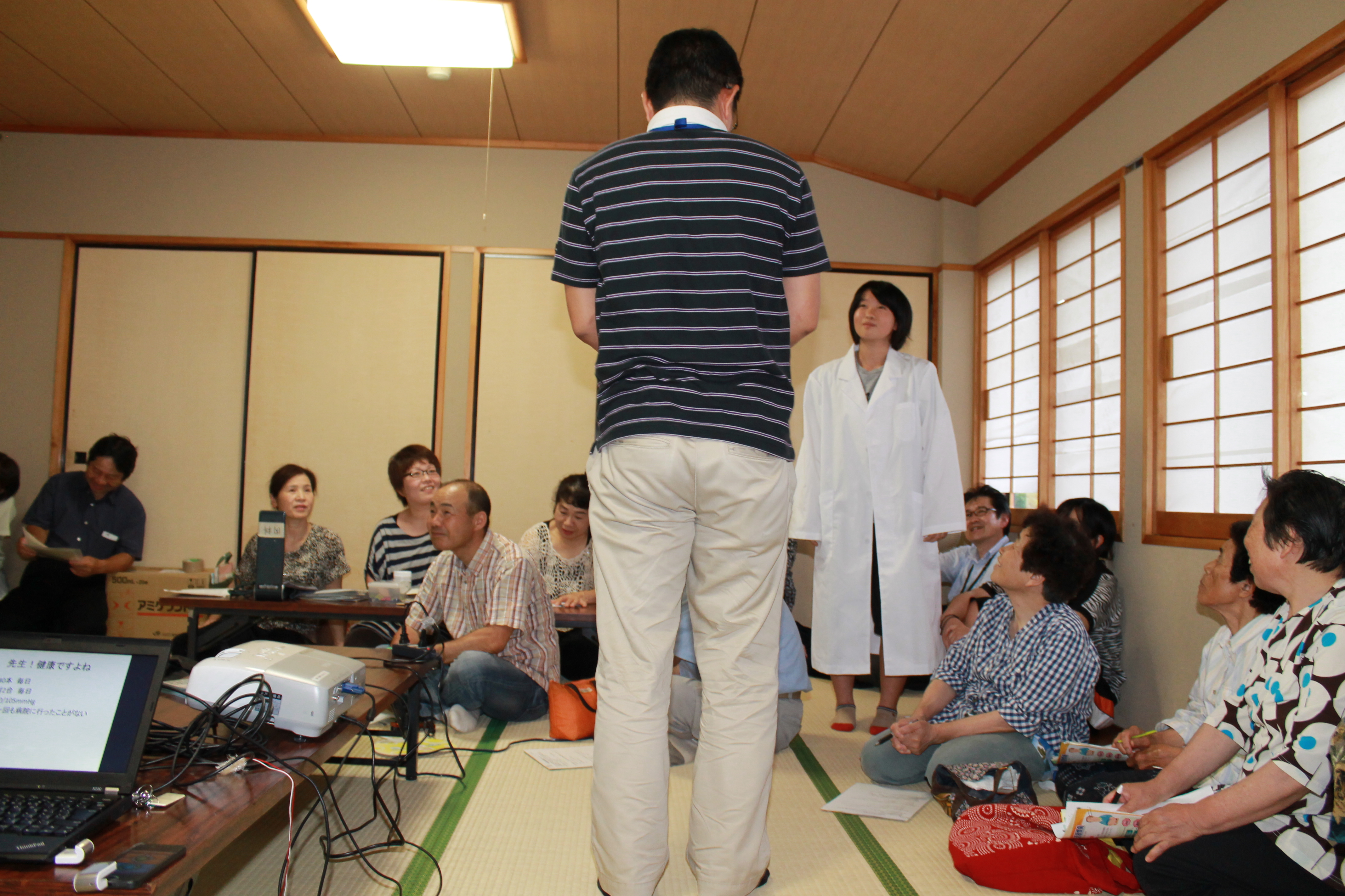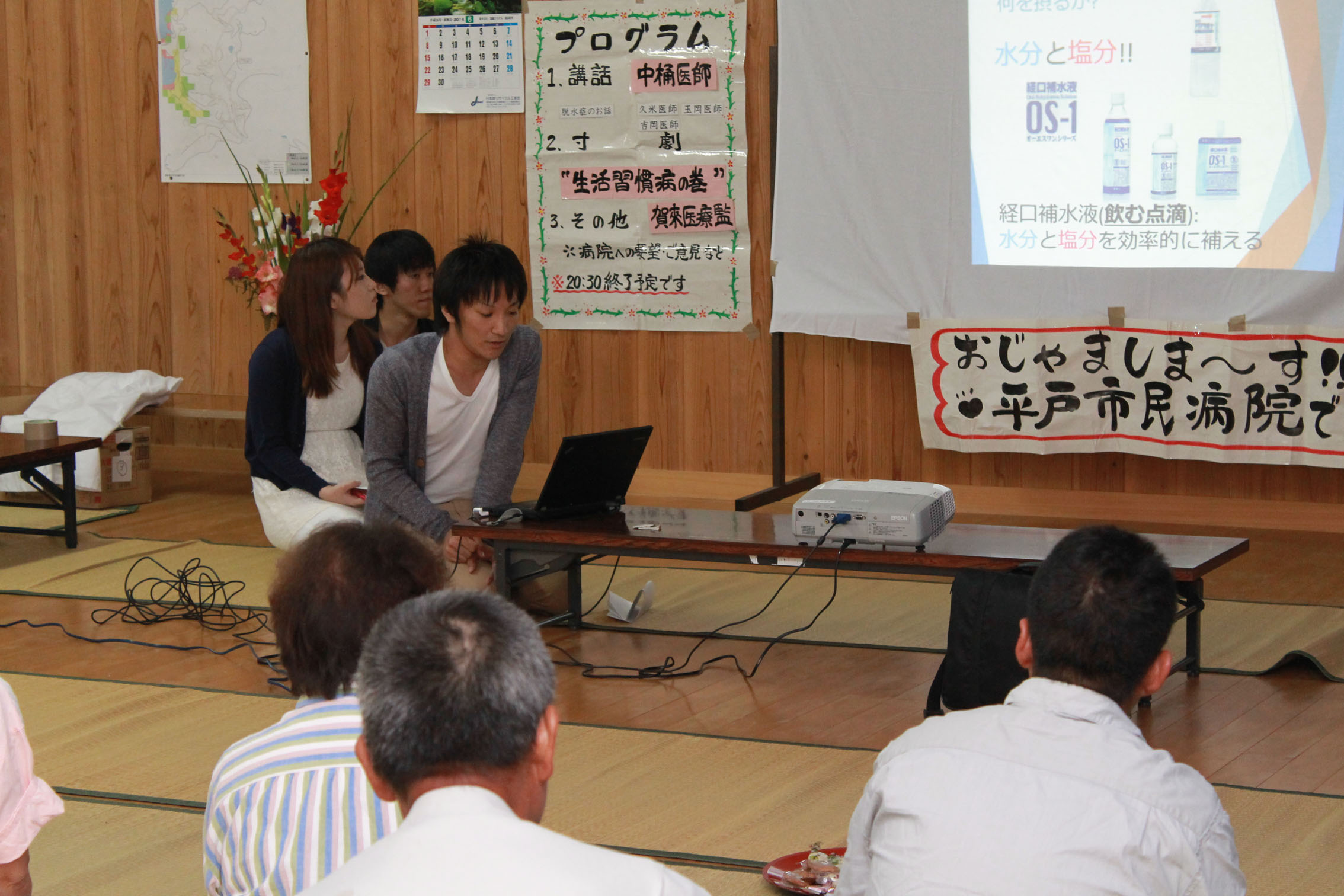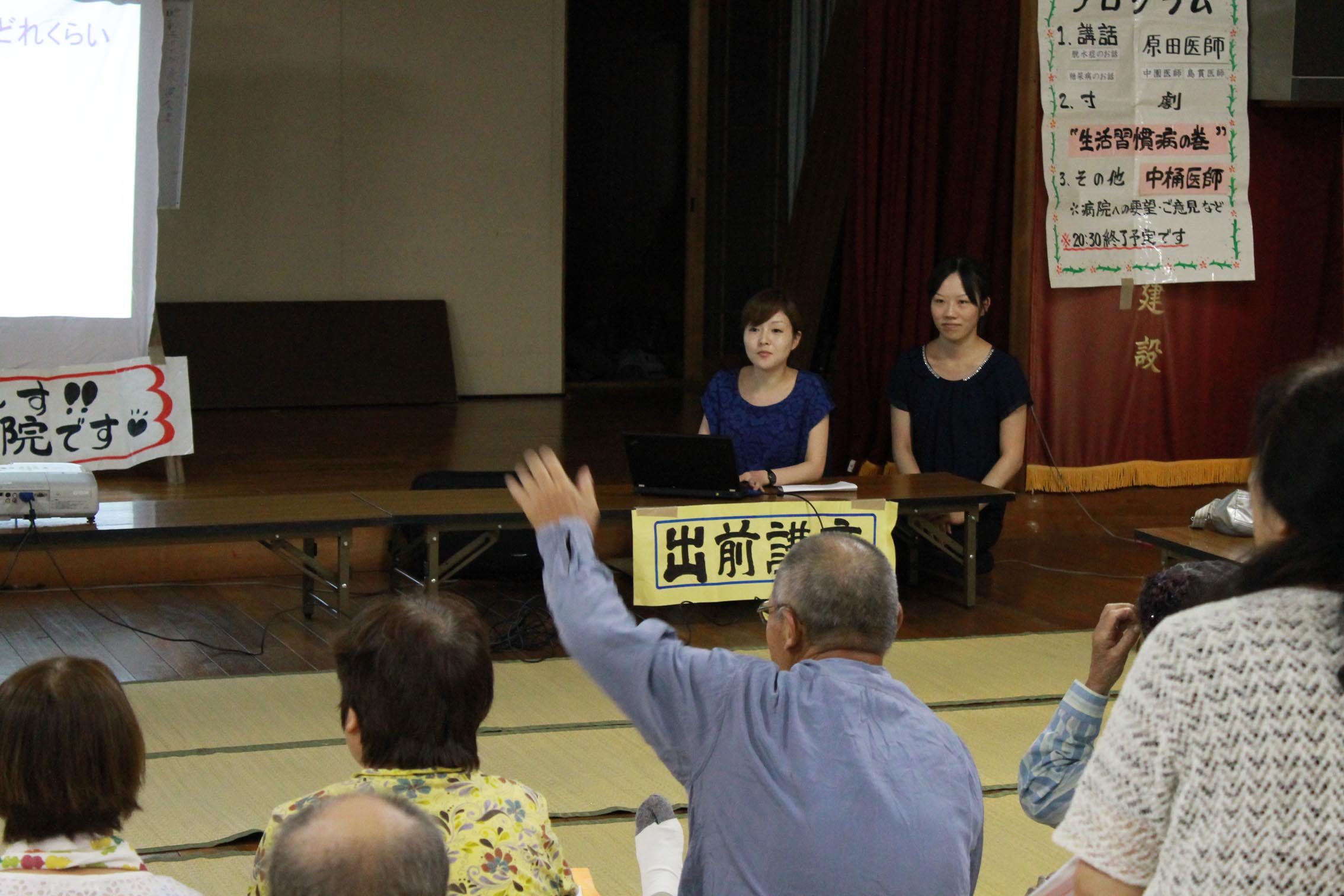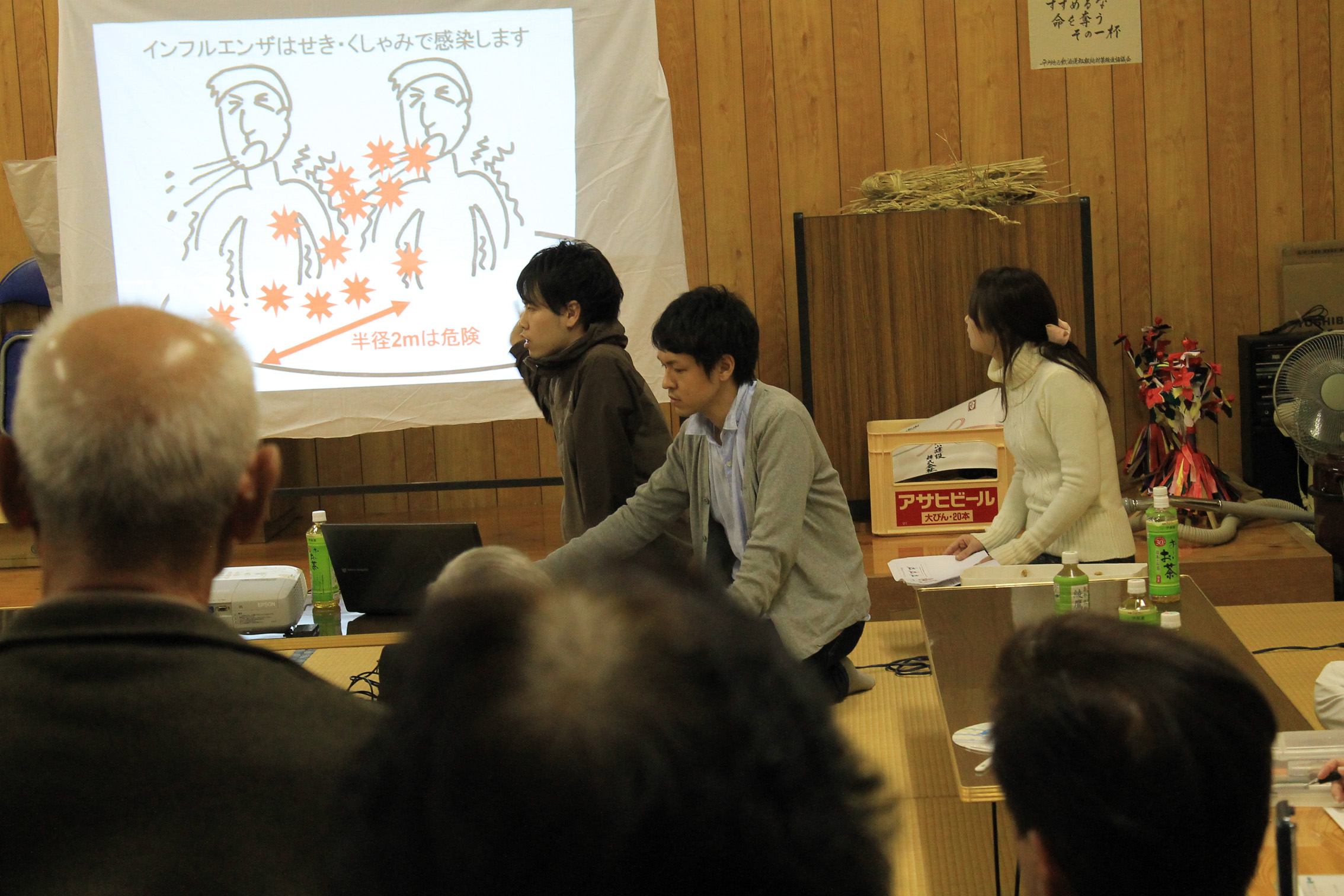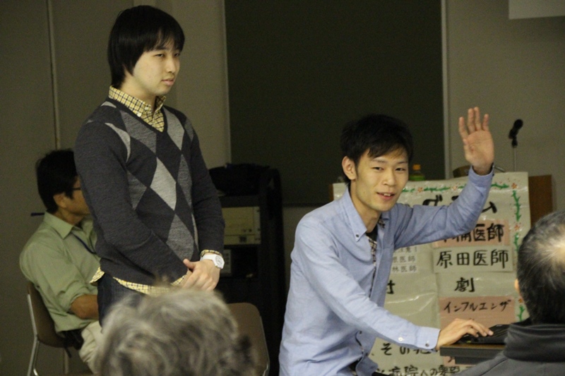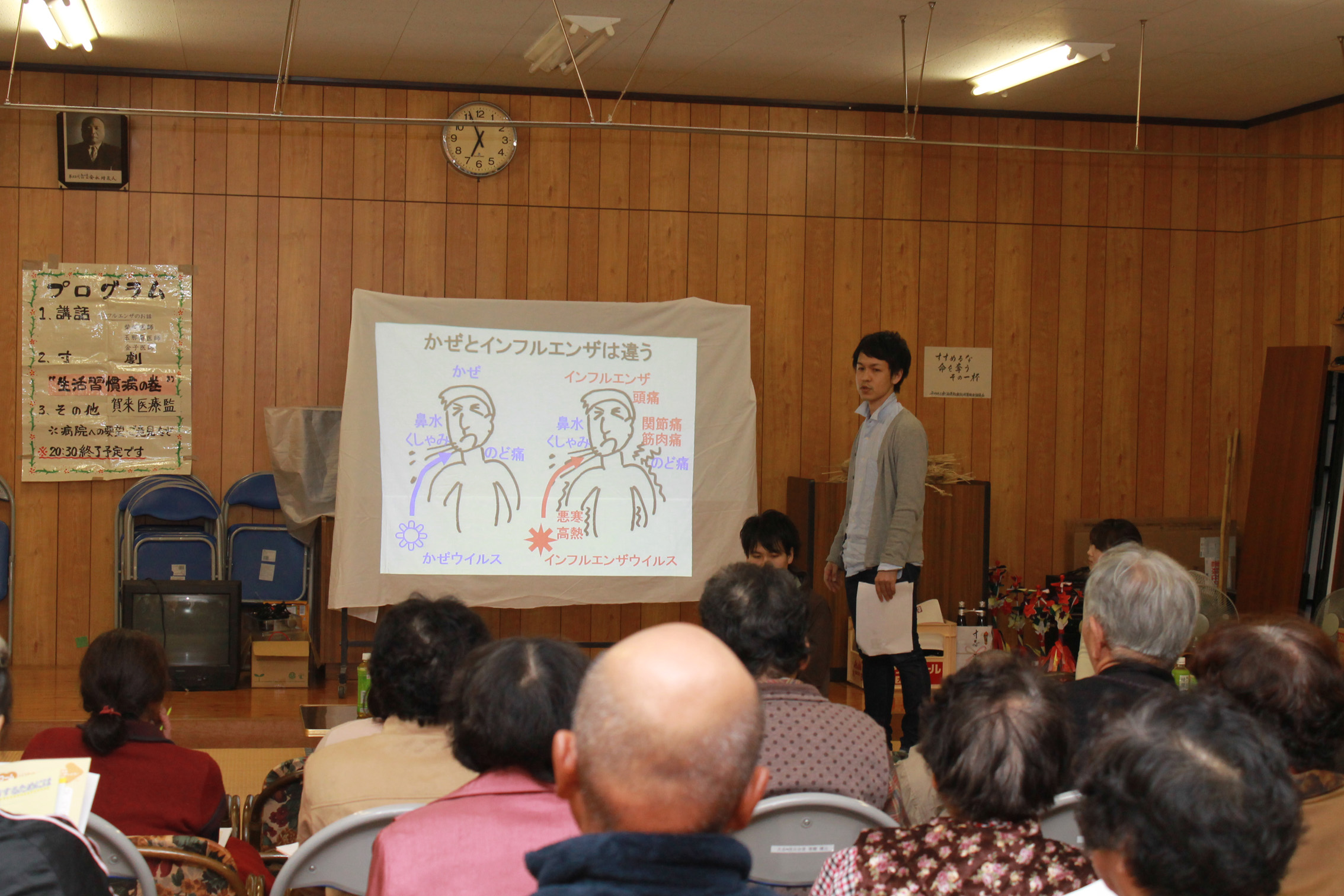 プログラム1は講話です。中桶先生の血圧のお話に引き続き、研修医の先生方によるインフルエンザの講話です。3人交代で予防や対策についても話されました。住民さんもメモをとりながら聞き入っていたようです。