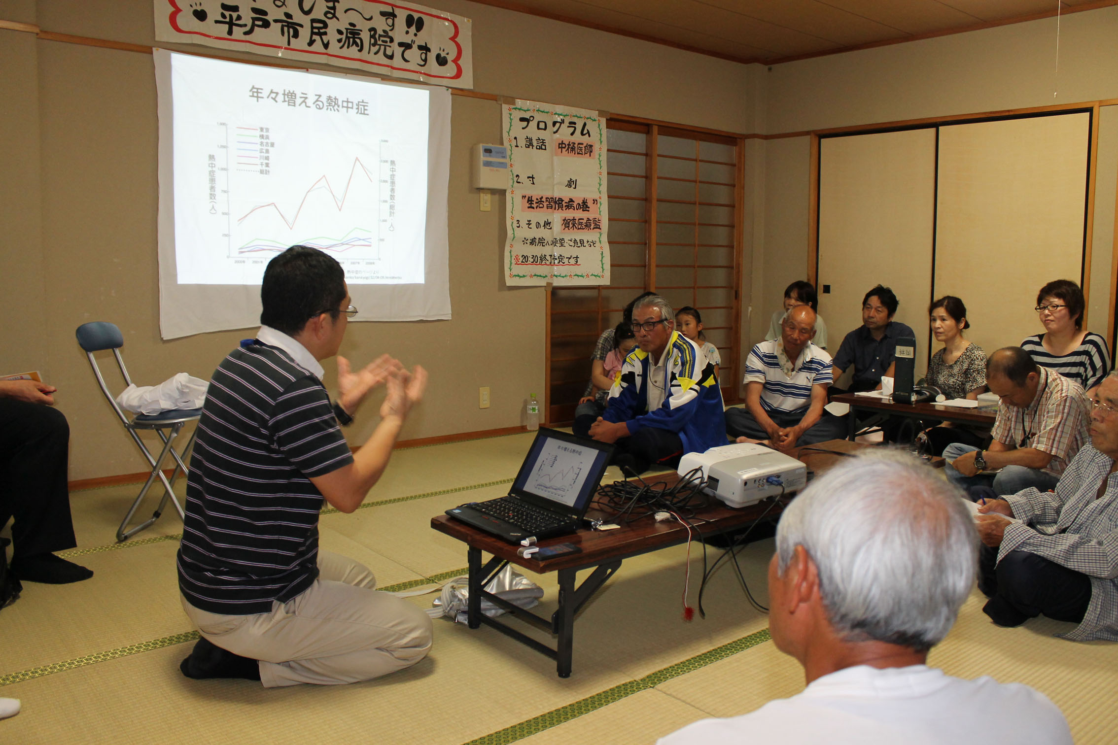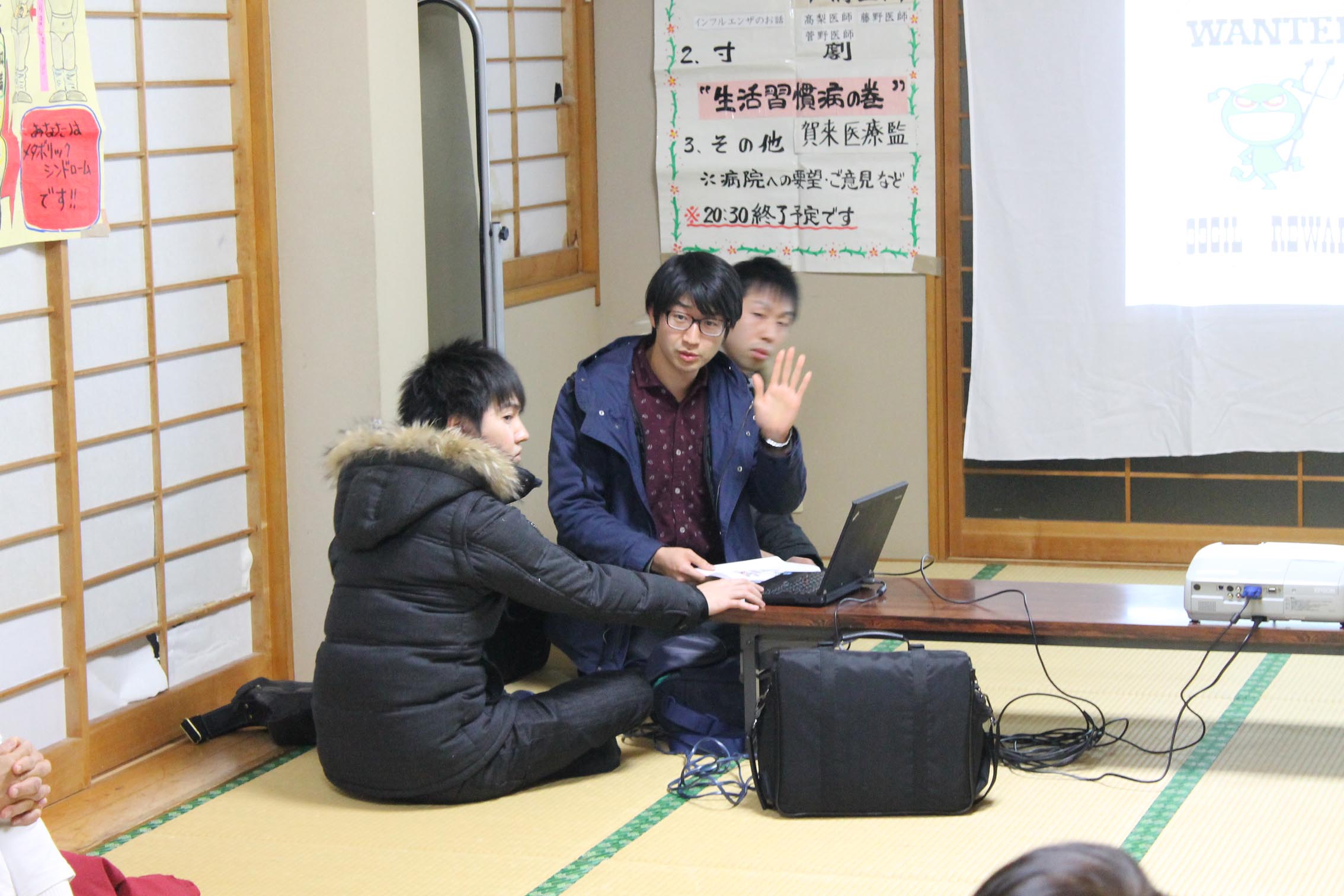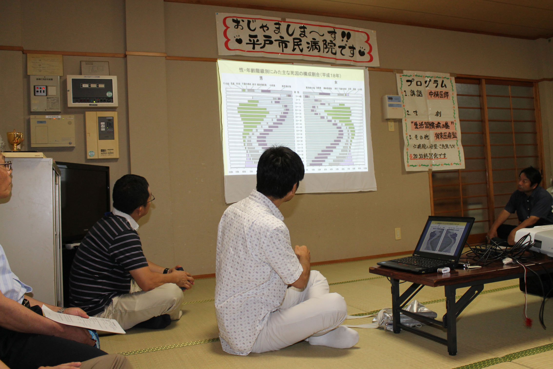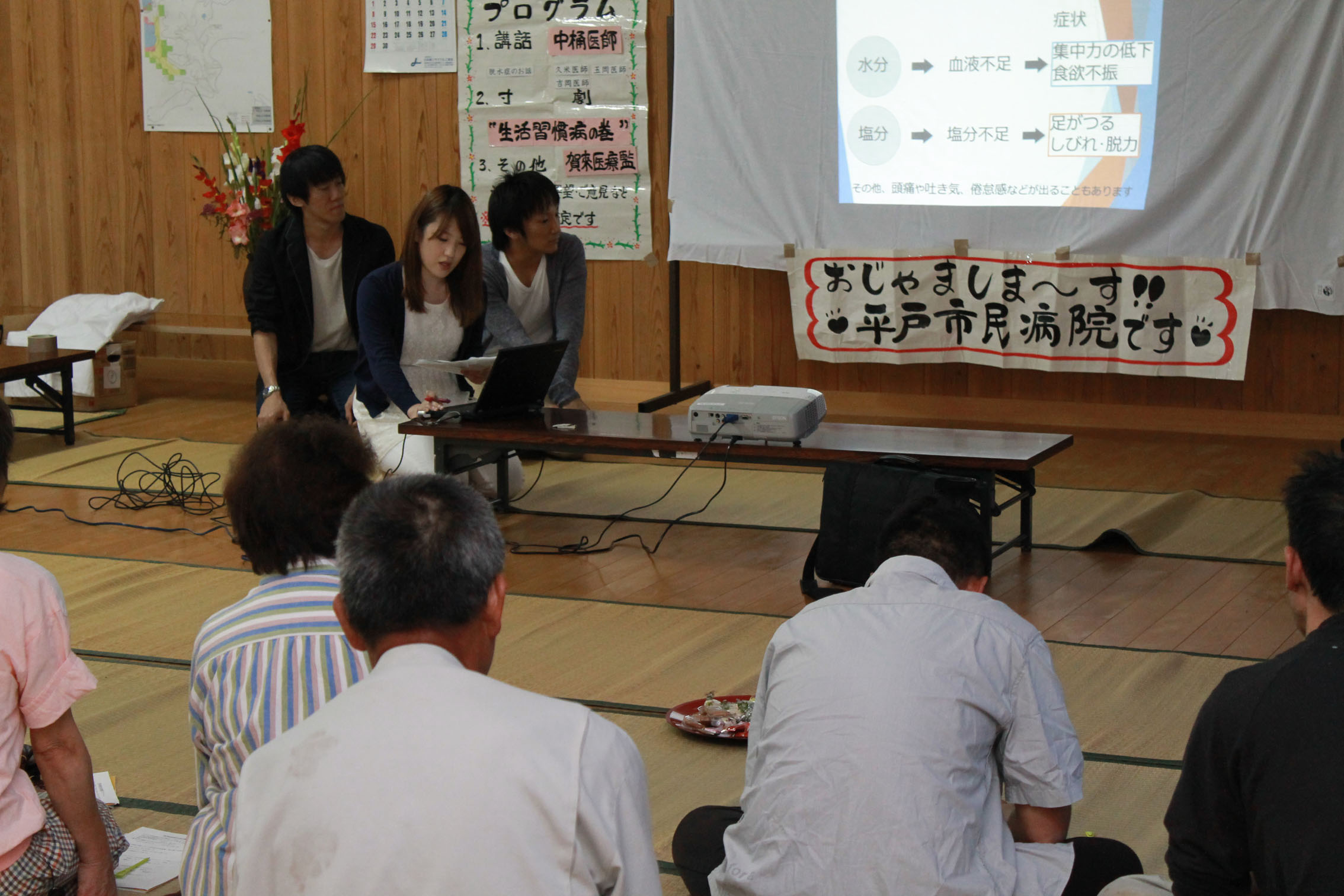 プログラム1は講話です。中桶先生の血圧のお話に引き続き、研修医の先生方によるインフルエンザの講話です。3人交代で予防や対策についても話されました。住民さんもメモをとりながら聞き入っていたようです。
