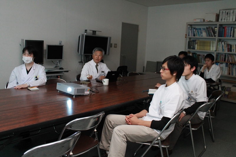 高梨先生の放射線科実習の様子です。普段、オーダした後は触れることがありませんでしたが、実際に体験したことで知ることができました。夕刻には中桶先生とのカンファで藤野先生が症例を話されている様子です。