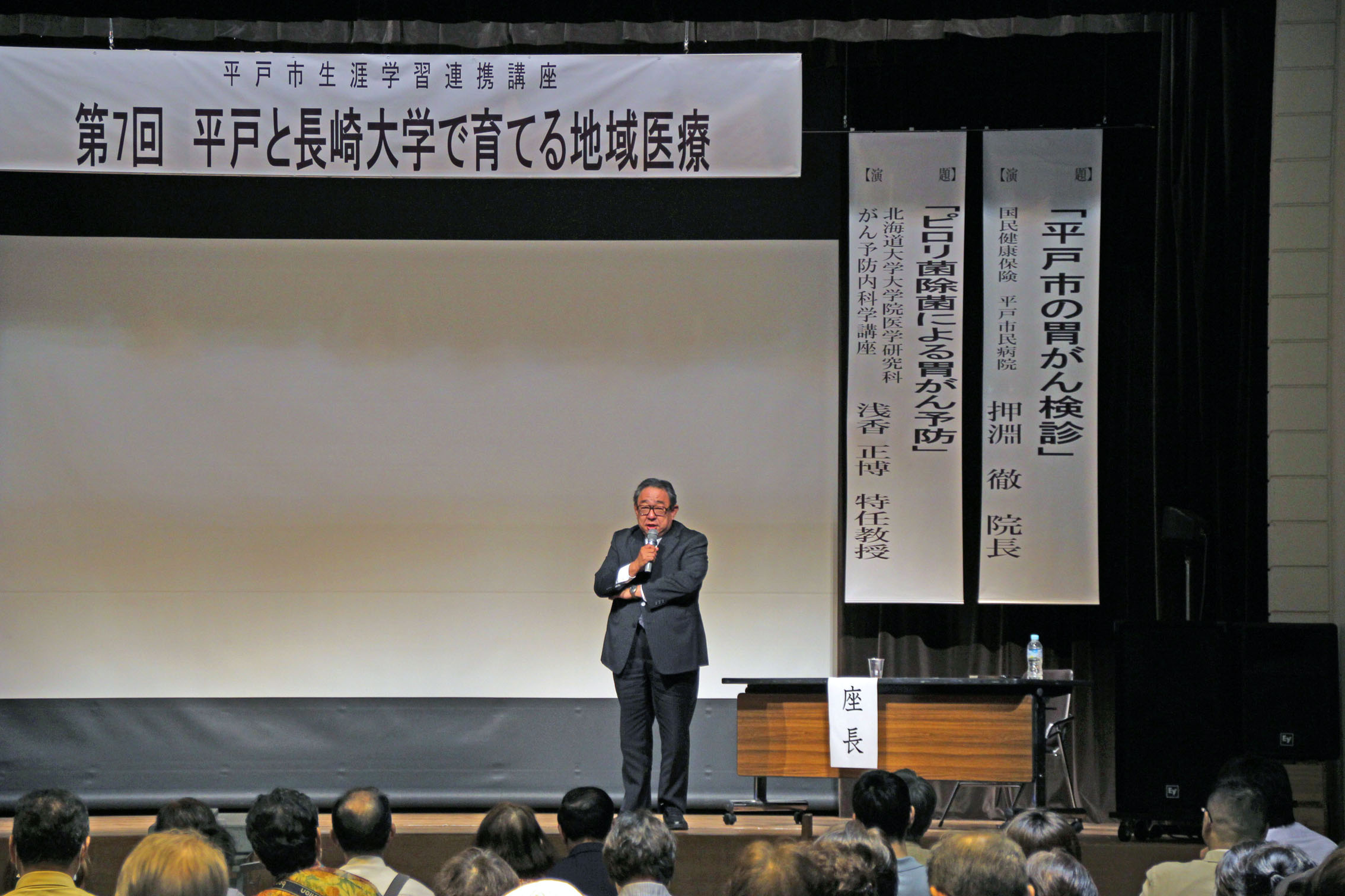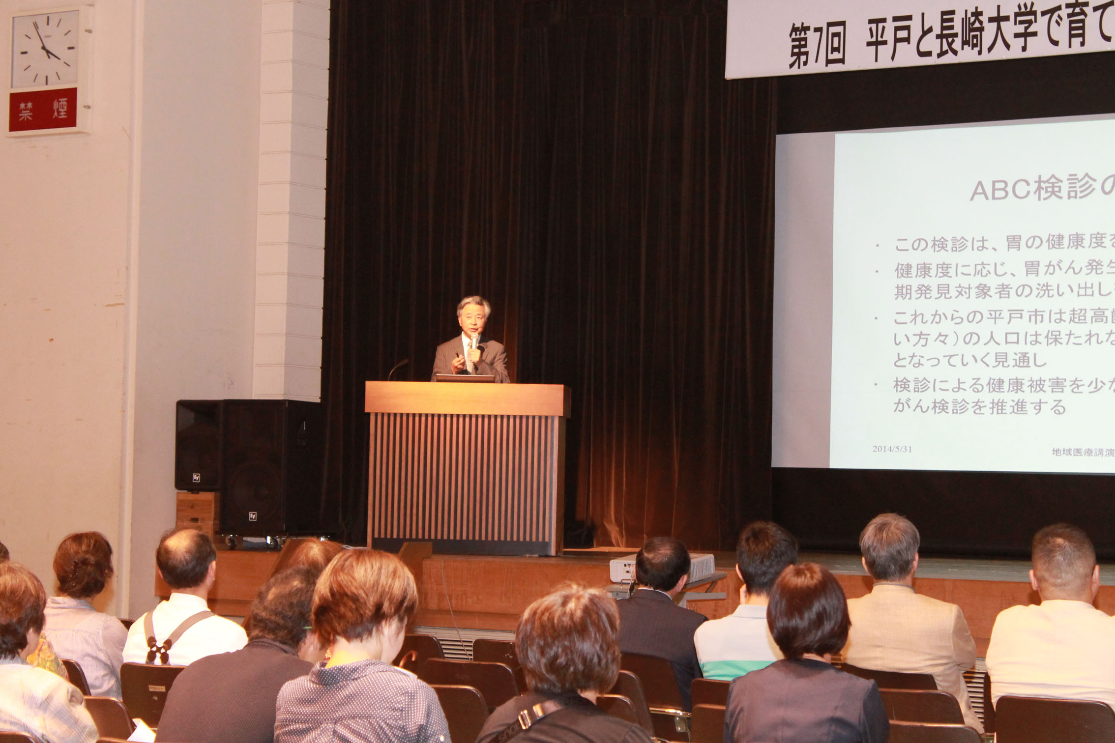 今日の医学ゼミは平戸市民病院の押淵院長による、地域包括医療ケアの講義です。地域包括医療ケアとは?医療と予防、福祉、介護が連携するとどのような効果が生まれるのか。先生の経験や県内のデータや元気老人創出の解説です。