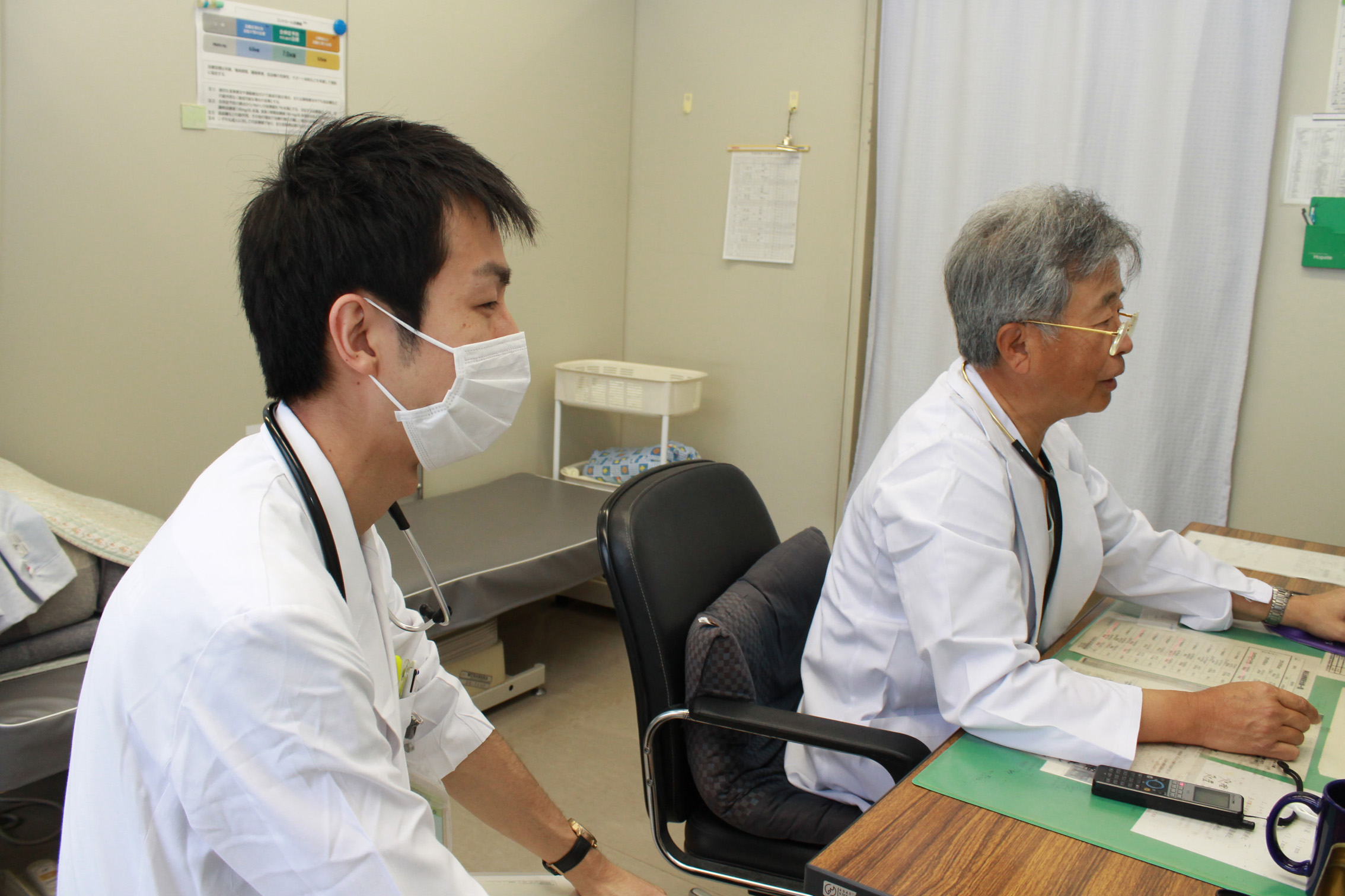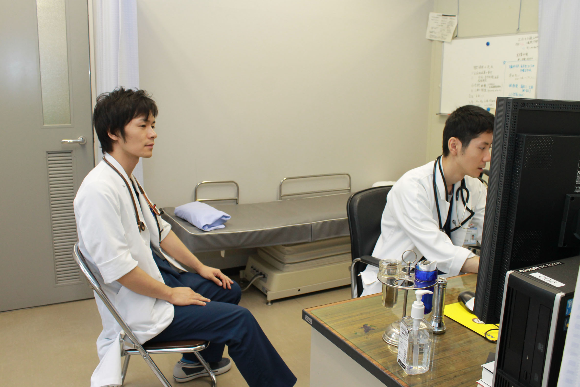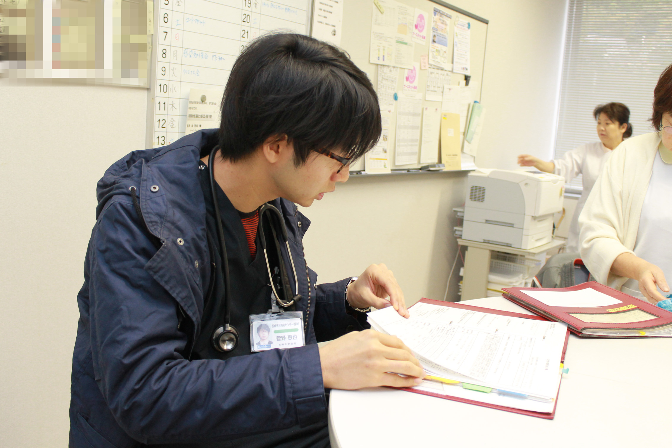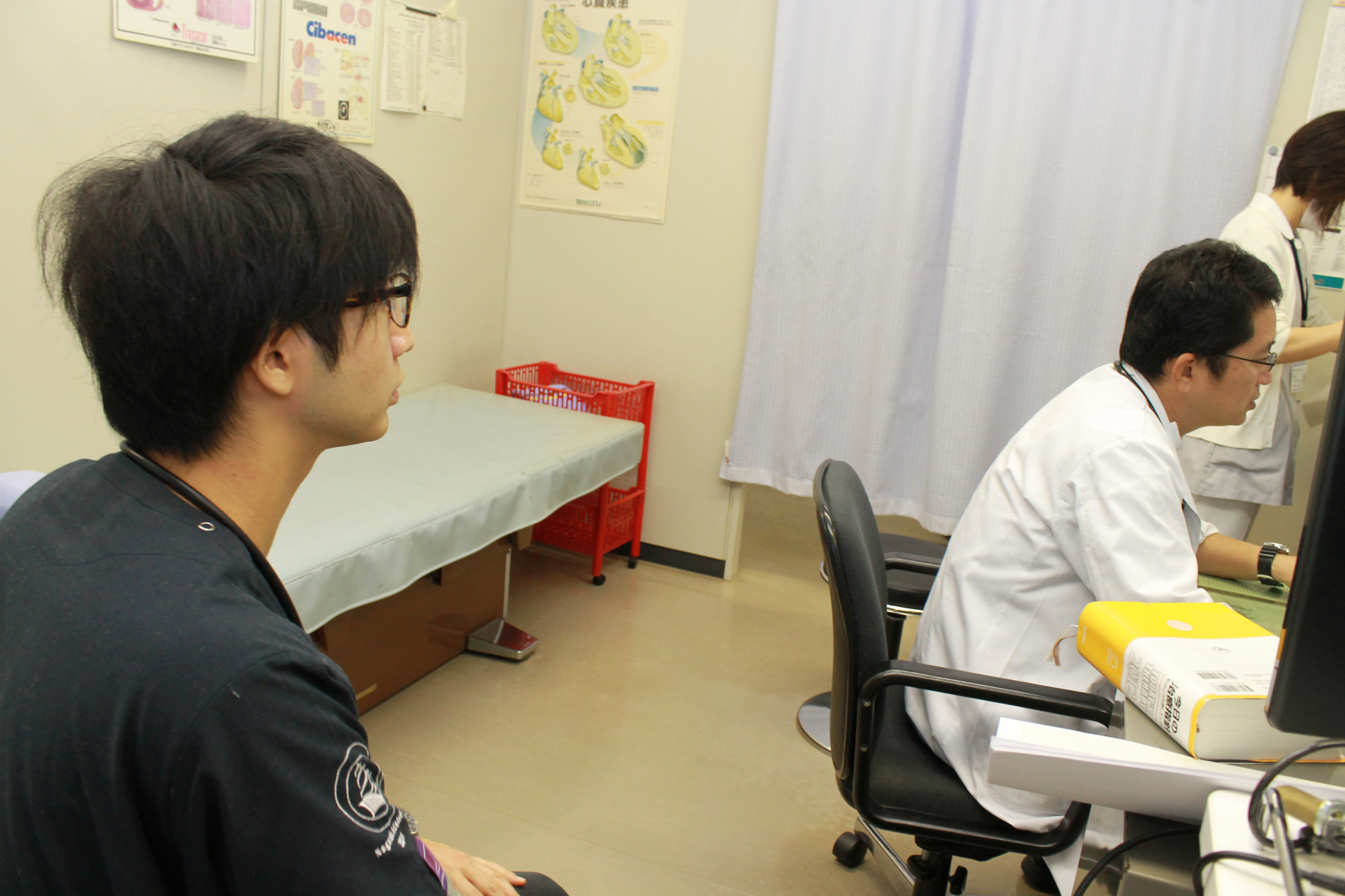 朝の事業所健診を終えて、菅野先生は訪問看護に行きました。患者さんとの距離が近く、コミュニケーションをとりながら様態を伺うことを学びました。菅野先生は押淵院長との外来です。外来のことだけではなく「チーム医療」についても教えていただきました。?梨先生は新患外来です。(写真には写っていませんが)中桶先生と一緒に取り組みました。