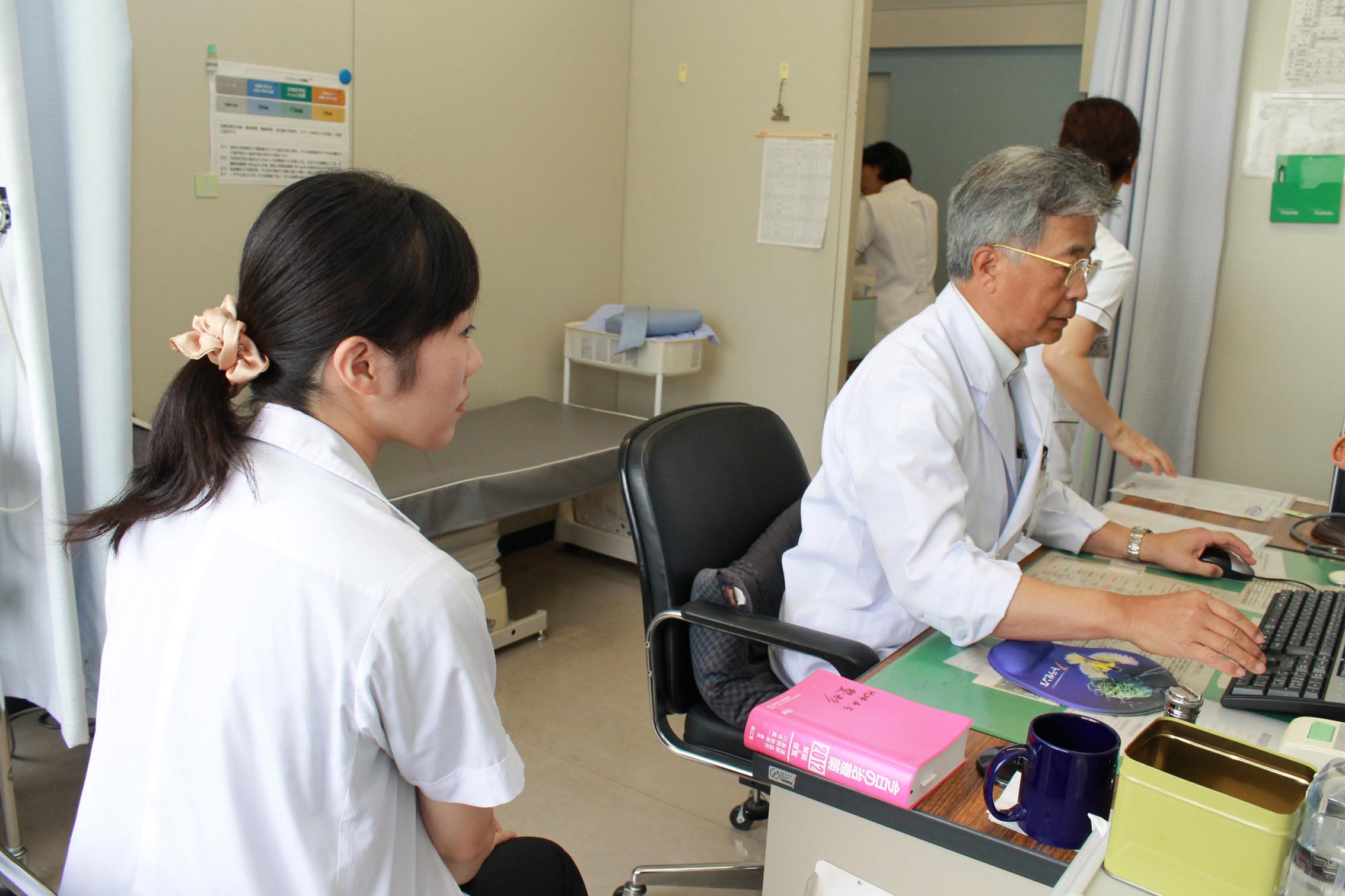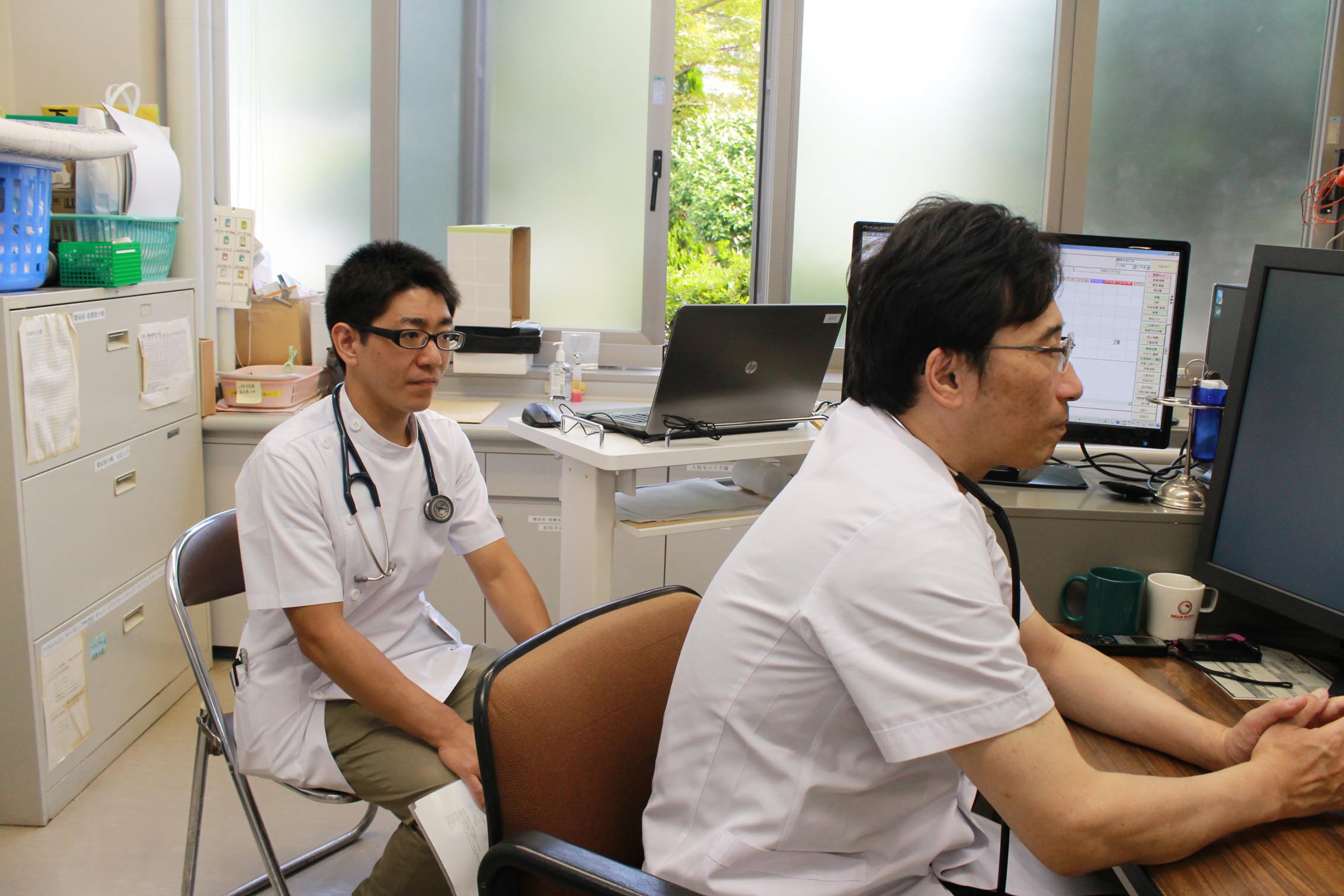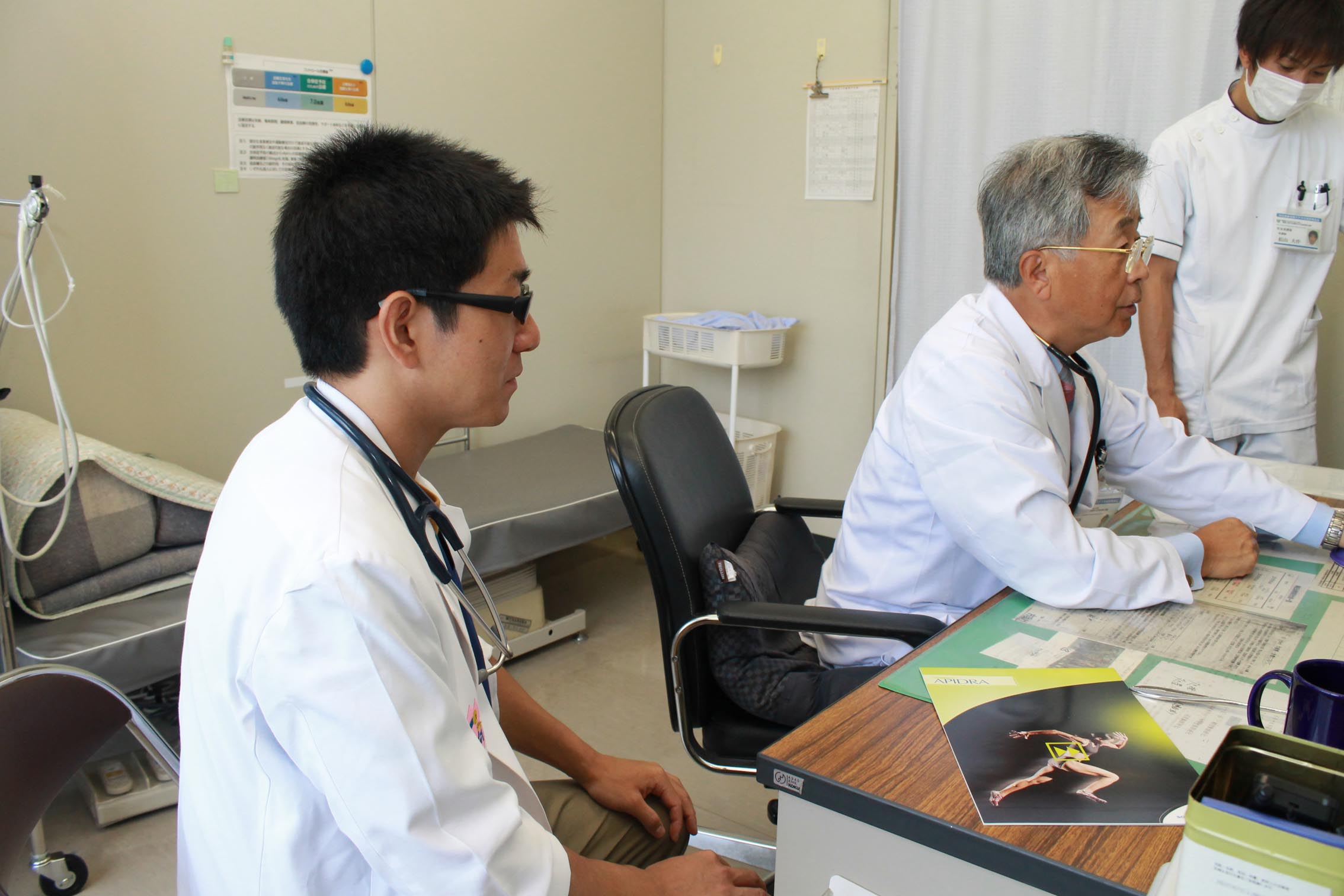 朝の事業所健診を終えて、菅野先生は訪問看護に行きました。患者さんとの距離が近く、コミュニケーションをとりながら様態を伺うことを学びました。菅野先生は押淵院長との外来です。外来のことだけではなく「チーム医療」についても教えていただきました。?梨先生は新患外来です。(写真には写っていませんが)中桶先生と一緒に取り組みました。