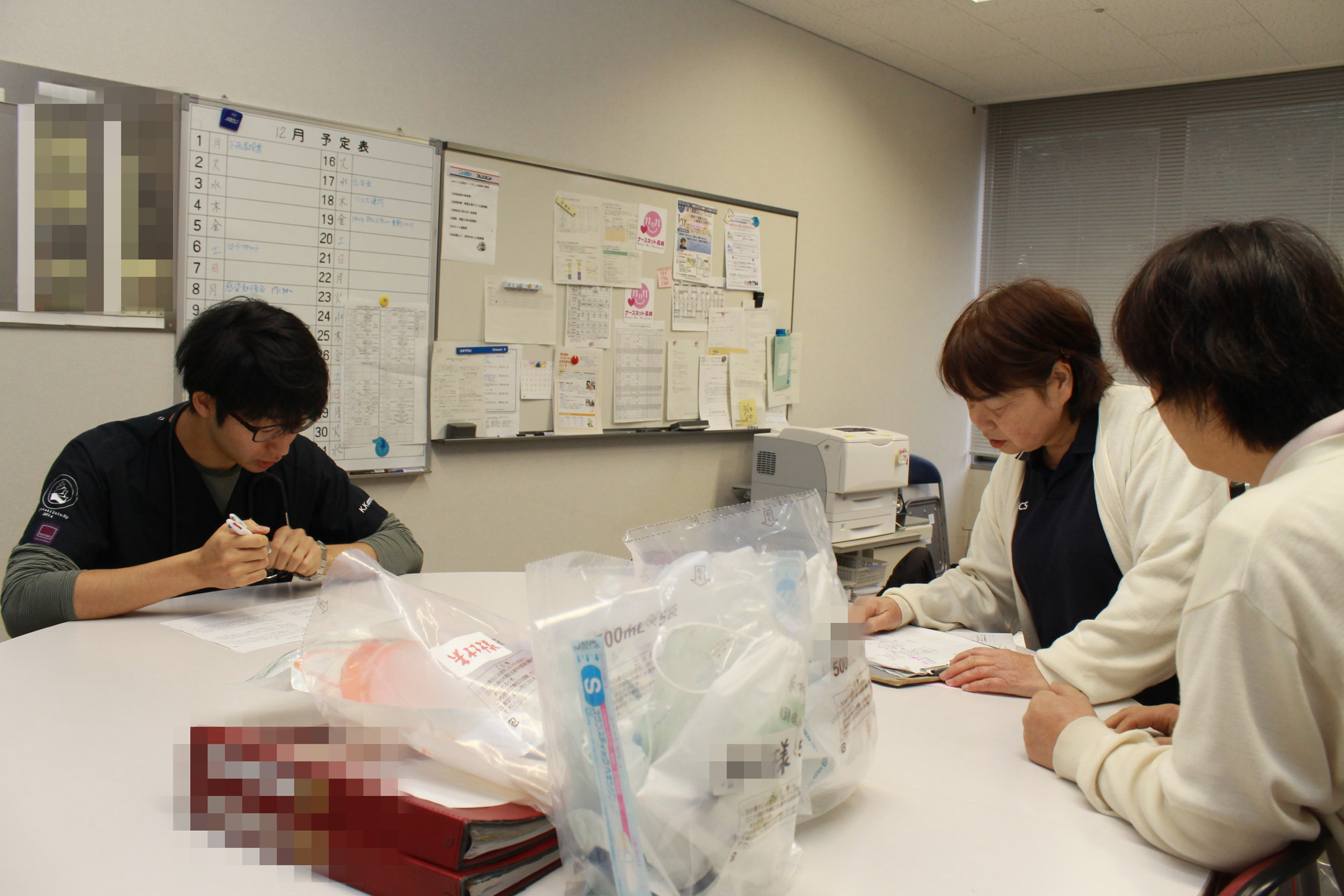 午後からは、?梨先生と藤野先生は賀来先生との訪問診療です。訪問カンファで患者さんの様態など詳しく看護師さんに伺い把握して出発です。菅野先生は検査科実習。
