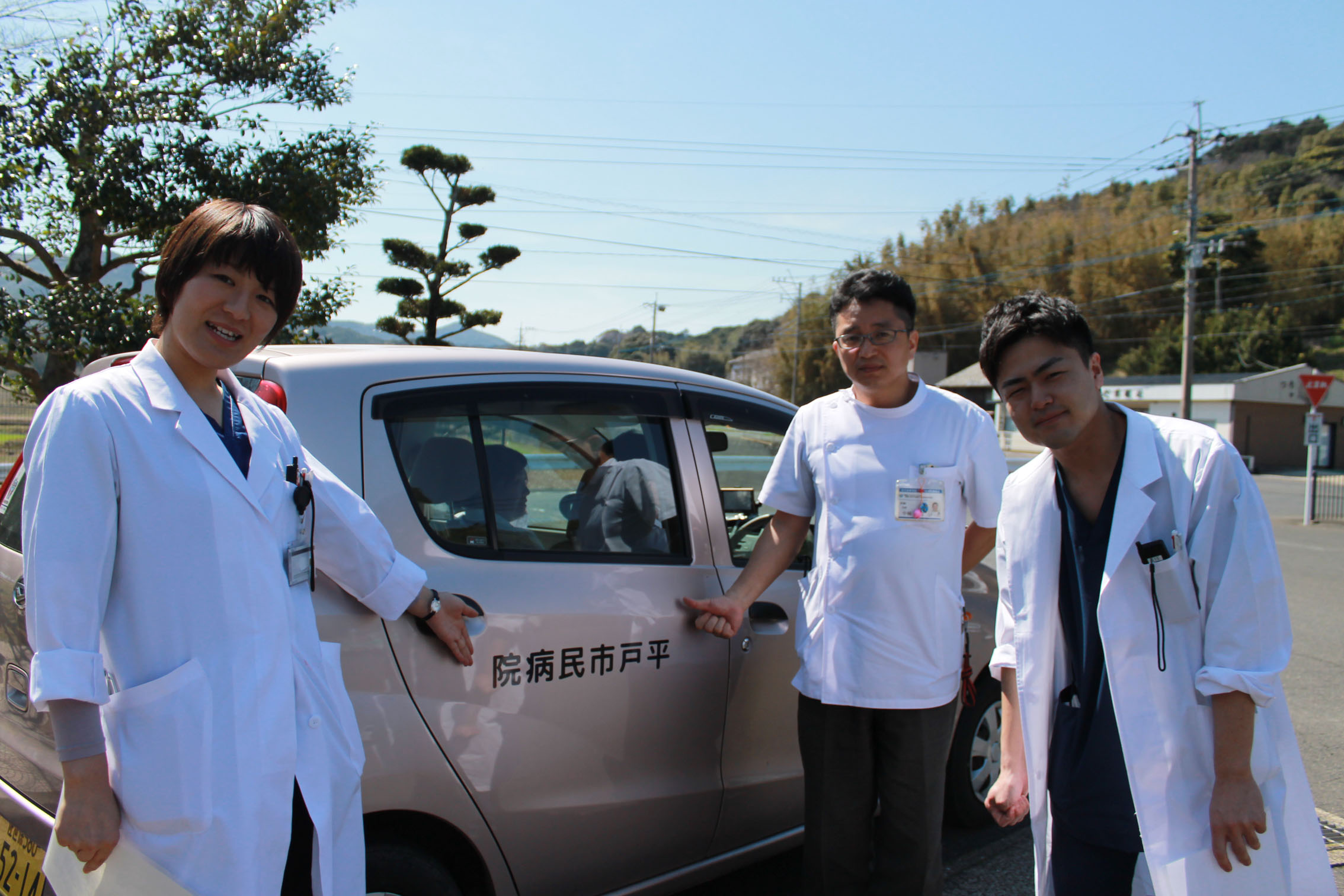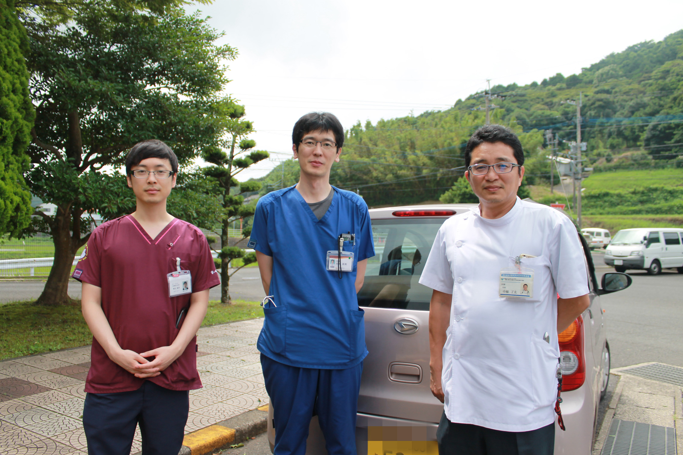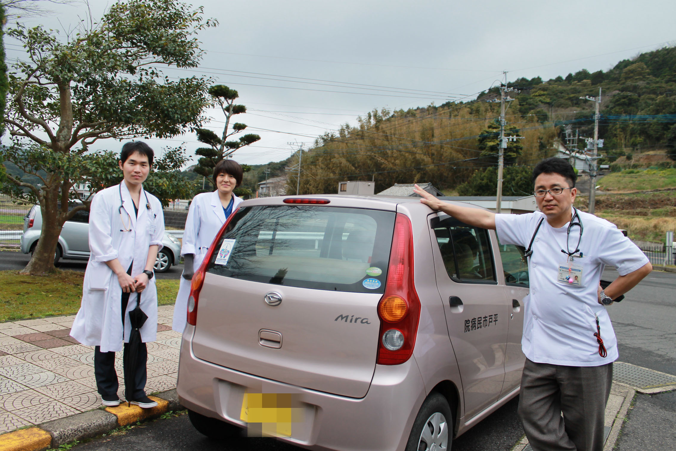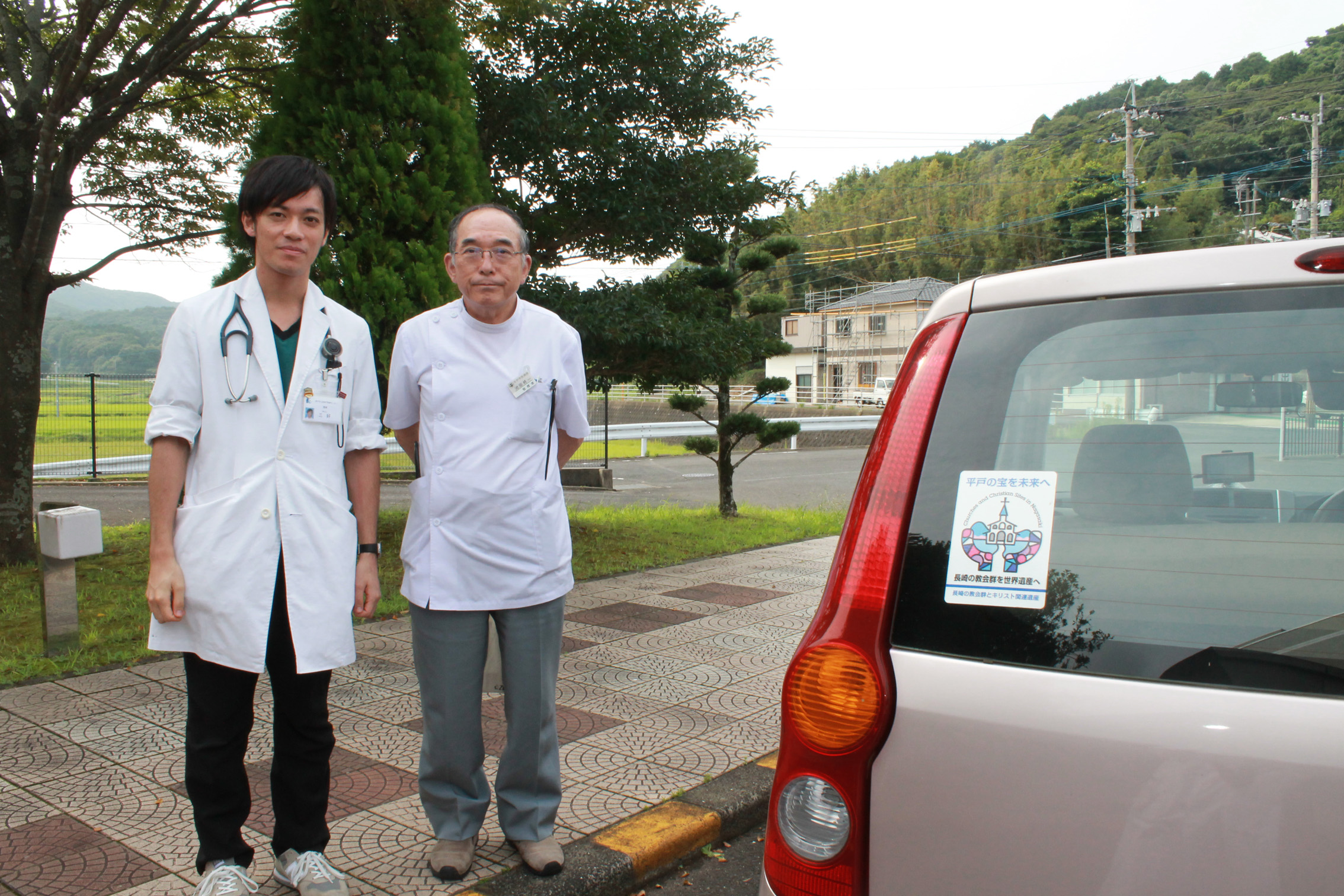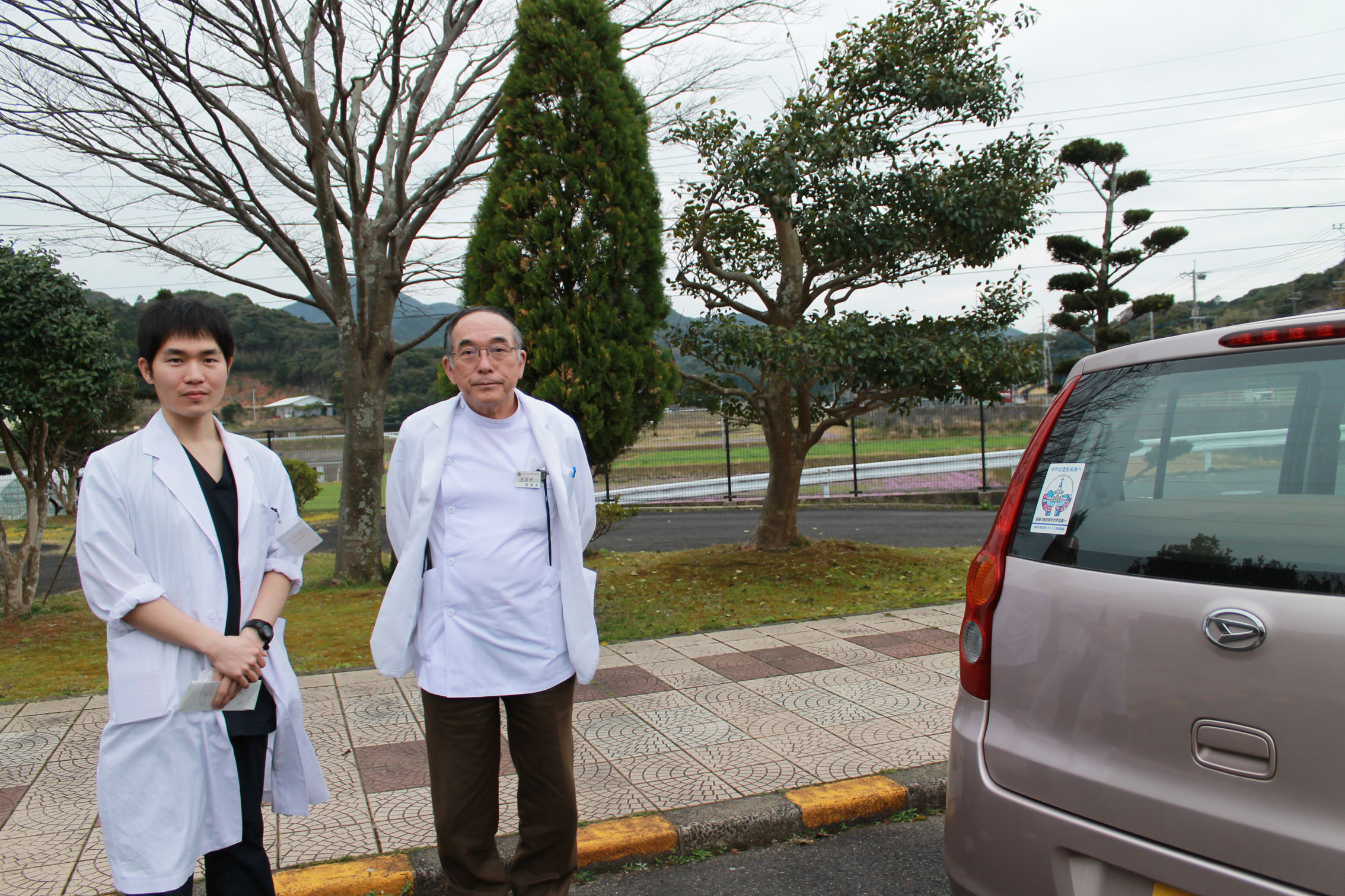 横浜労災病院より菅原先生と日生病院より守口先生です。平戸の自然に囲まれて中桶先生と訪問診療に出発のショットです。