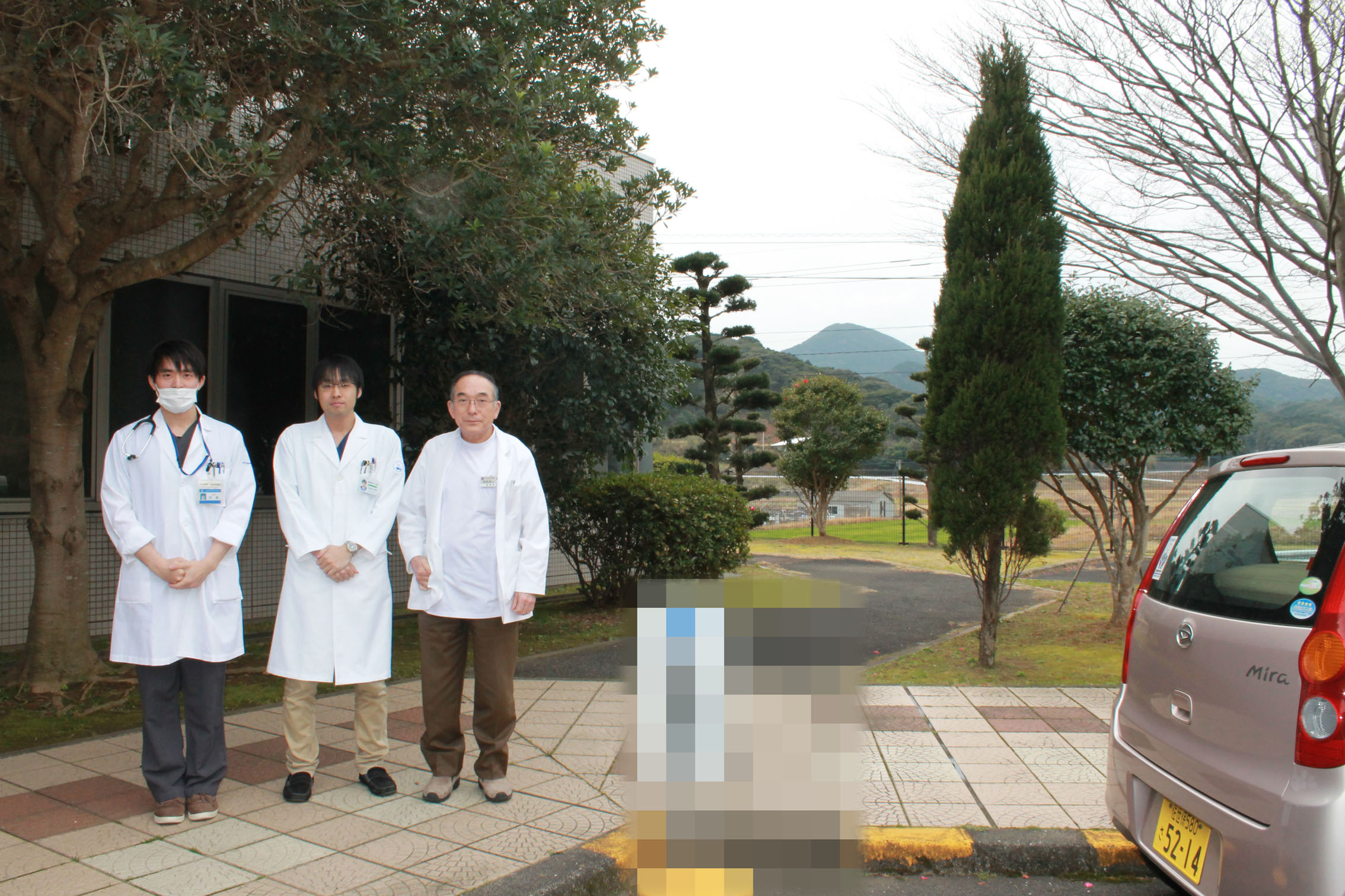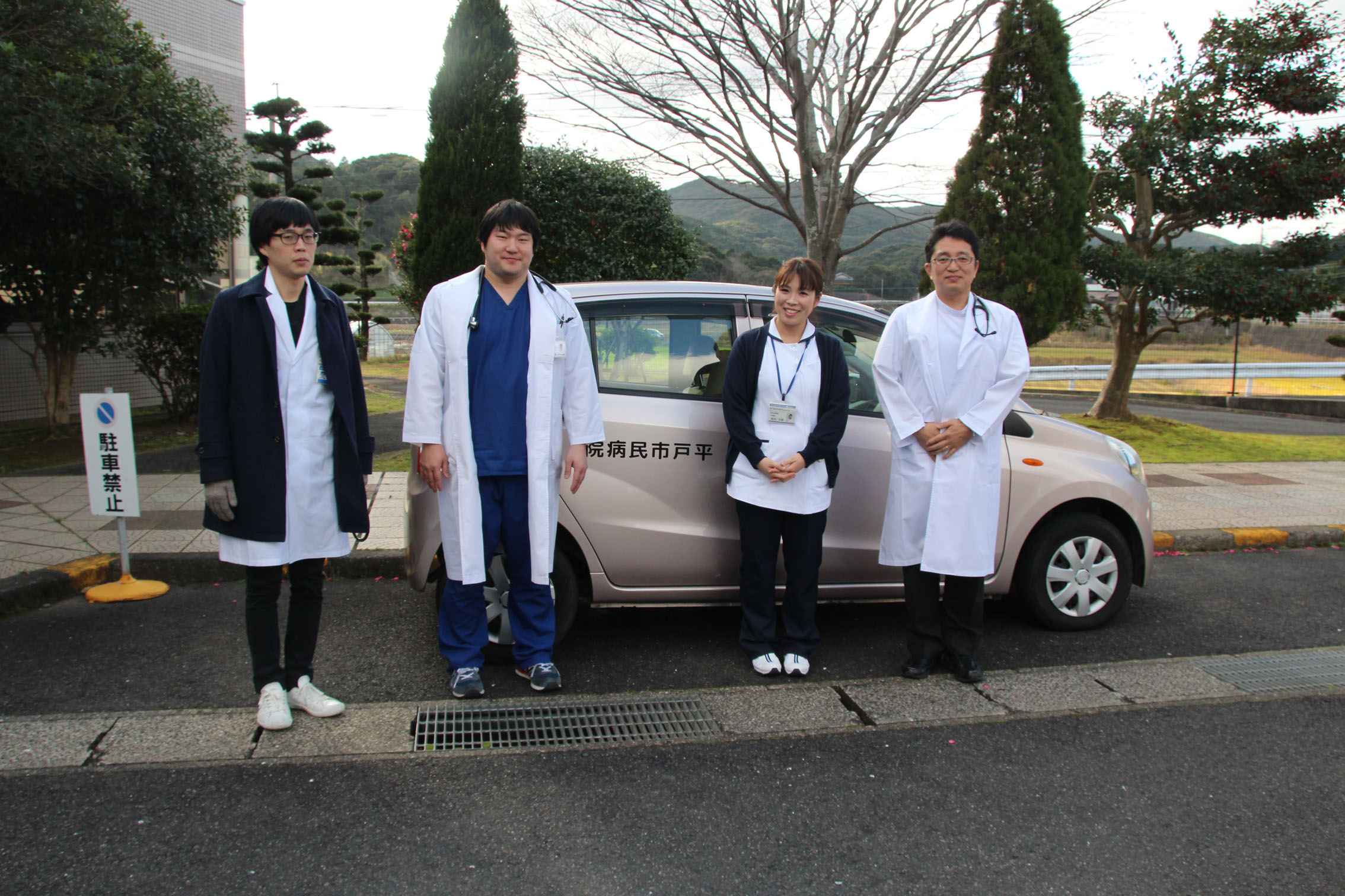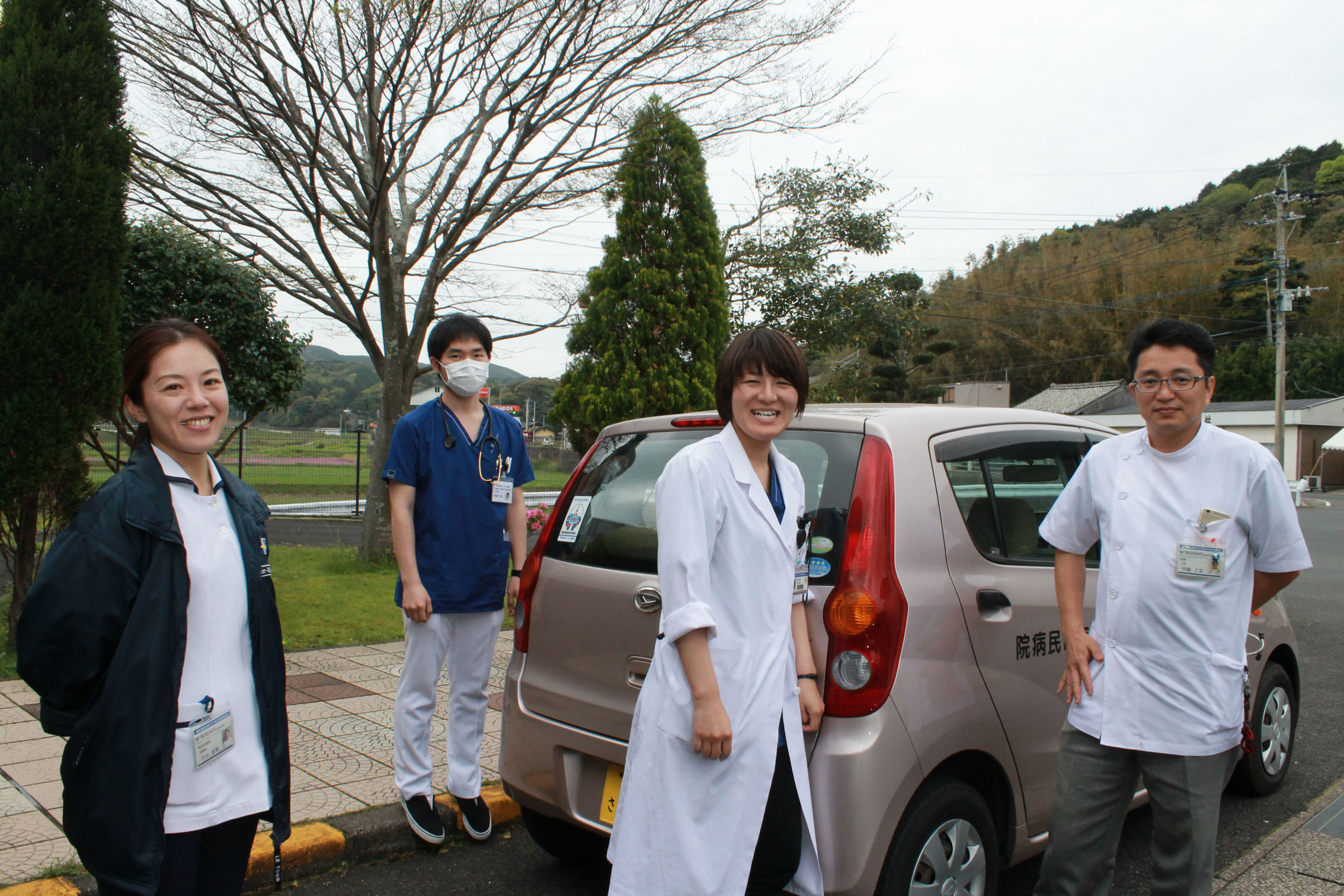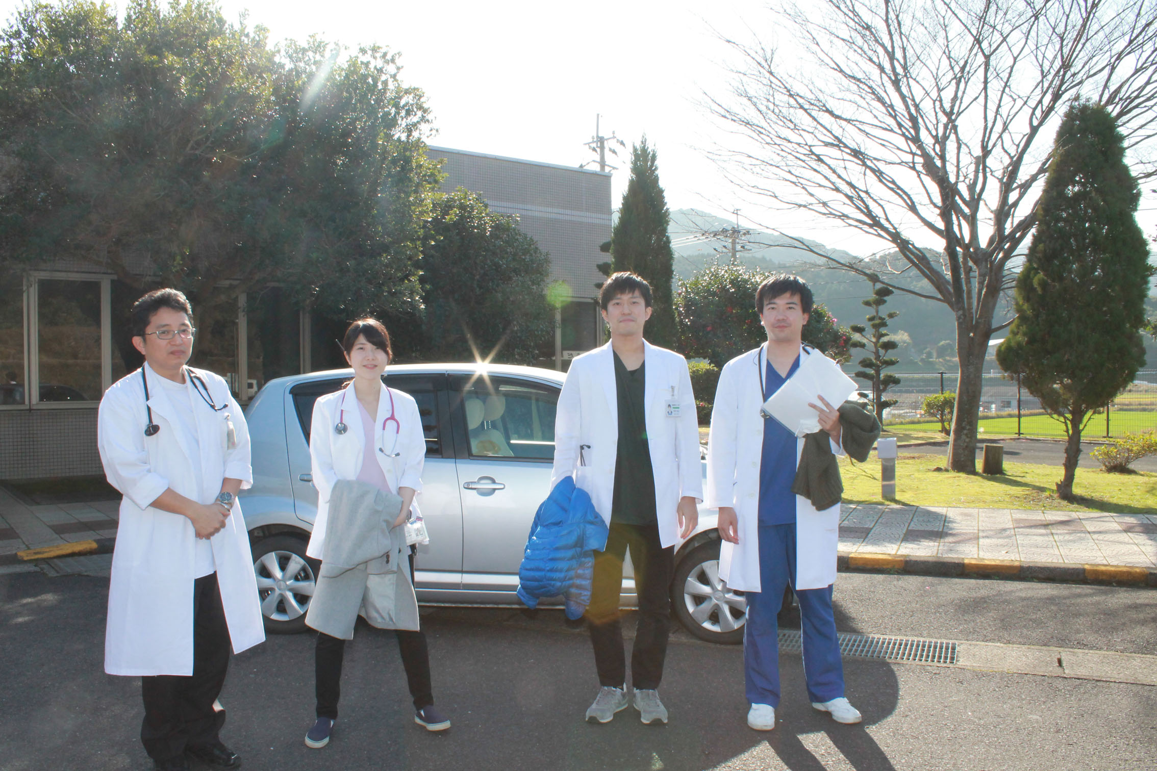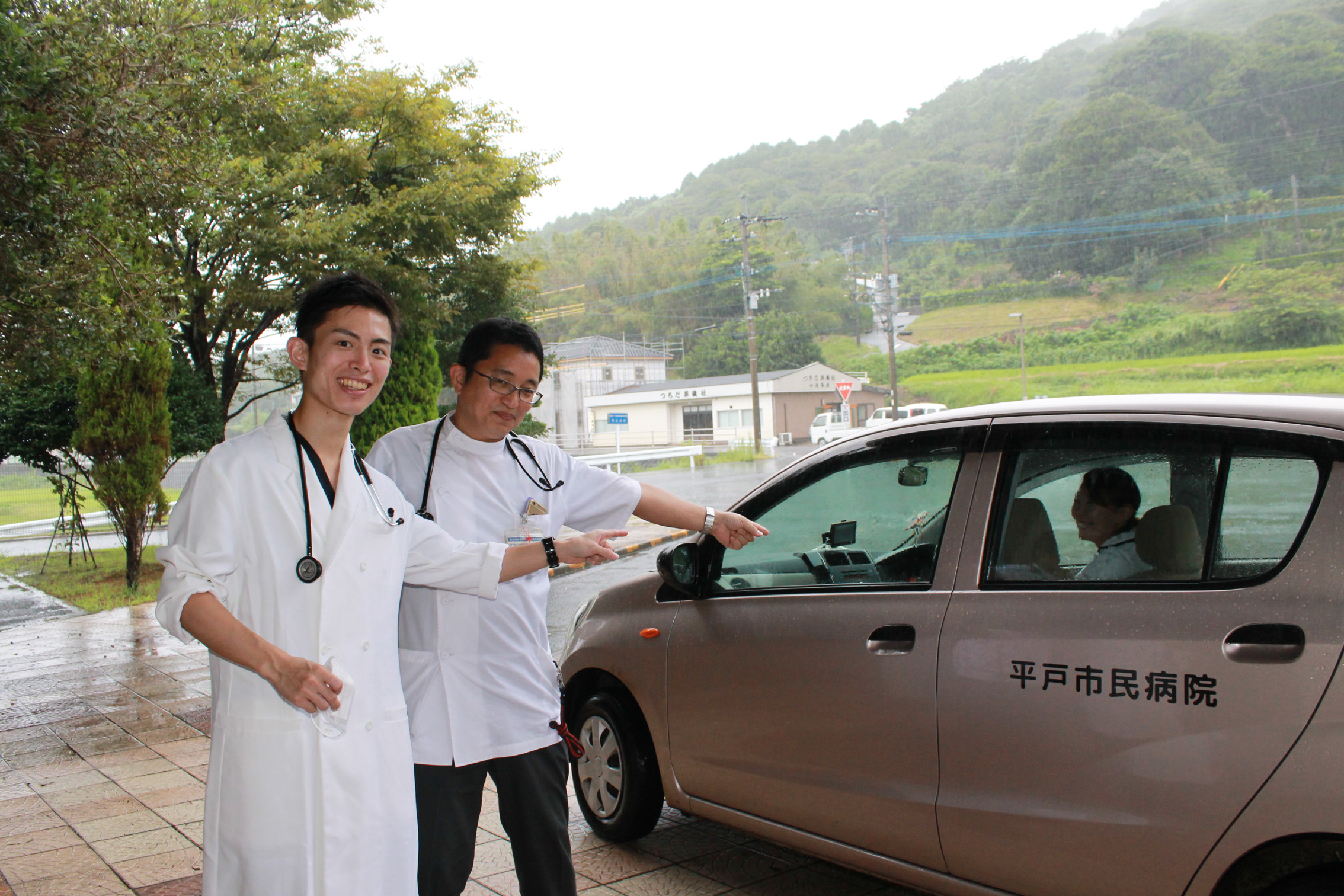 横浜労災病院より菅原先生と日生病院より守口先生です。平戸の自然に囲まれて中桶先生と訪問診療に出発のショットです。