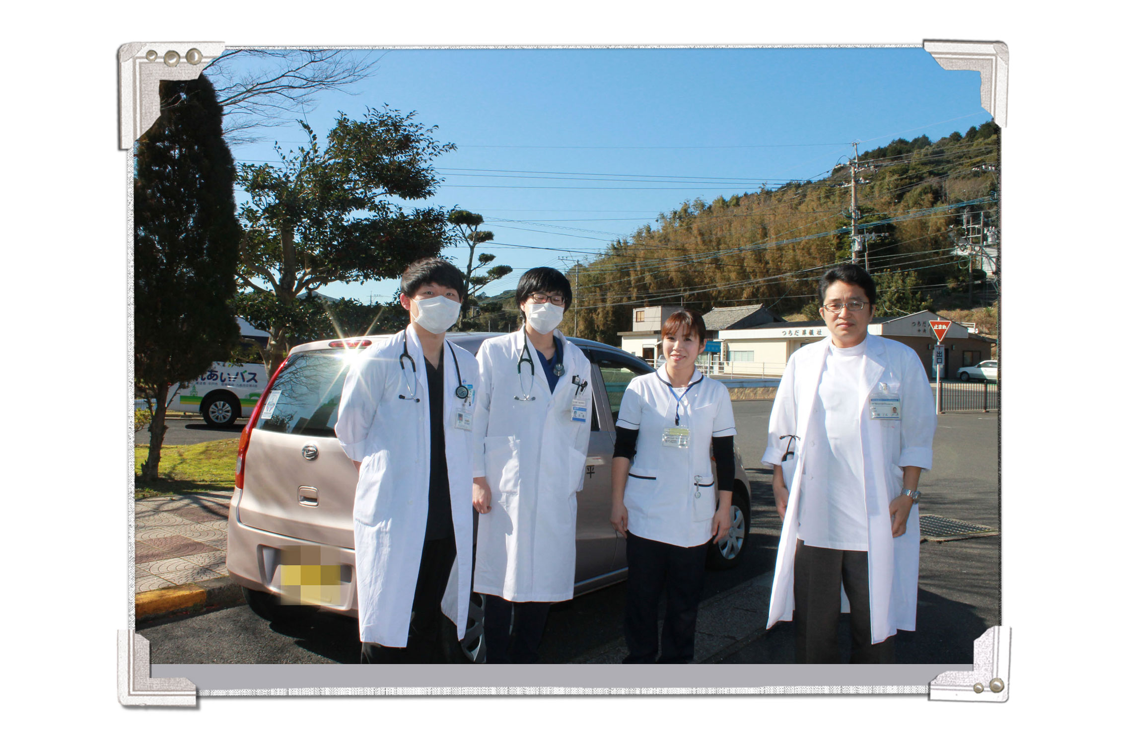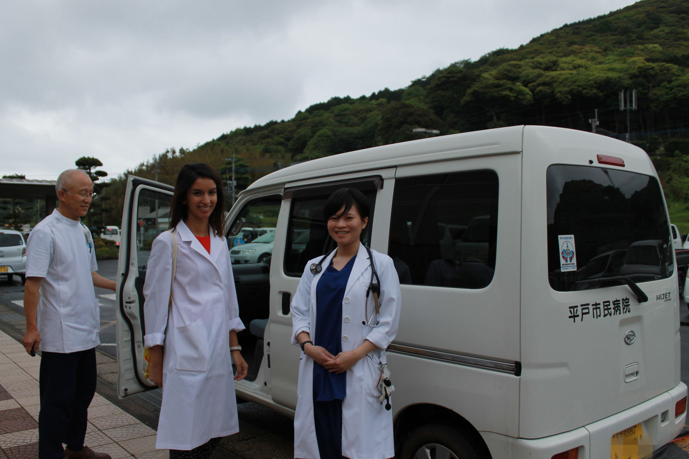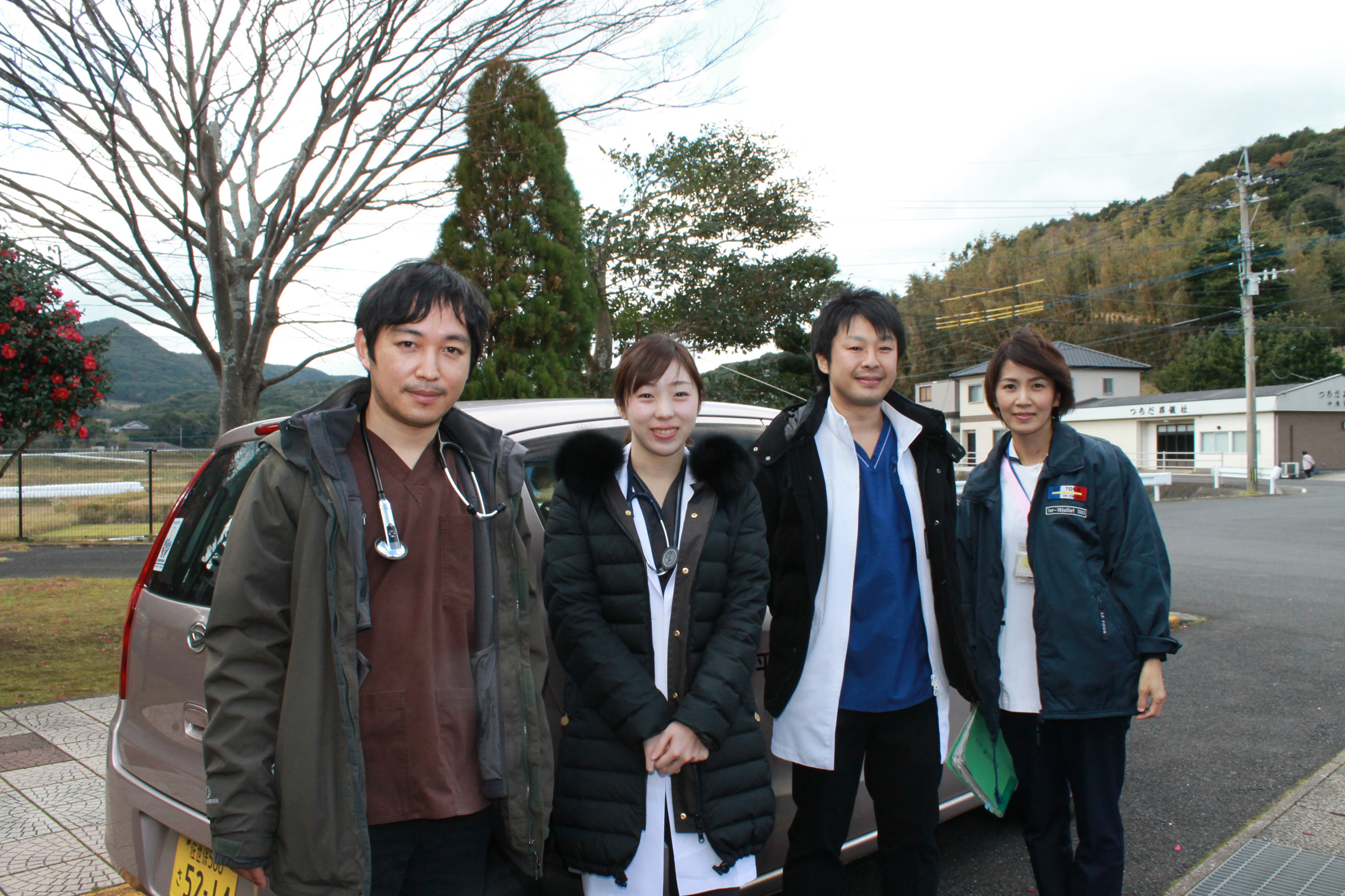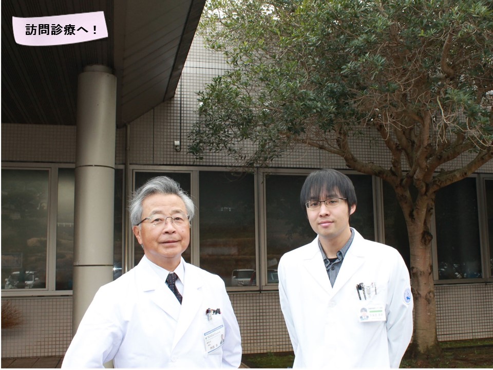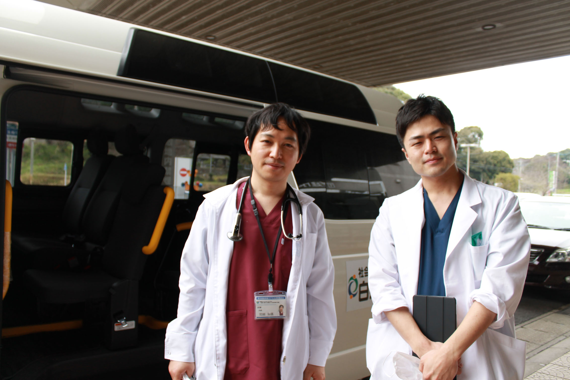 横浜労災病院より菅原先生と日生病院より守口先生です。平戸の自然に囲まれて中桶先生と訪問診療に出発のショットです。