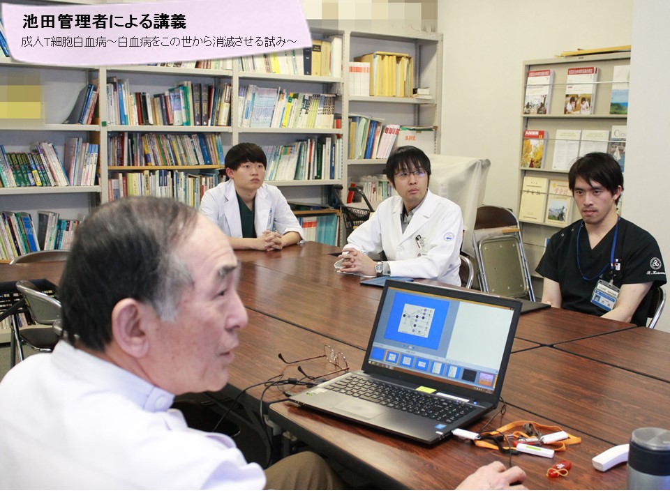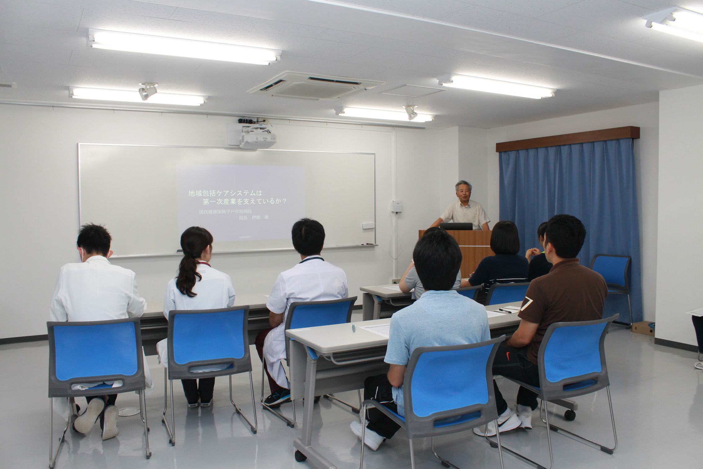 押淵院長の講義。毎月、臨床研修制度と平戸市における地域包括医療・ケアの取り組みについてお話されています。今月は統合ケア実習に来られている学生さんと一緒に研修医の先生方も受講されました。押淵院長の30年来の取り組み、市民の健康づくり、予防保健事業の一つである健診。毎朝、2ブースにわかれて事業所健診が行われています。中には取り組みの成果でもある「元気老人」となる高齢者も健診に来られています。60歳を過ぎても元気にお仕事されていて、老人というには失礼なほどです☆