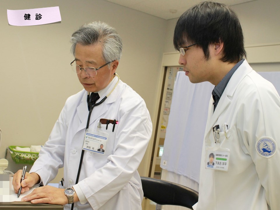 昨日と今日の研修の一部をご紹介します。研修医の先生方が毎朝の健診を終えて、放射線科実習や外来、押淵院長の講義に取り組まれている様子です。
