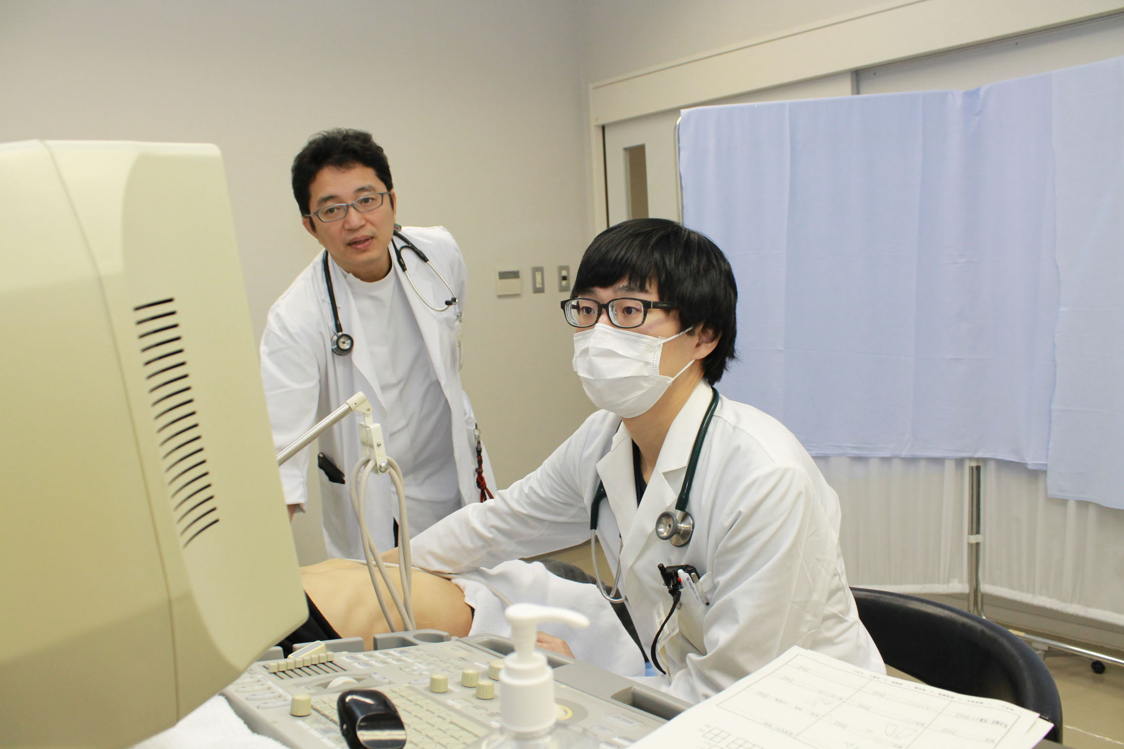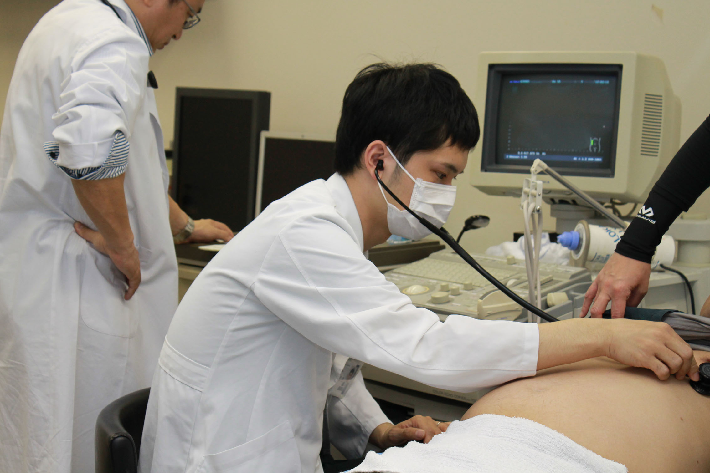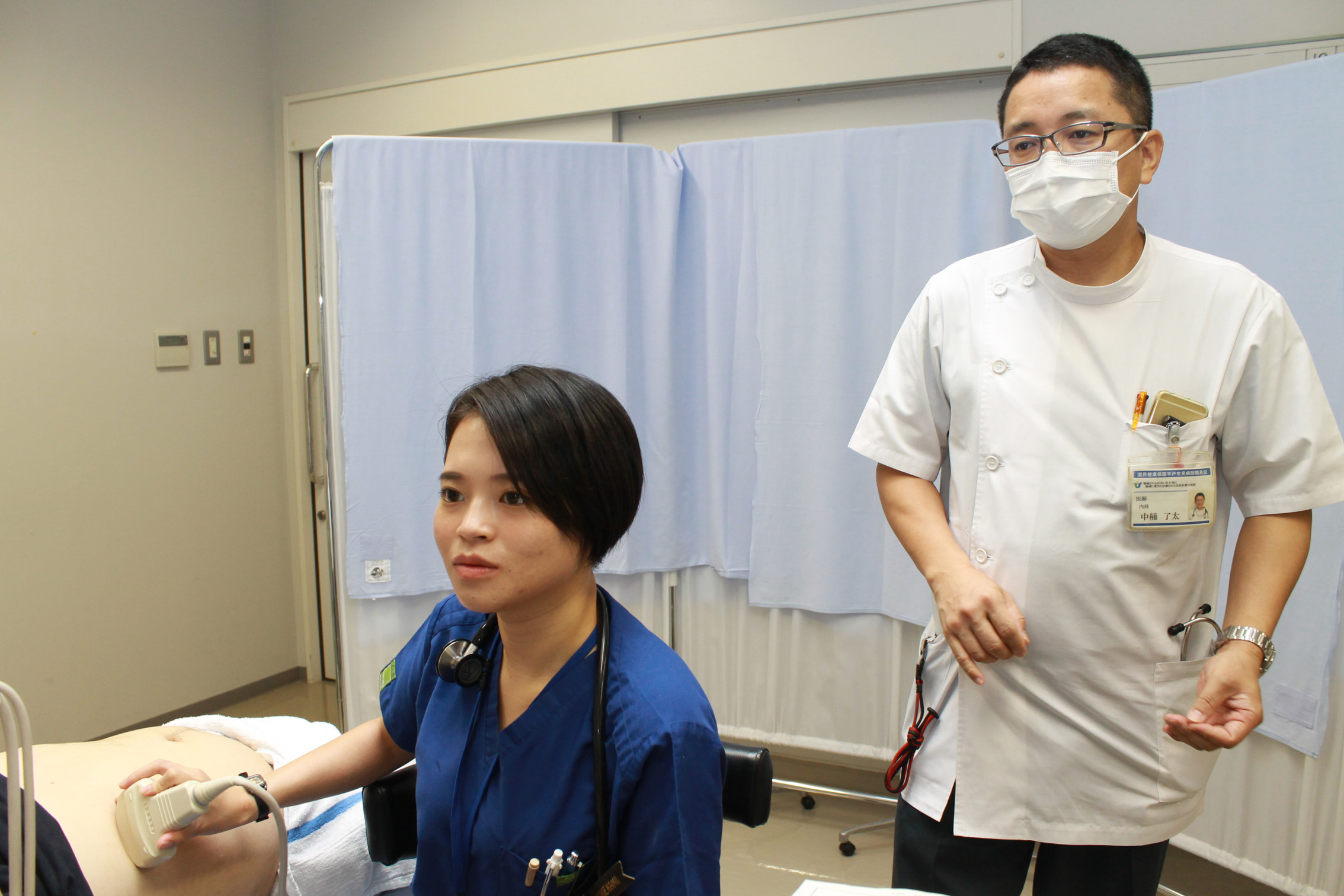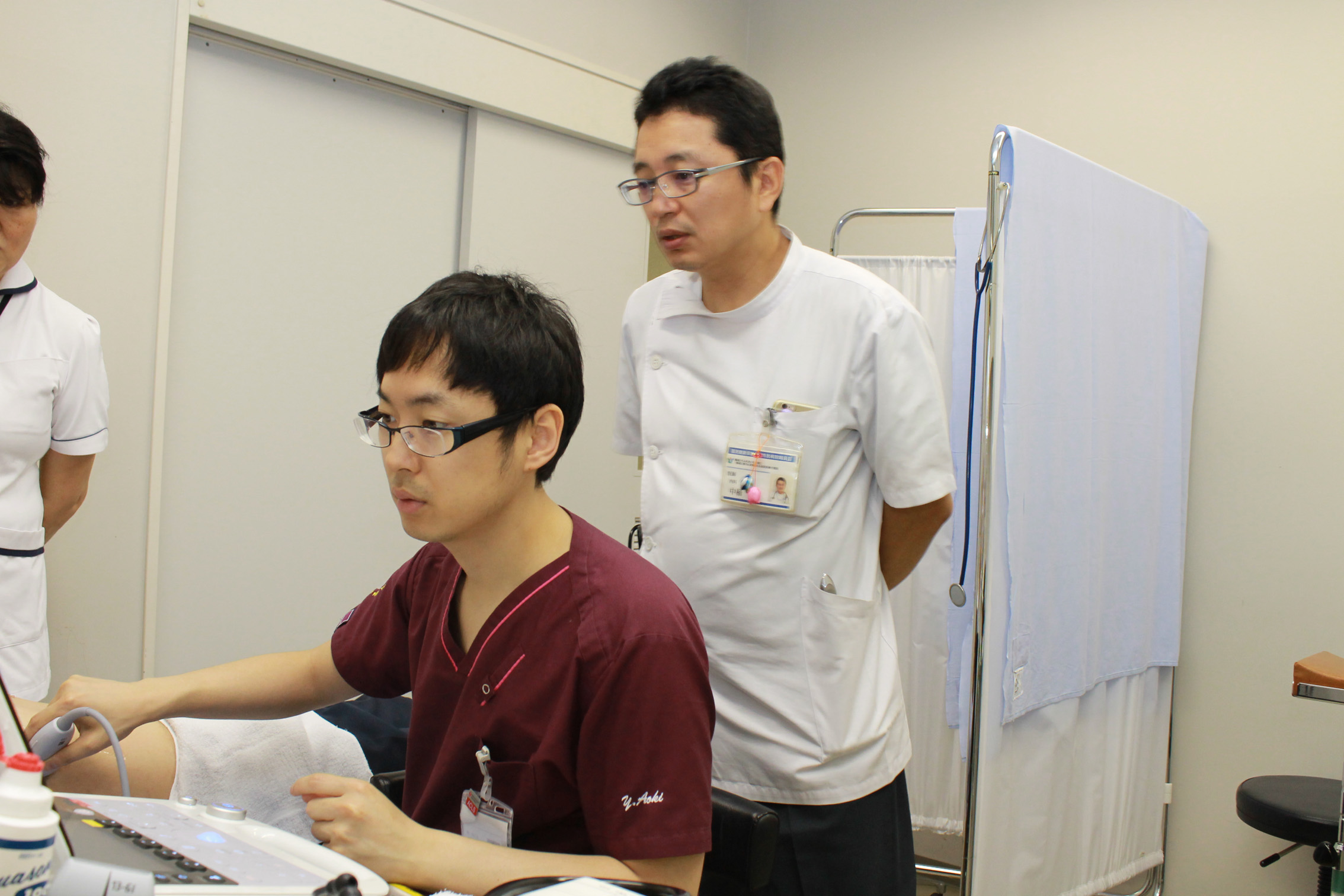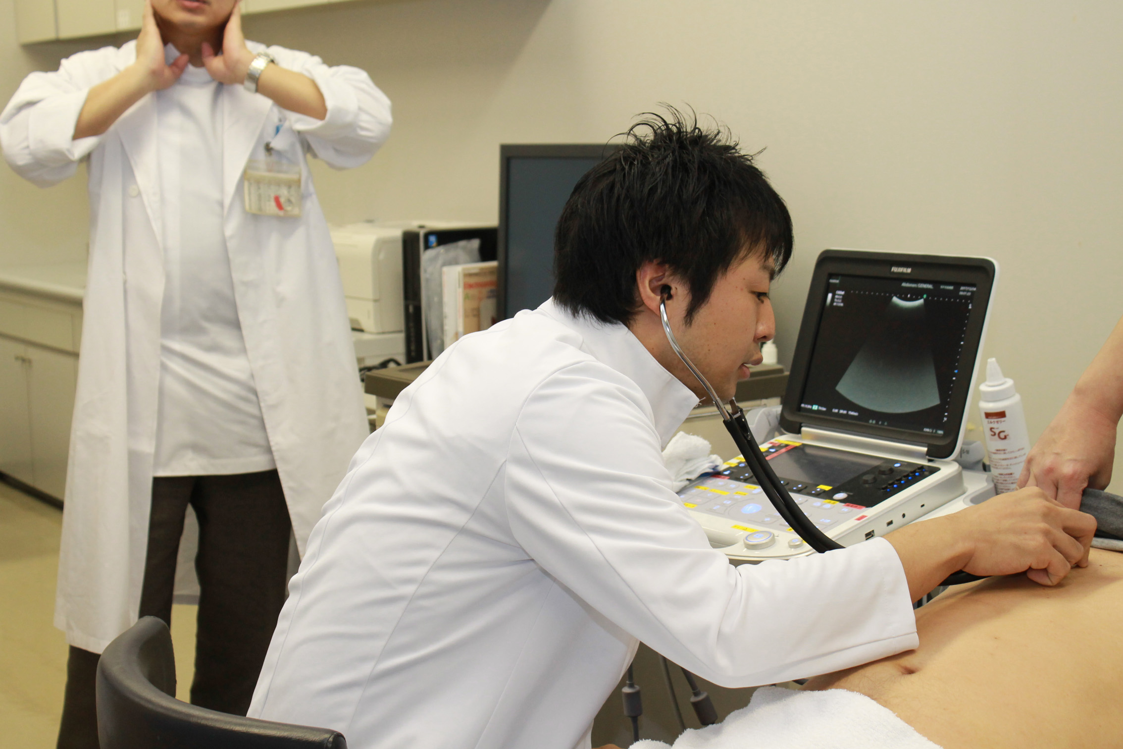外来、病棟回診を終えて講義までの数十分の間にエコーの練習をされていました。優しい木谷先生が受診者役です。