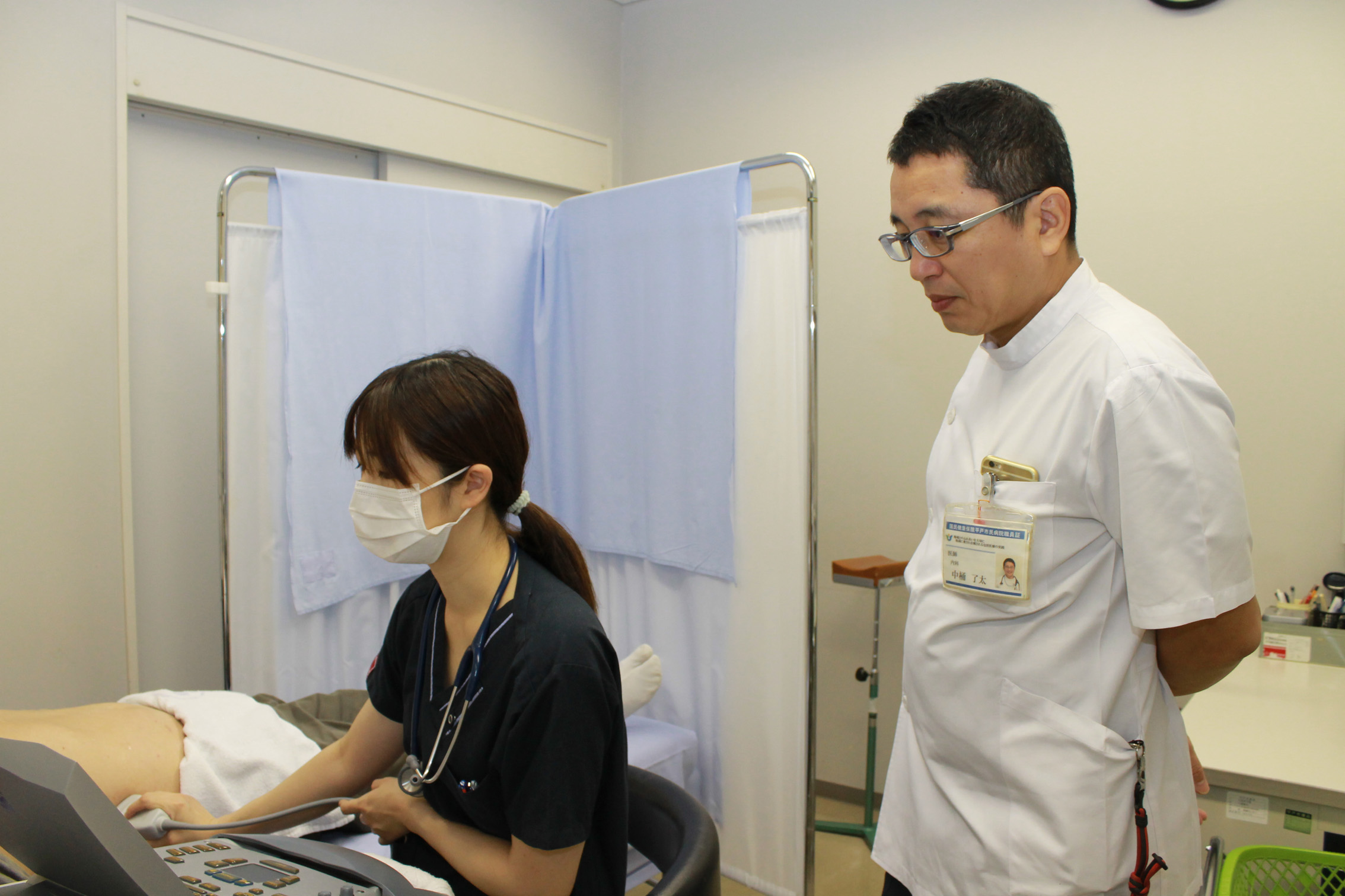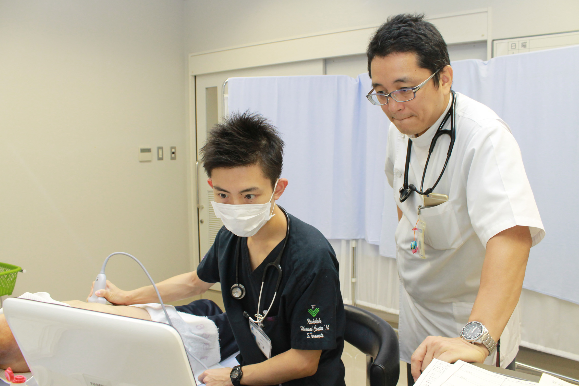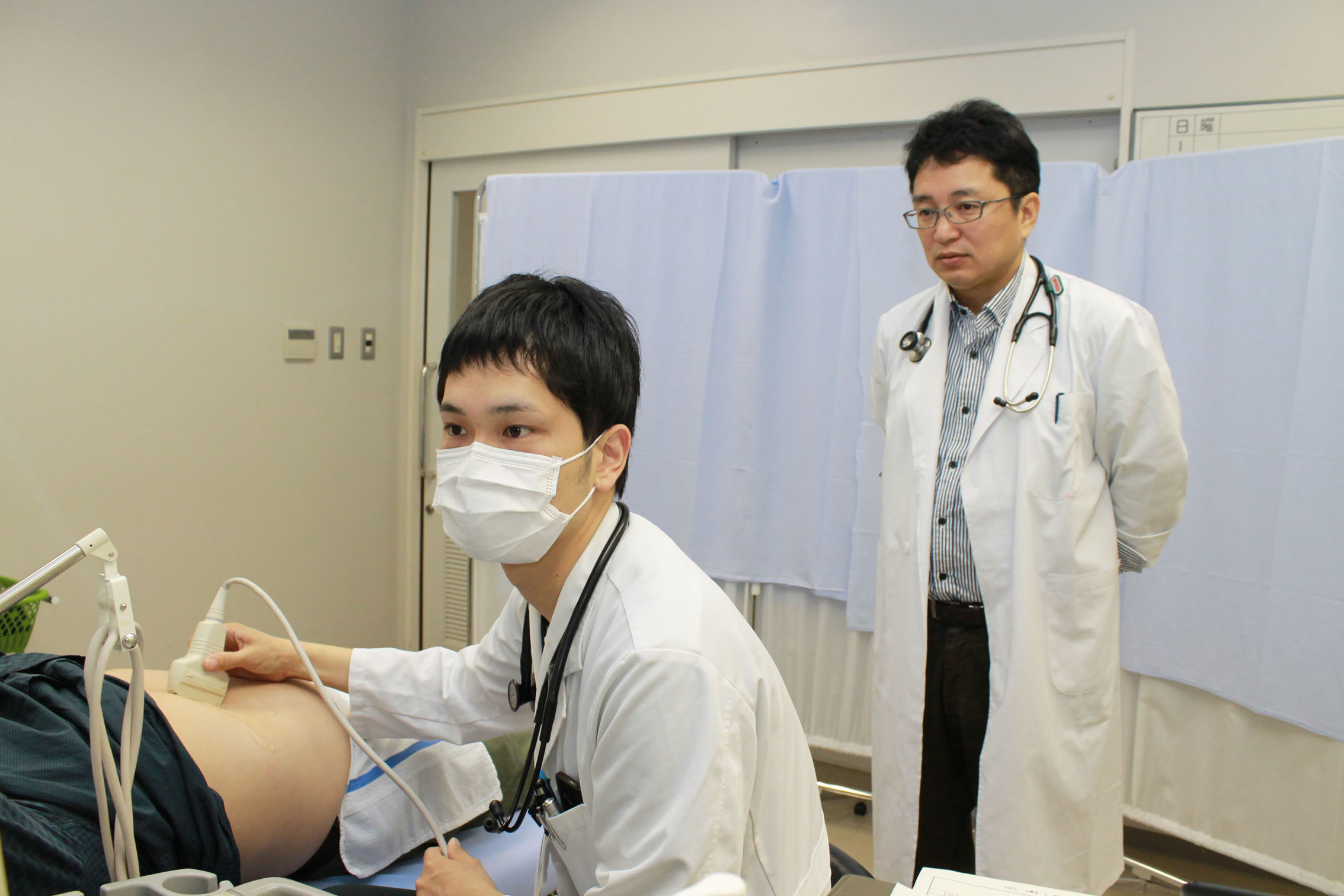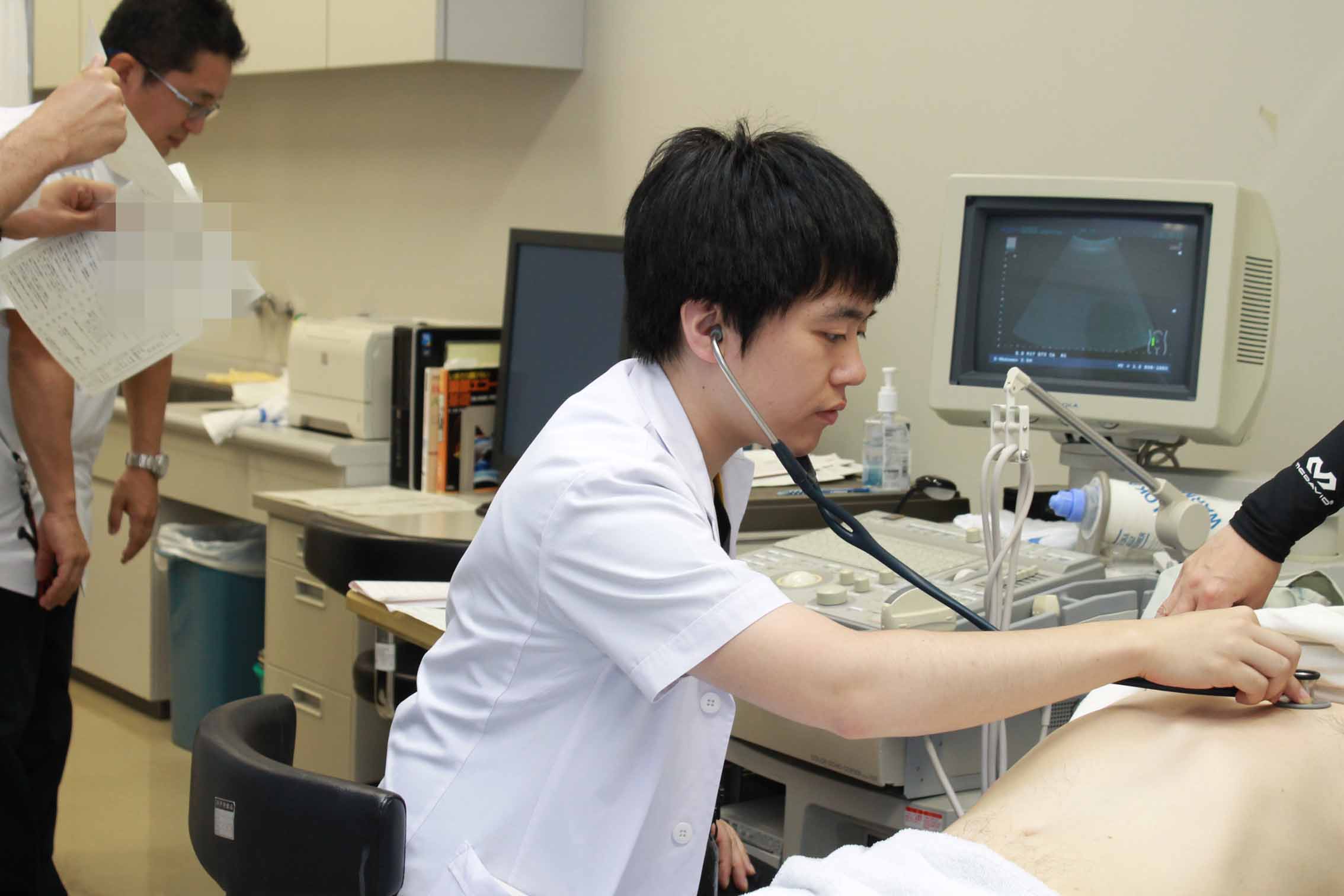外来、病棟回診を終えて講義までの数十分の間にエコーの練習をされていました。優しい木谷先生が受診者役です。