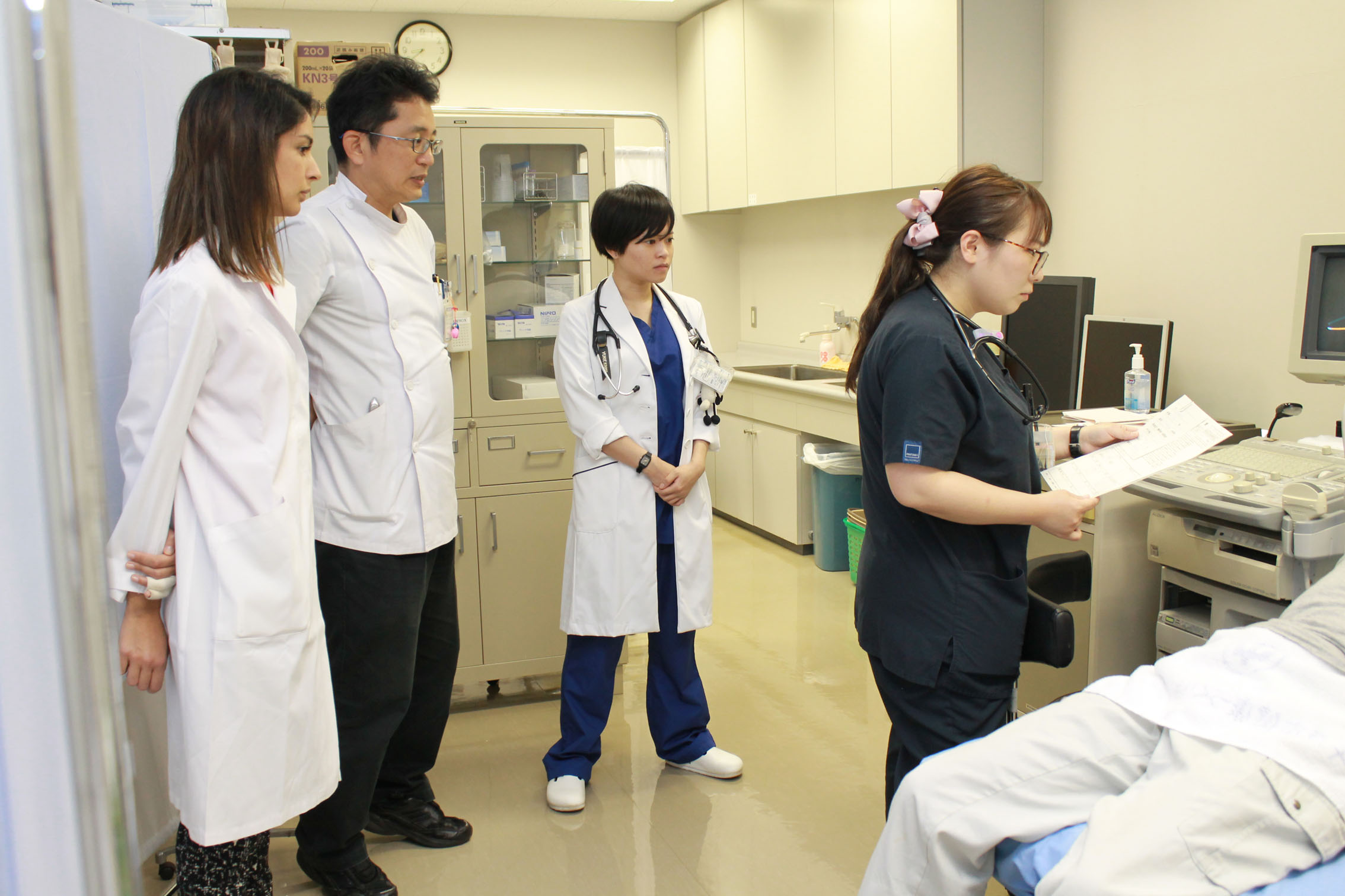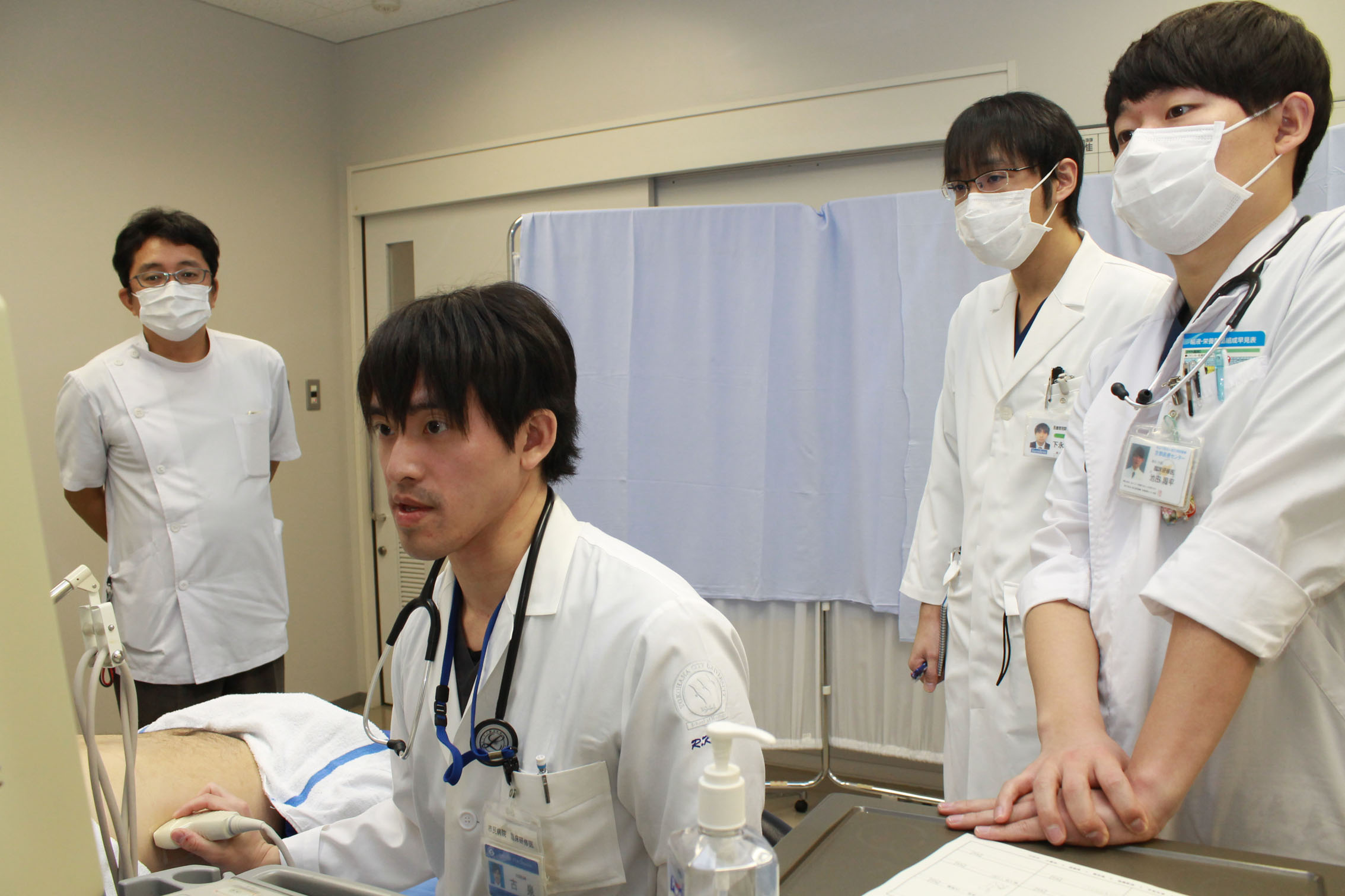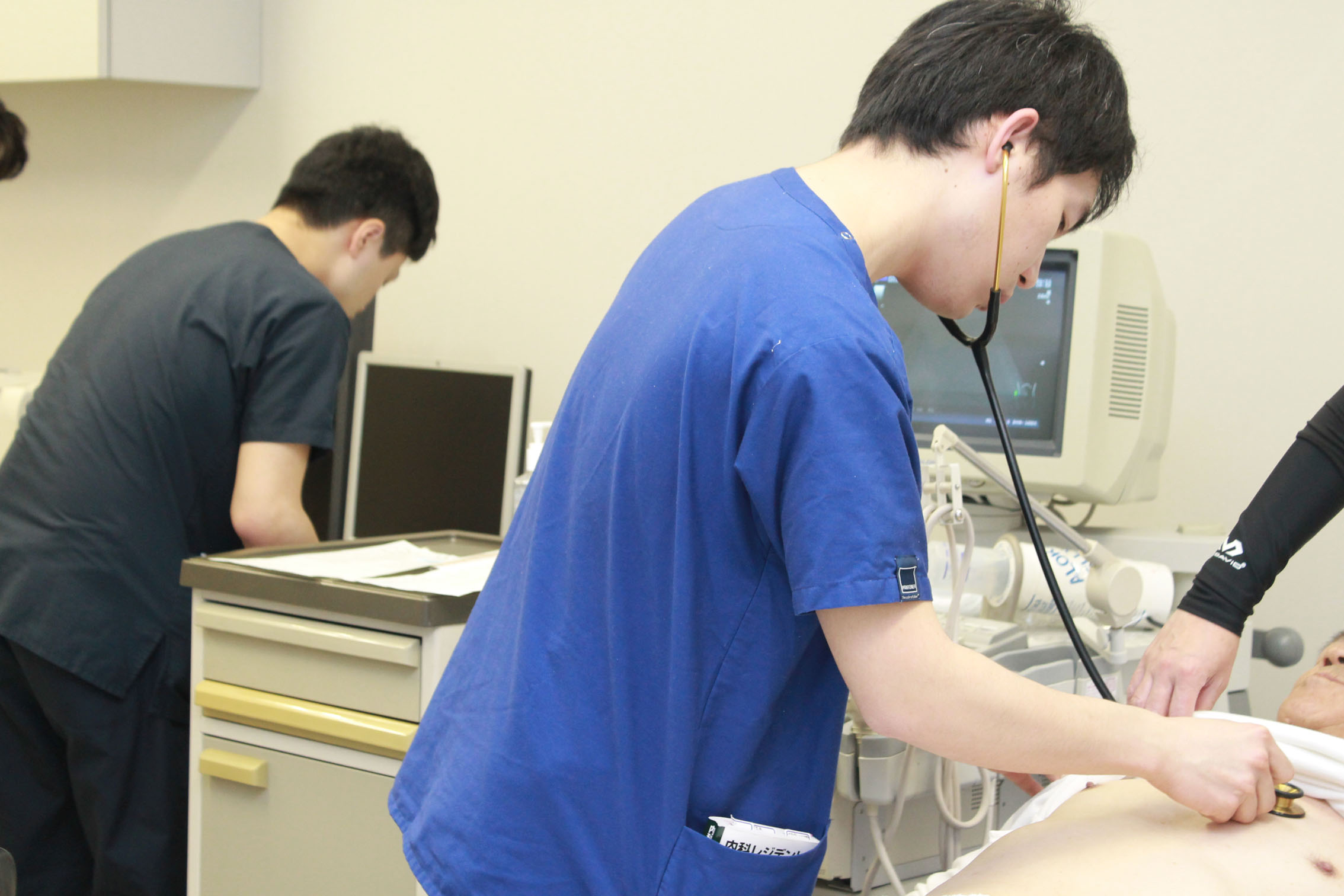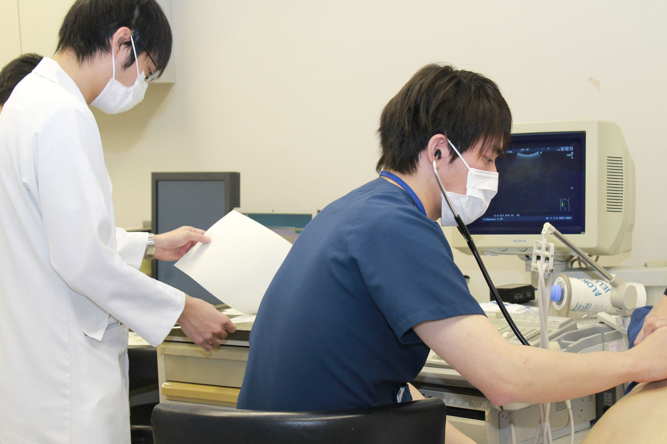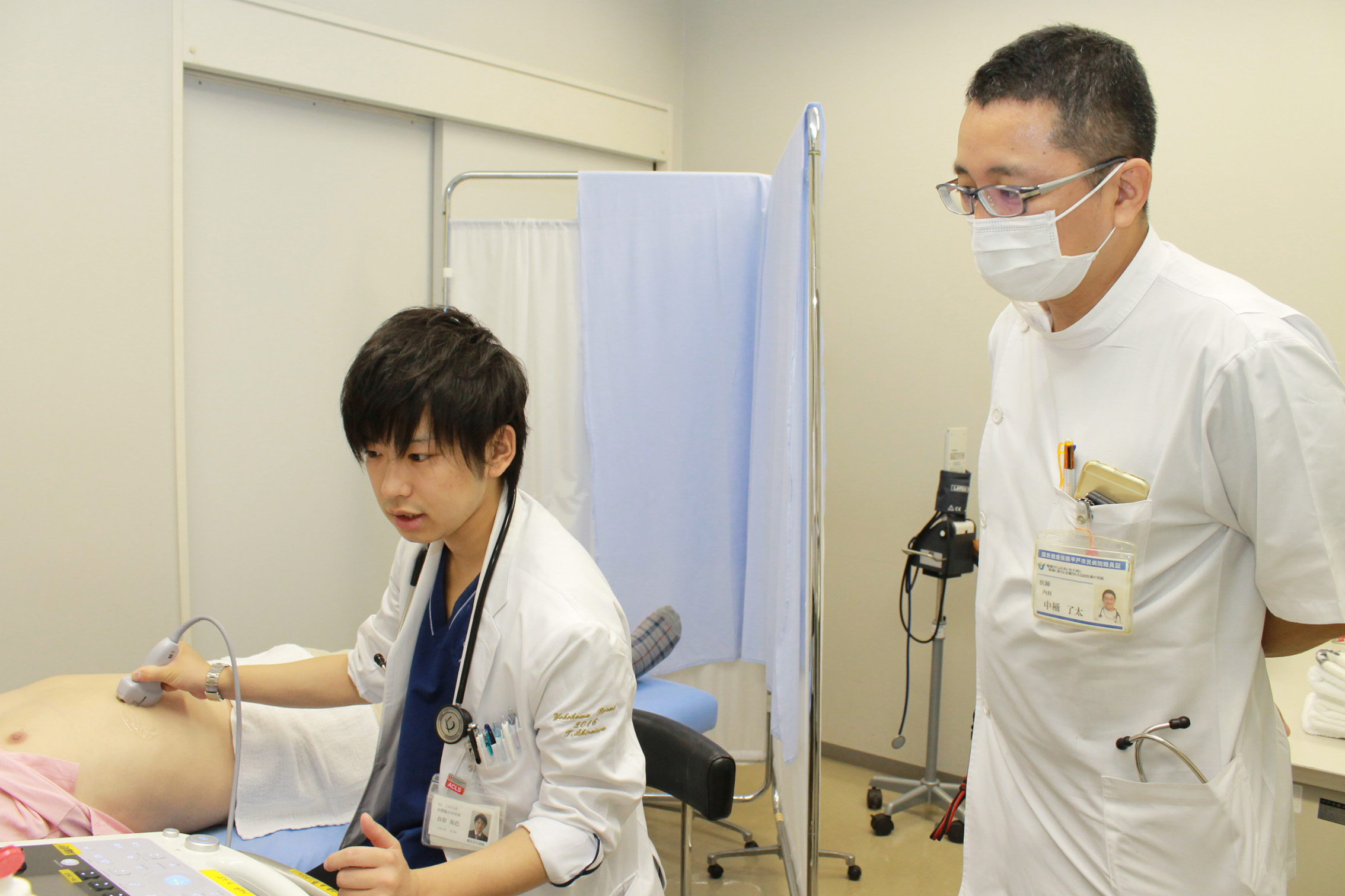 外来、病棟回診を終えて講義までの数十分の間にエコーの練習をされていました。優しい木谷先生が受診者役です。