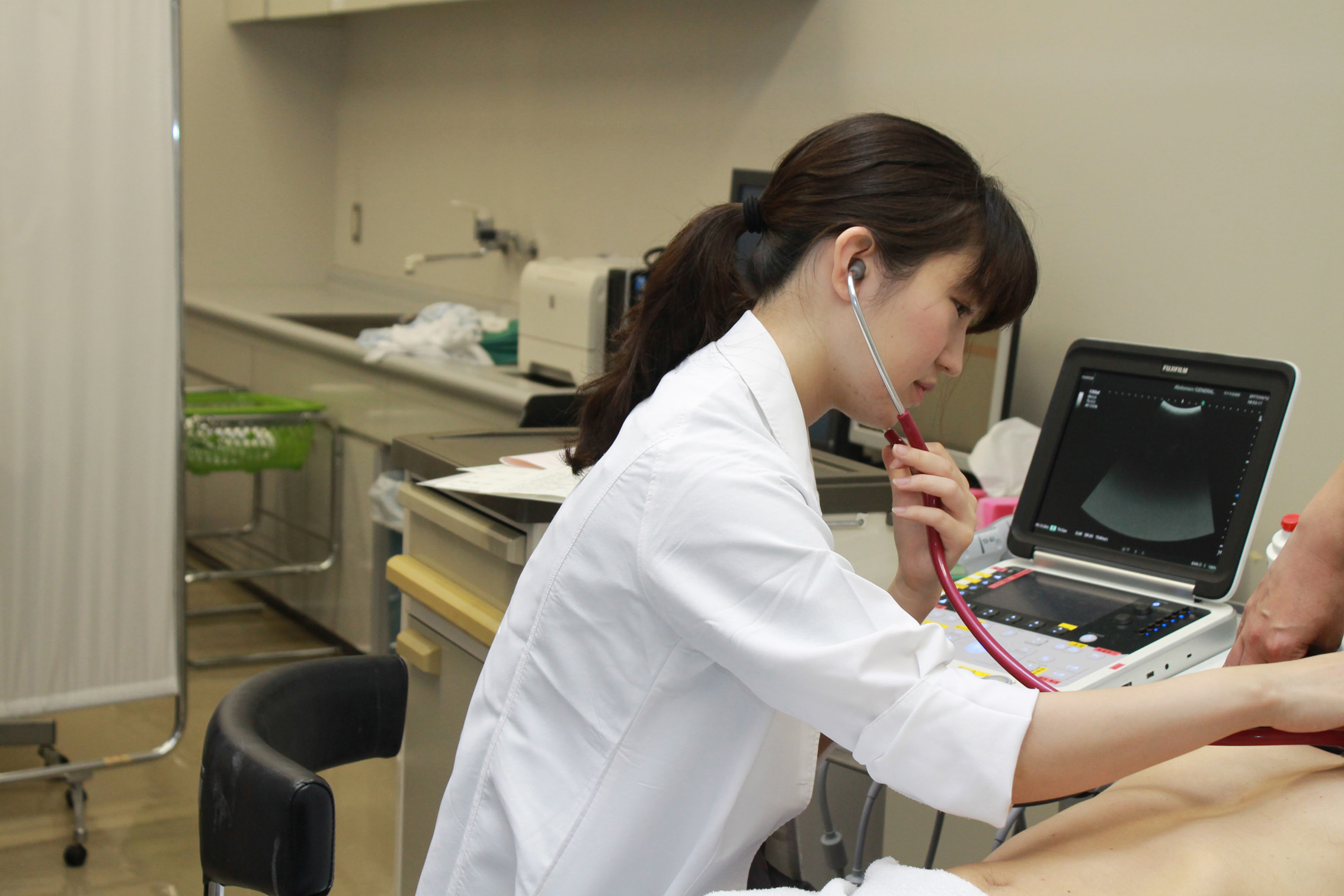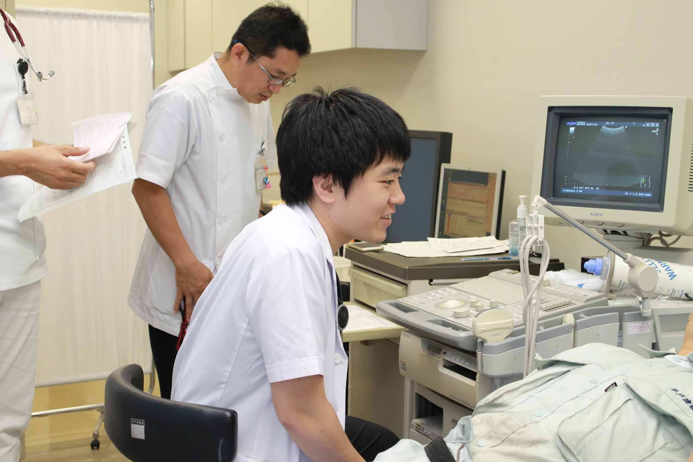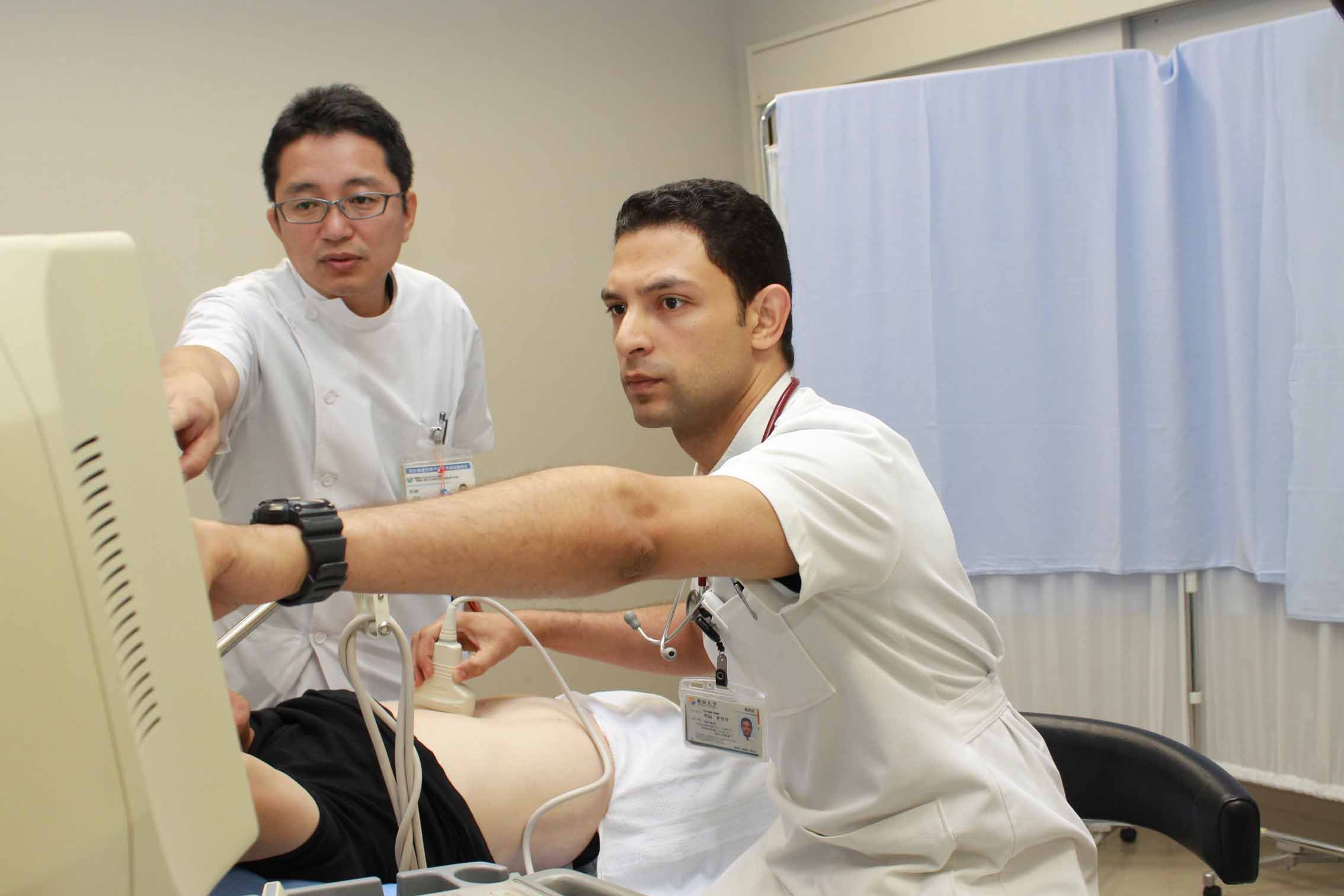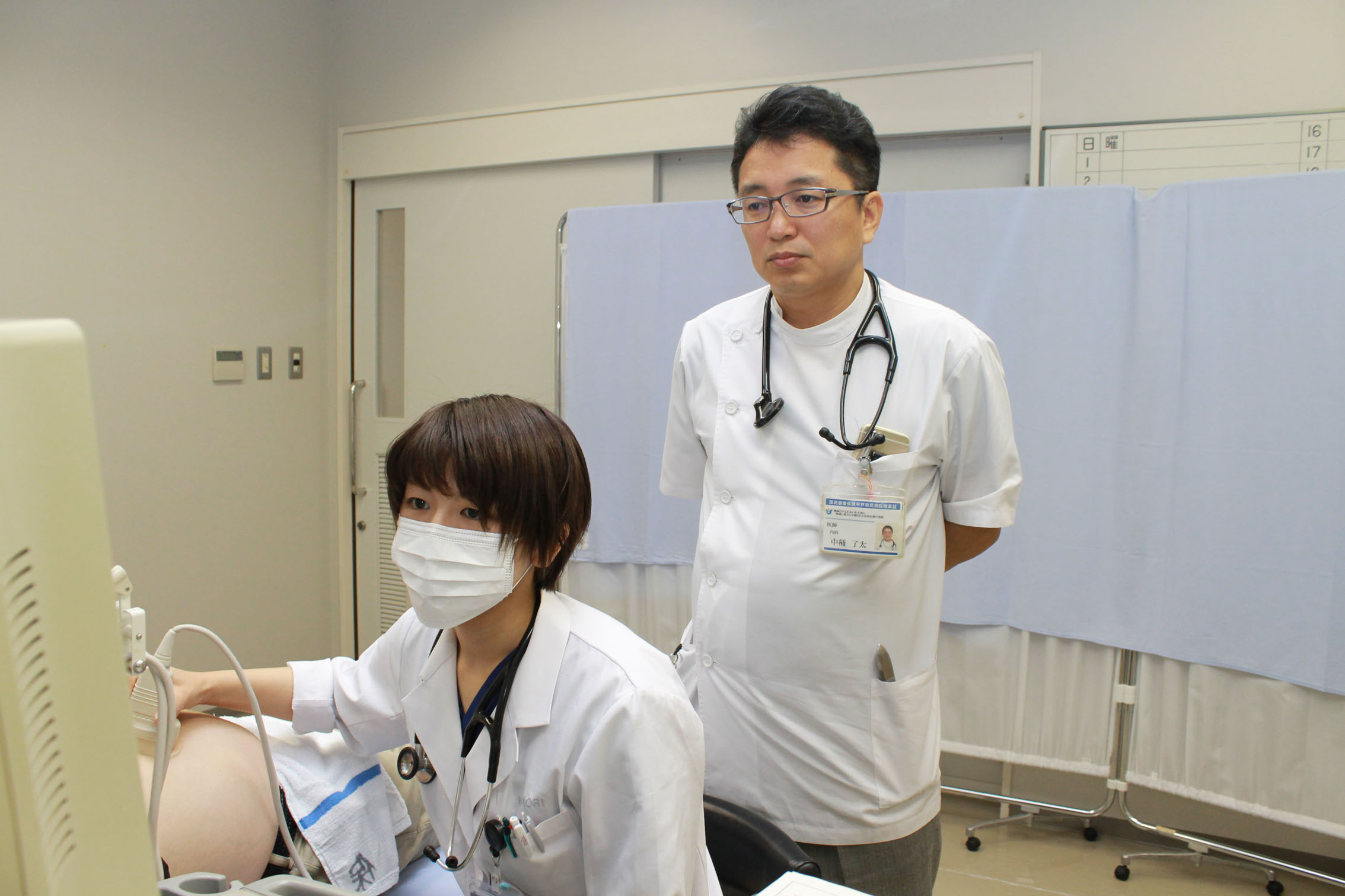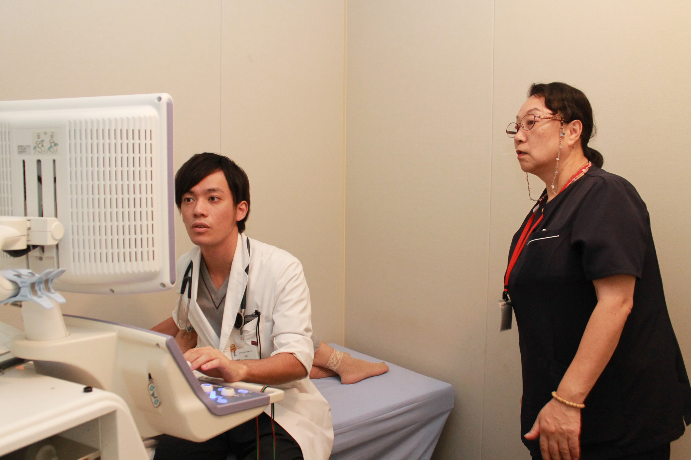 外来、病棟回診を終えて講義までの数十分の間にエコーの練習をされていました。優しい木谷先生が受診者役です。